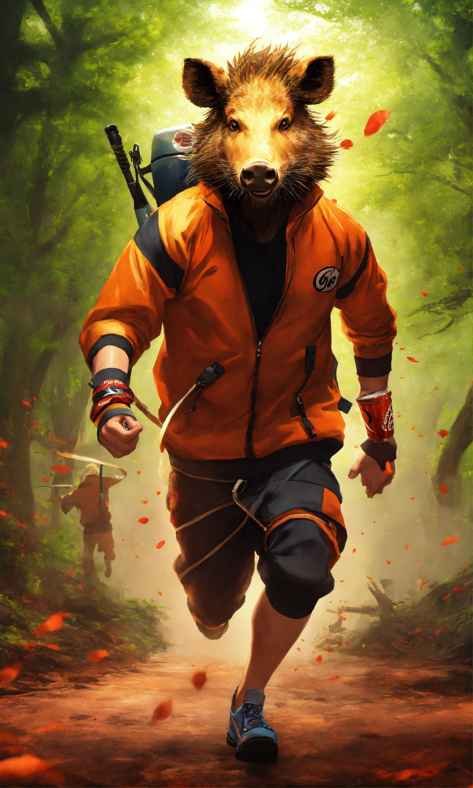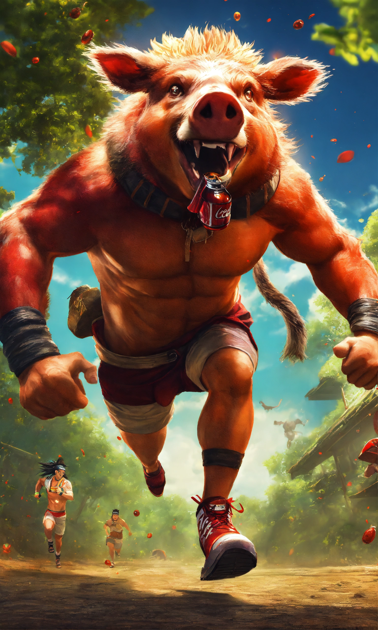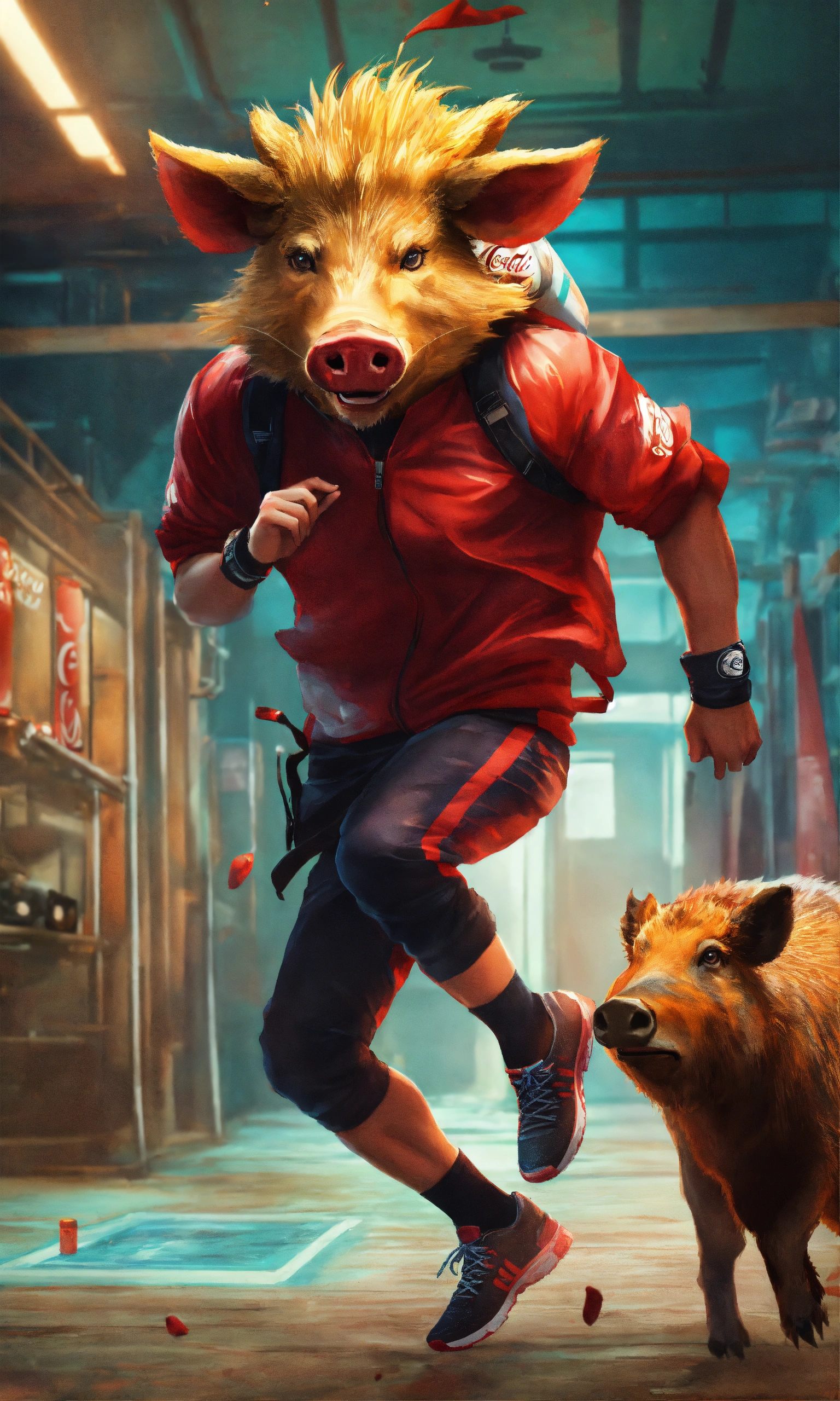 Humoristic naruto body mixed with wild boar head running, coca cola at the hand, amazing high tech fitness room digital illustration