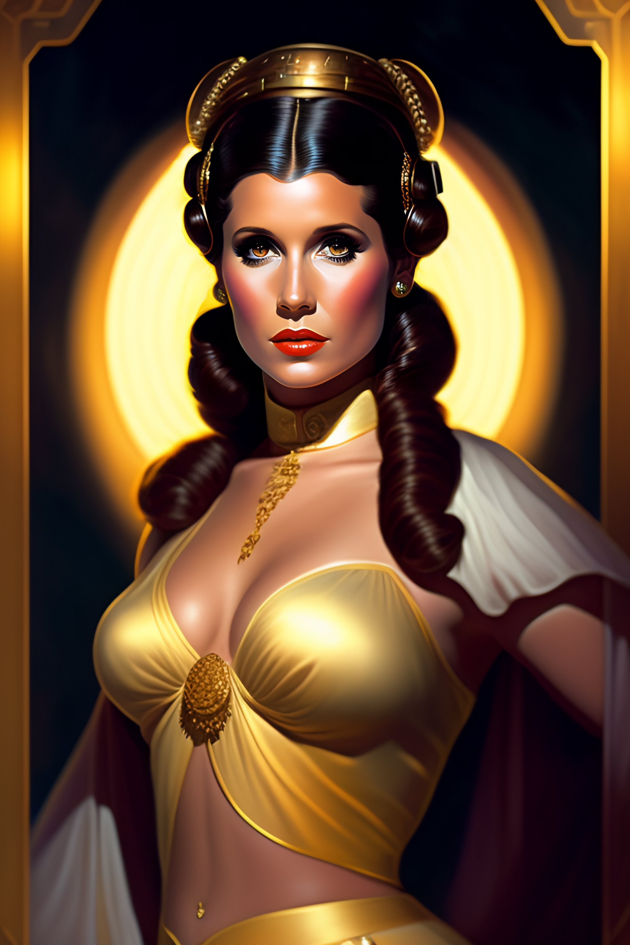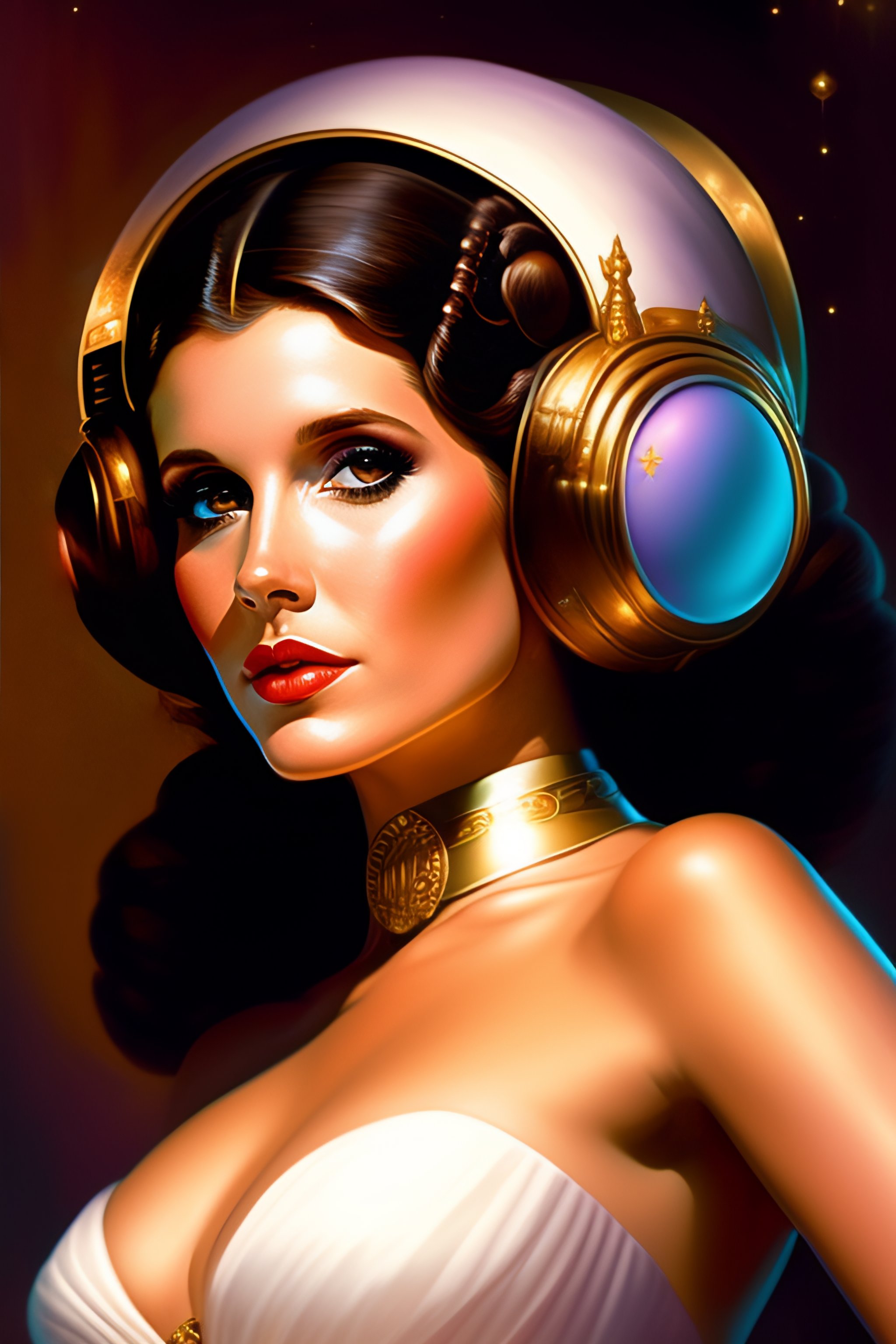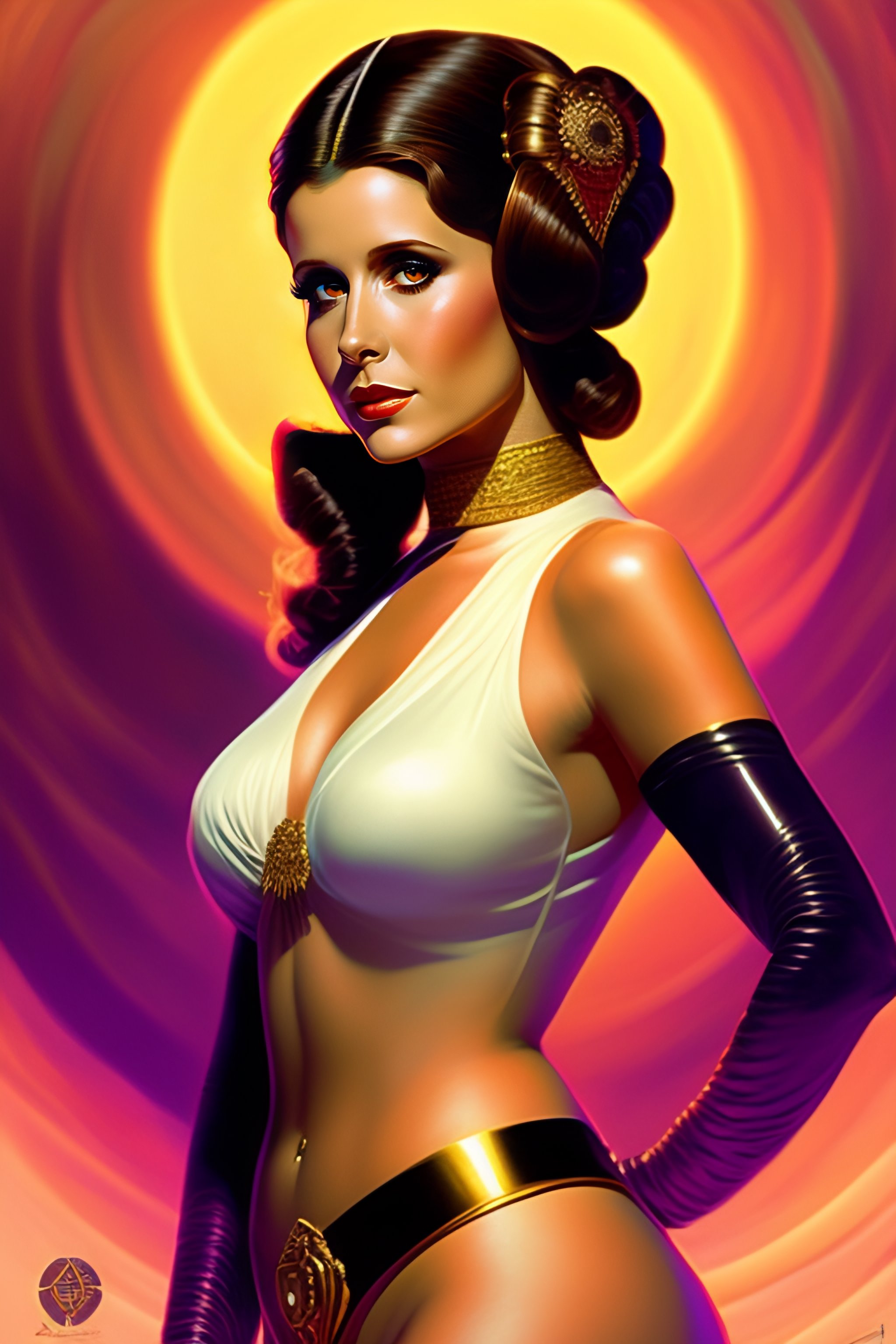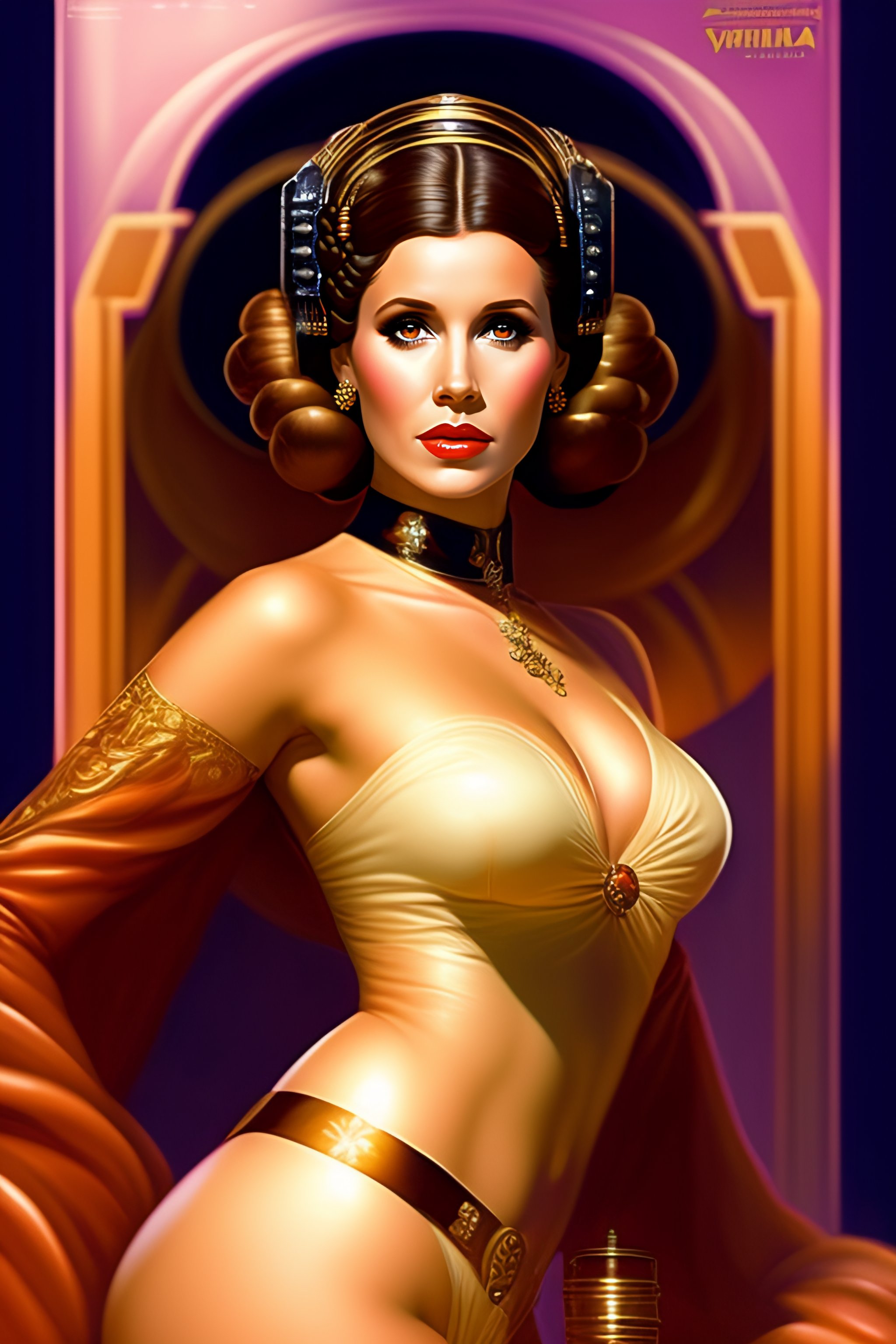 Ultra detailed beautiful female princess leia pin-up, young carrie fisher, in the style of peter mohrbacher