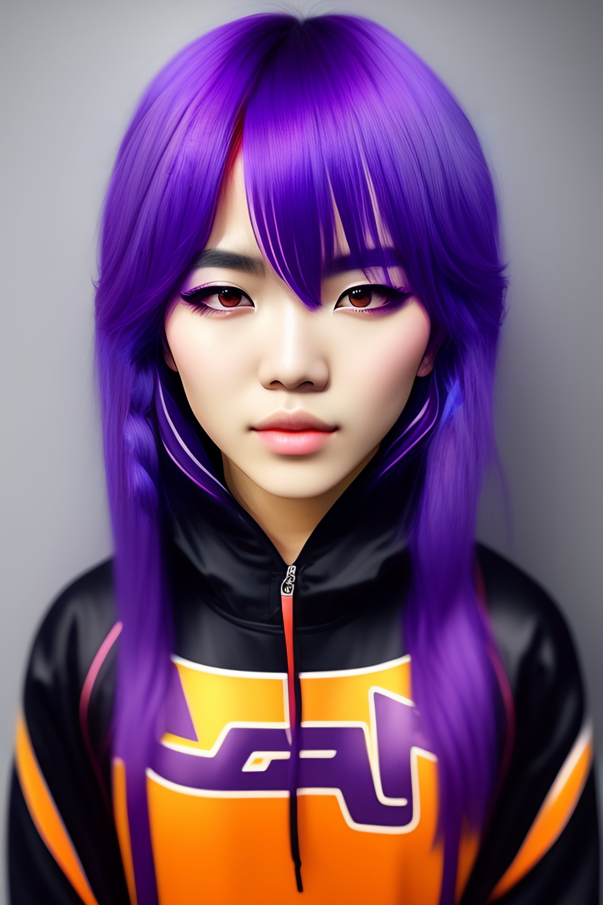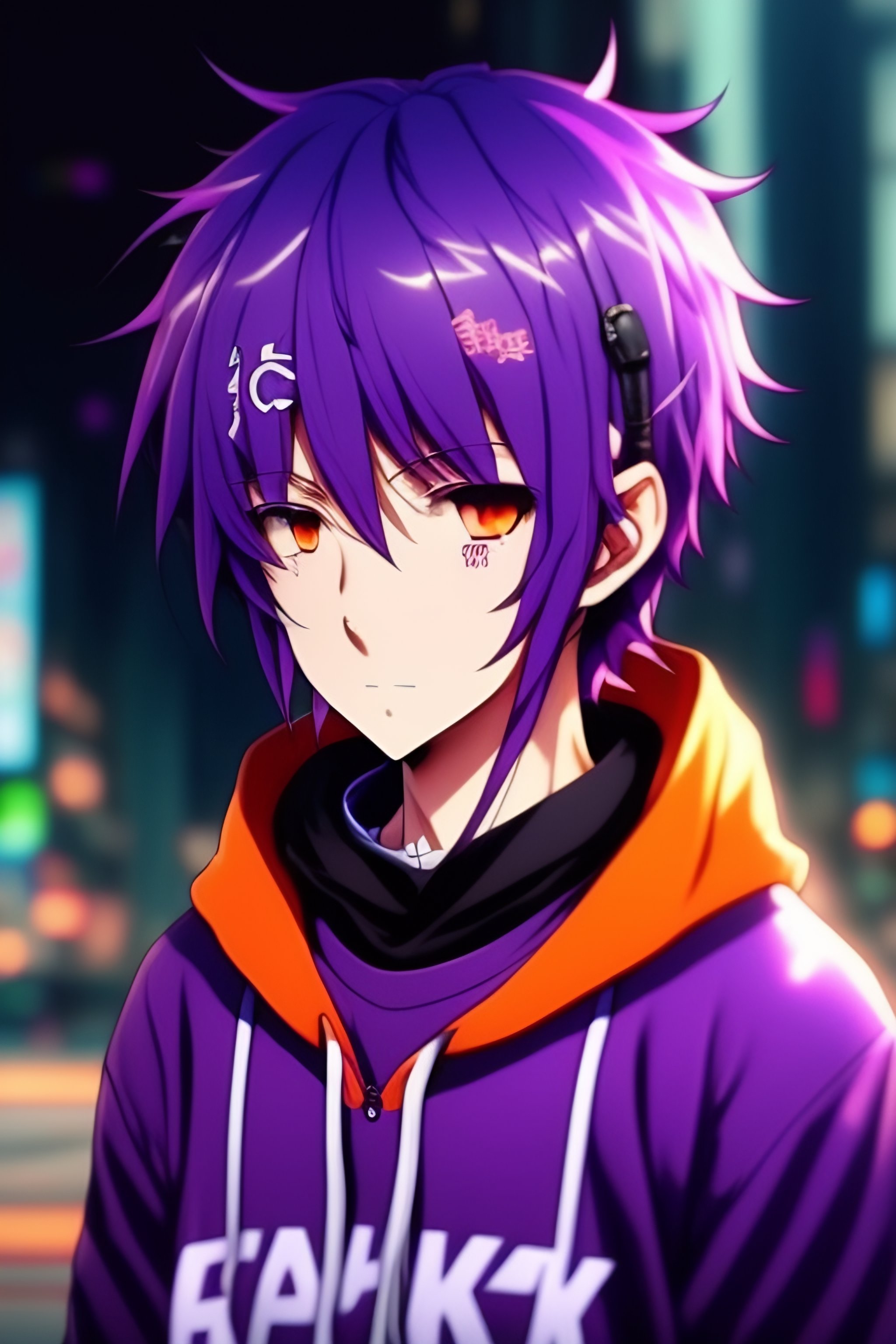 Light novel style, purple hair with purple eyes with a light shade of orange in the lower half of the eyes, date a live style, boy, black sweatshirt, annoyed face expression
