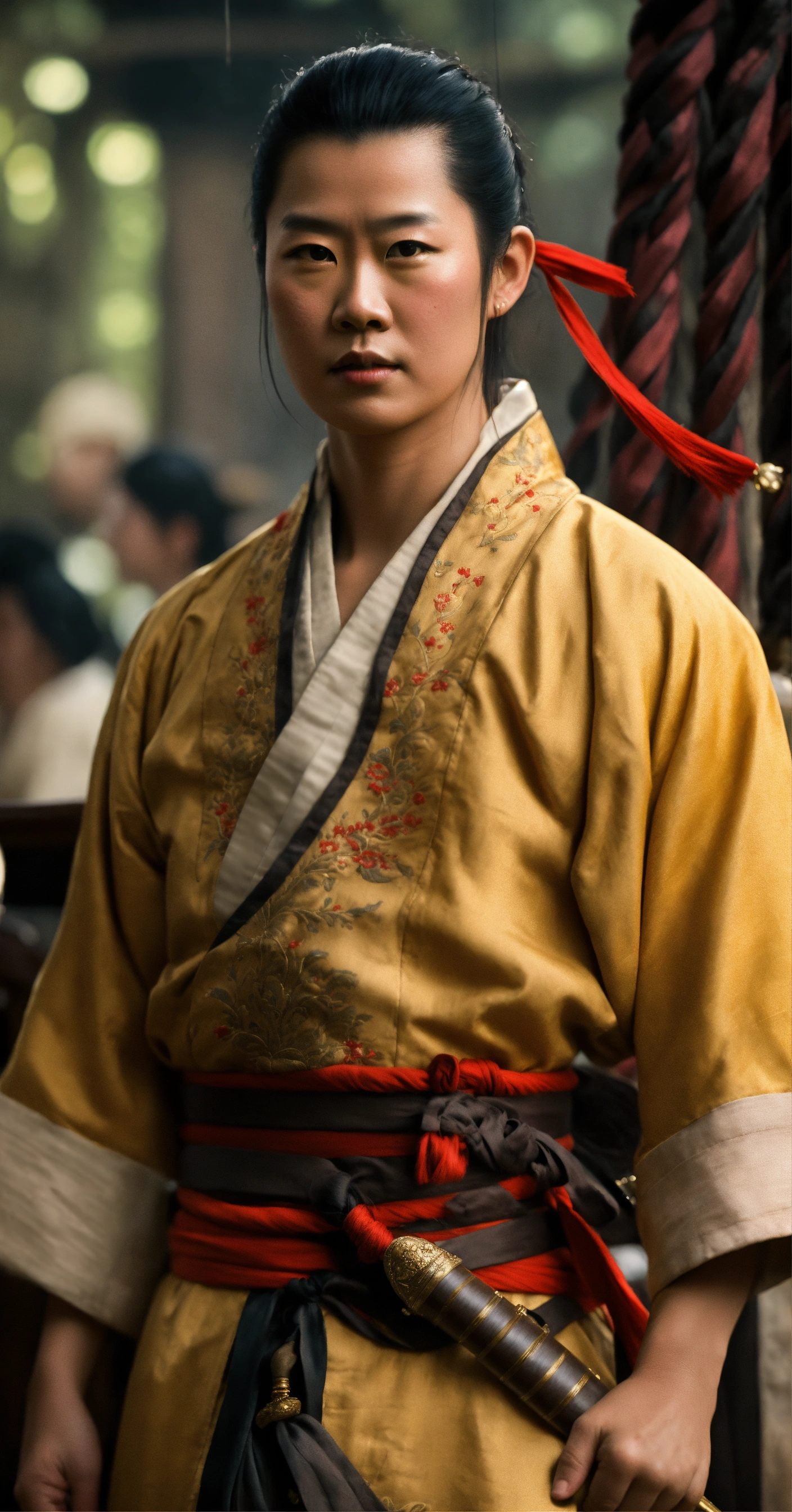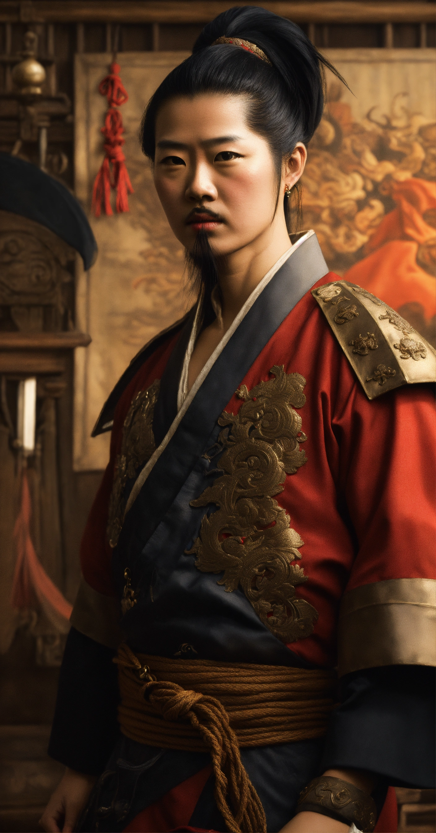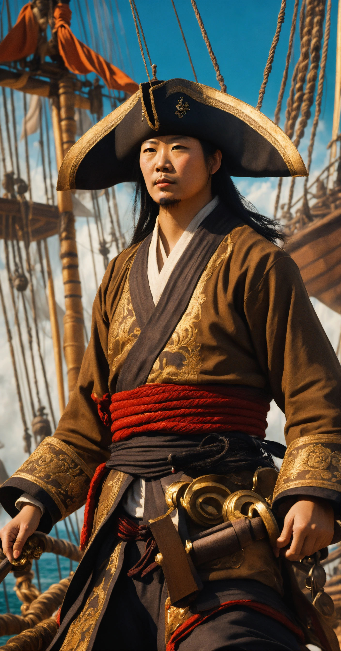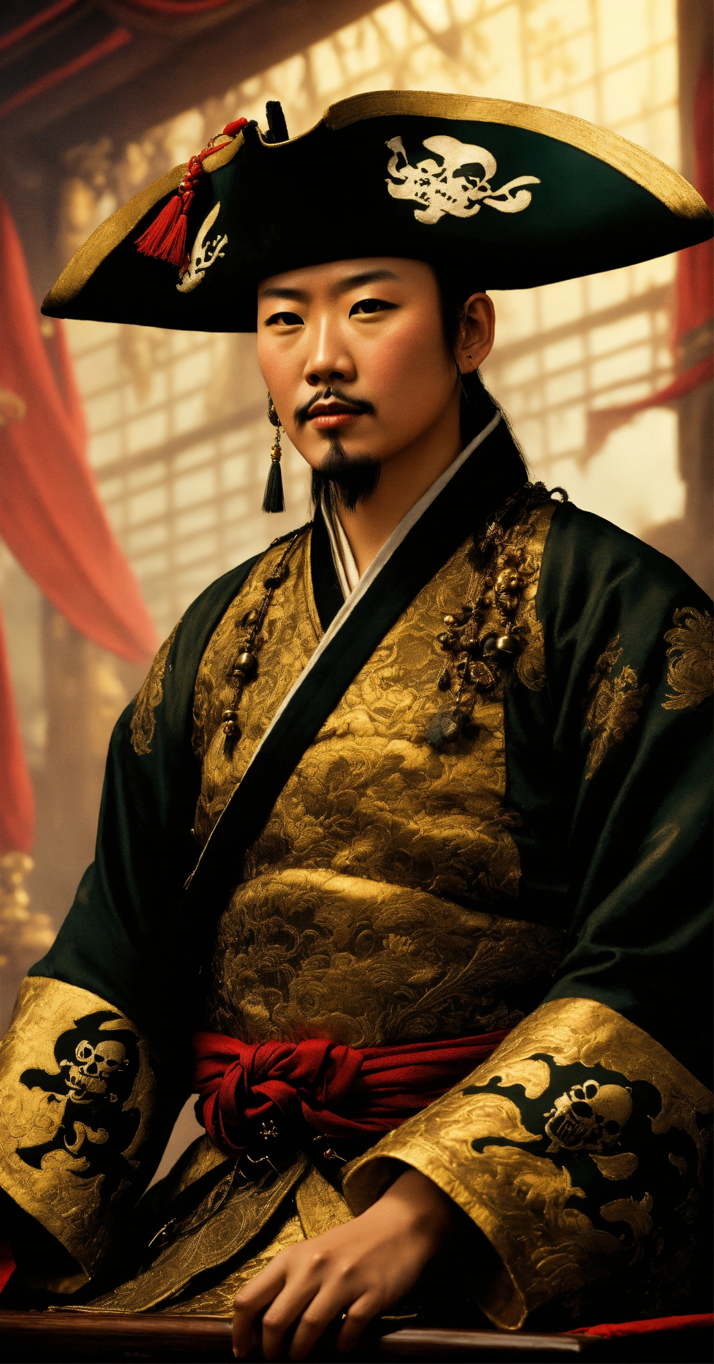 Craft a hyper-realistic, cinematographic and intricately detailed picture of ching shih instilled in the chaotic pirate life, ensuring fair treatment, appropriate compensation, and enforcing severe punishments for transgressions.