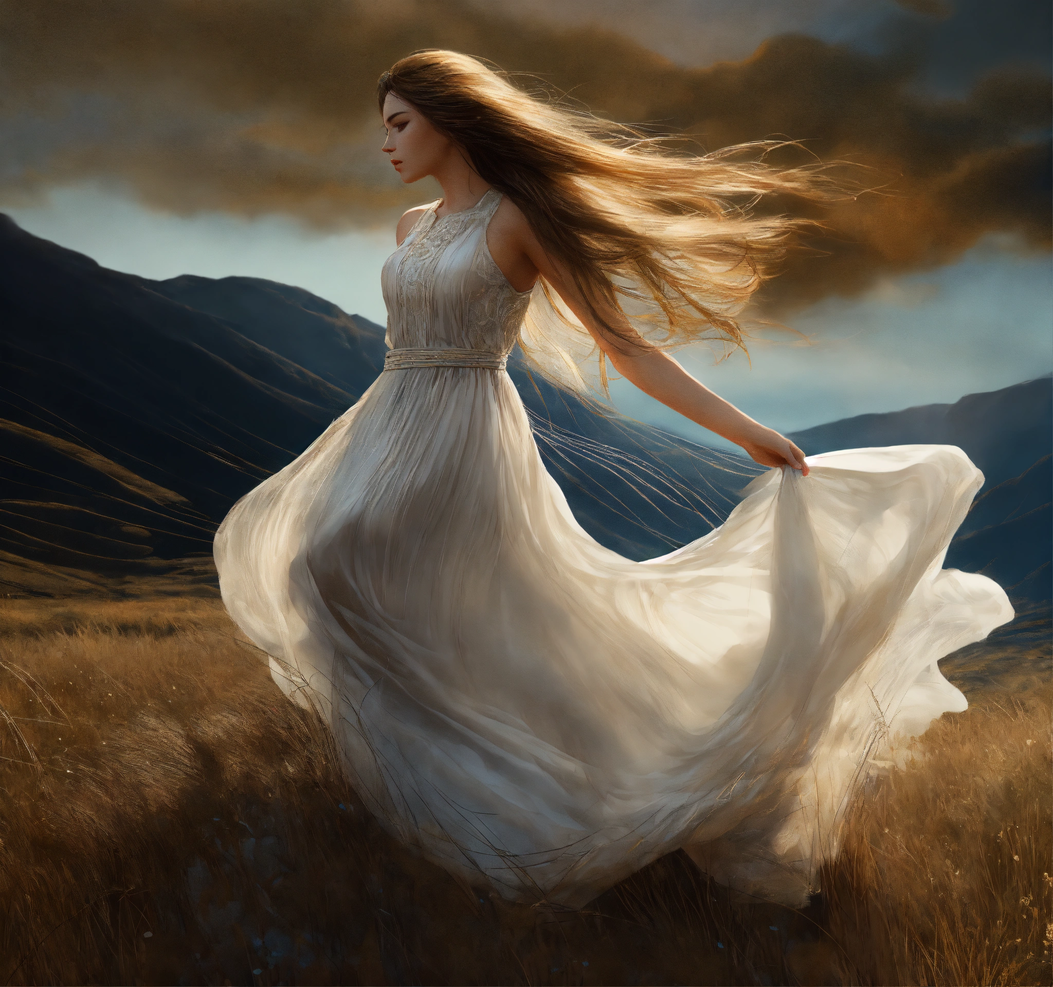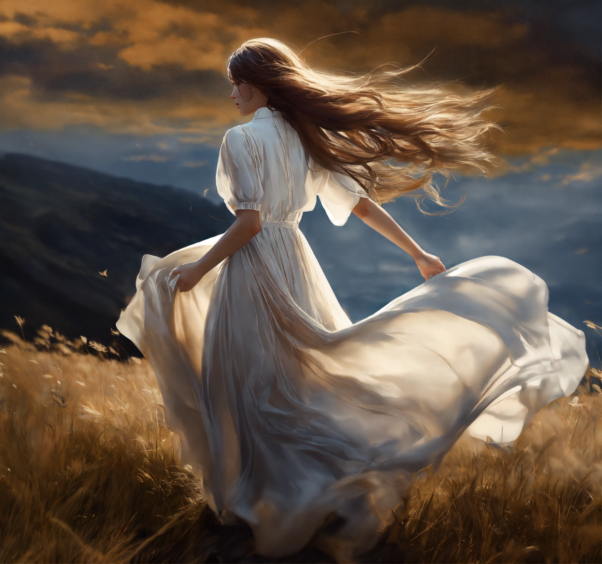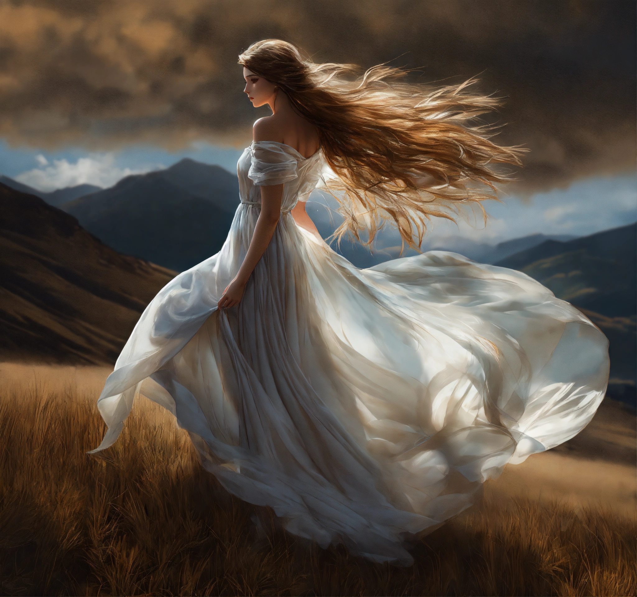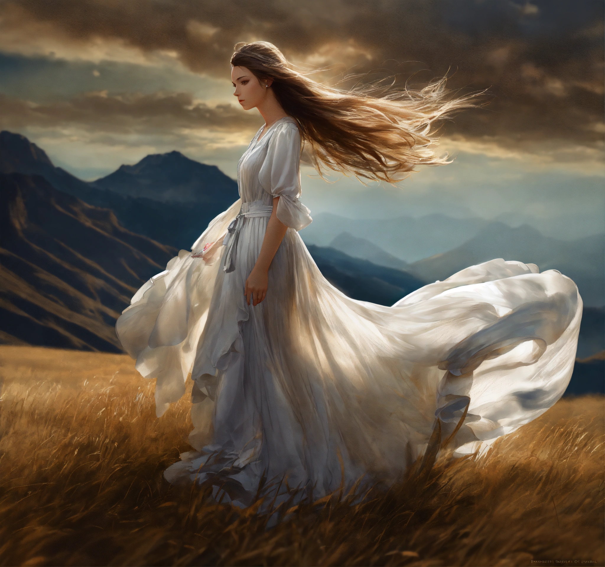 Hidden eyes, chatain hair in the wind, full body, hyper realism, poetic, romantic, angelic long dress, realistic shading, realistic render, detailed textures, photorealistic, wide shot, landscape