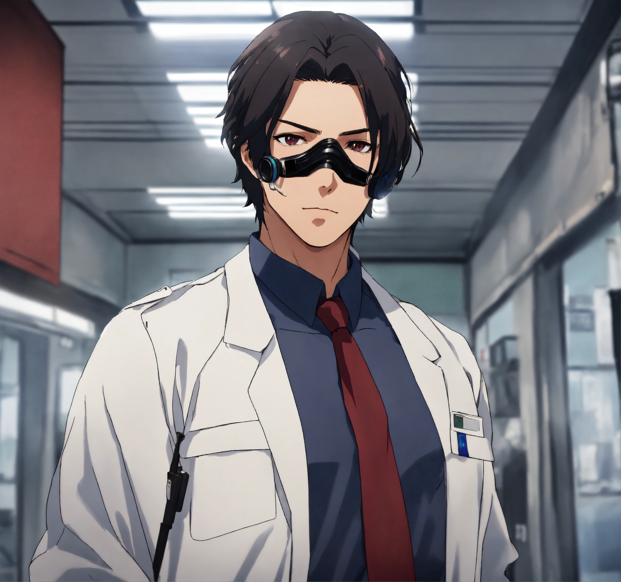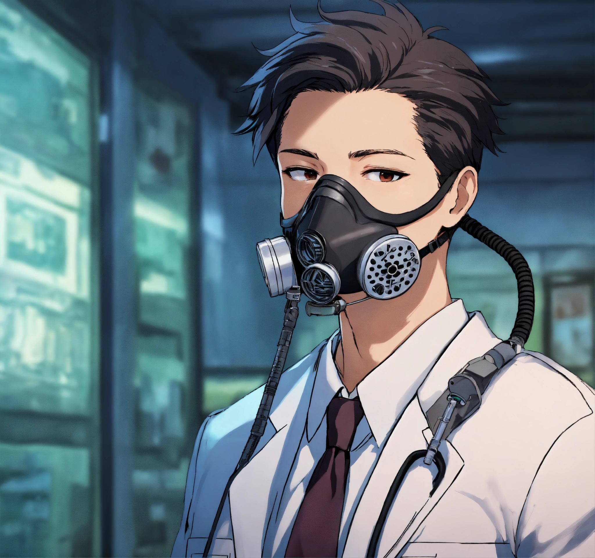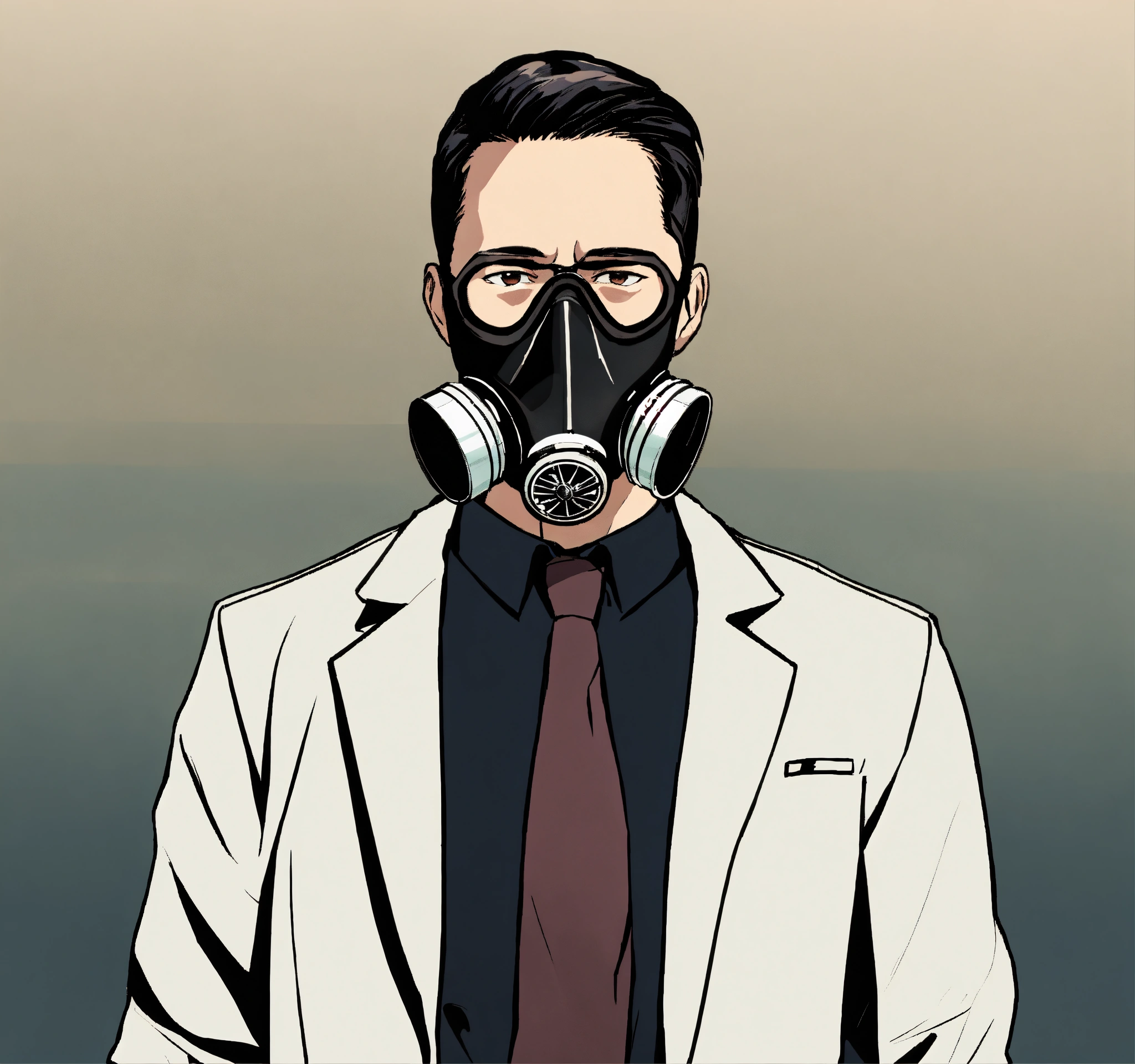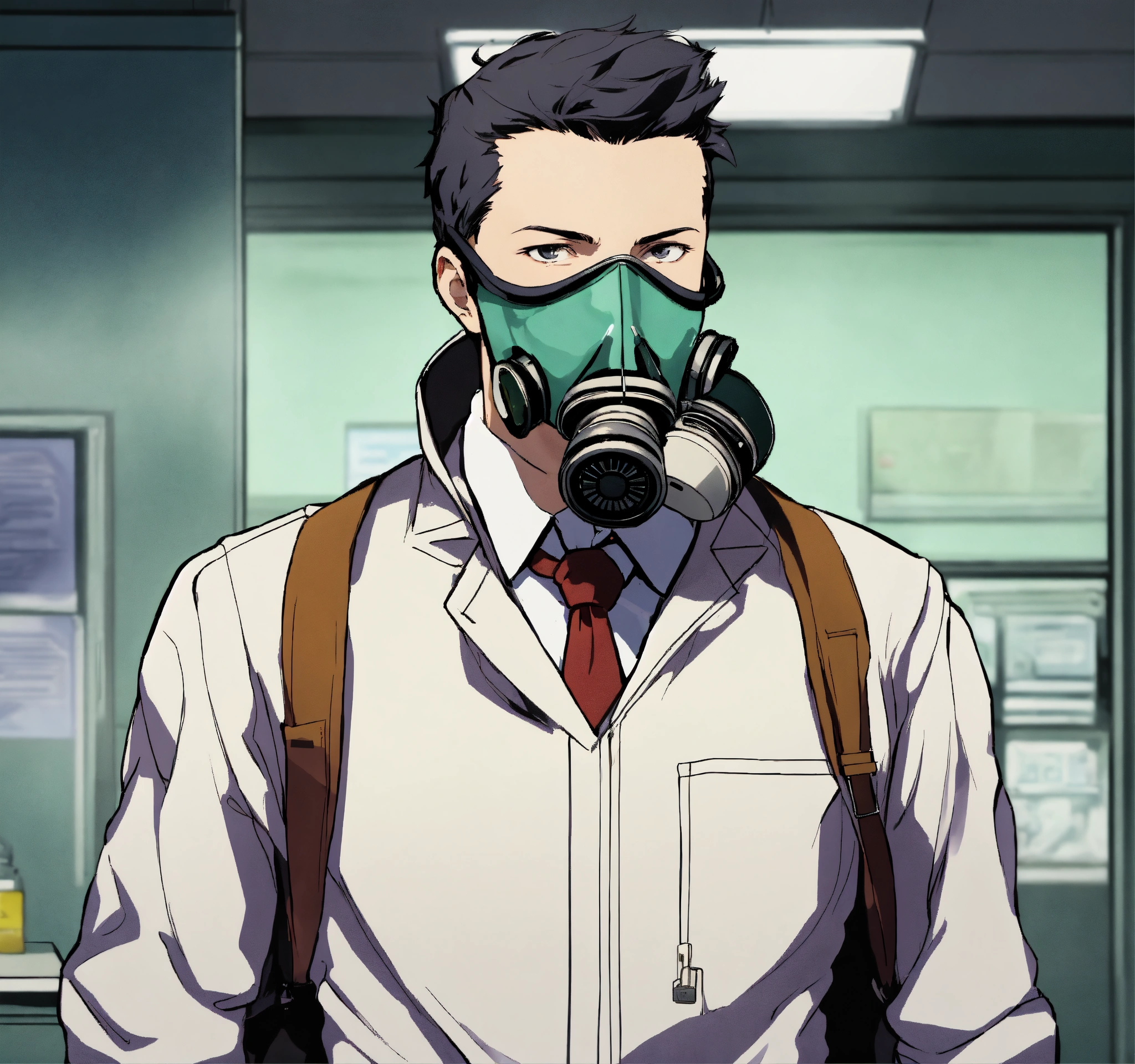 An extremely average-looking man of european descent and average height. he wears an avon m50 gas mask hiding his face, and his straight, slicked-back dark brown hair is medium length. he wears business casual attire with black slacks dress shoes a dress shirt and a plain tie with a white lab coat over top of those clothes. white lab coat. holding a syringe, holding a needle. full face avon m50 gas mask. anime style, kohei horikoshi. my hero academia