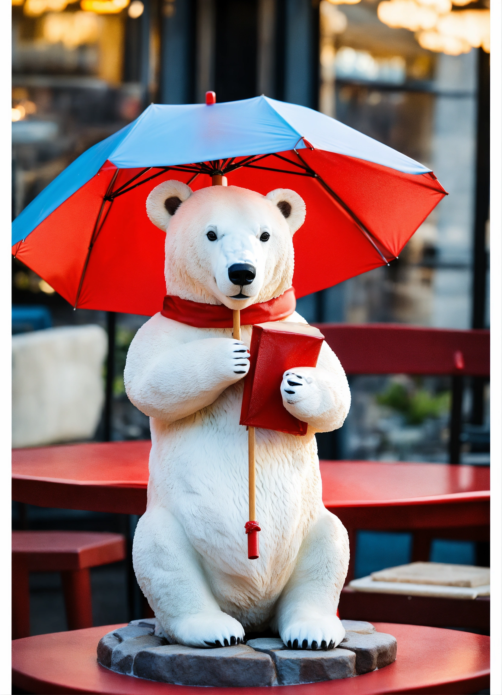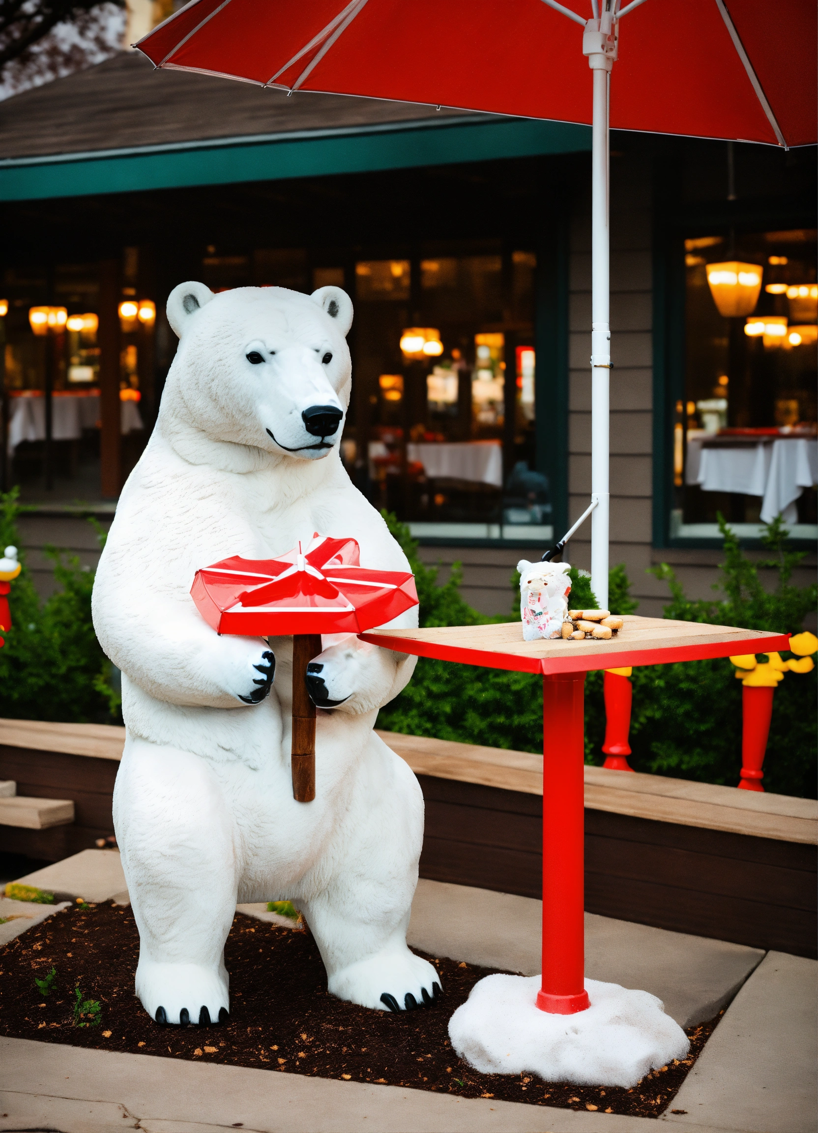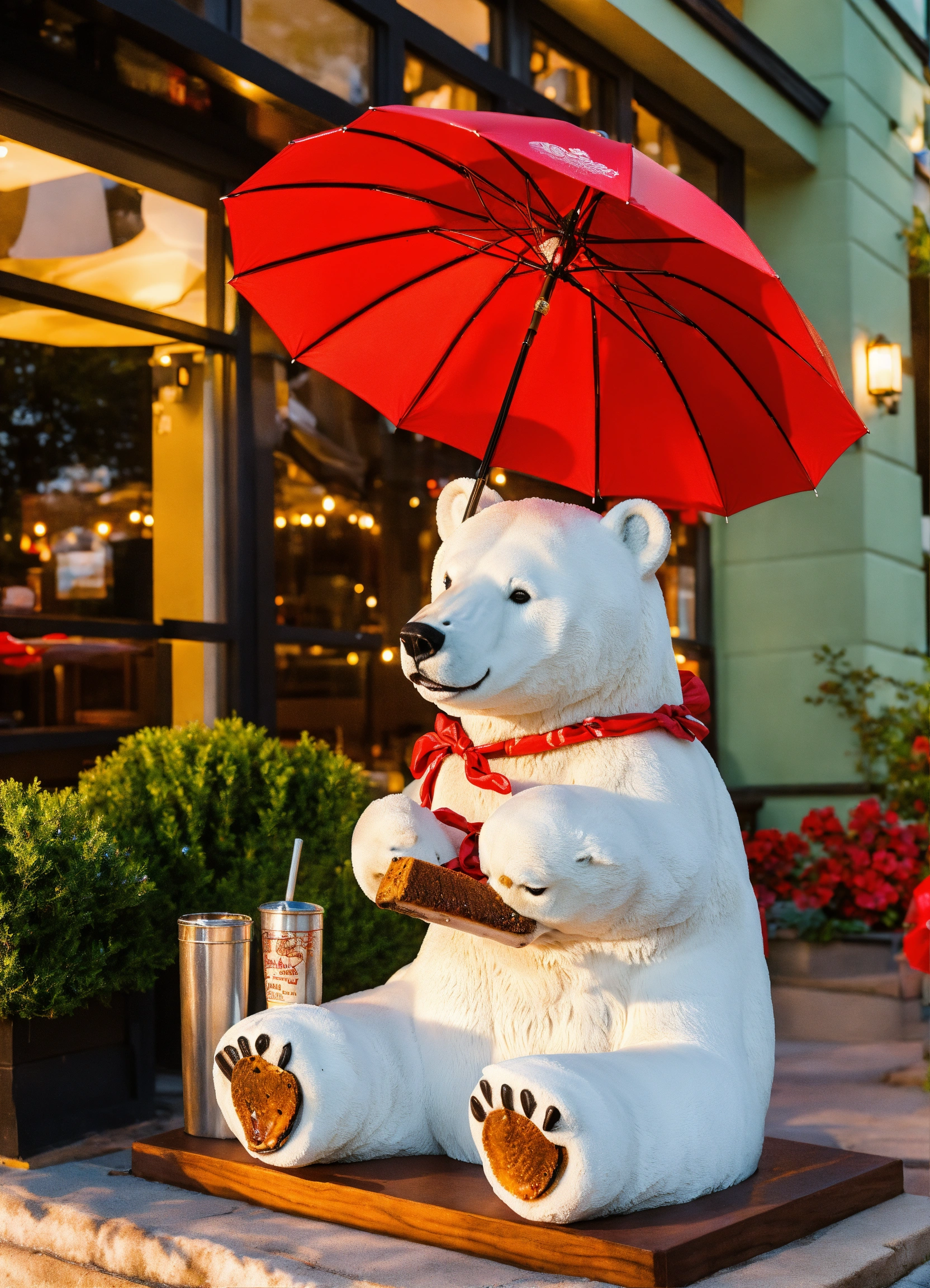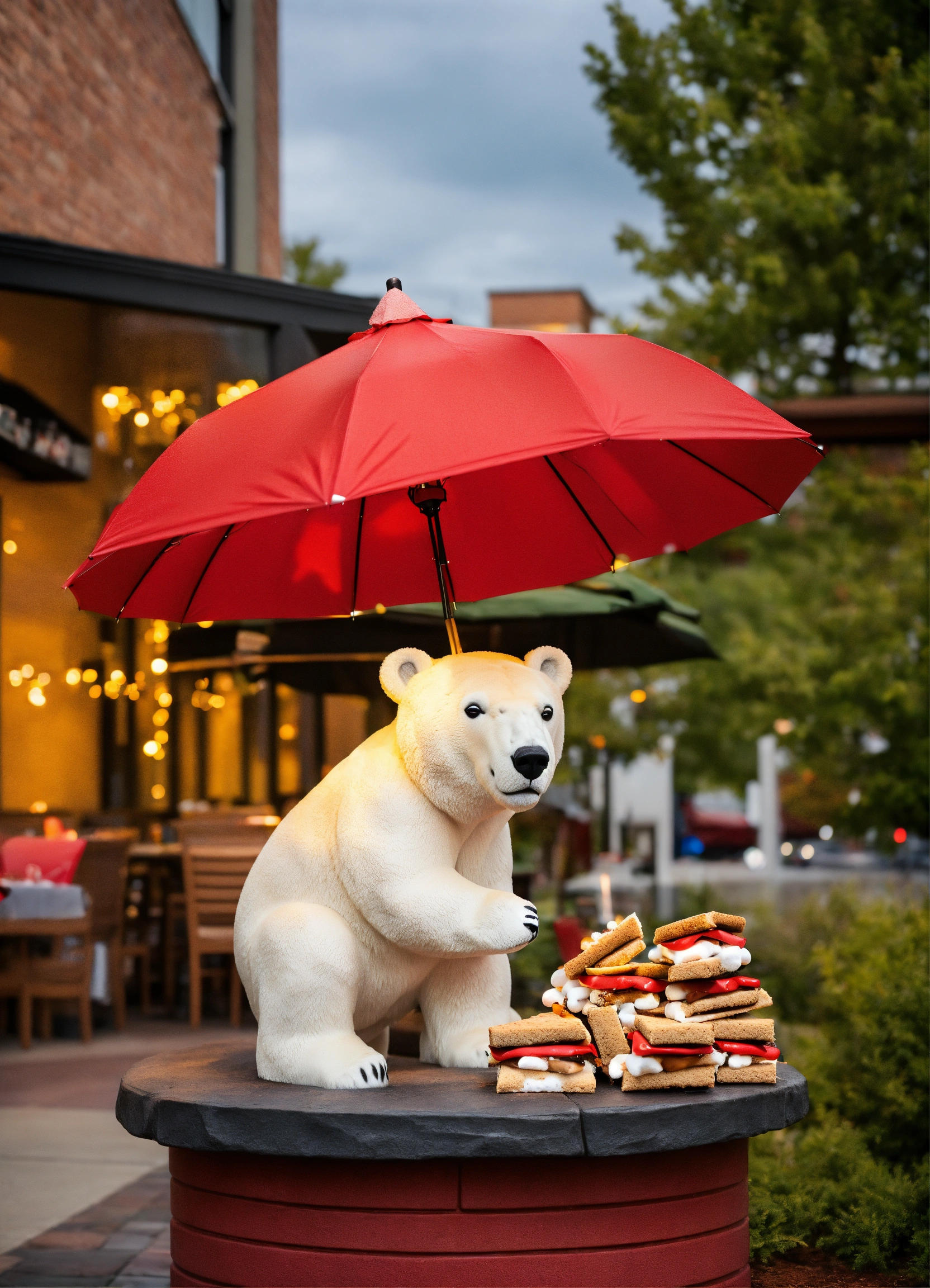 Polar bear statue holding a red umbrella and smores outside restaurant