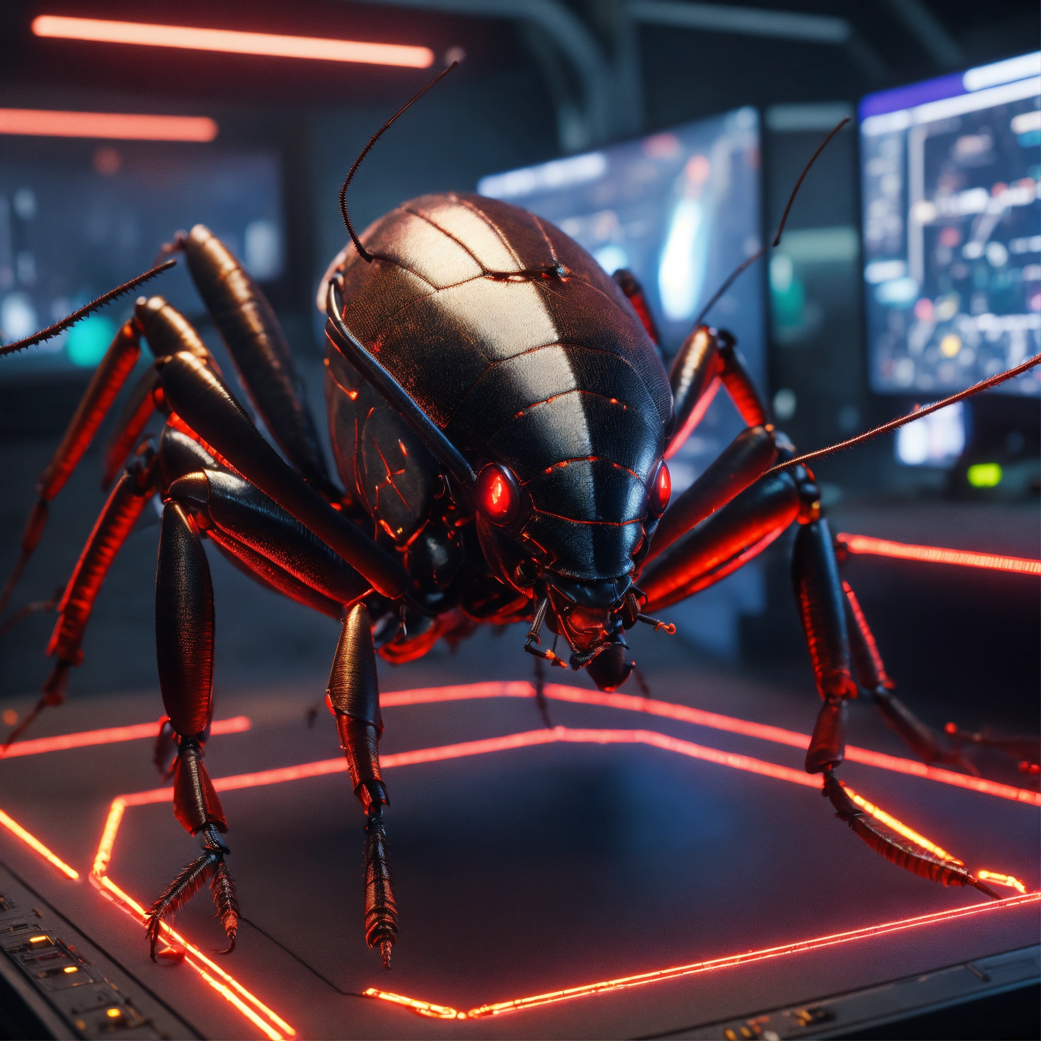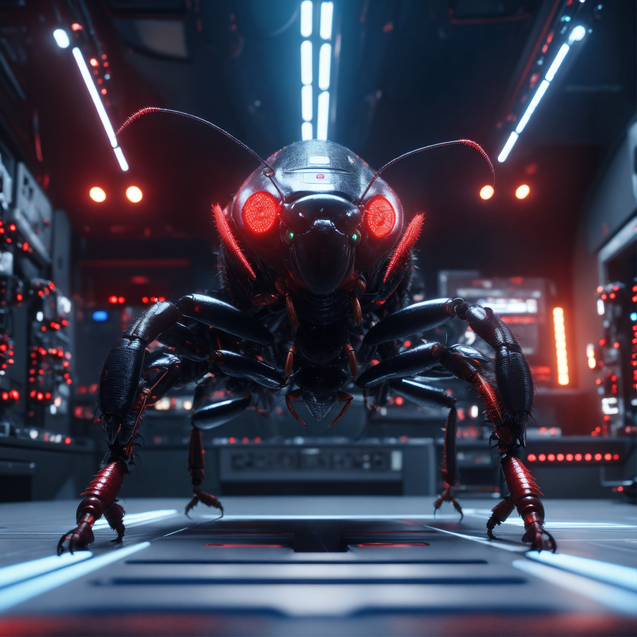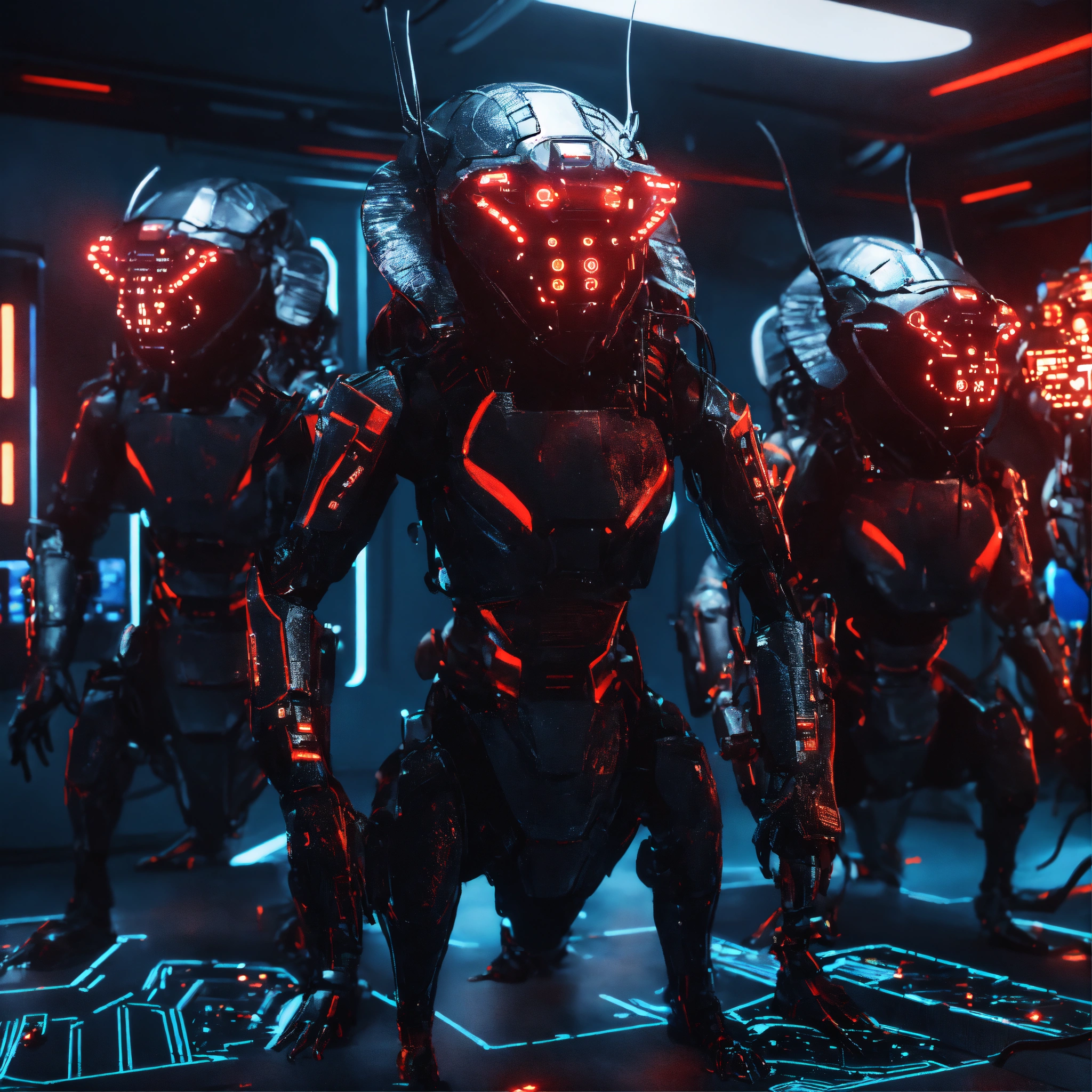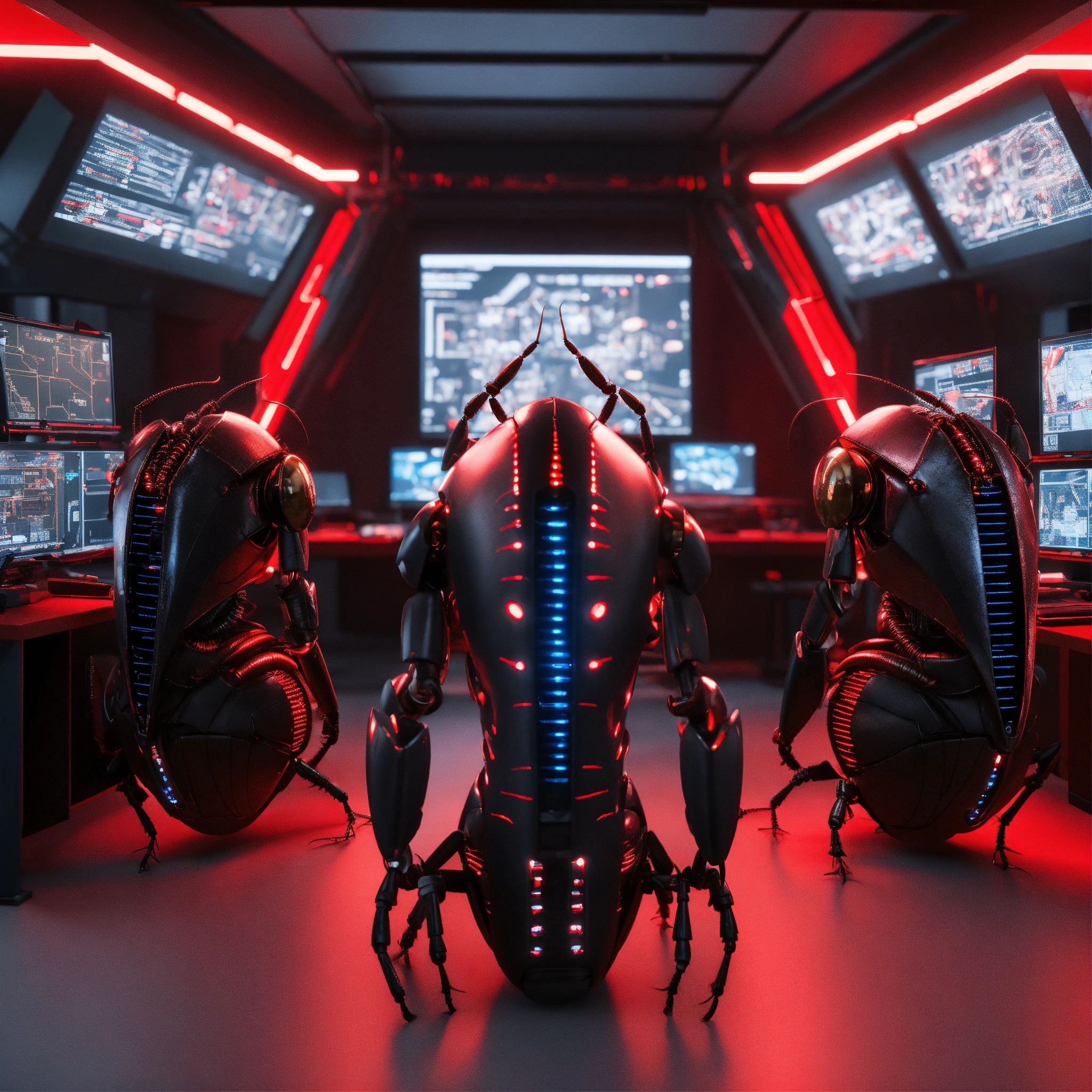 3 black cockroach faced humanoids with red eyes and detailed circuitry markings, working in a hi tech alien control room, realistic, 8k, unreal engine, pixar