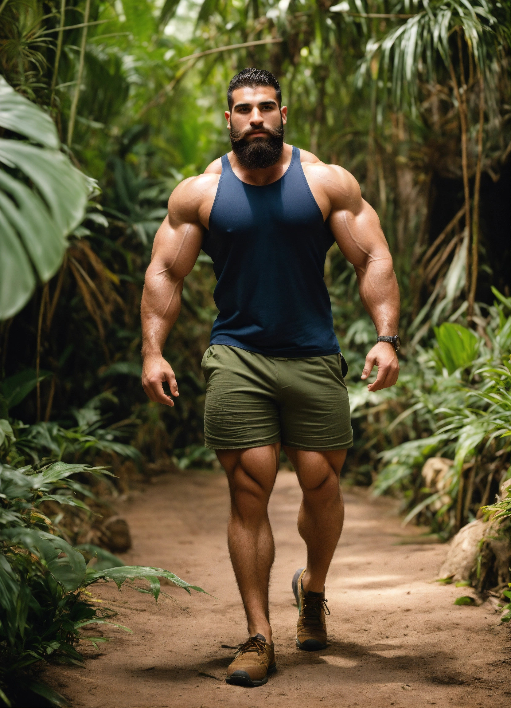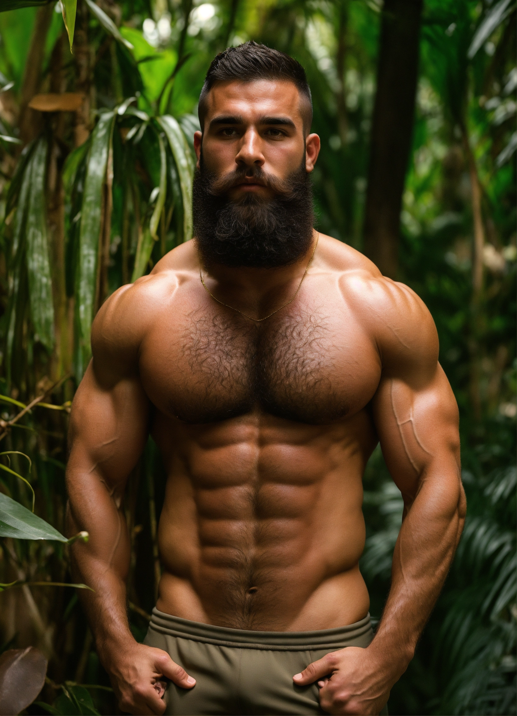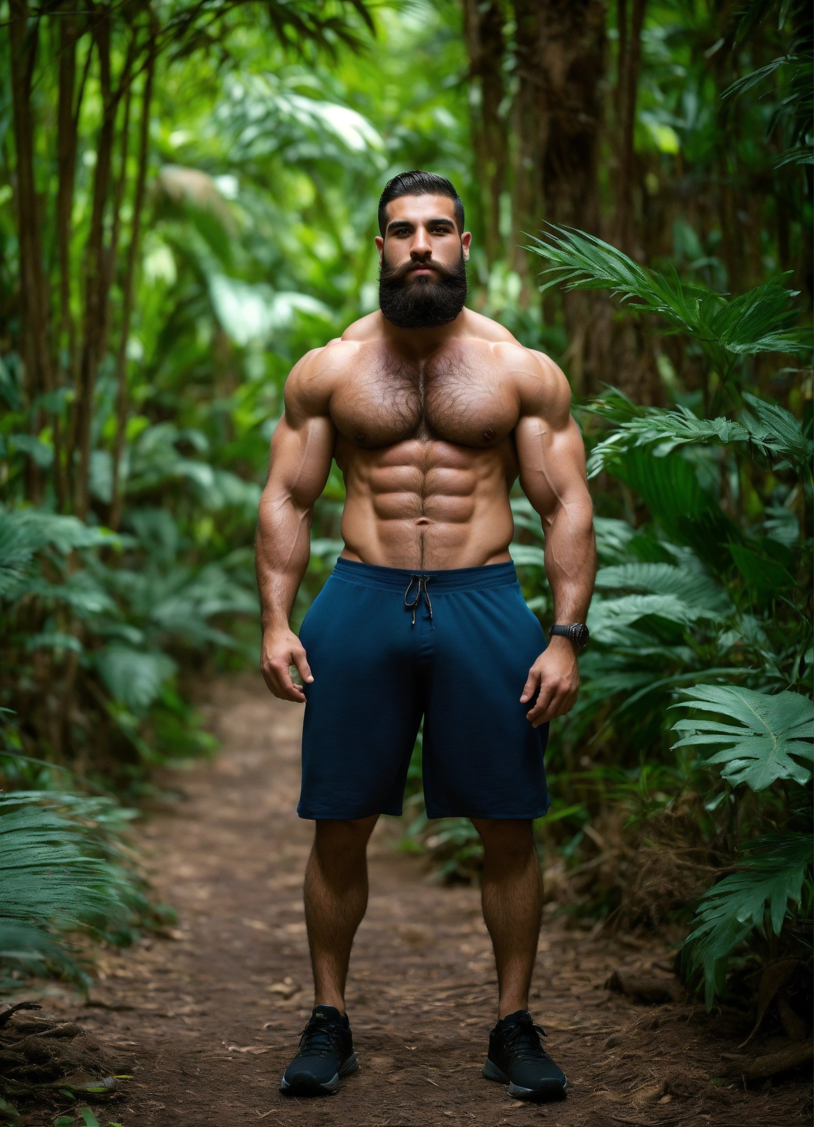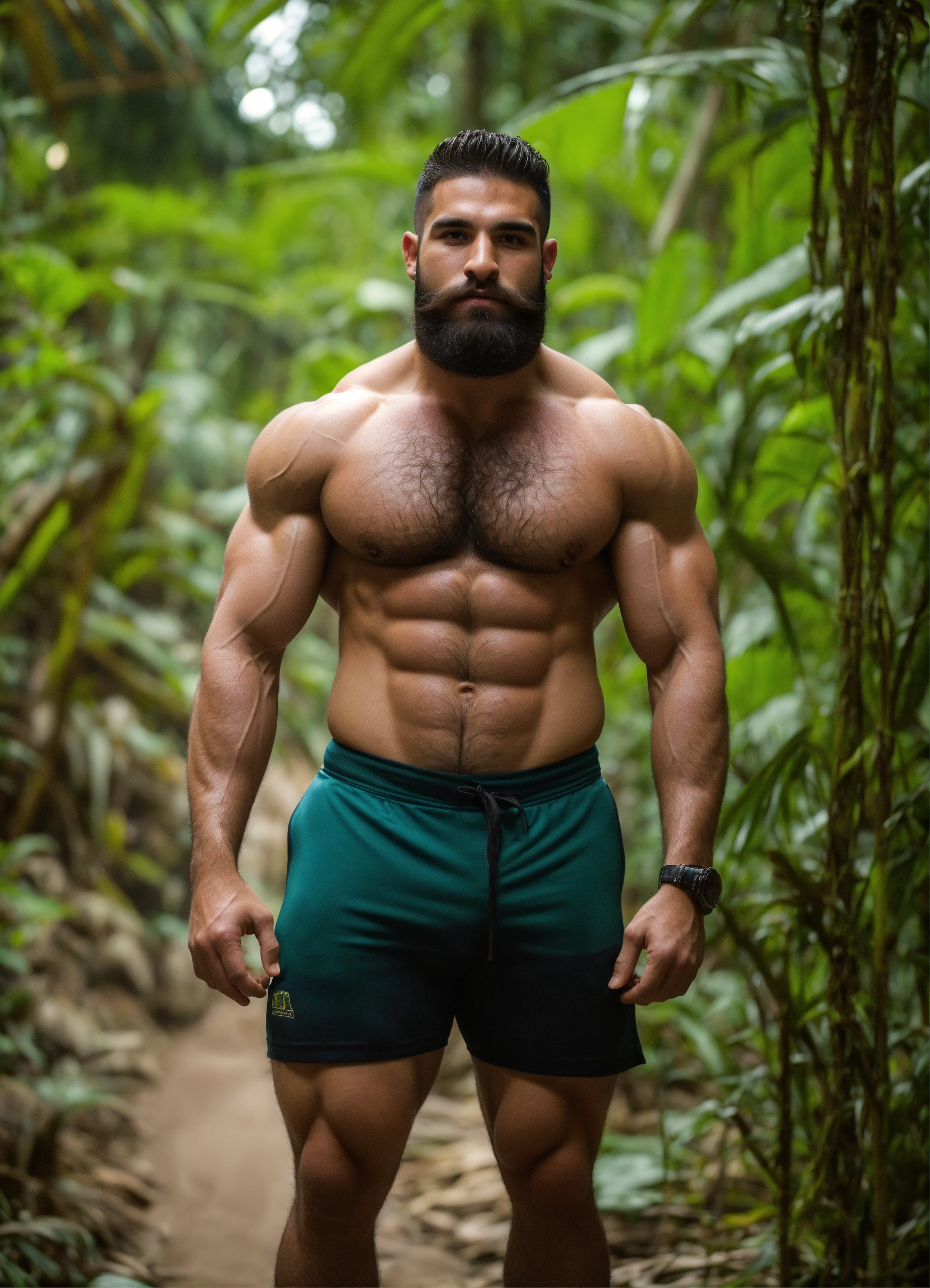 30-year-old man with big muscles, big bodybuilder, arab, medium beard, hairy torso, hairy arms, hairy legs, body like a wrestler, in a jungle