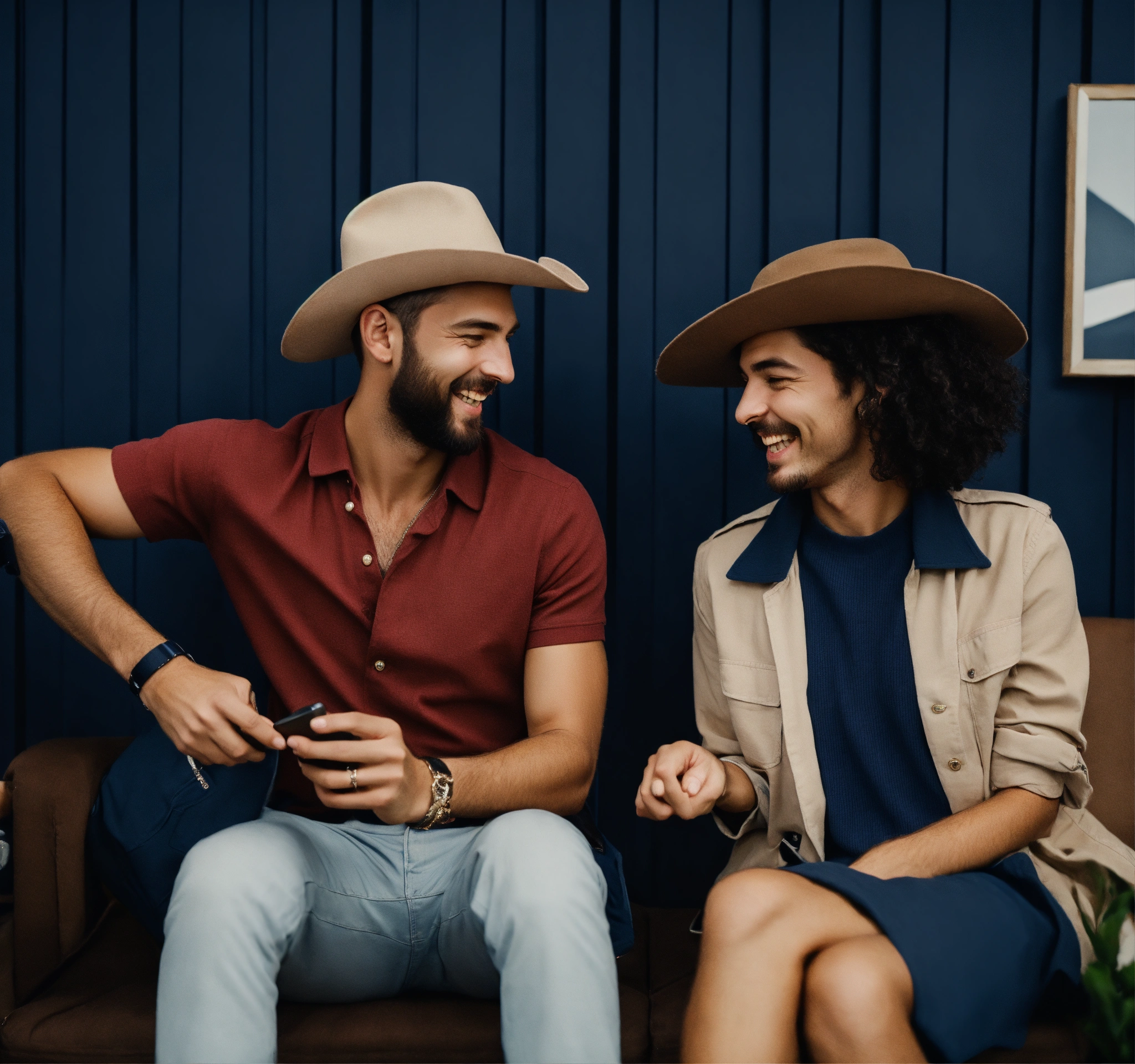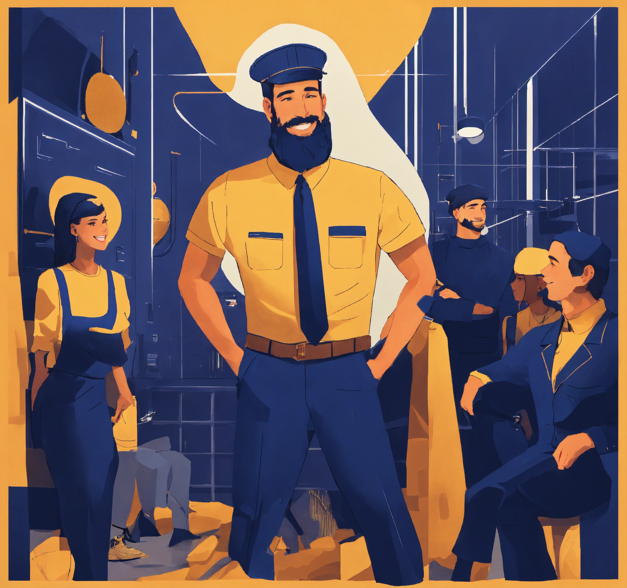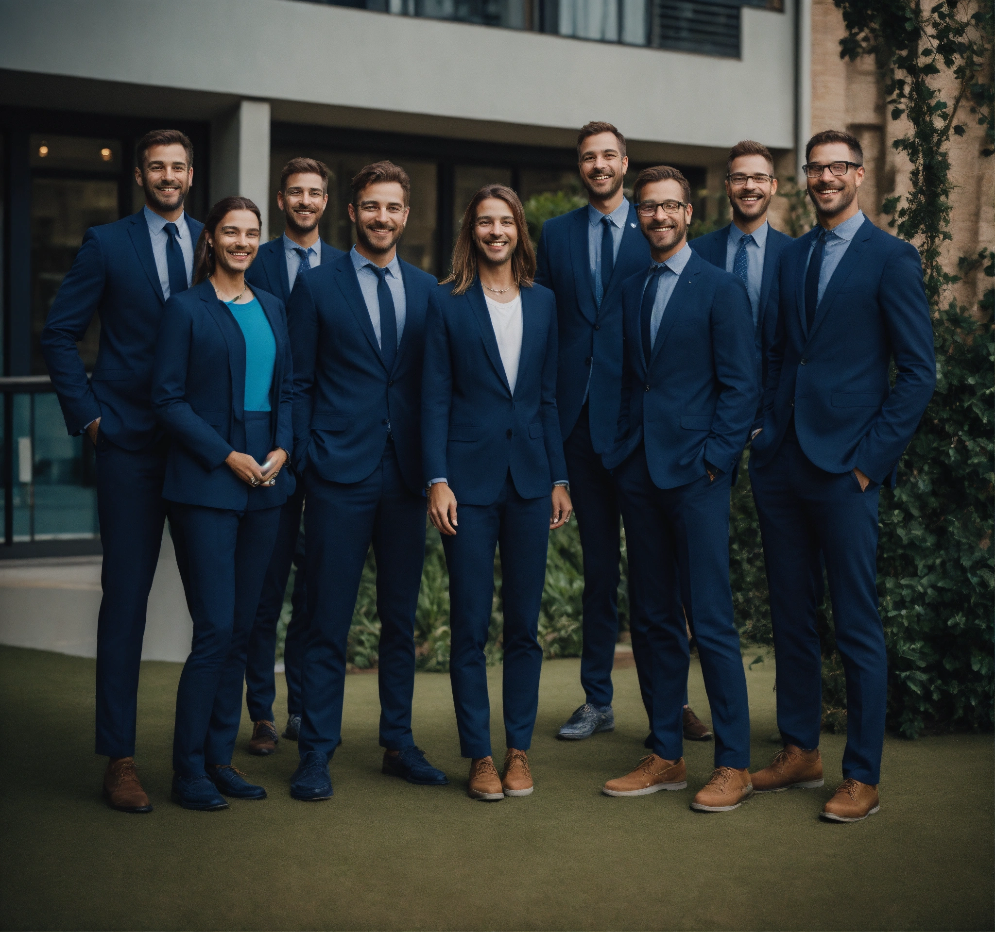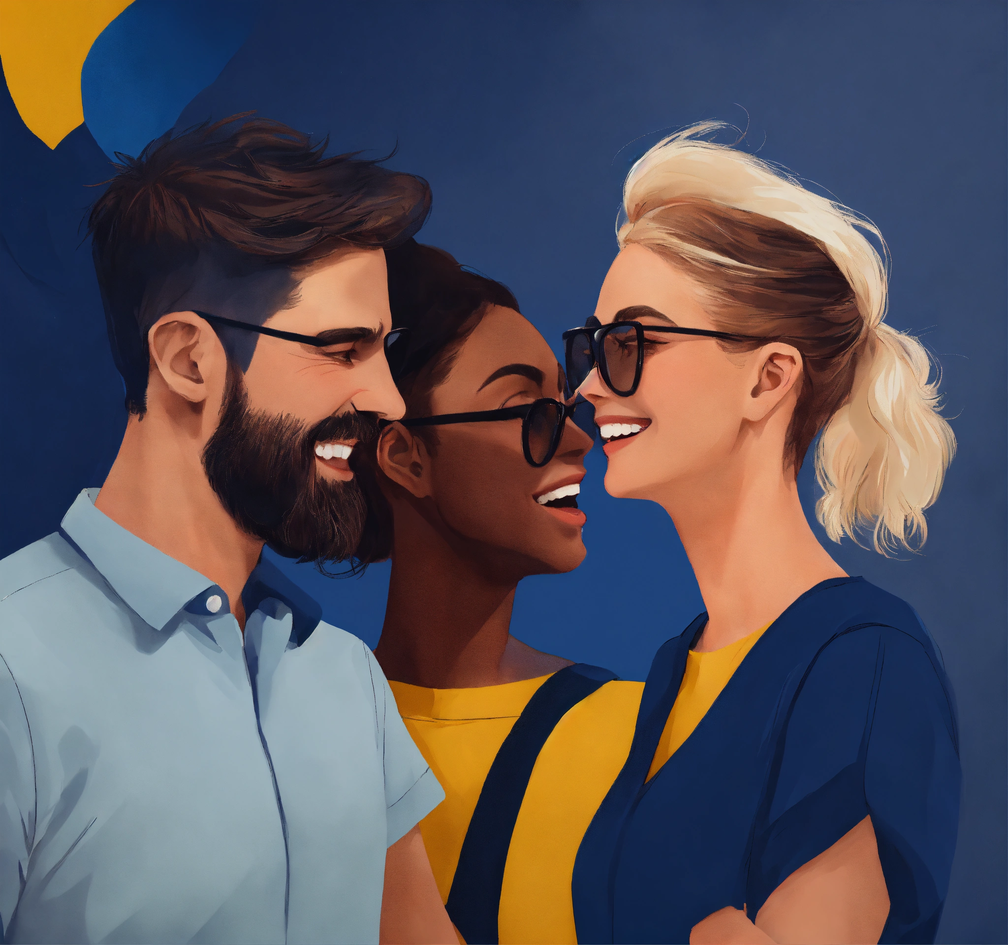 Fun innovative interacting caucasian smiling persons convinced with deep navy blue color dominance