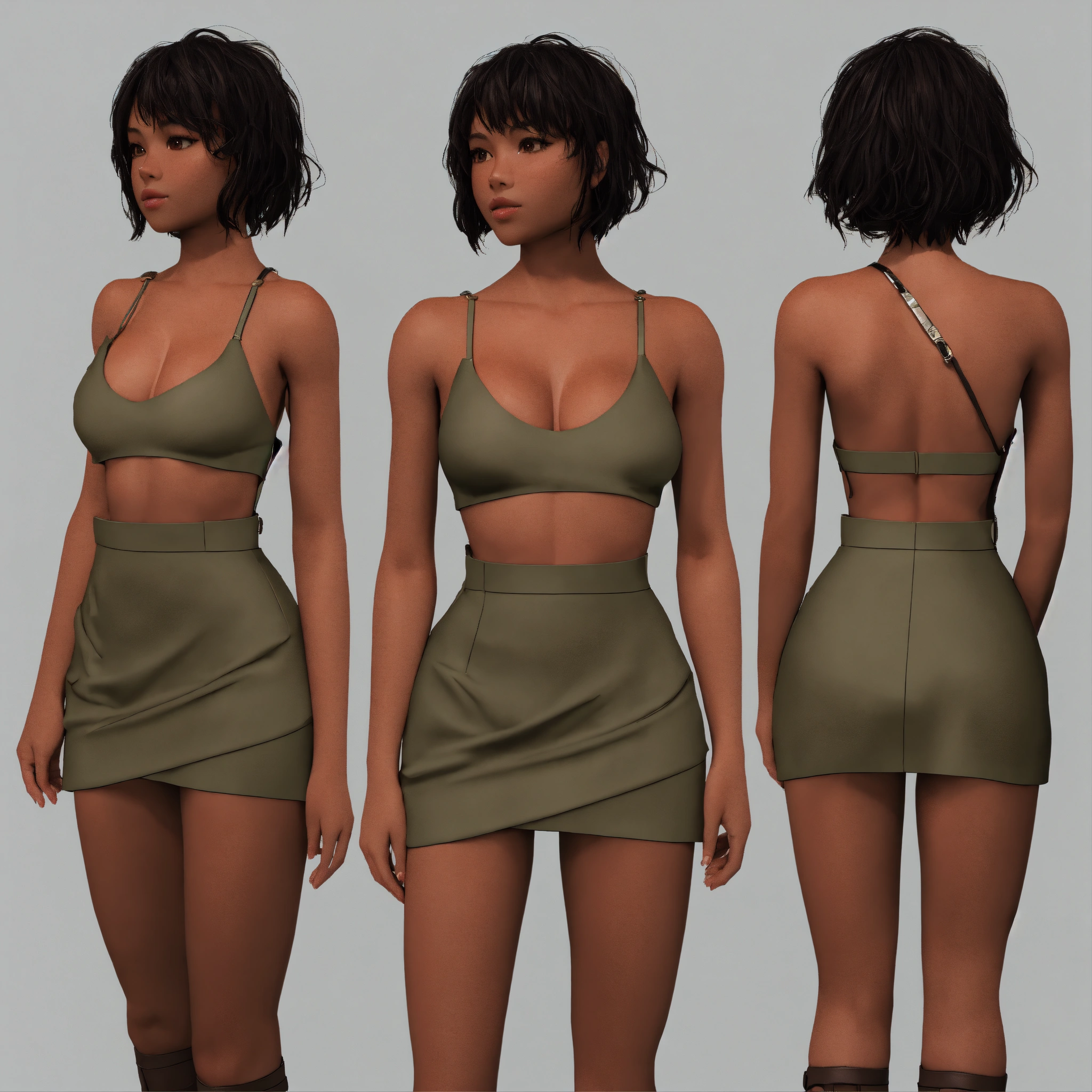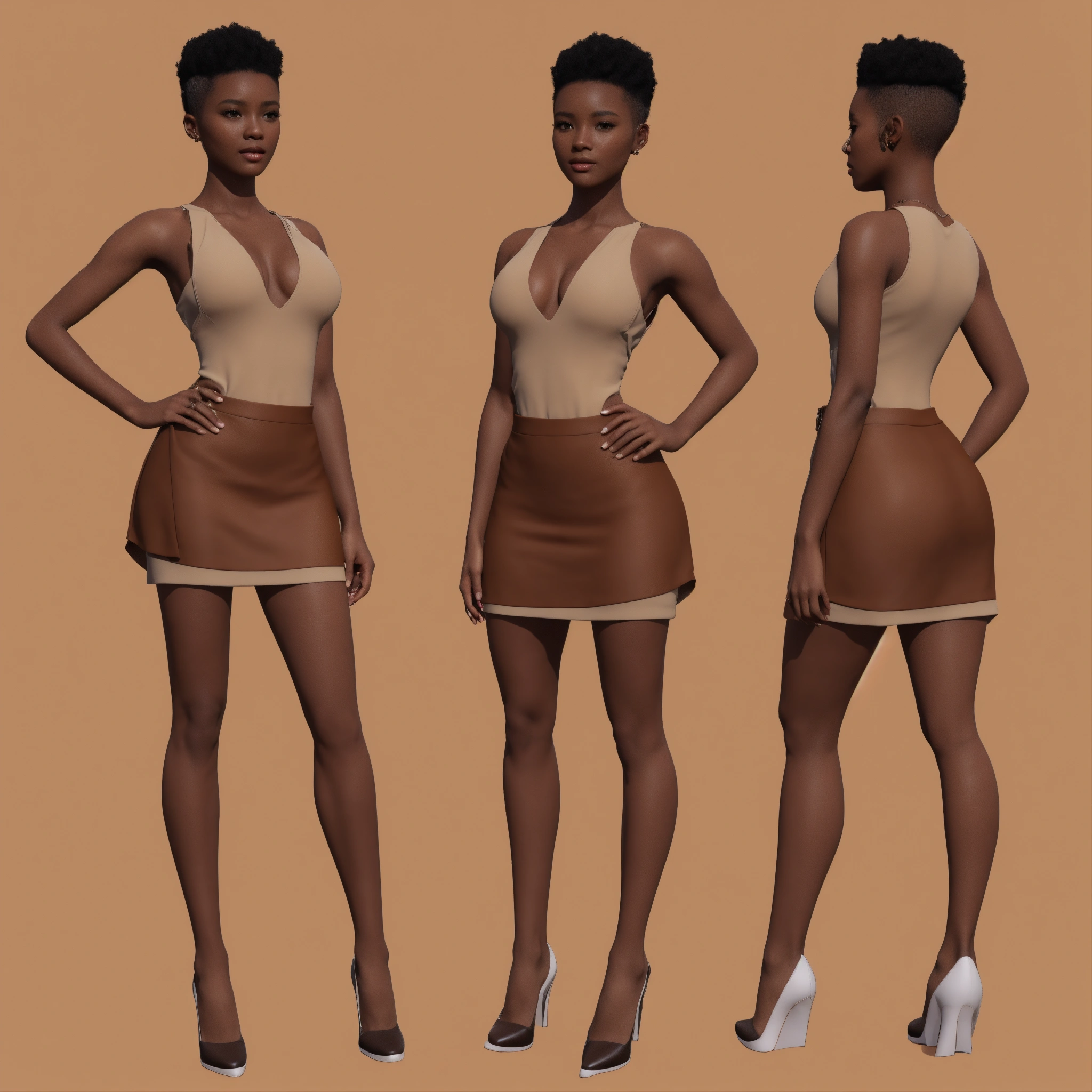Brown skin, asymmetrical, no shadows, tan skin, gorgeous woman, white background, short hair, standing, facing front. hd, 3((((((((((((show whole body)))))), no shadows, wearing a black mini skirt, full frame of the body 35mm wide angle shot, make image into 3d, coloring book, hd, normal chest, [[[[[[[make a turnaround sheet of image]]]]]]!, ((((((((((((show whole body)))))), no shadows, brown skin, asymmetrical, no shadows, brown skin 4k
