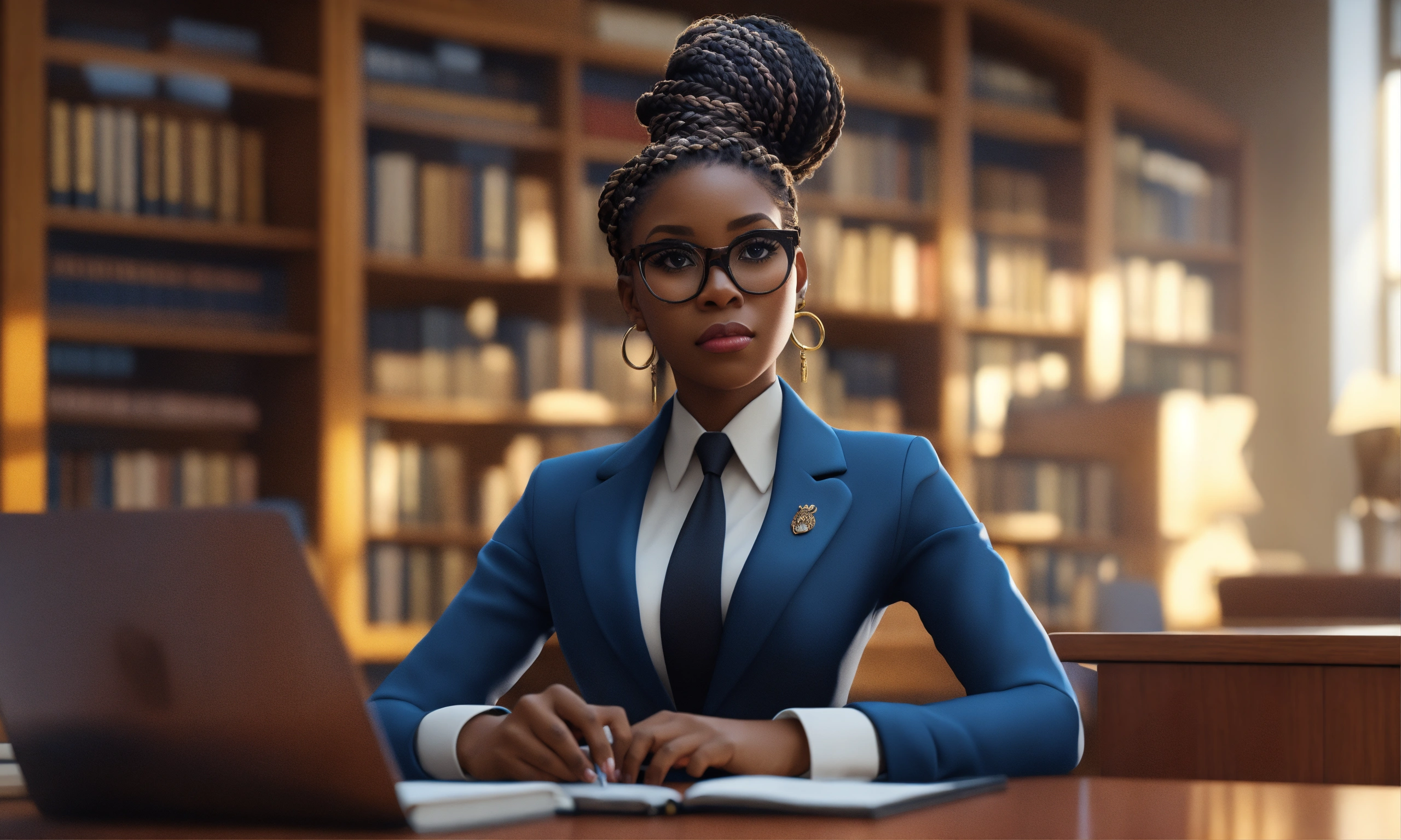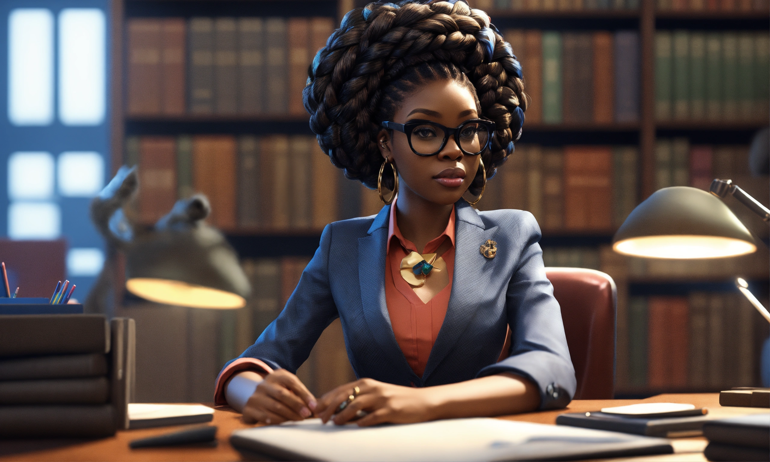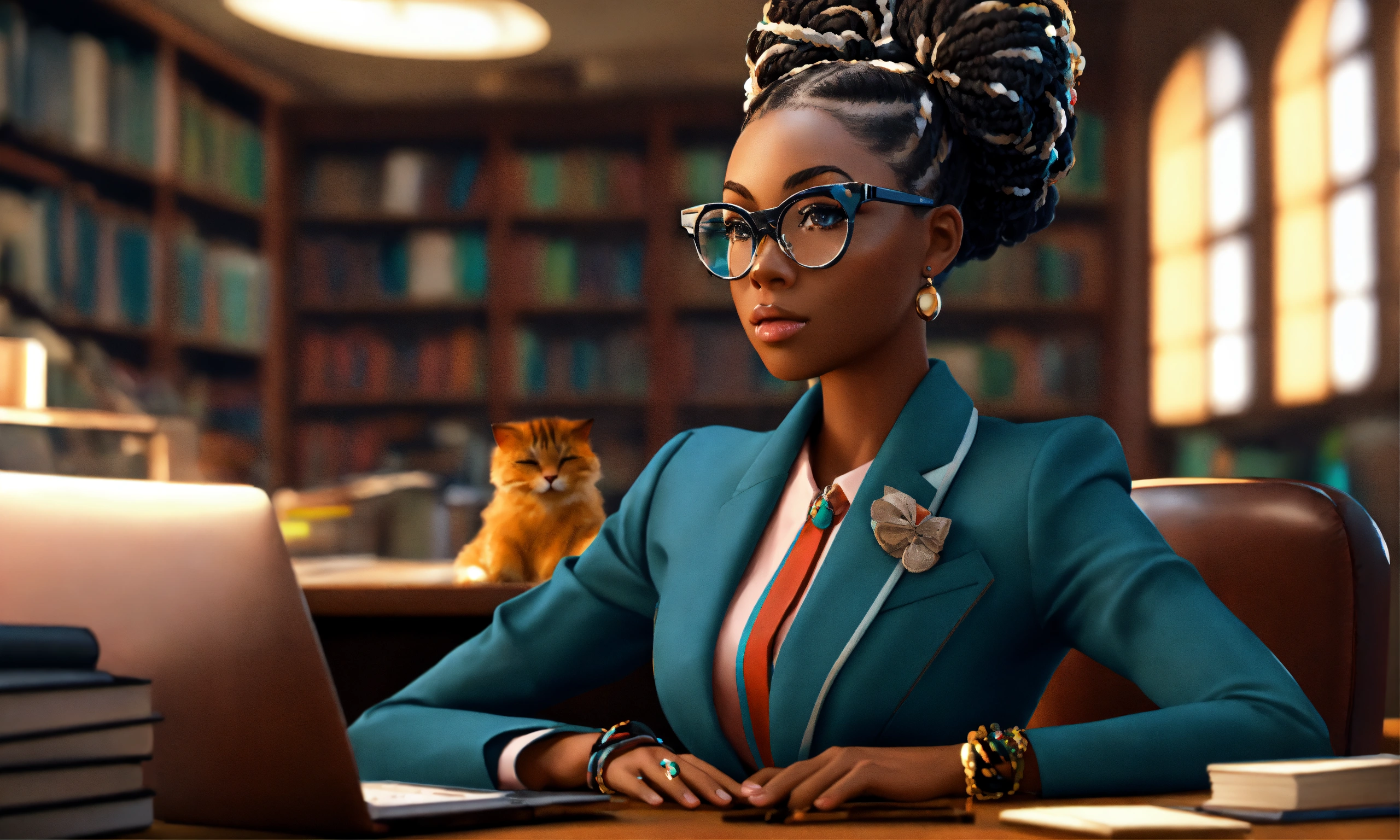 Hd 3d render of an afrocentric black woman, stylishly decorated reverse french braided chignon hair style with oversized cat-eye designer glasses, at the work office, funky oversized lapel detailing in a monotone pants suit, sitting at a desk in a law school library. moe ghibli anime pixar storybook inspired