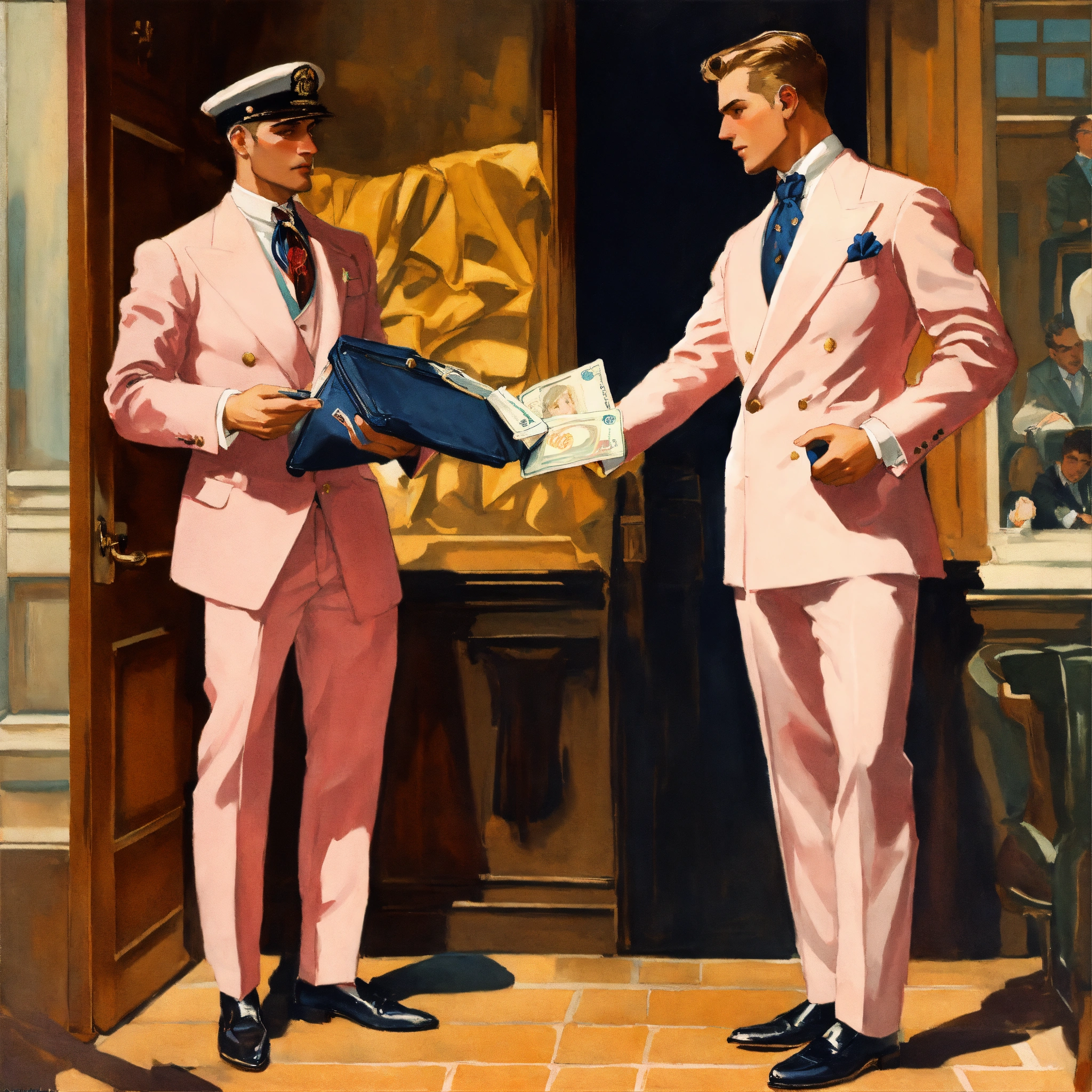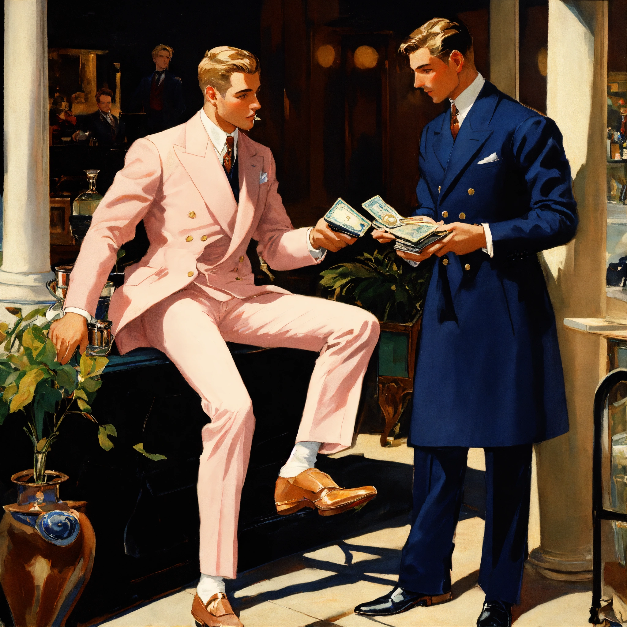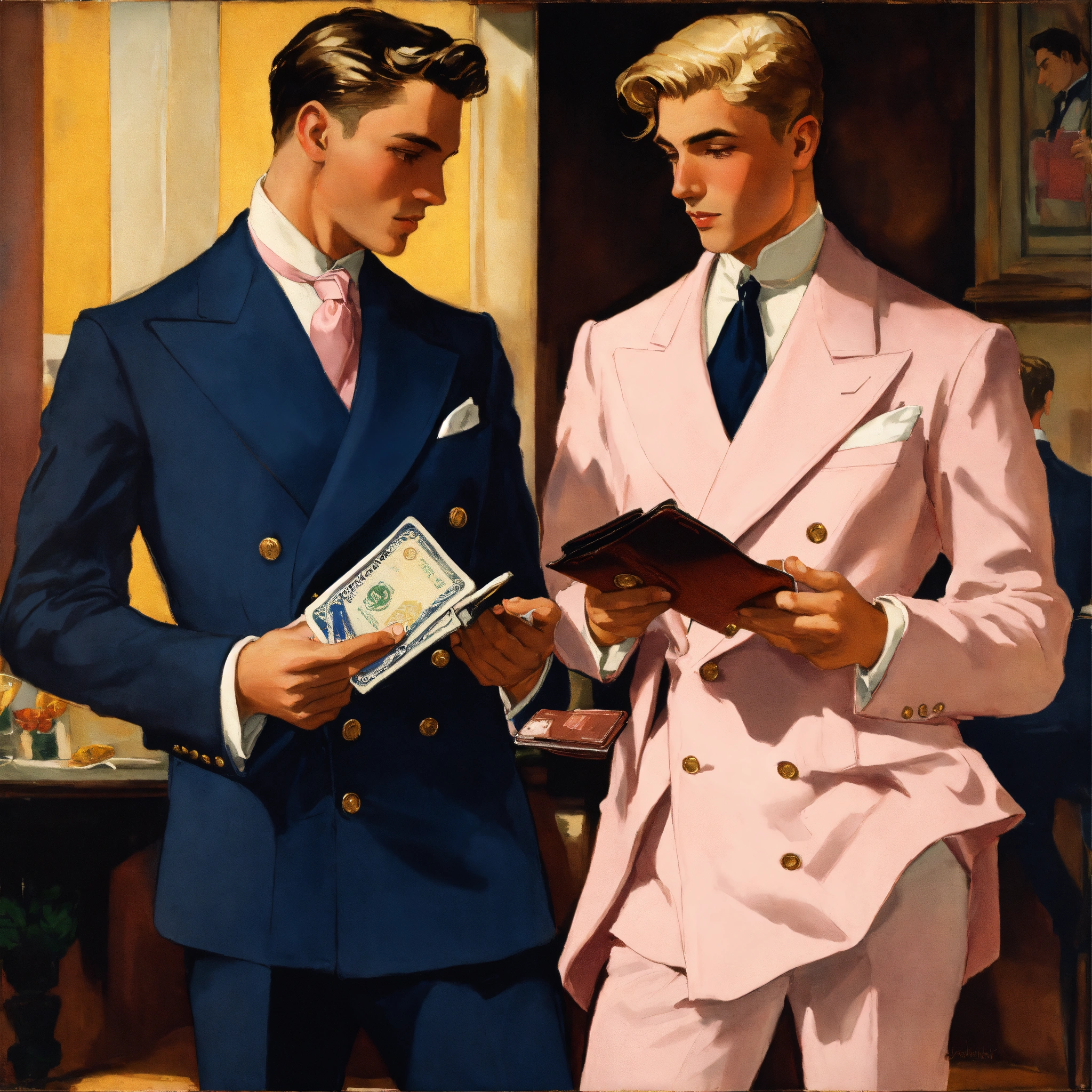 An italian businessman in navy double breasted suit, taking out this wallet to pay a young blonde gentleman in pale pink jacket and white pants, leyendecker style