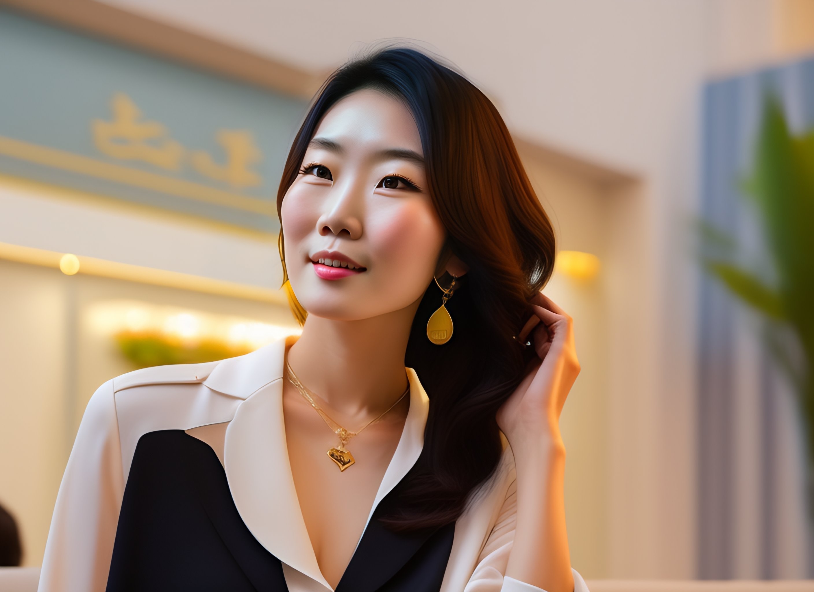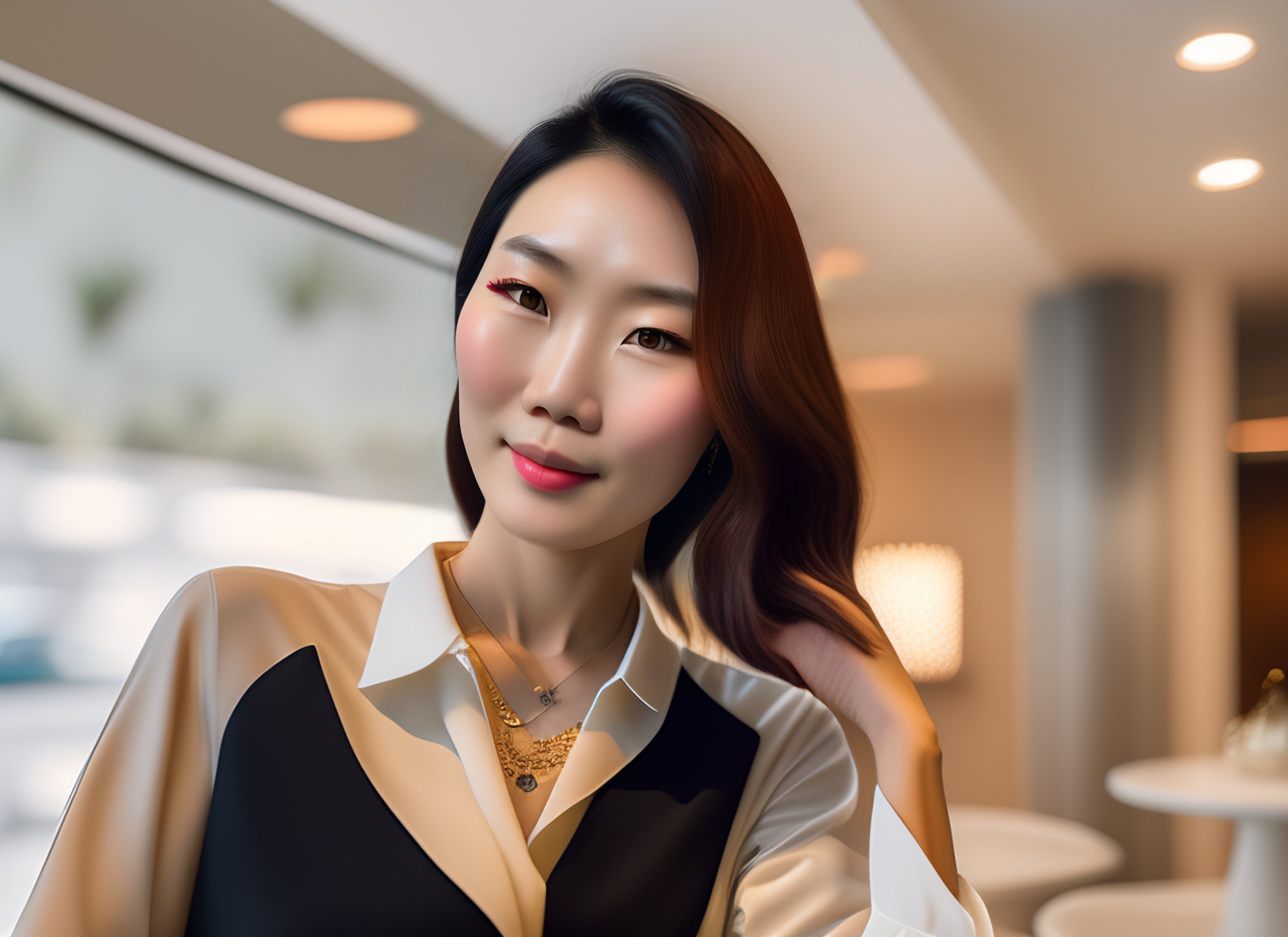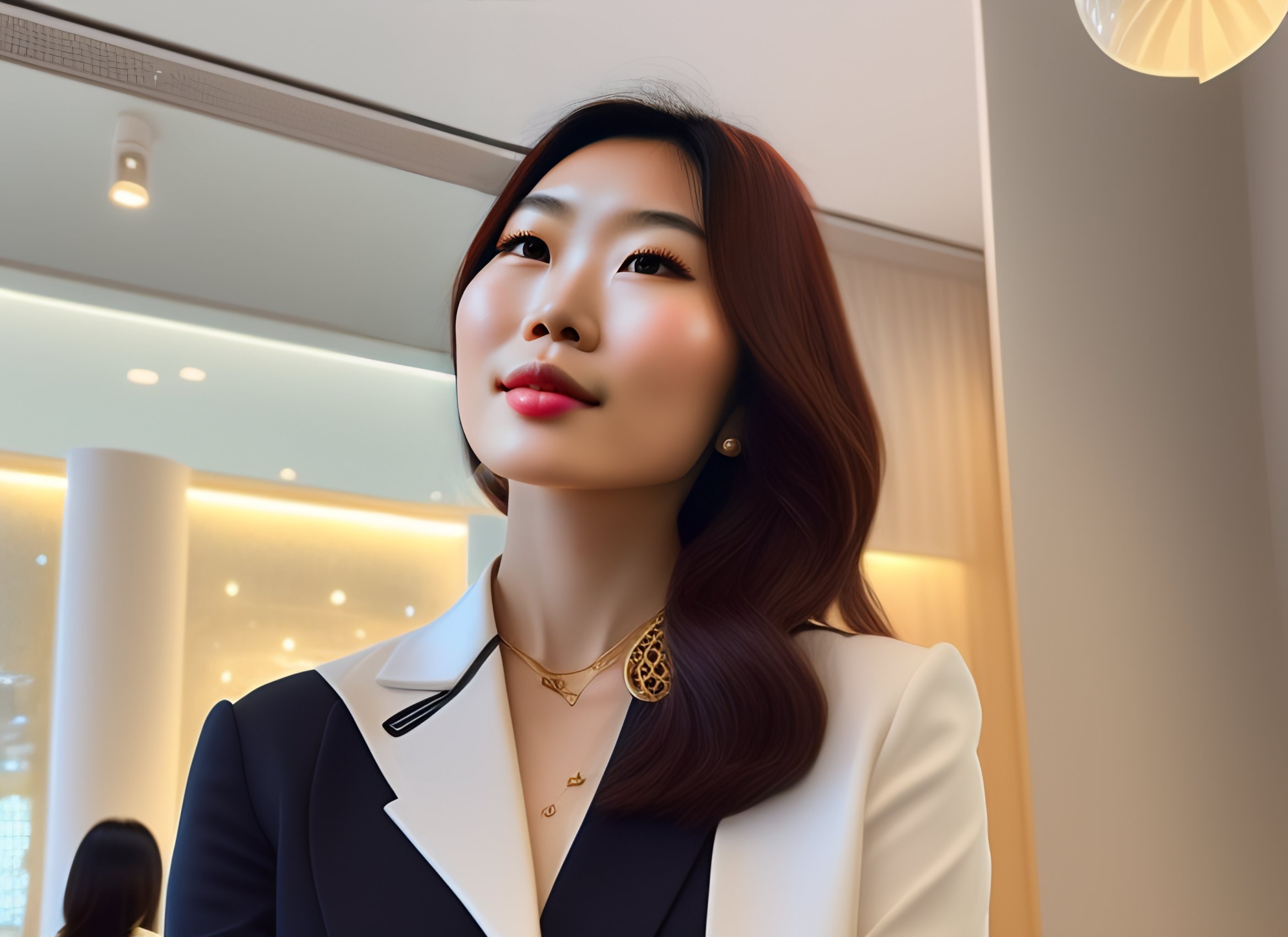 30ish taiwanese woman has a simple and clean aesthetic, wearing a white shirt and black blazer with a statement necklace that incorporates elements of different cultures. additionally, she is wearing a smartwatch on her left wrist. overall, she exudes a sense of confidence and independence, embracing her unique style and interests with pride.