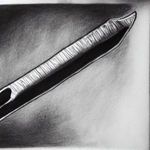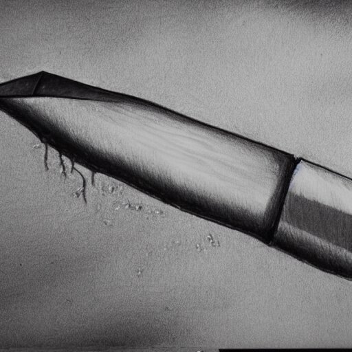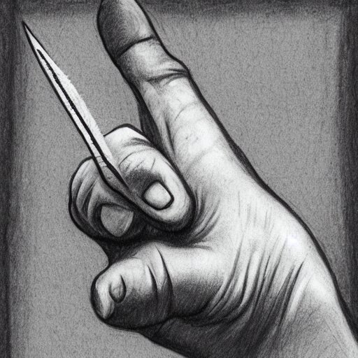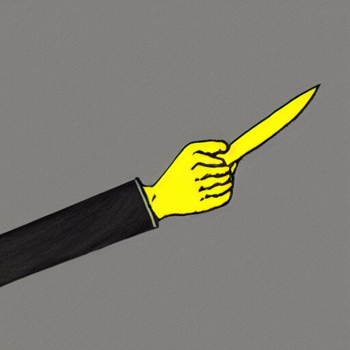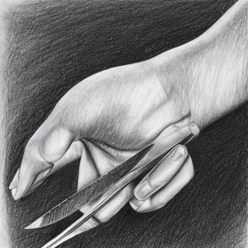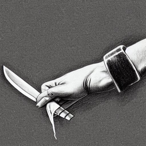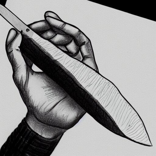 Pencil drawing of a hand holding a butcher knife dripping with sticky yellow residue, hand and knife are black and white