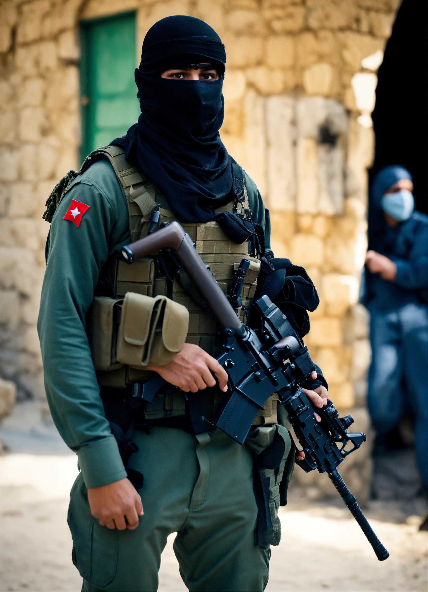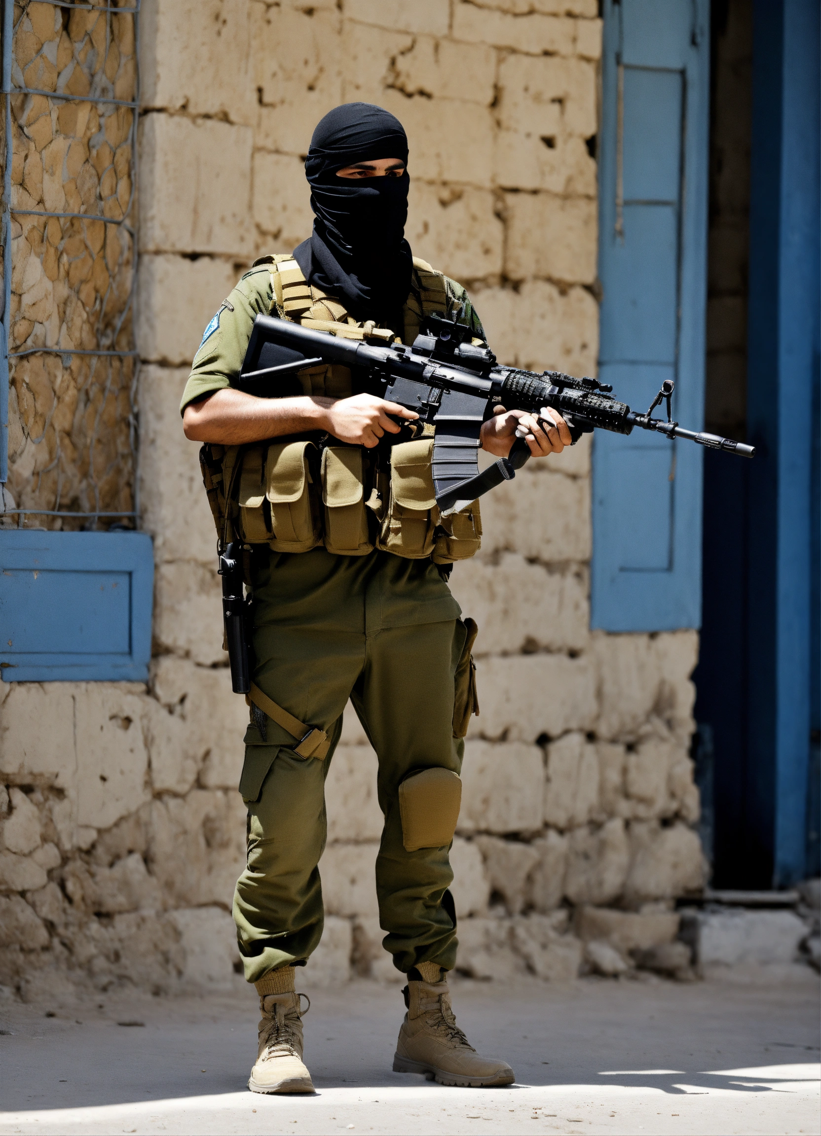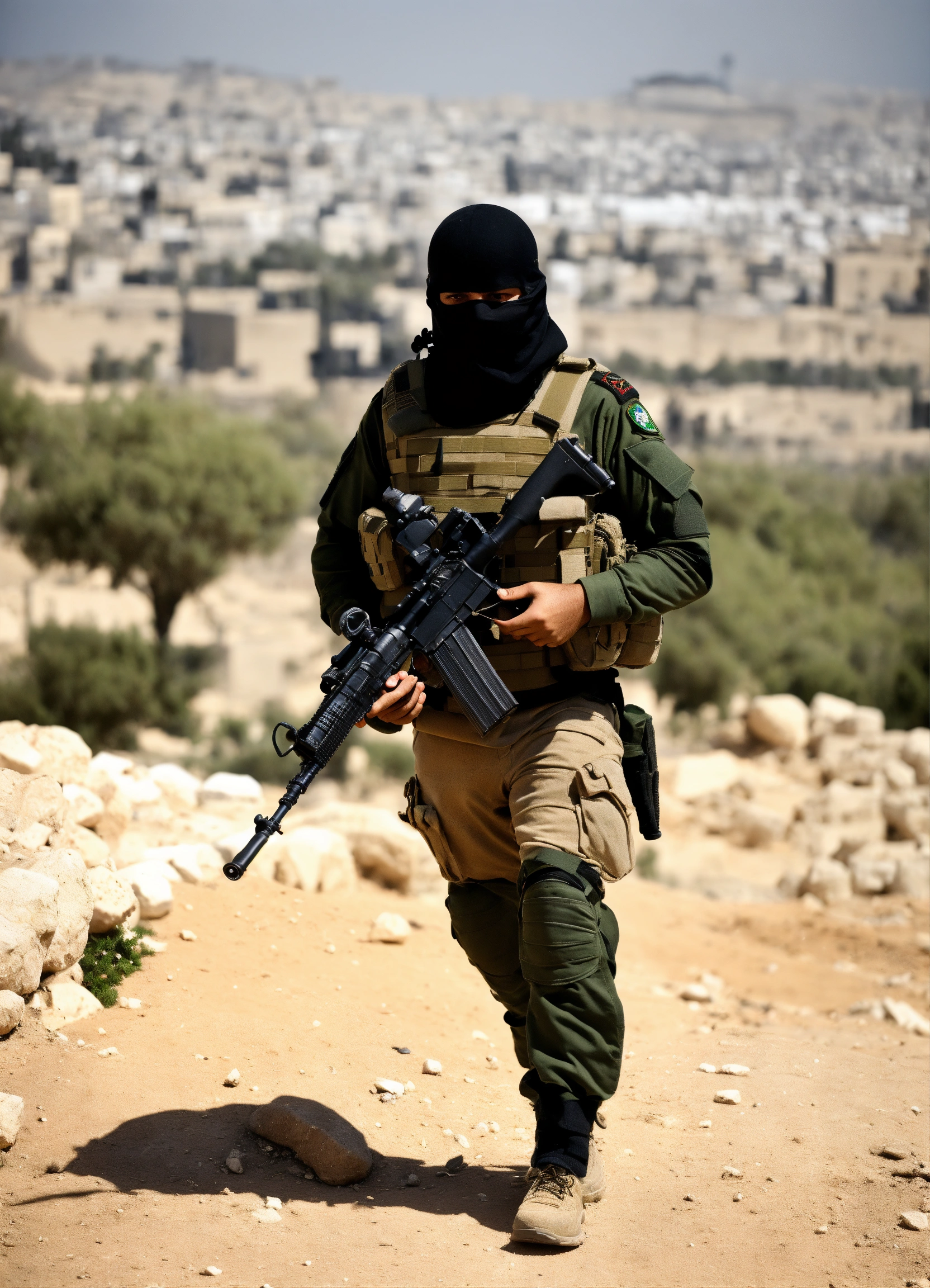 "an israeli soldier equipped with the latest weapons and a palestinian fighter masked in a black balaclava carrying a traditional rifle, "
