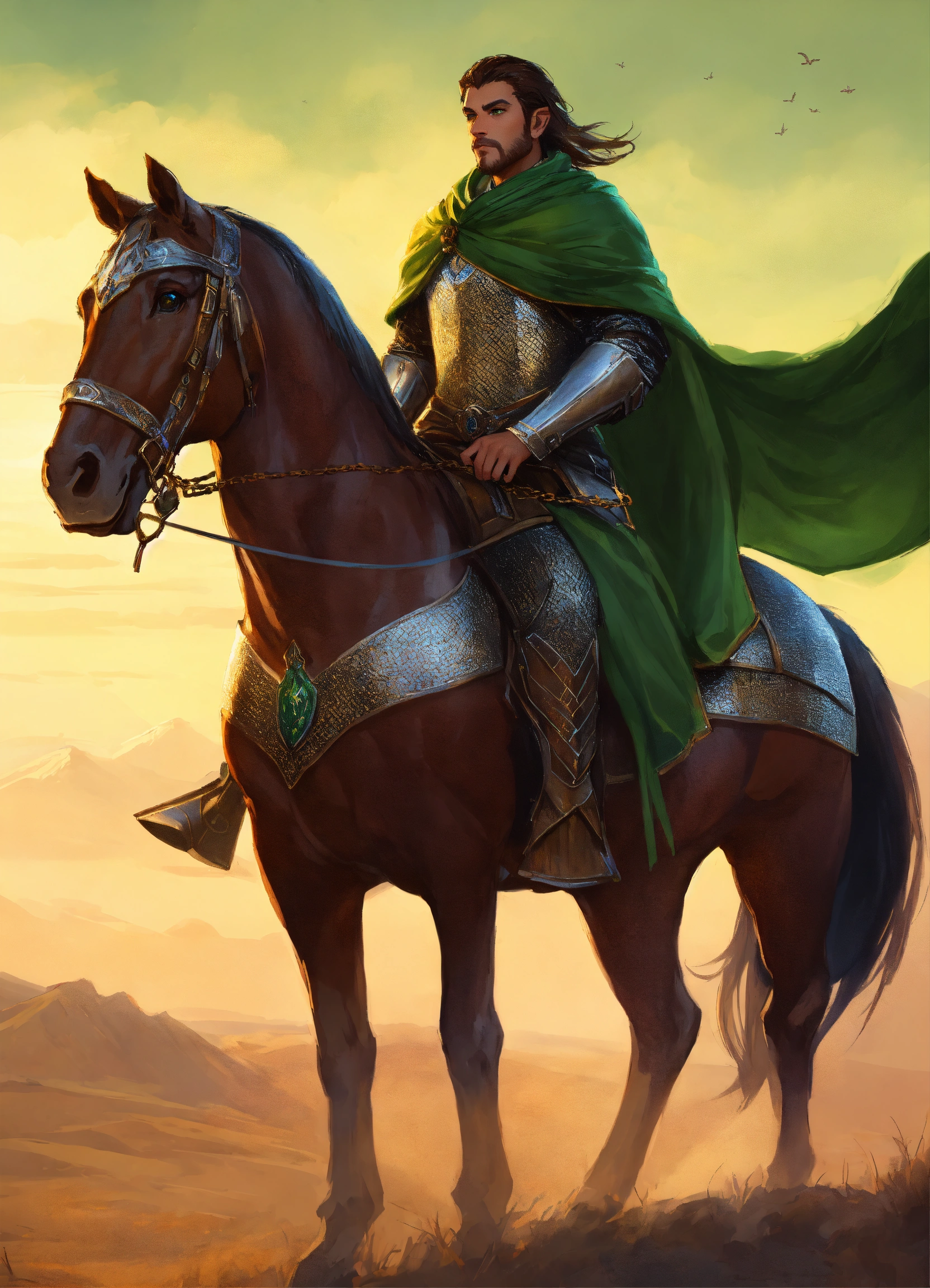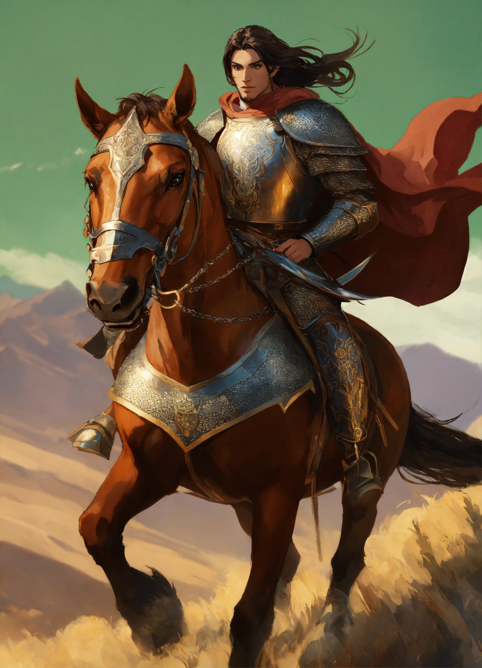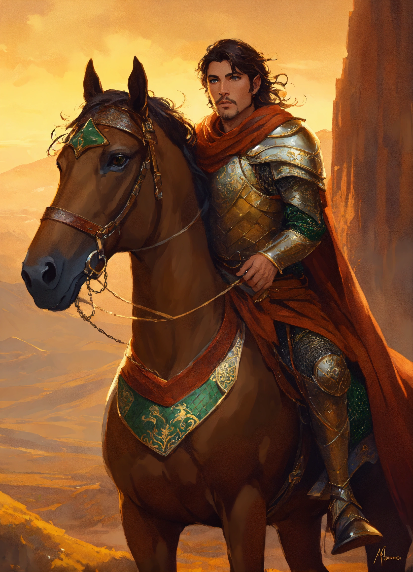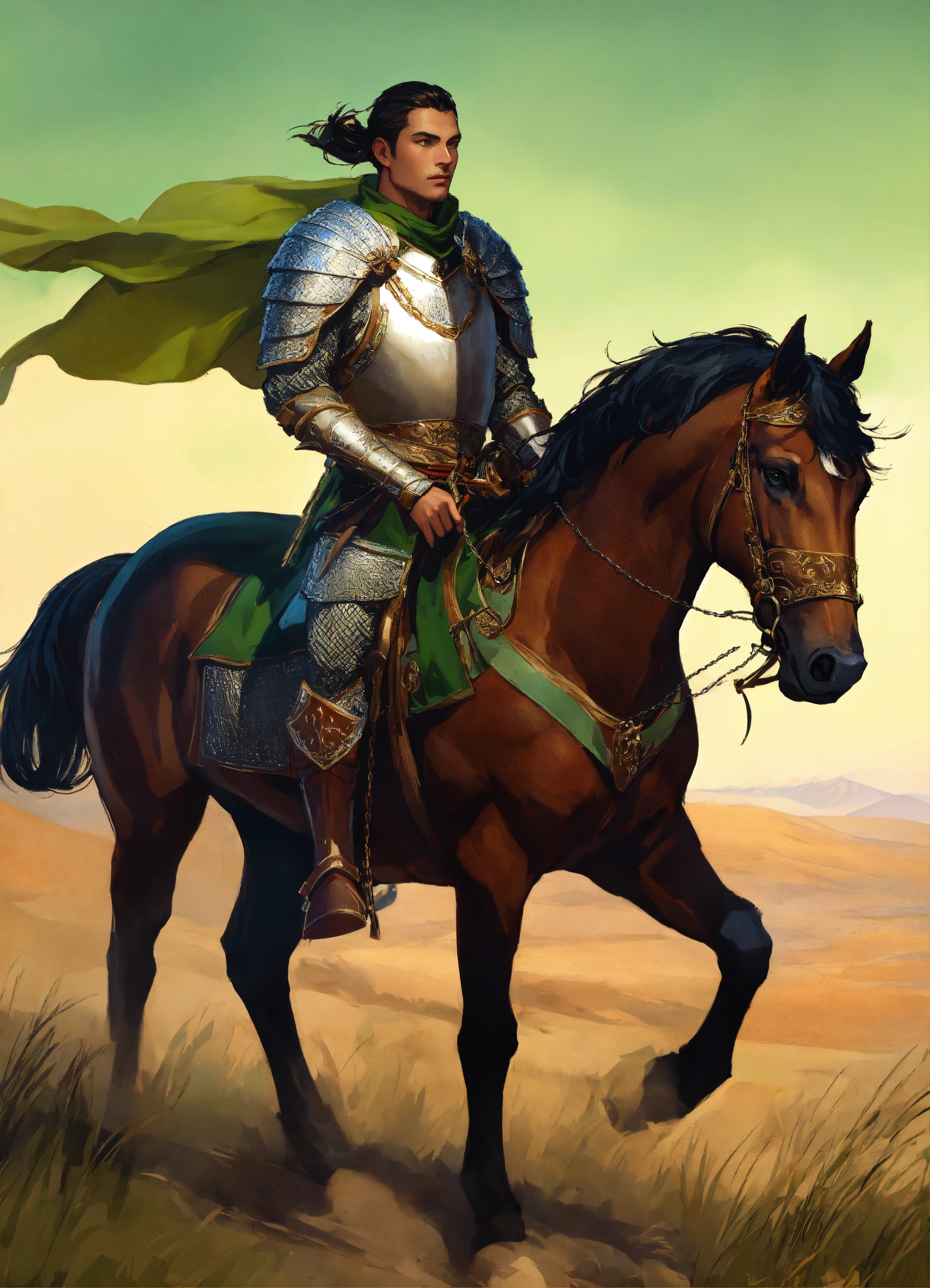 A heavily armored persian cataphract male elf in chain mail armor, riding a large brown horse that wears chainmail barding, dark brown hair, green eyes, background mongolian plains, exotic, pretty face, elegant, highly detailed, digital painting, artstation, concept art, smooth, sharp focus, illustration, art by artgerm and greg rutkowski and alphonse mucha, erte, 8 k