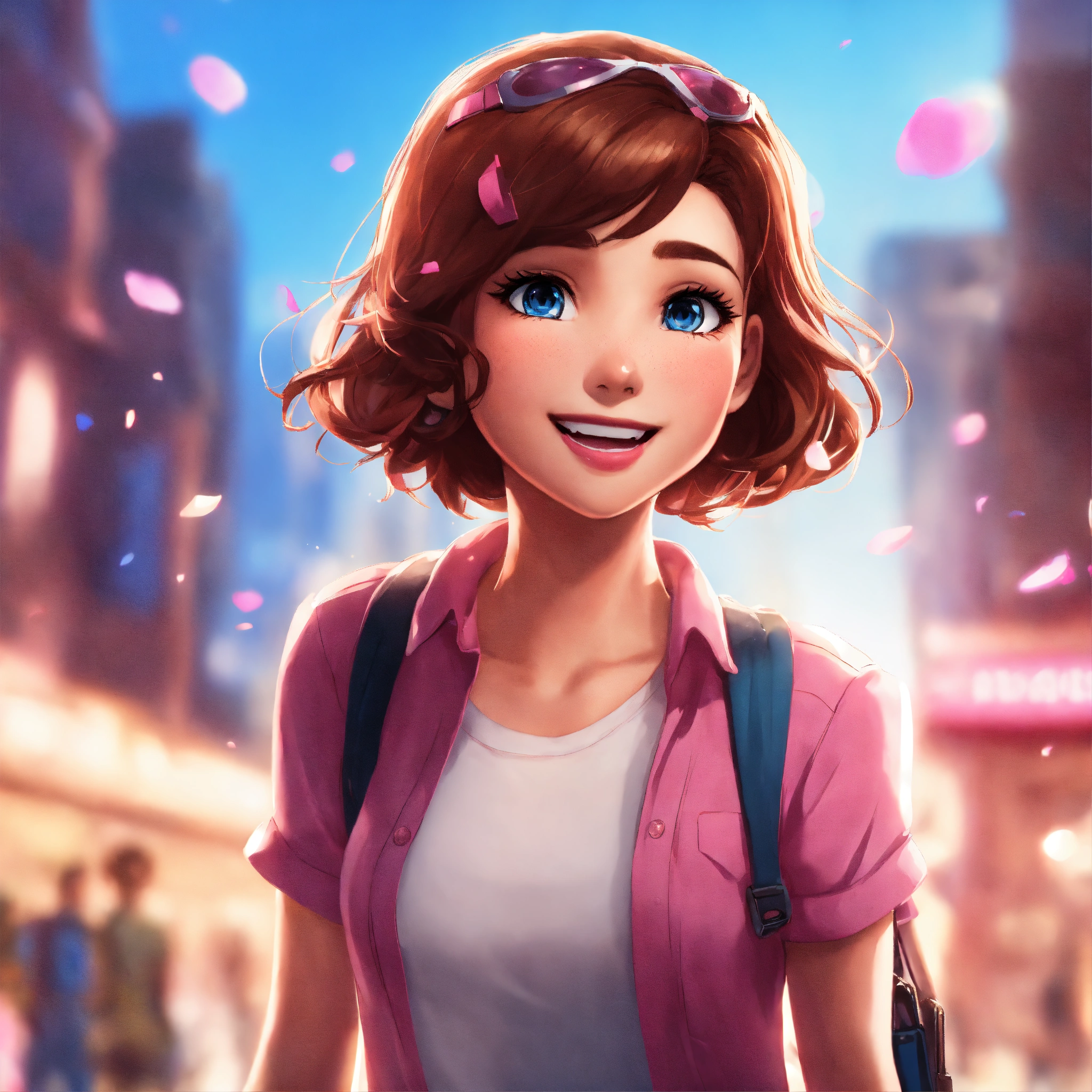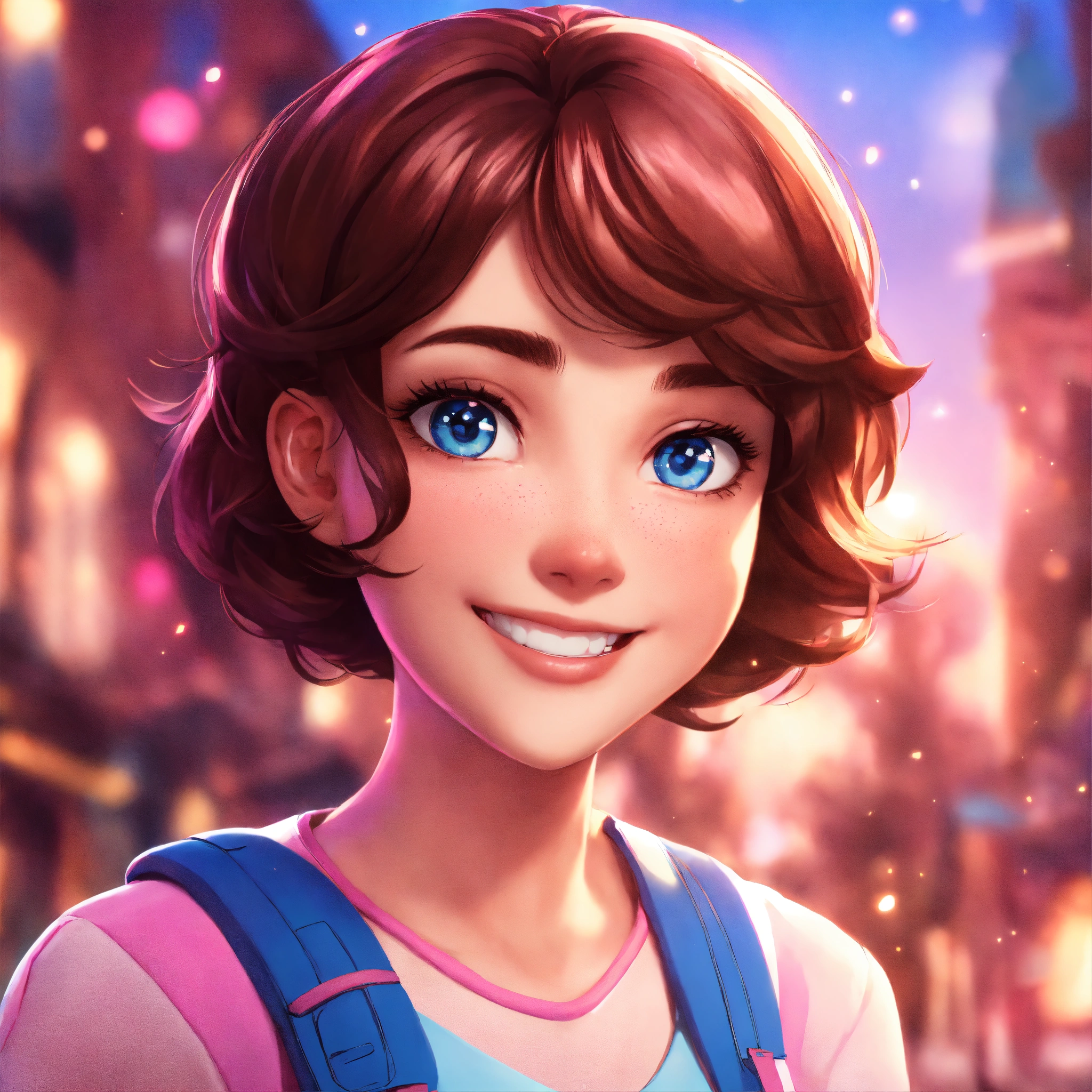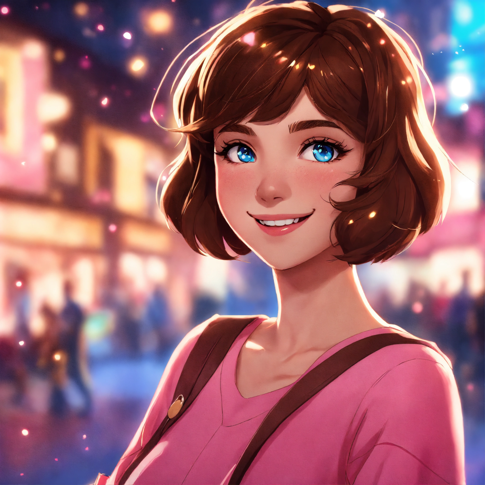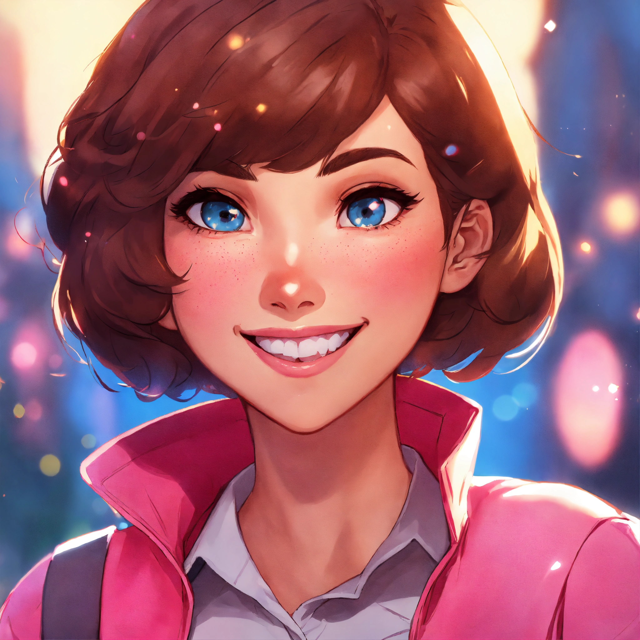Animated character, short brown hair, smiling, excited, comic book style, white skin, blue eyes, bokeh, pink theme
