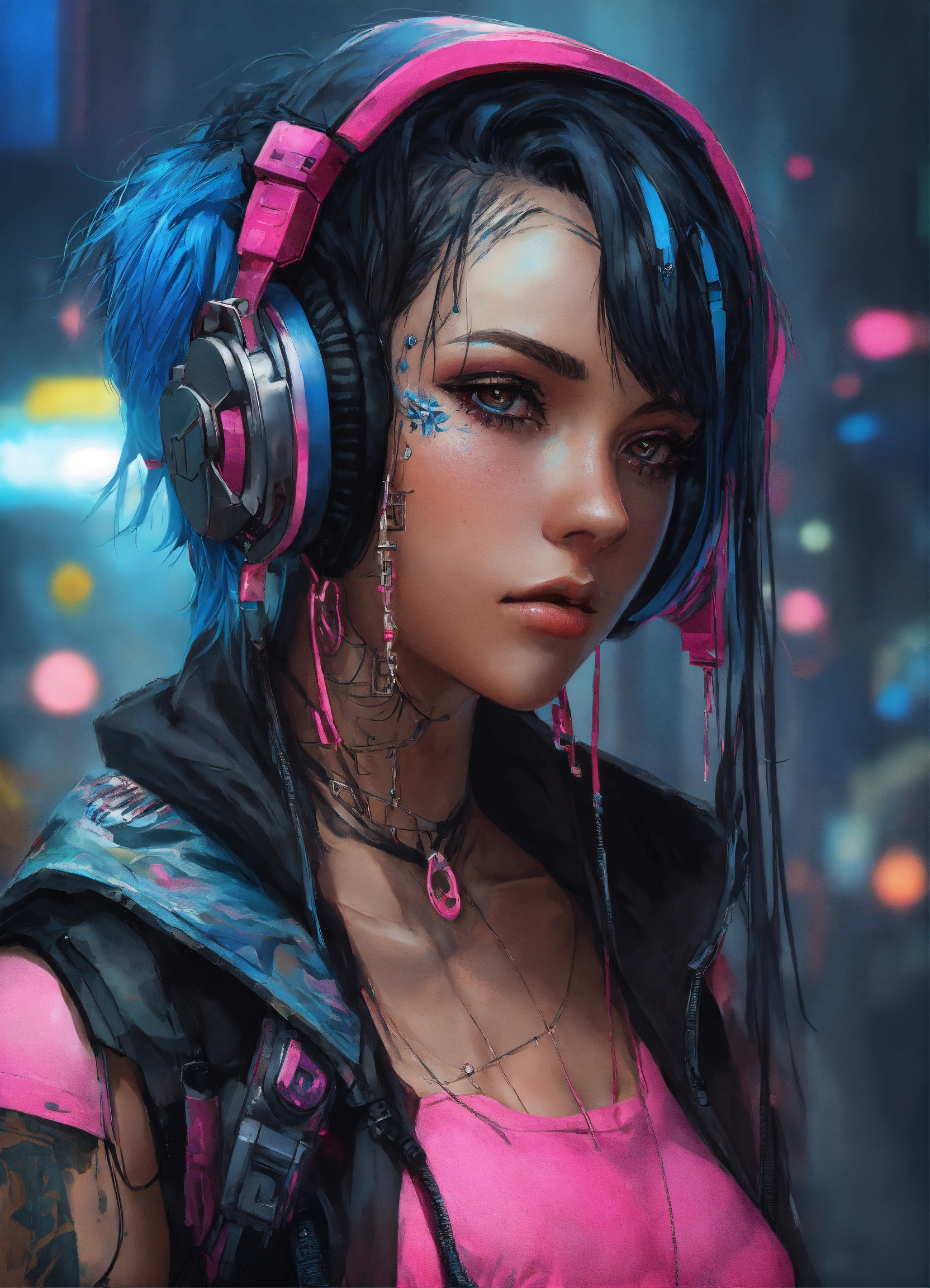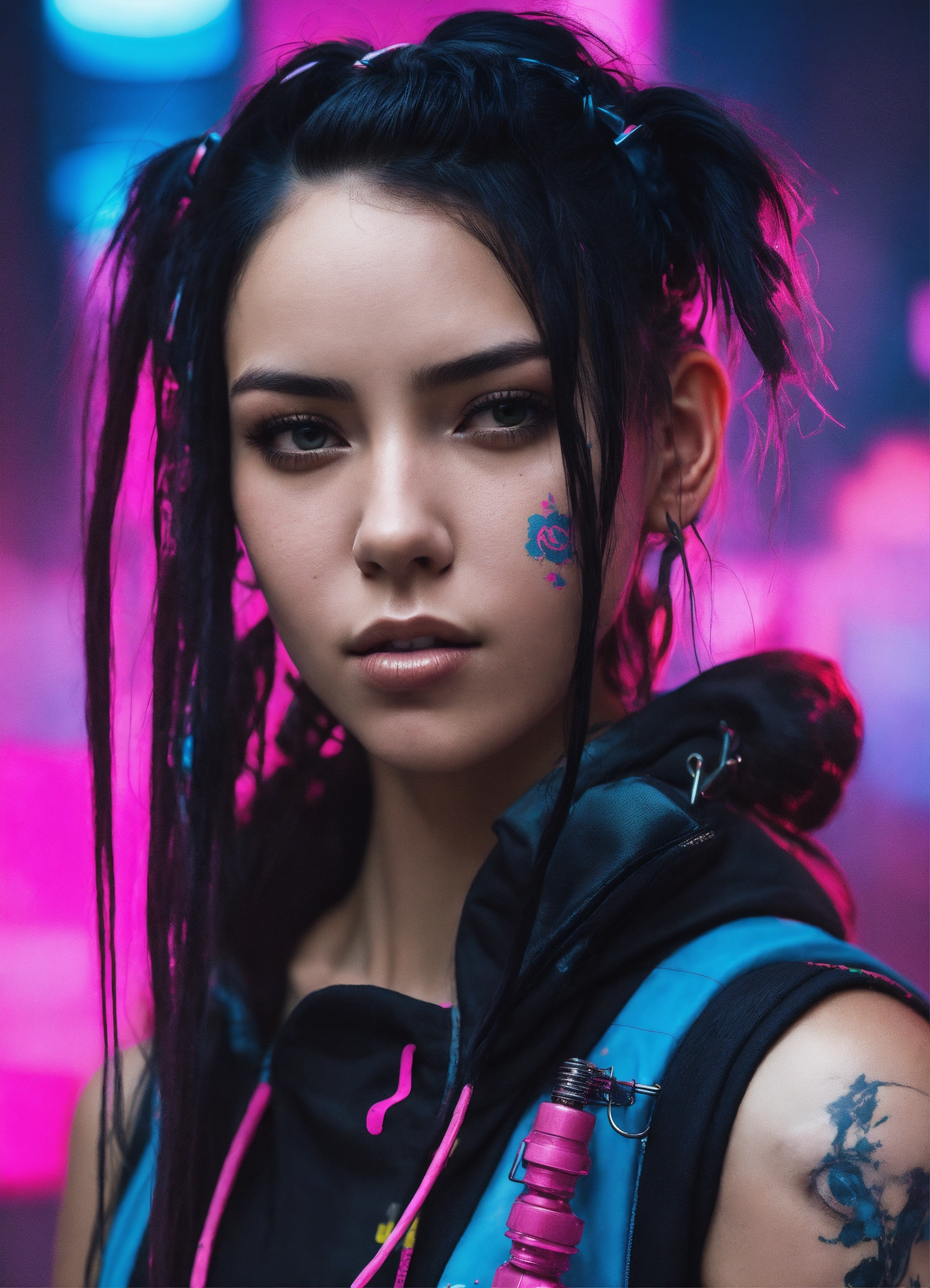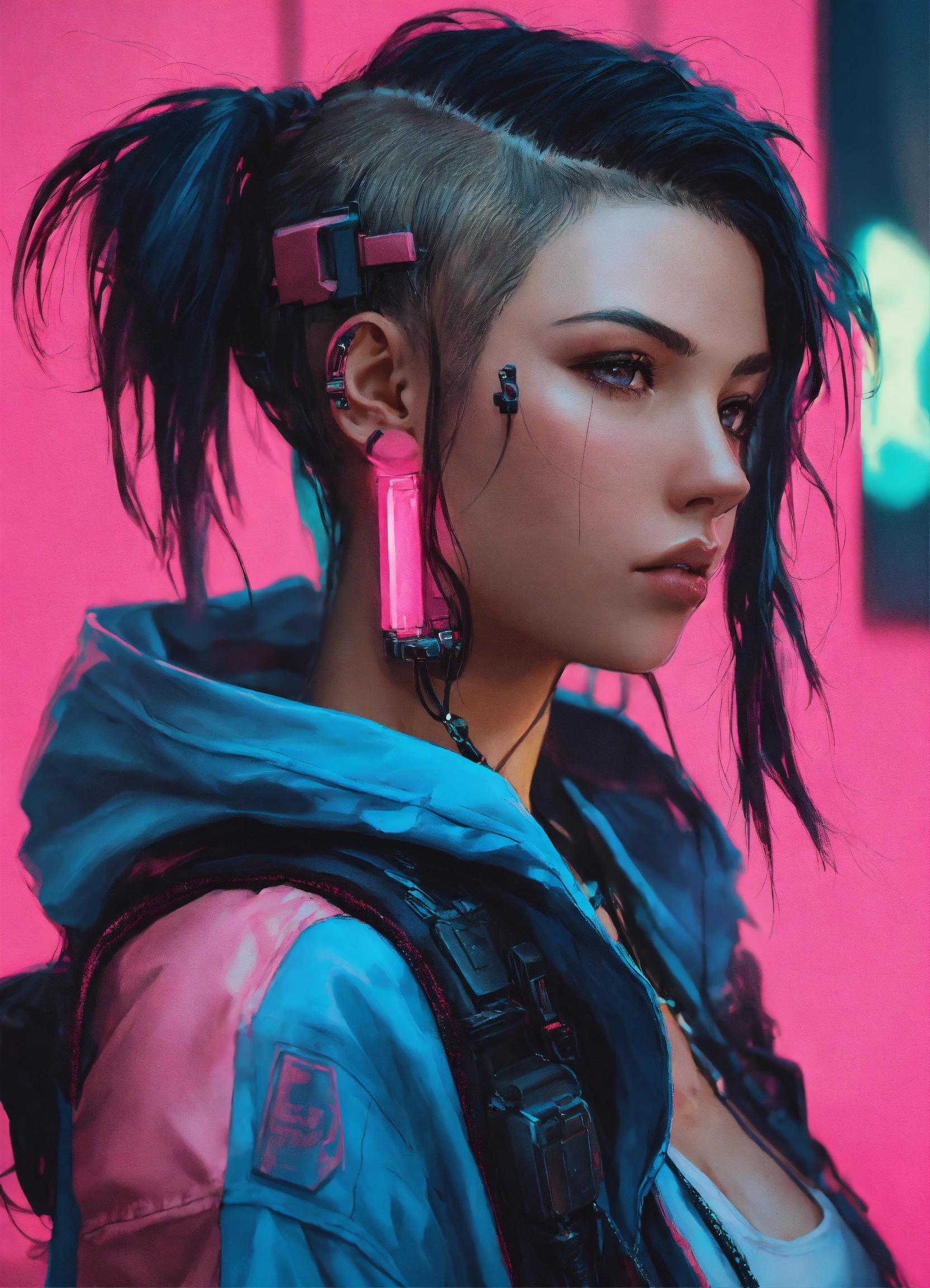 Highly detailed portrait of a cyberpunk woman, with two pigtails, shaven sides, black hair with pink tips, blue sleeveless hood, grungy