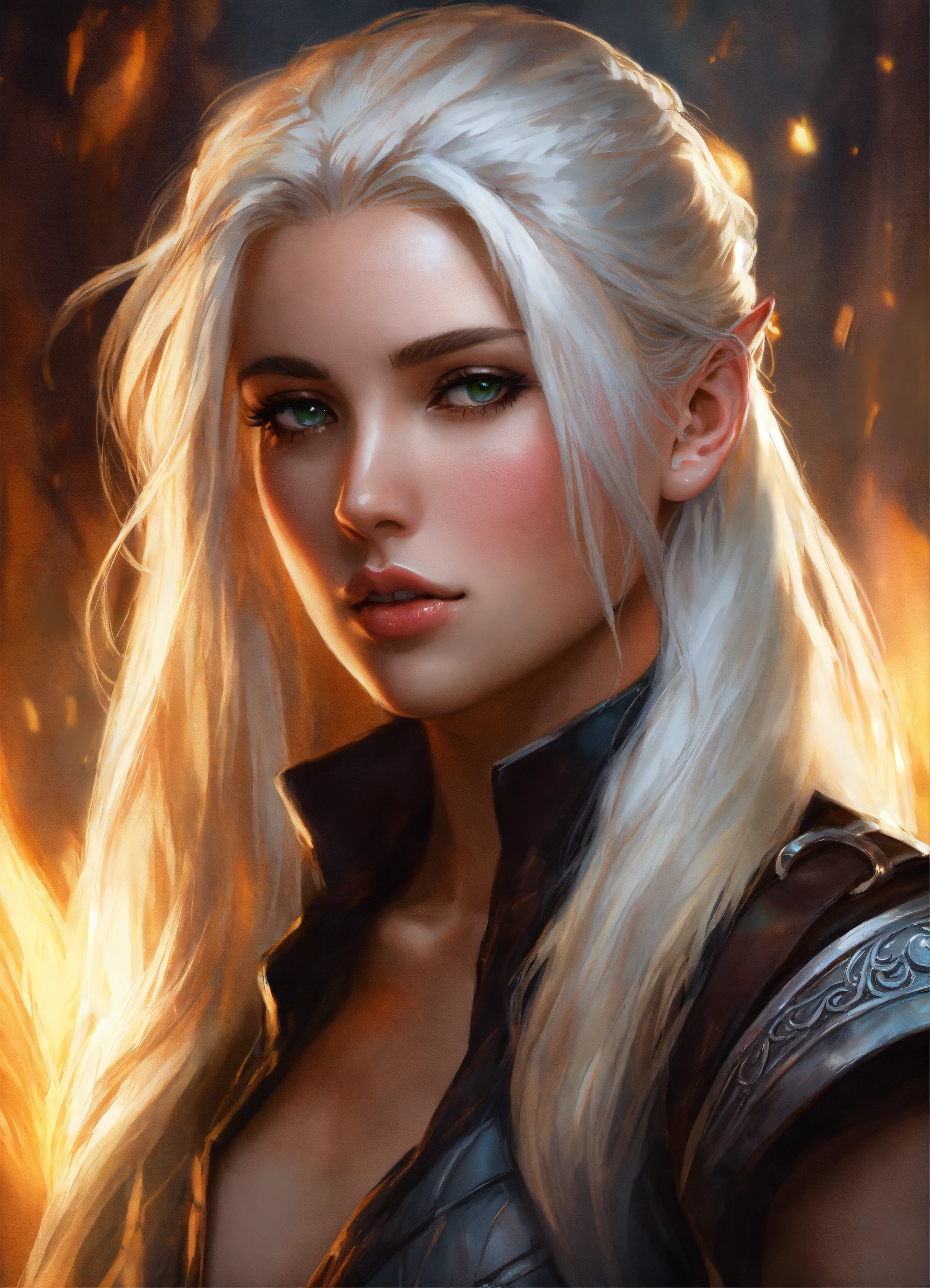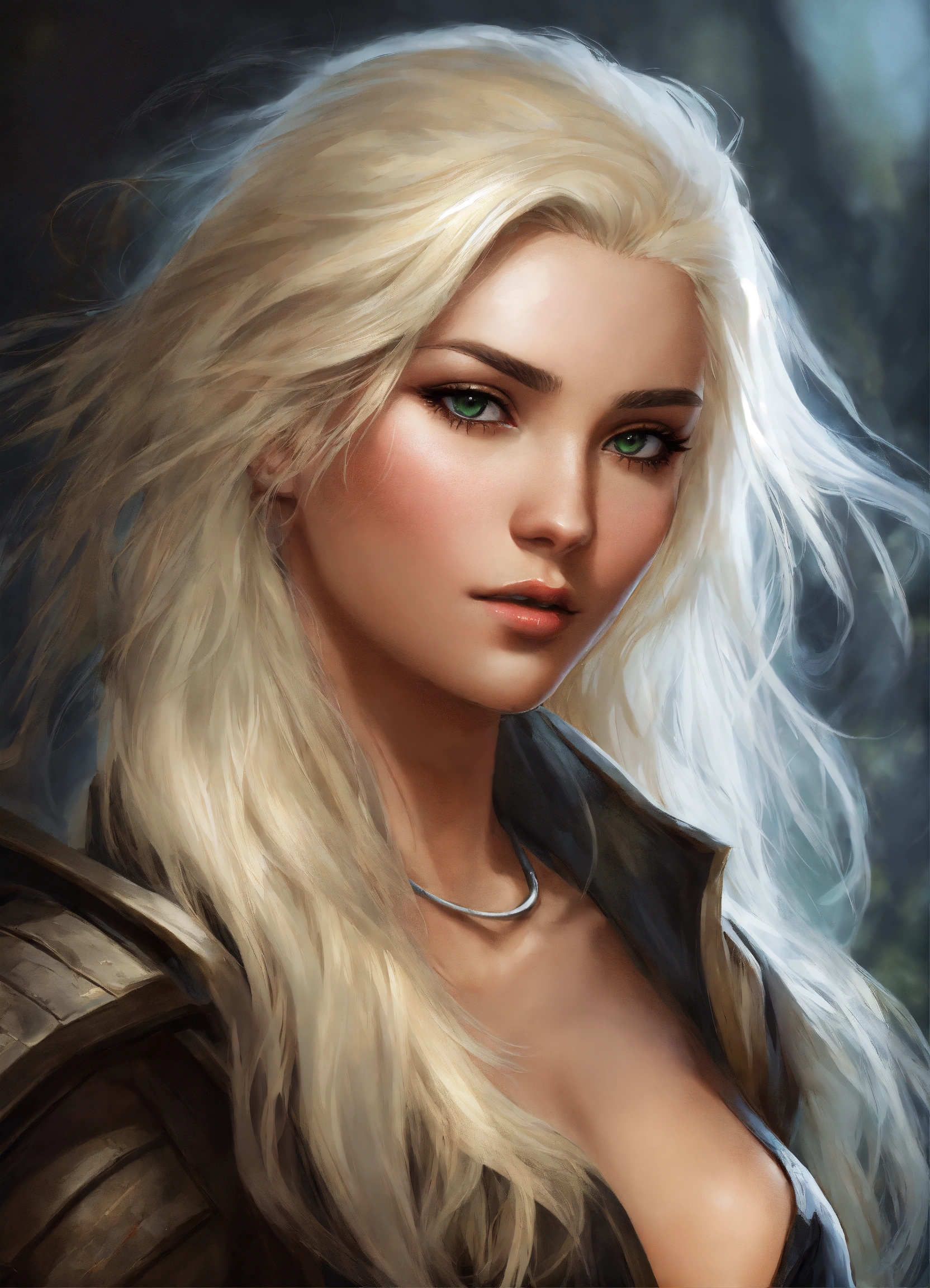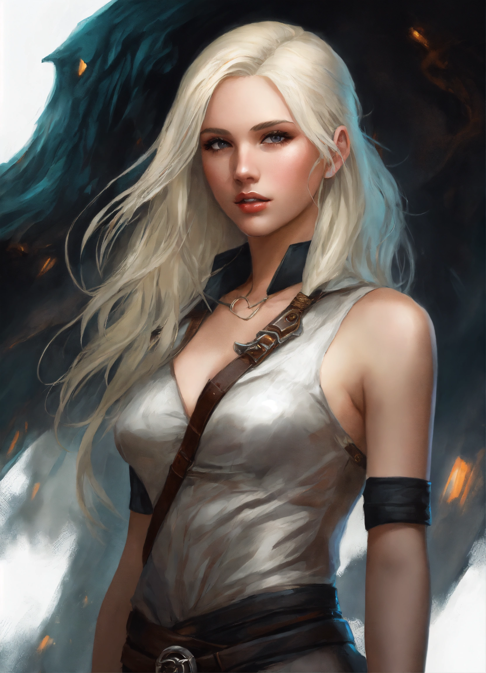 Hot young woman with platinum blonde hair with a black streak in hair realistic art fantasy dungeons and dragons