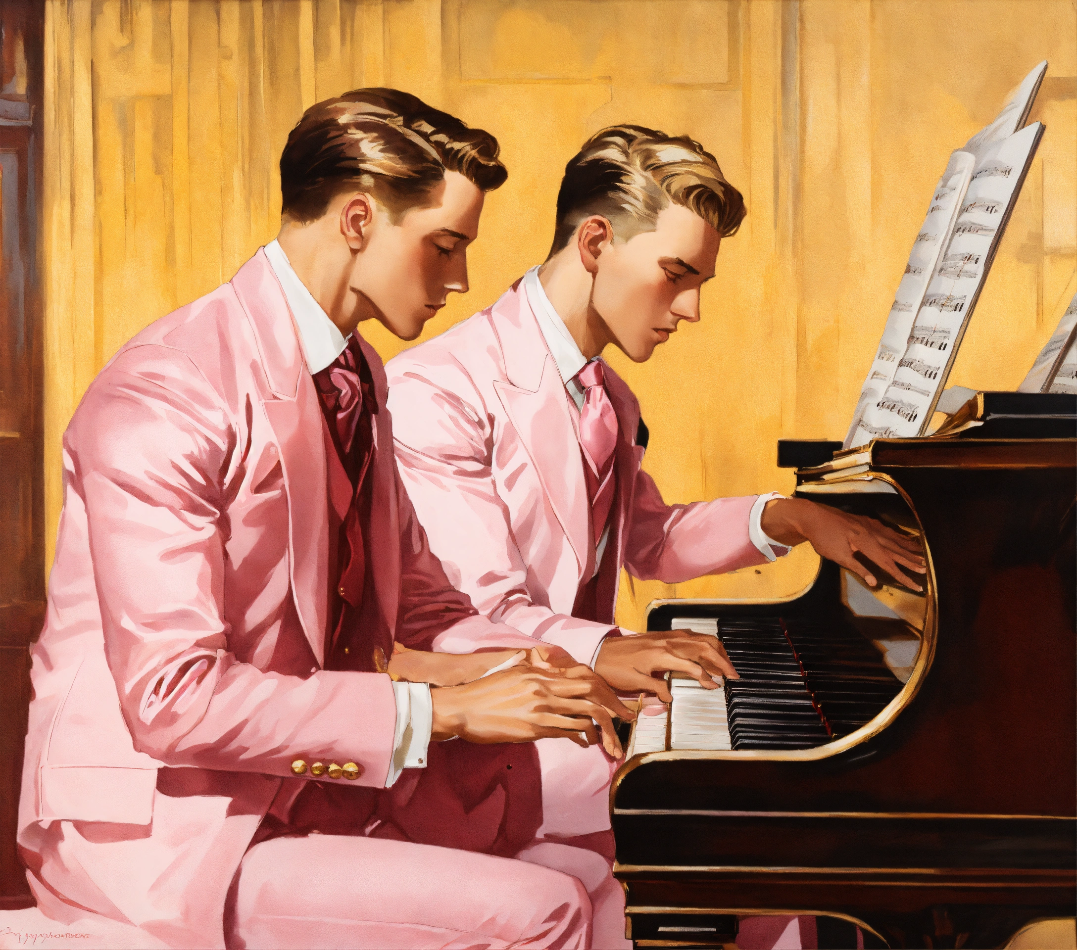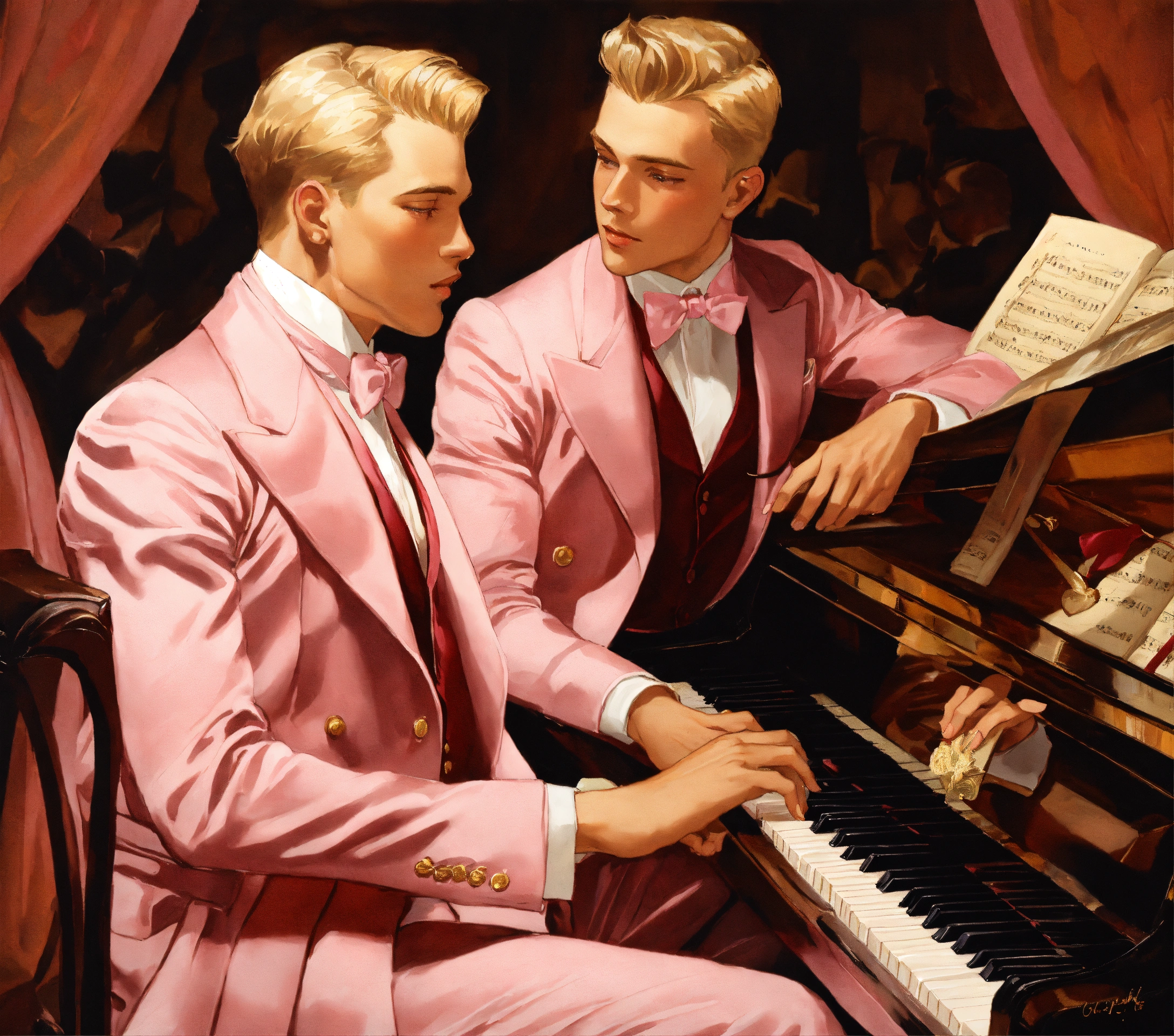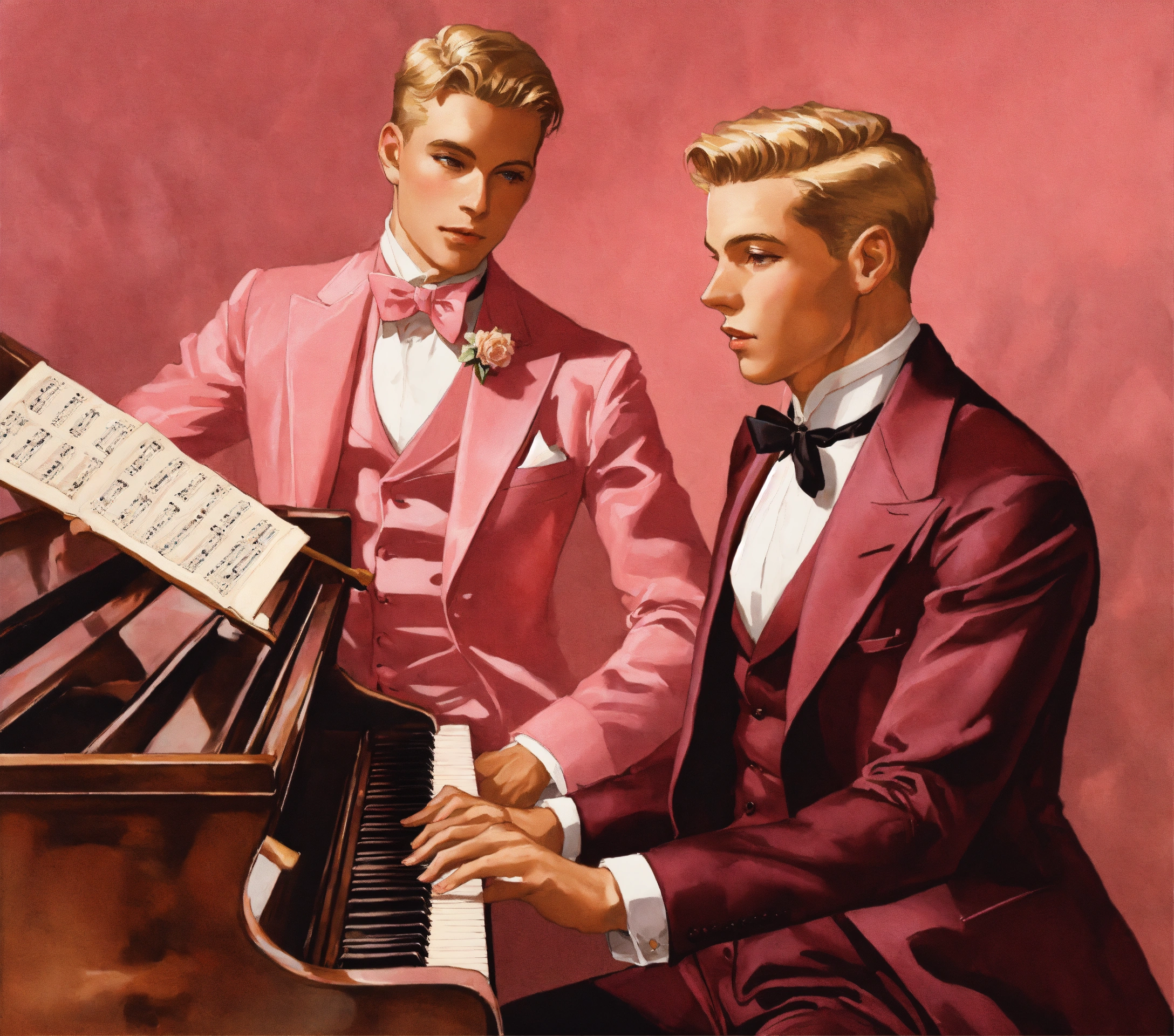 Two blonde male gentlemen in pink vested suit and burgundy tie