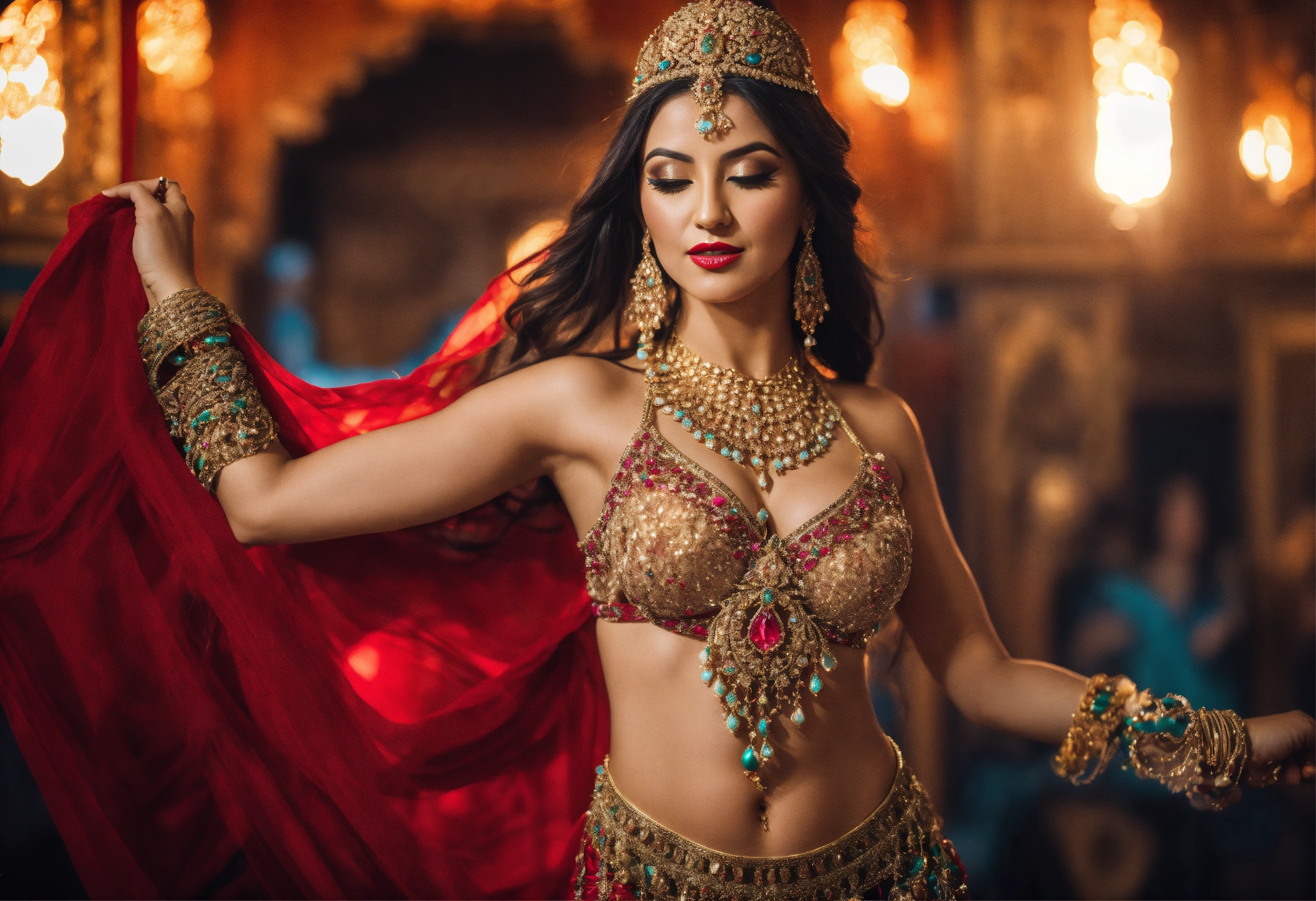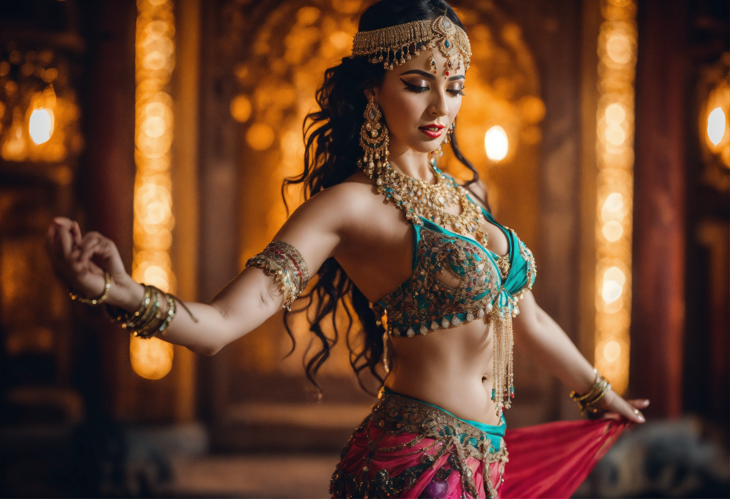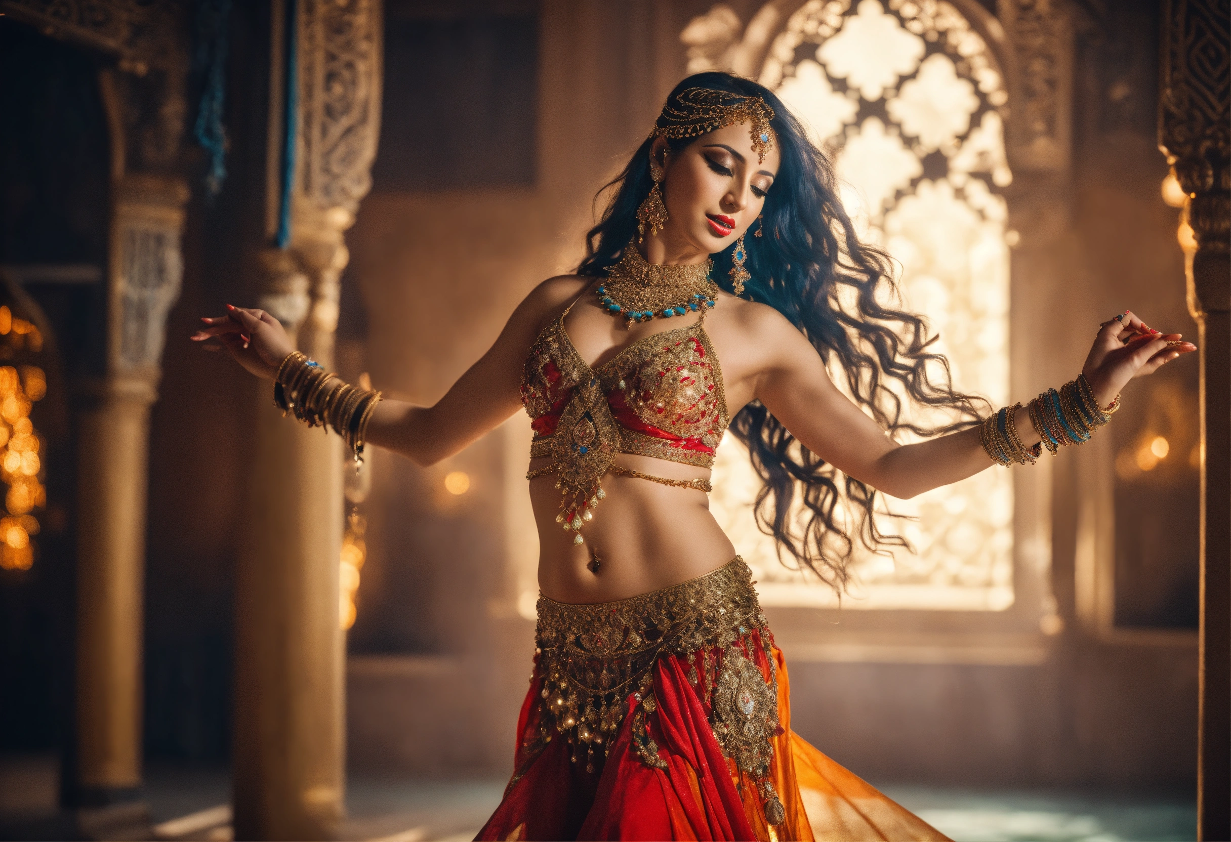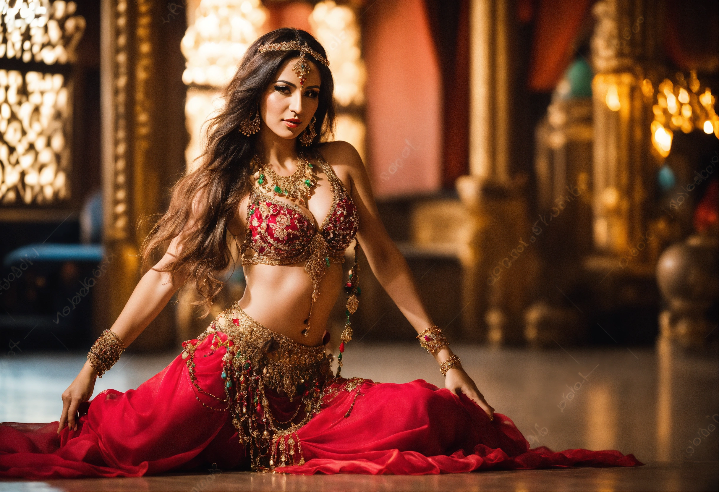 Photo portrait of dynamic belly dancer dancing in oriental palace