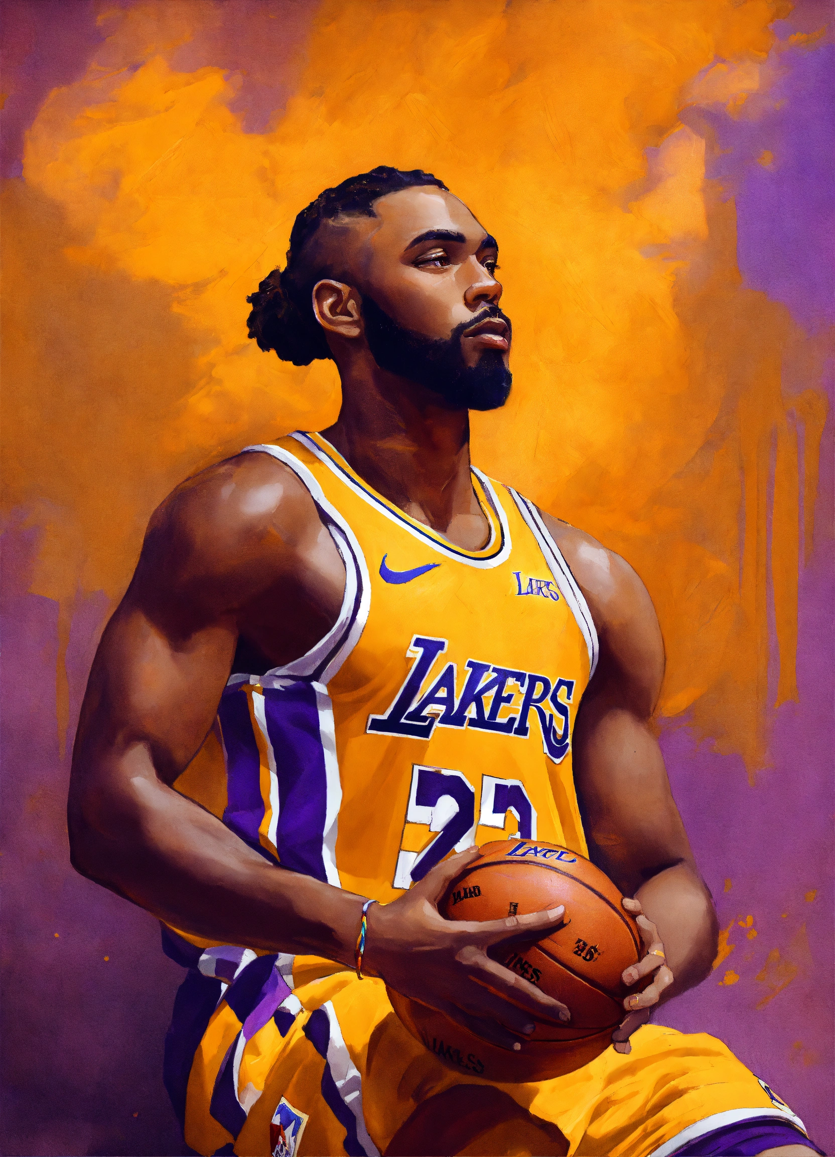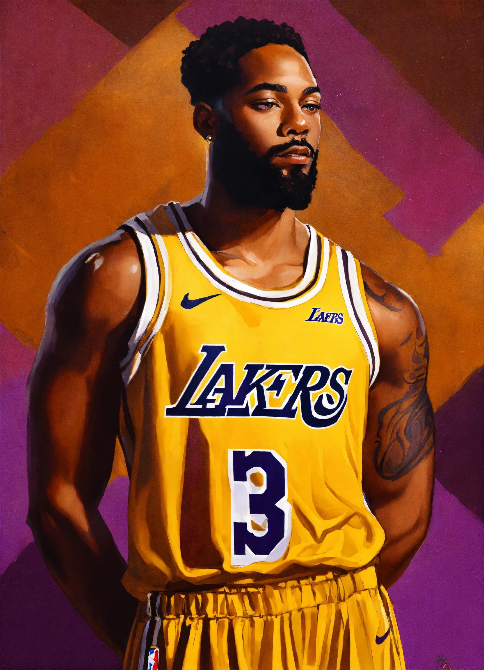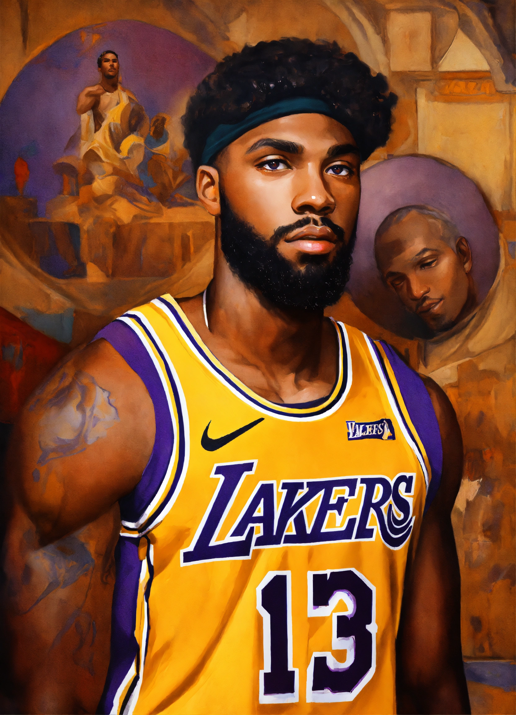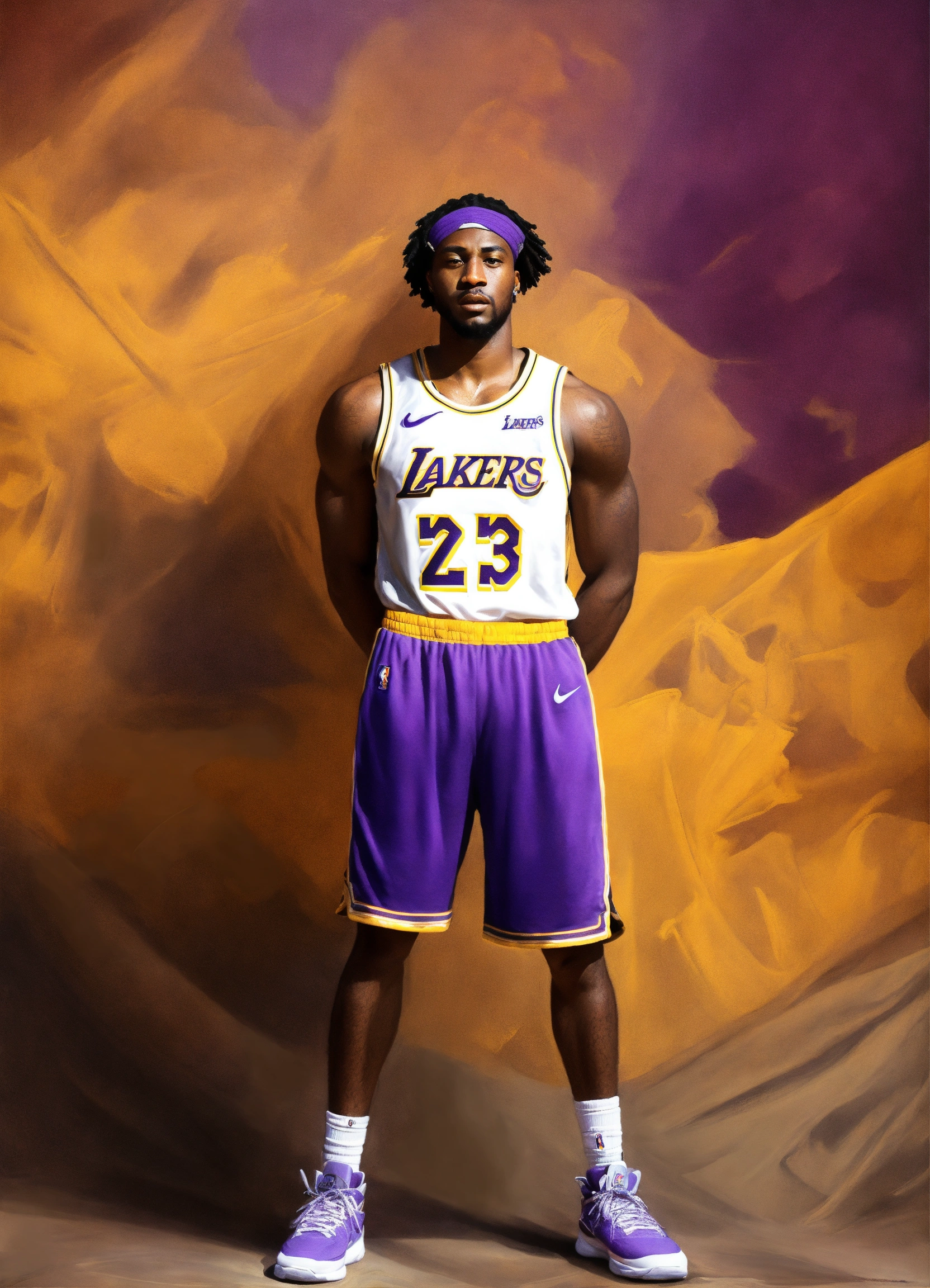 Hebron james wearing a jersey, of los angeles lakers, brown skin, classical painting, digital painting, romantic, vivid color, oil painting third-eye