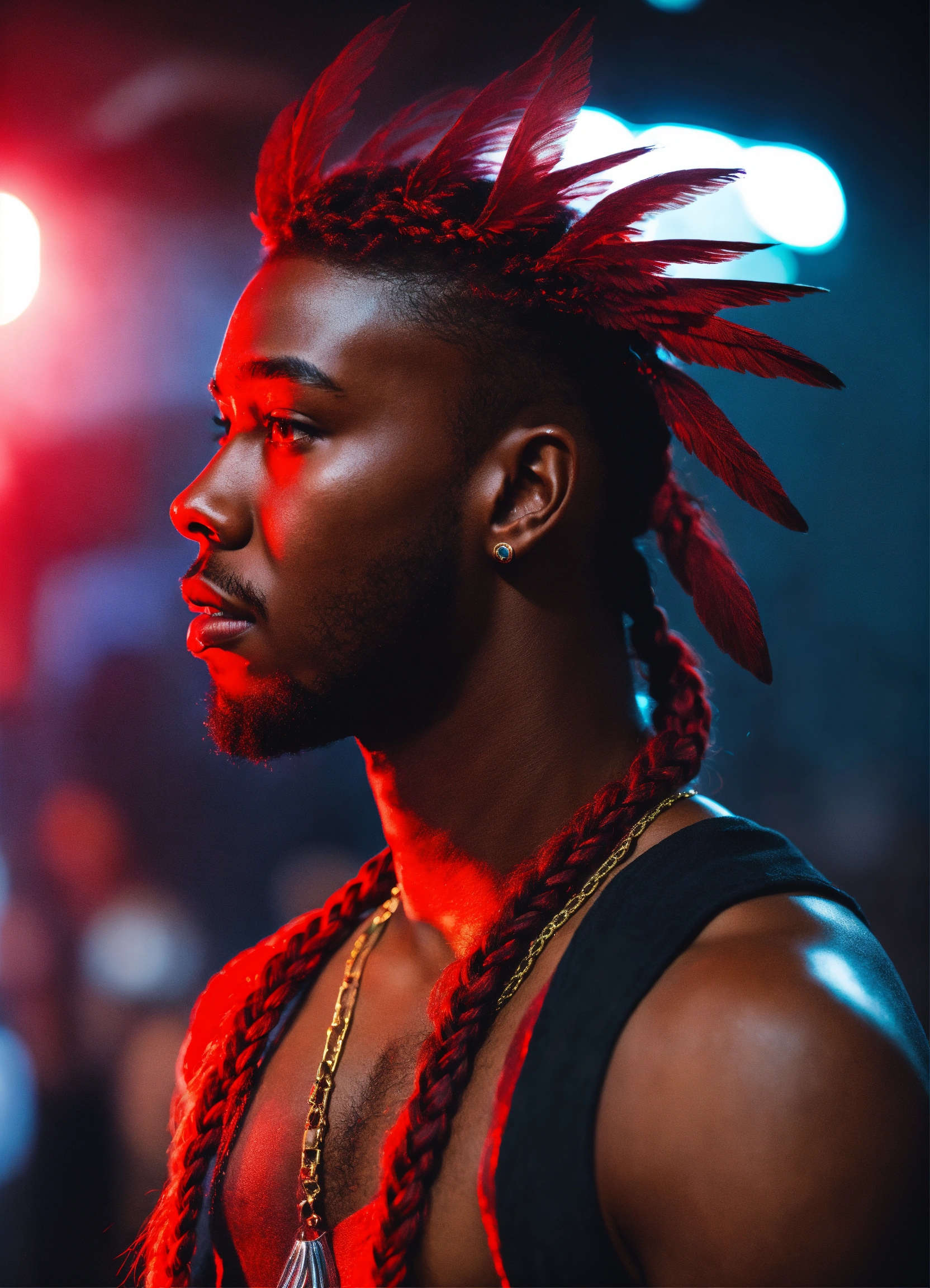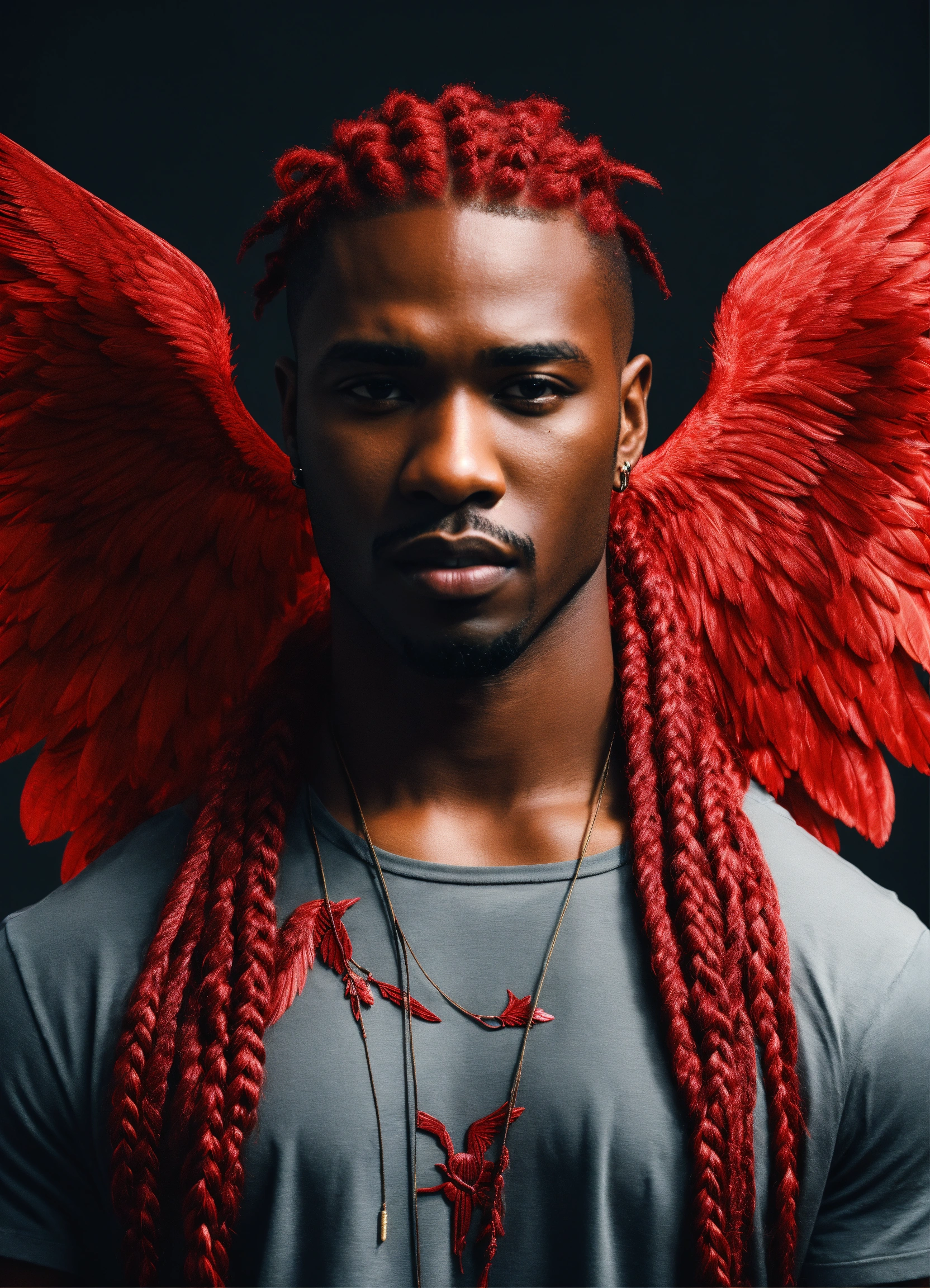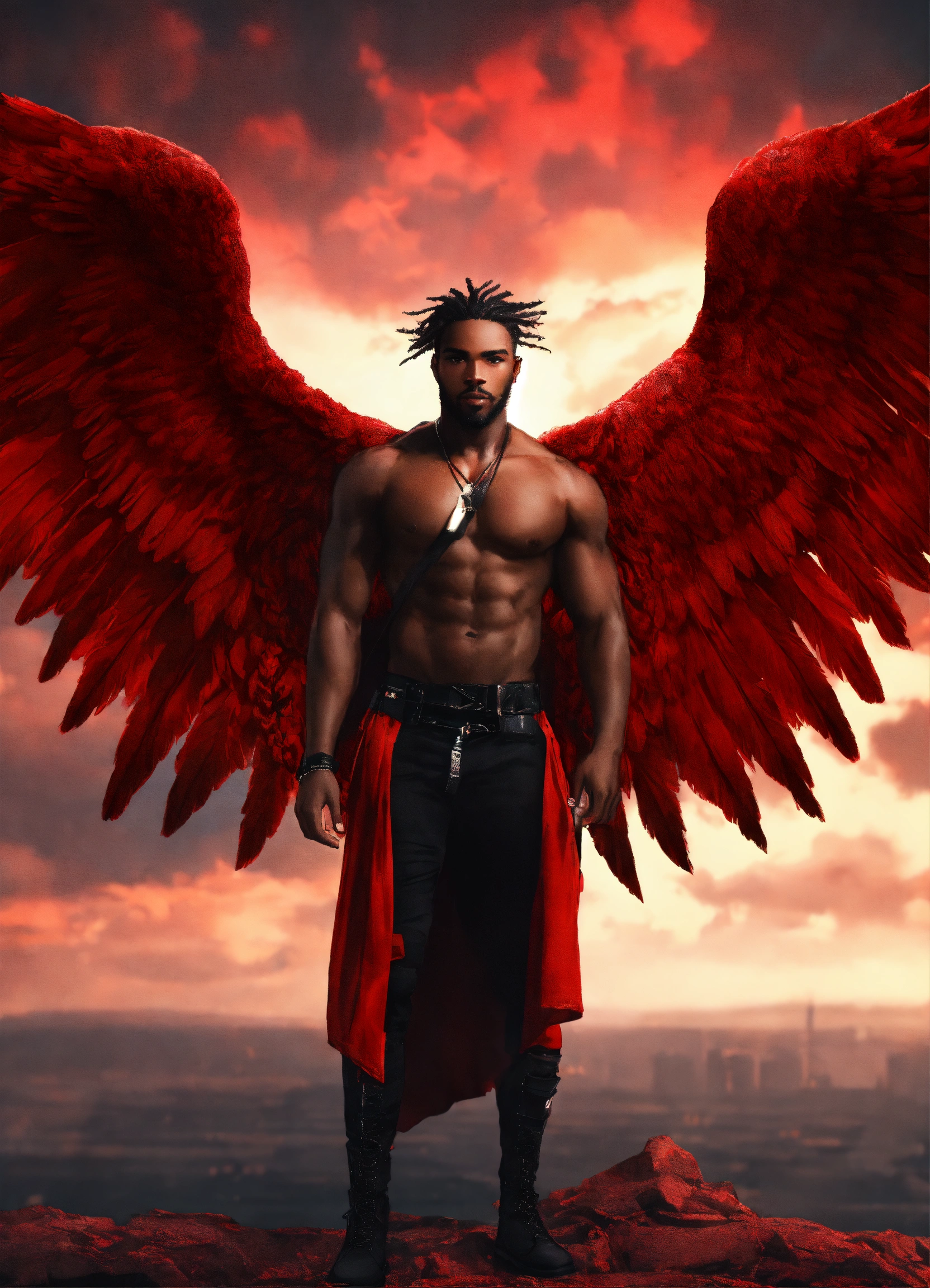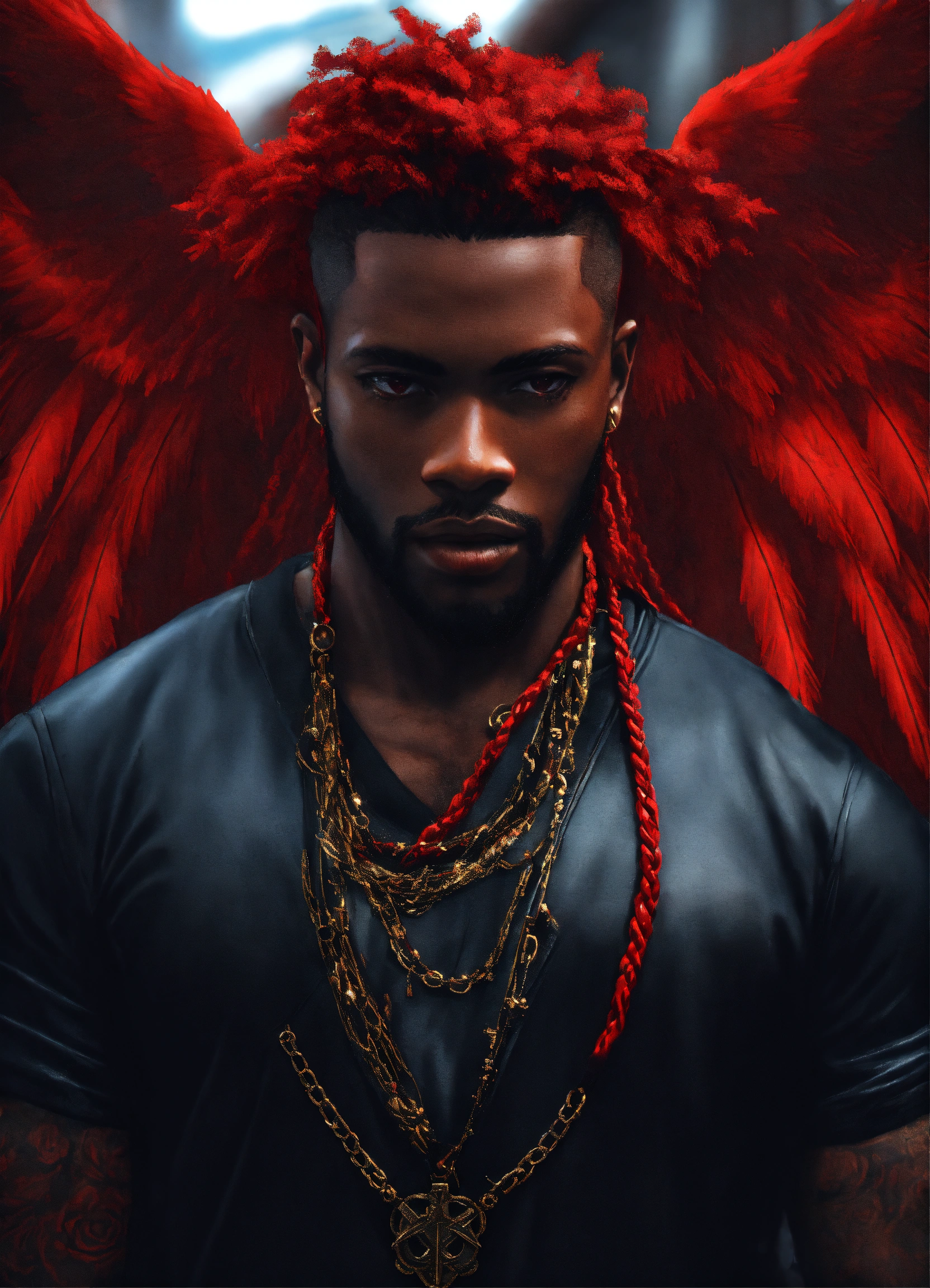Black man red braided hair dystopian red winged angel 4k