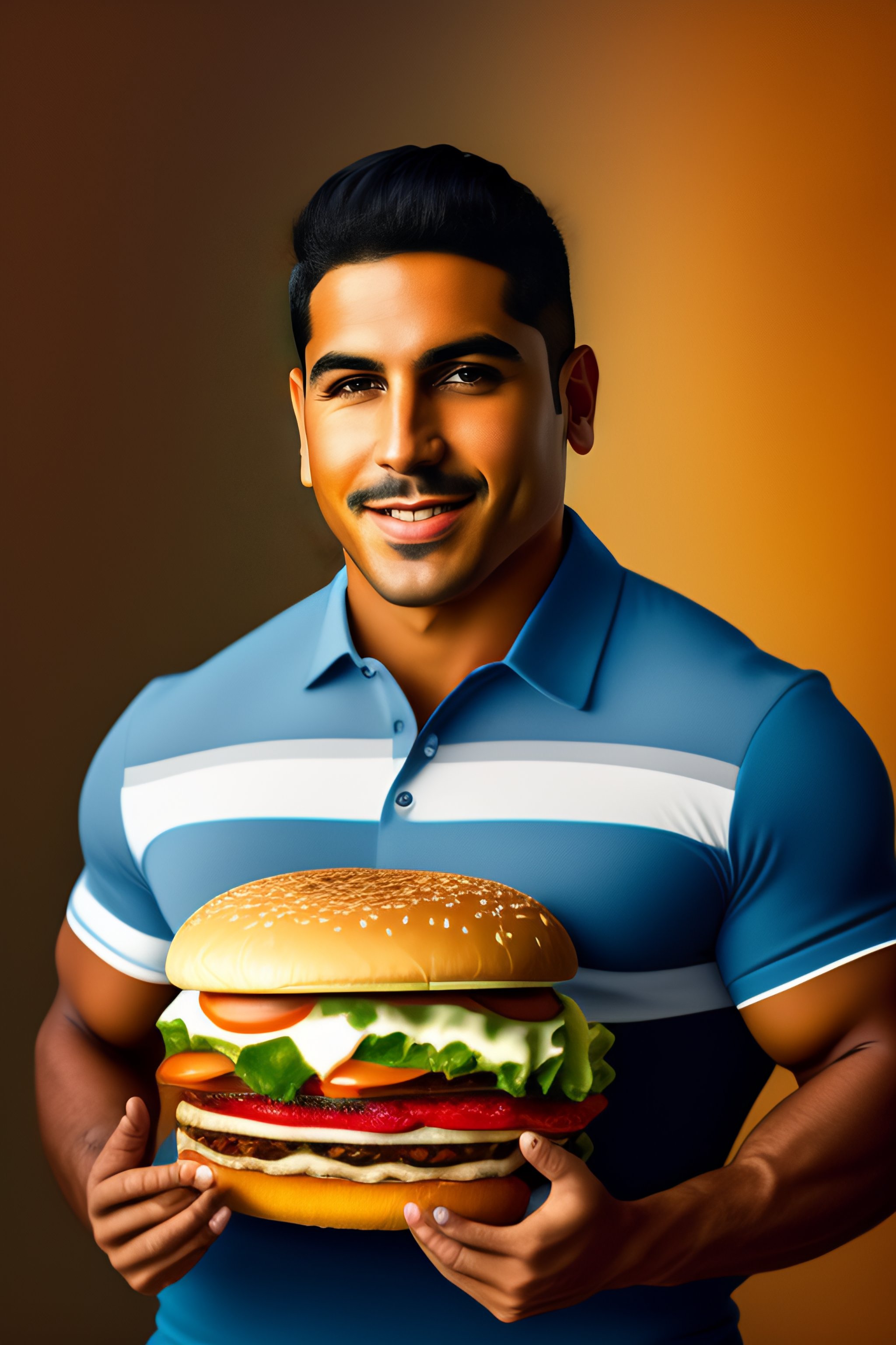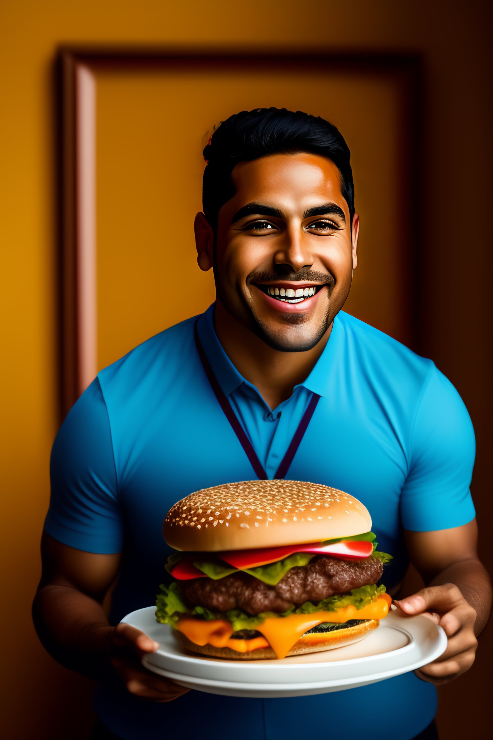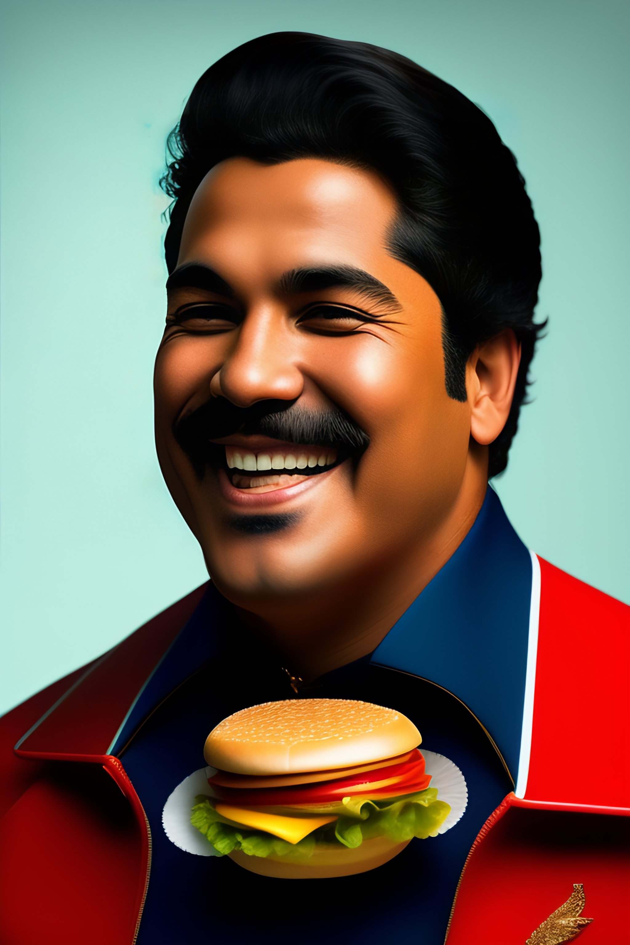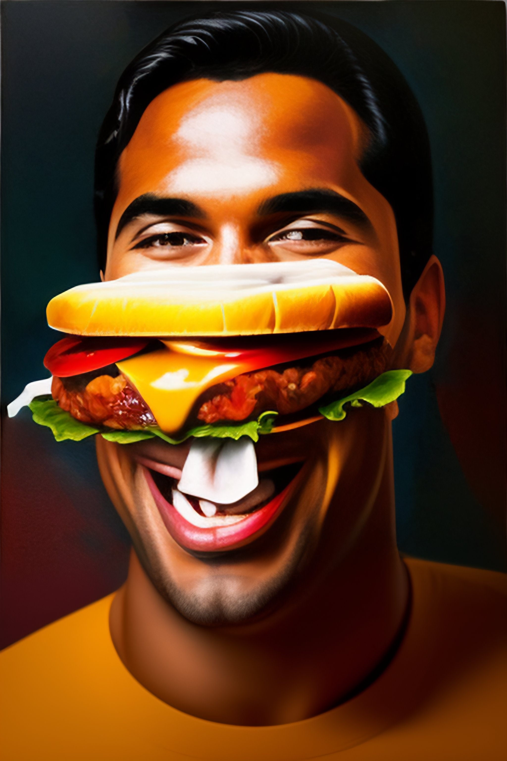 Generate the portrait of julian molina romero eating a cheeseburger