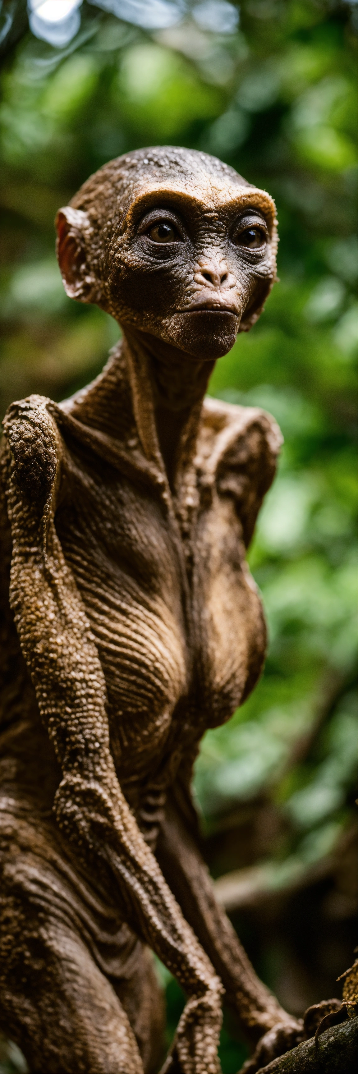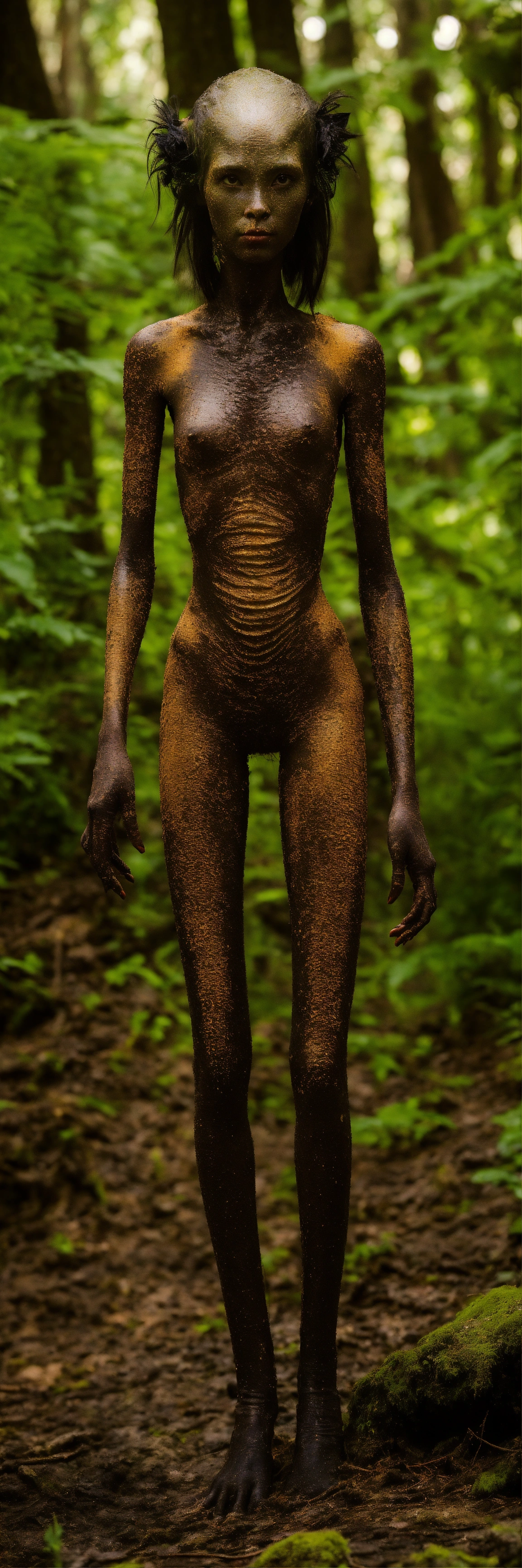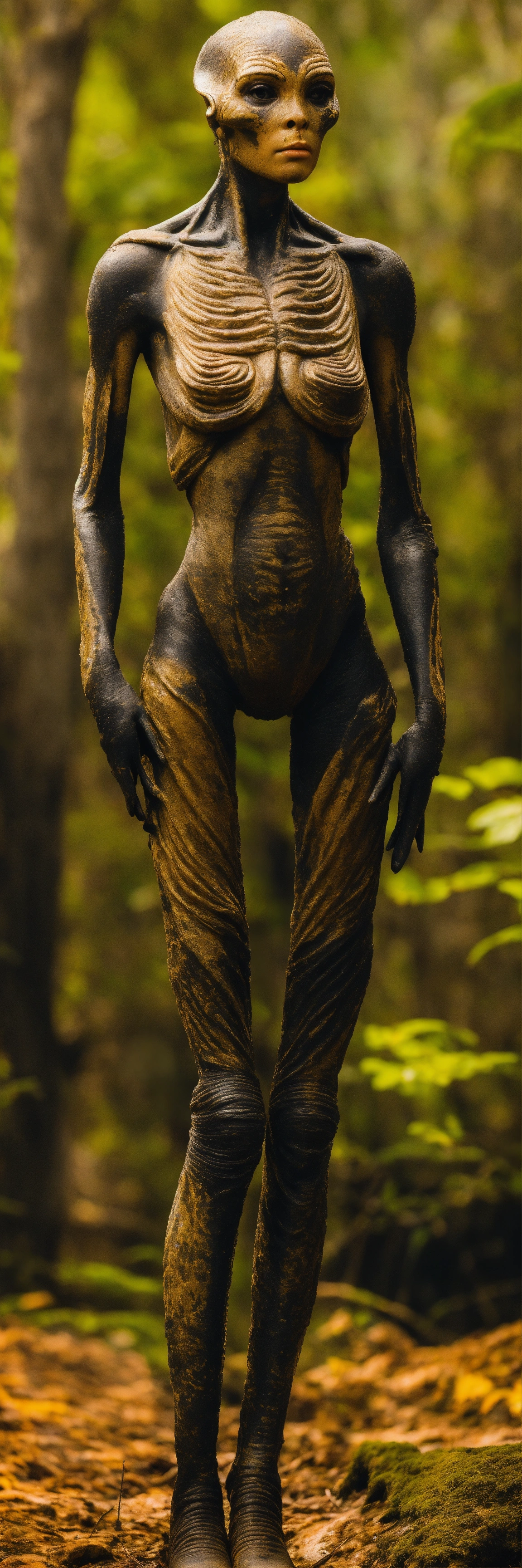 Fotografia de cuerpo entero humanoide extraterrestre evolucionado rasgos etiópes femeninos con piel de escamas grises de 21 años, muy alta y delgada sin rasurar en la jungla, detalles fotográficos hiperrealistas, plano general, f2.8, enfoque en los ojos, 1/250, iso 3200, nikon z9, angulo de cámara de 120 grados