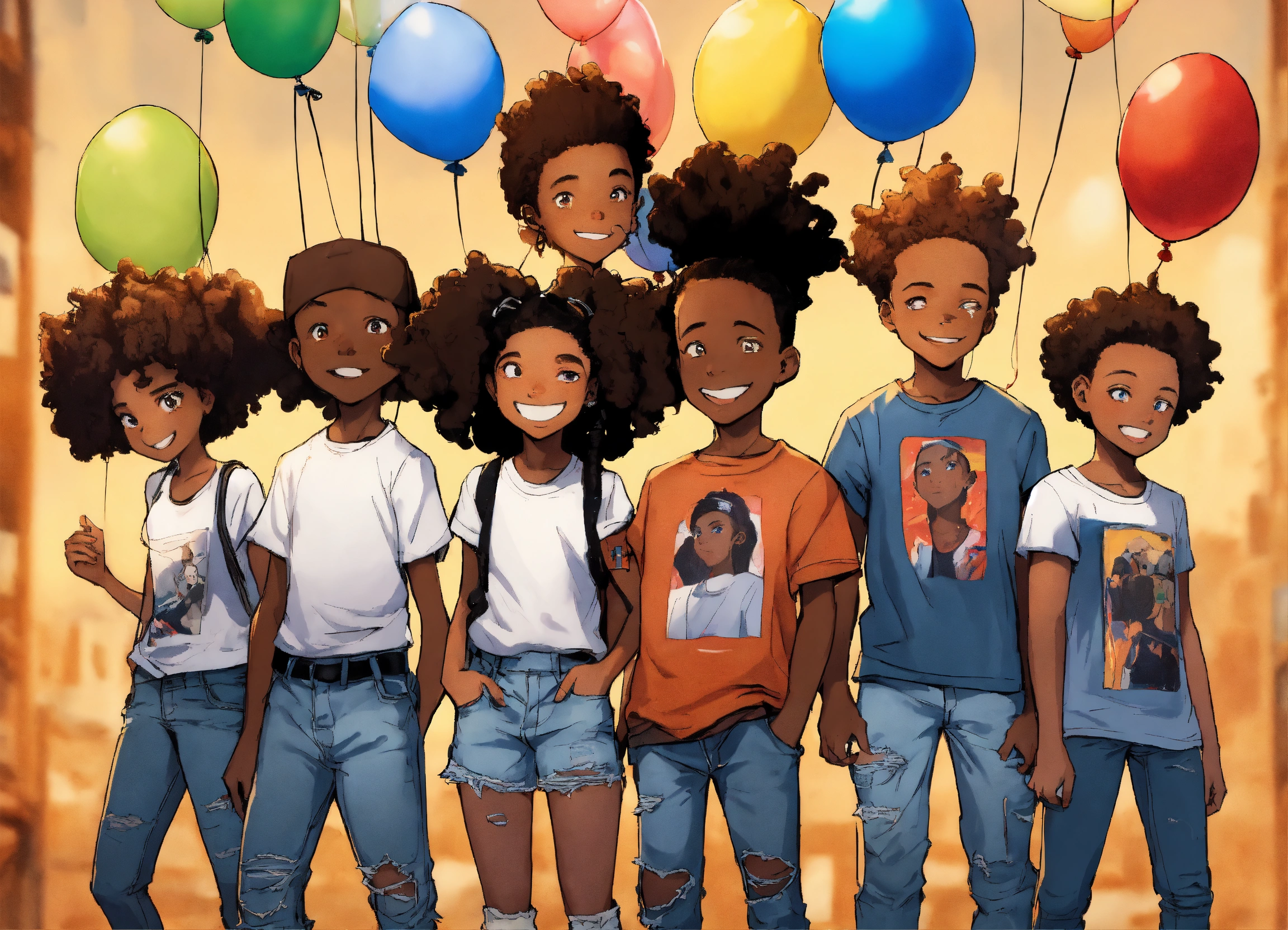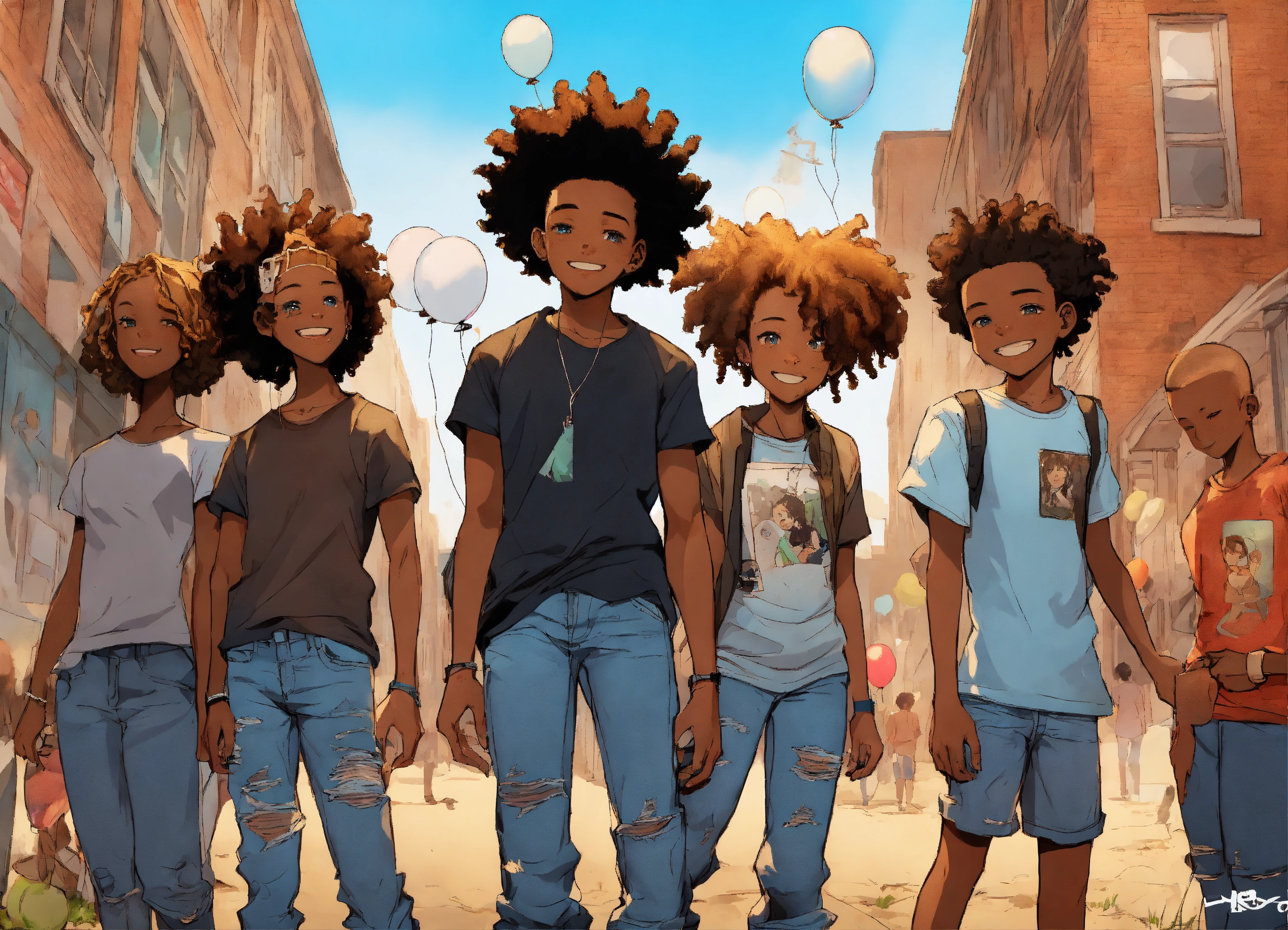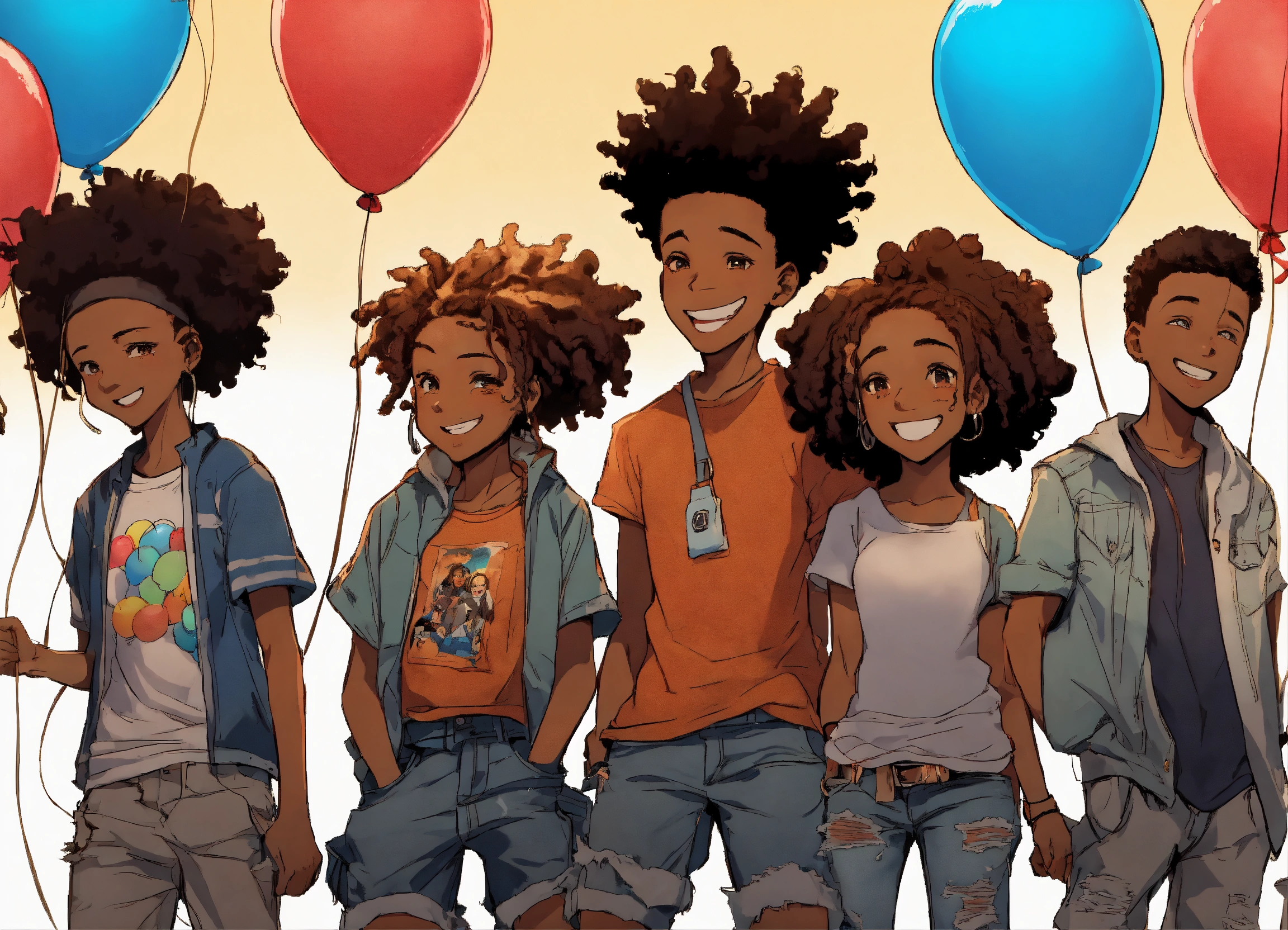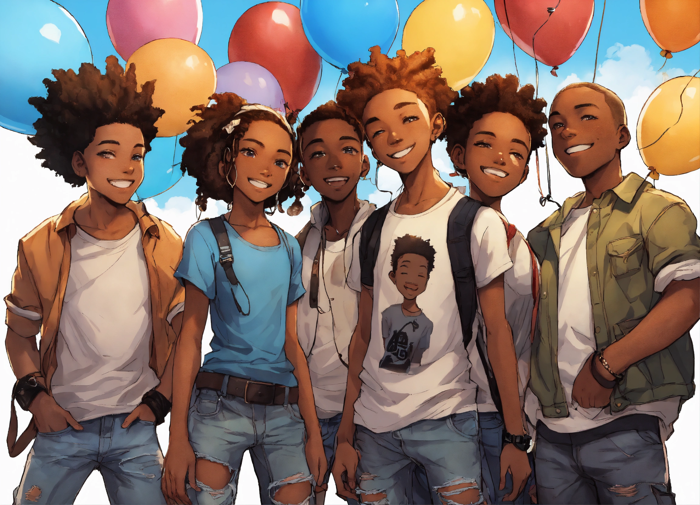 The boondocks storybook style art, group of smiling 14 year old black boys and girls, close cropped skin fade hair locs and wispy coil curls, with tshirt and ripped distressed blue jeans, with balloons. rule of thirds