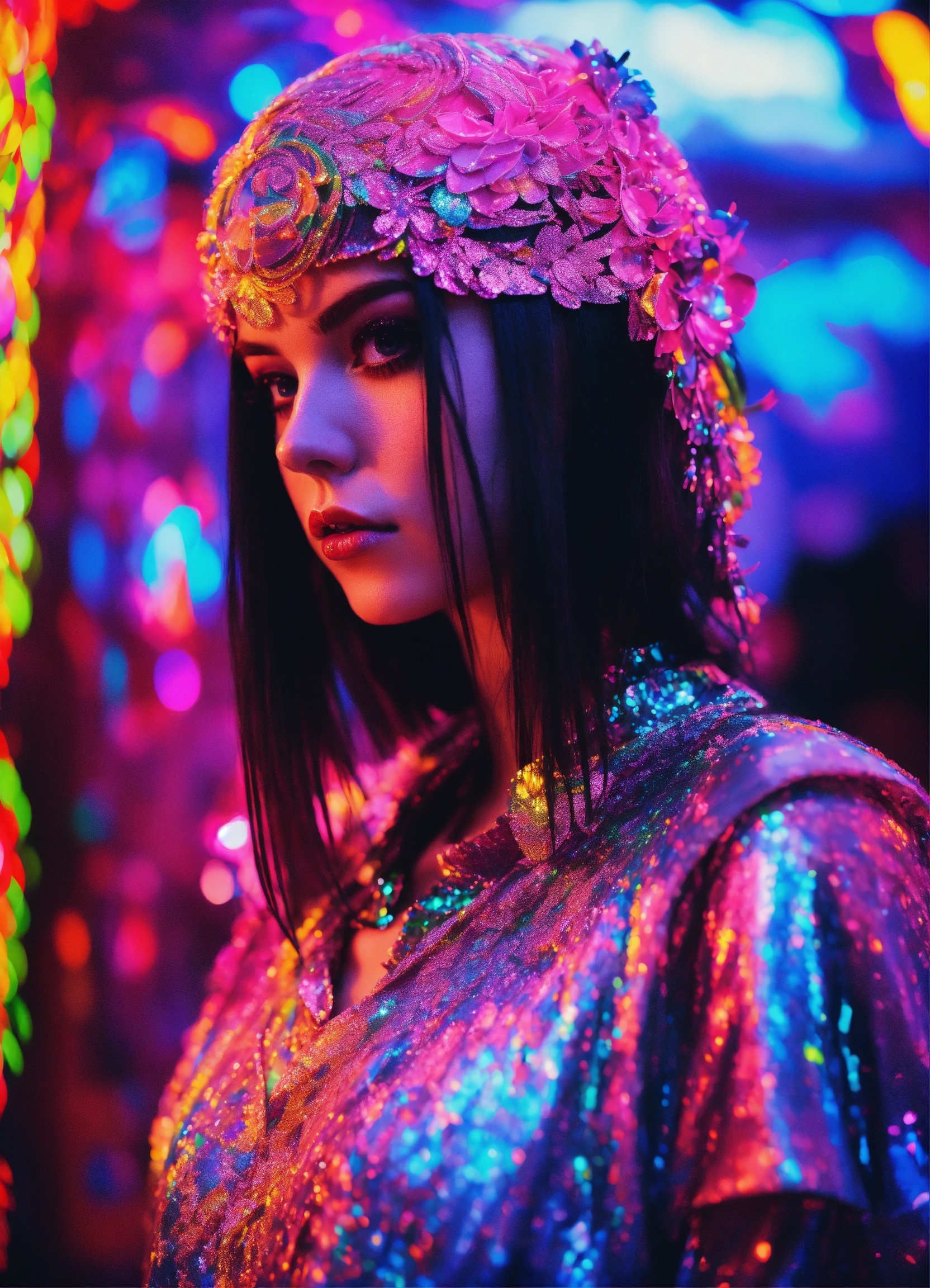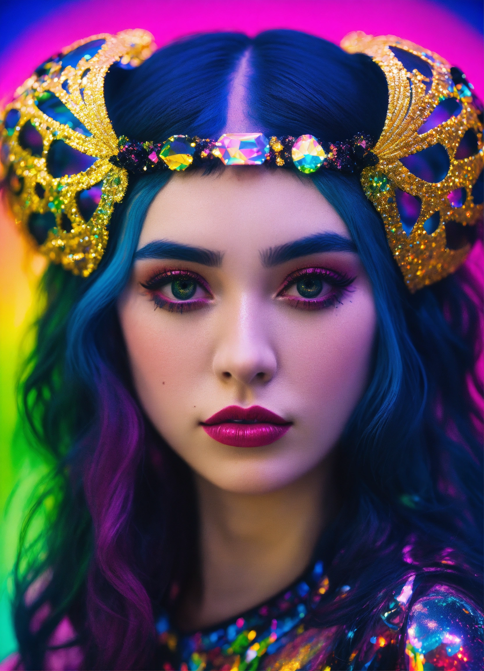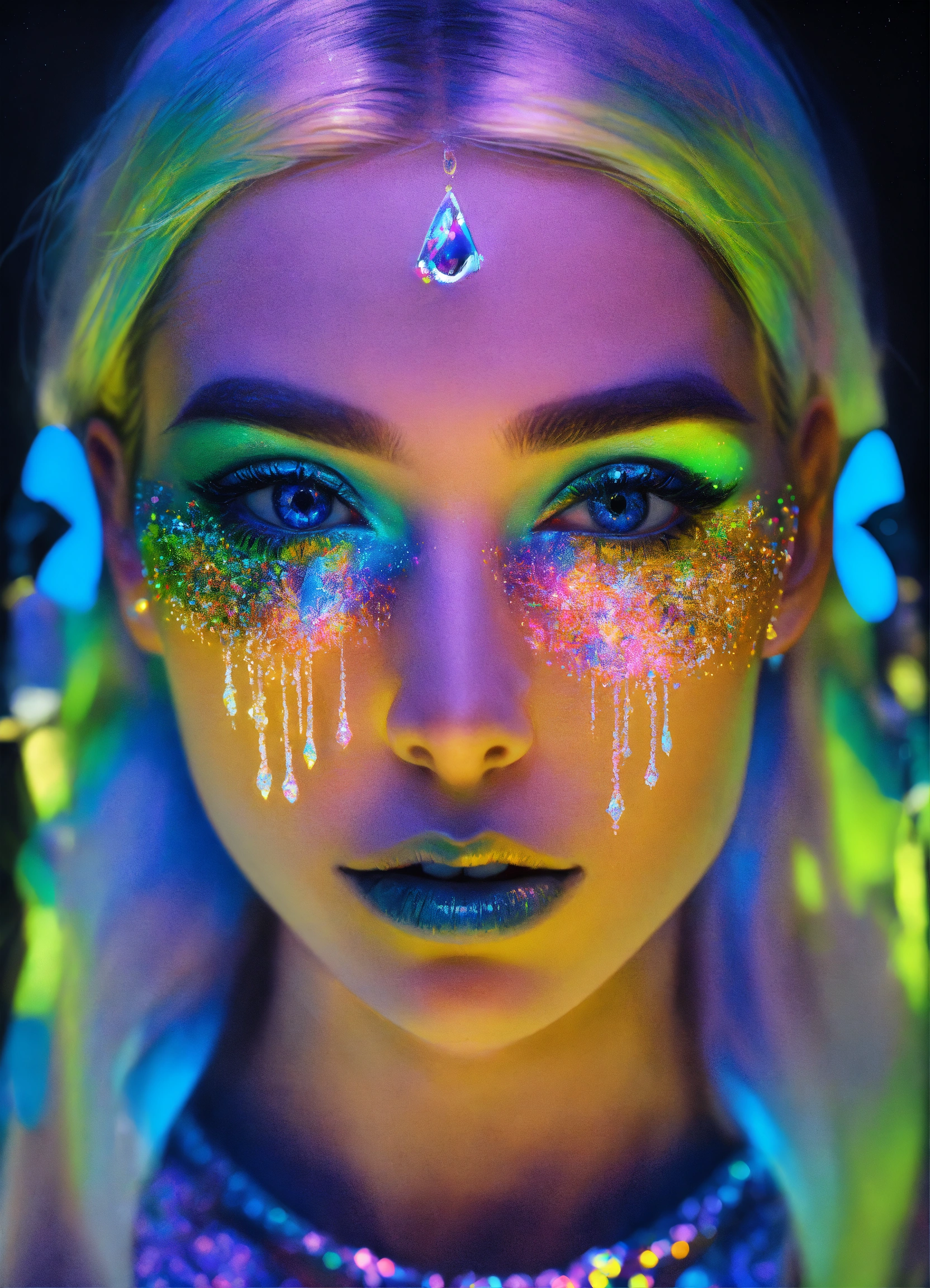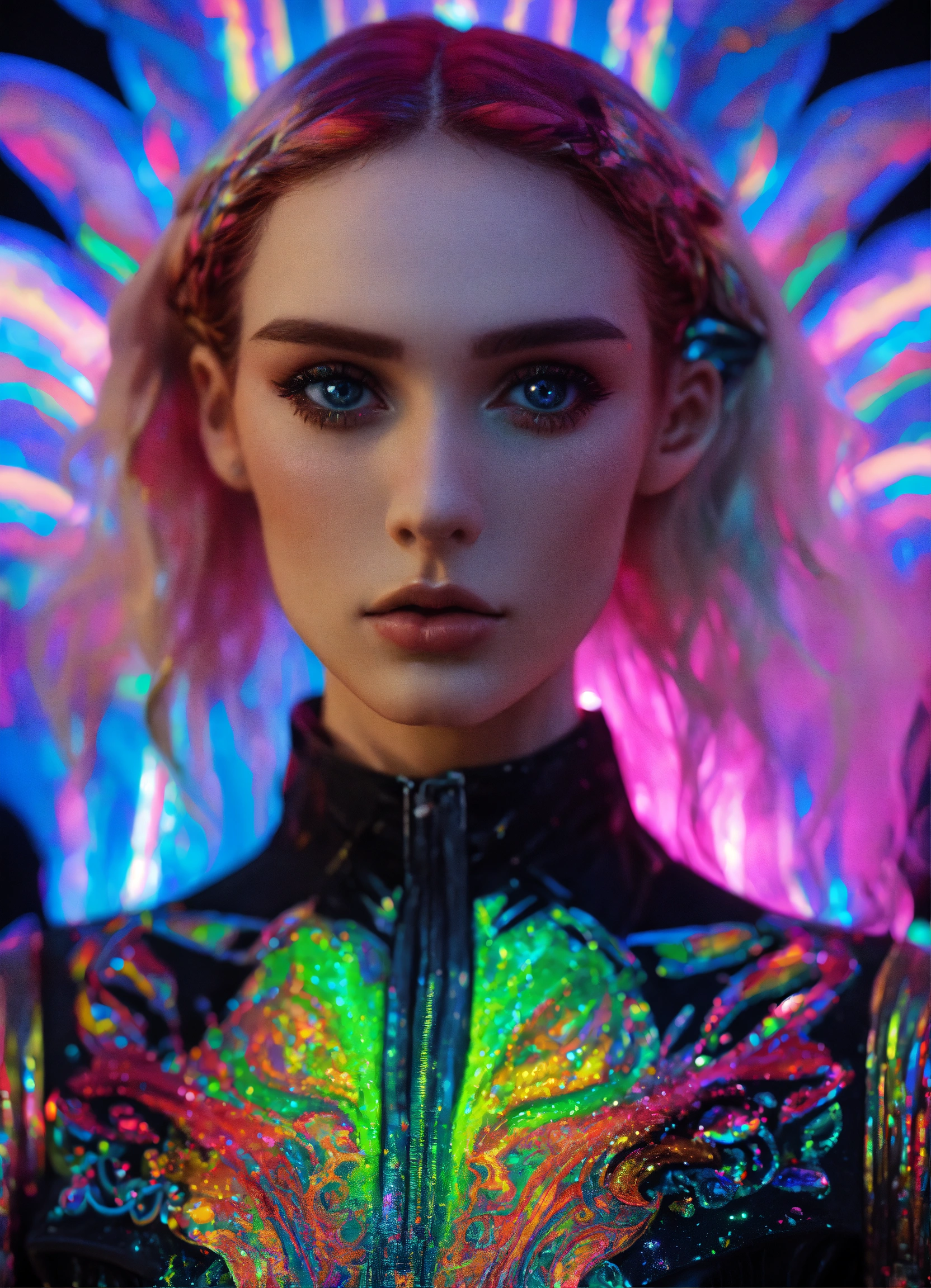 Photorealistic 3d portrait of gorgeous goth emo grimes white girl angel kawaii punk rock anime haute couture costume, of cosmic alex grey painting in a dmt black light glitter neon black rainbow glitter holographic paris fashion night 70mm film, art by salvador dali and holy mountain the movie.