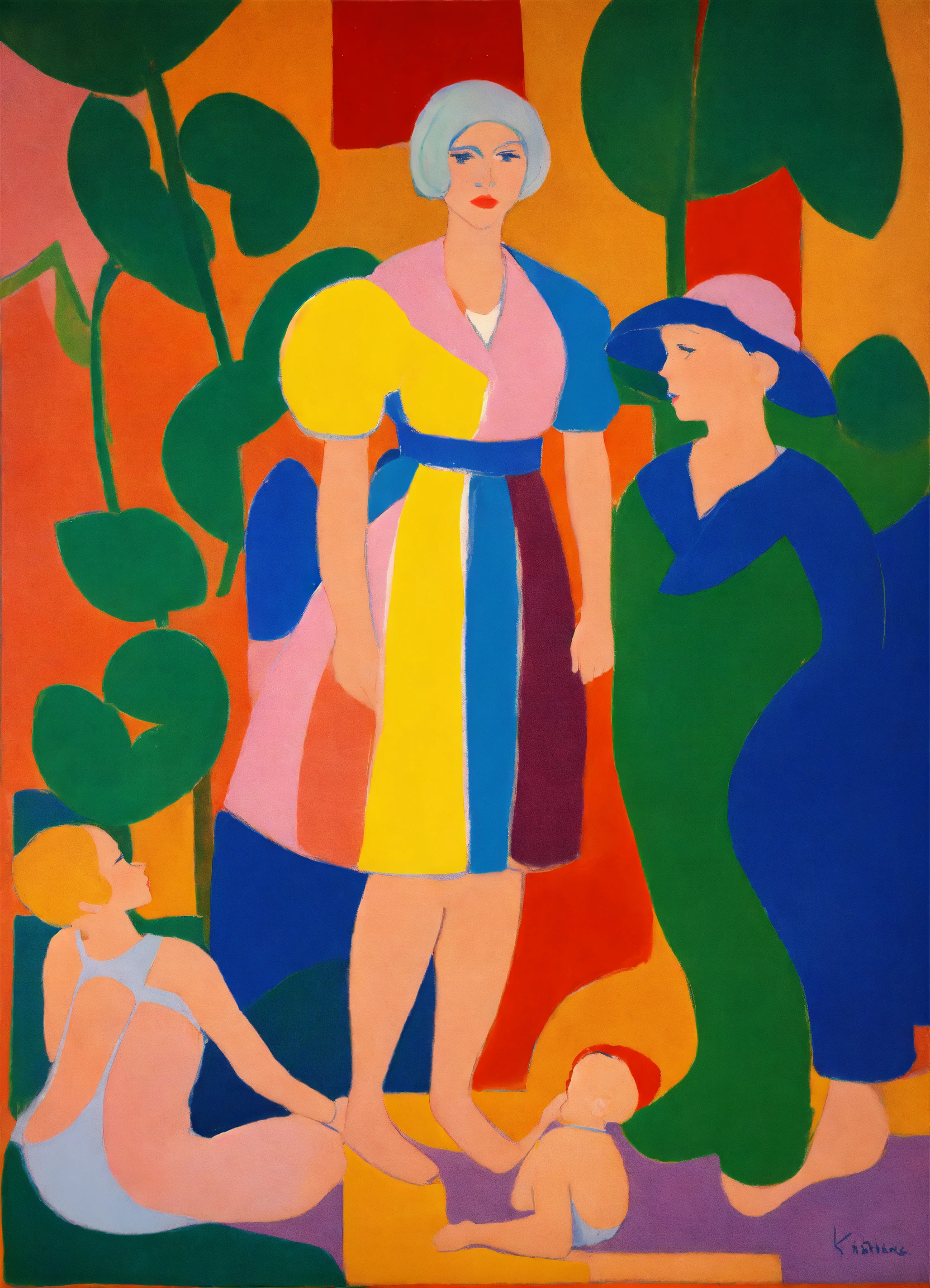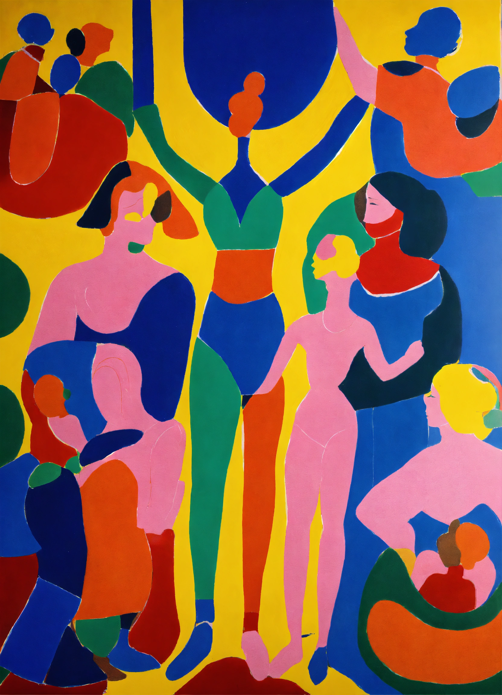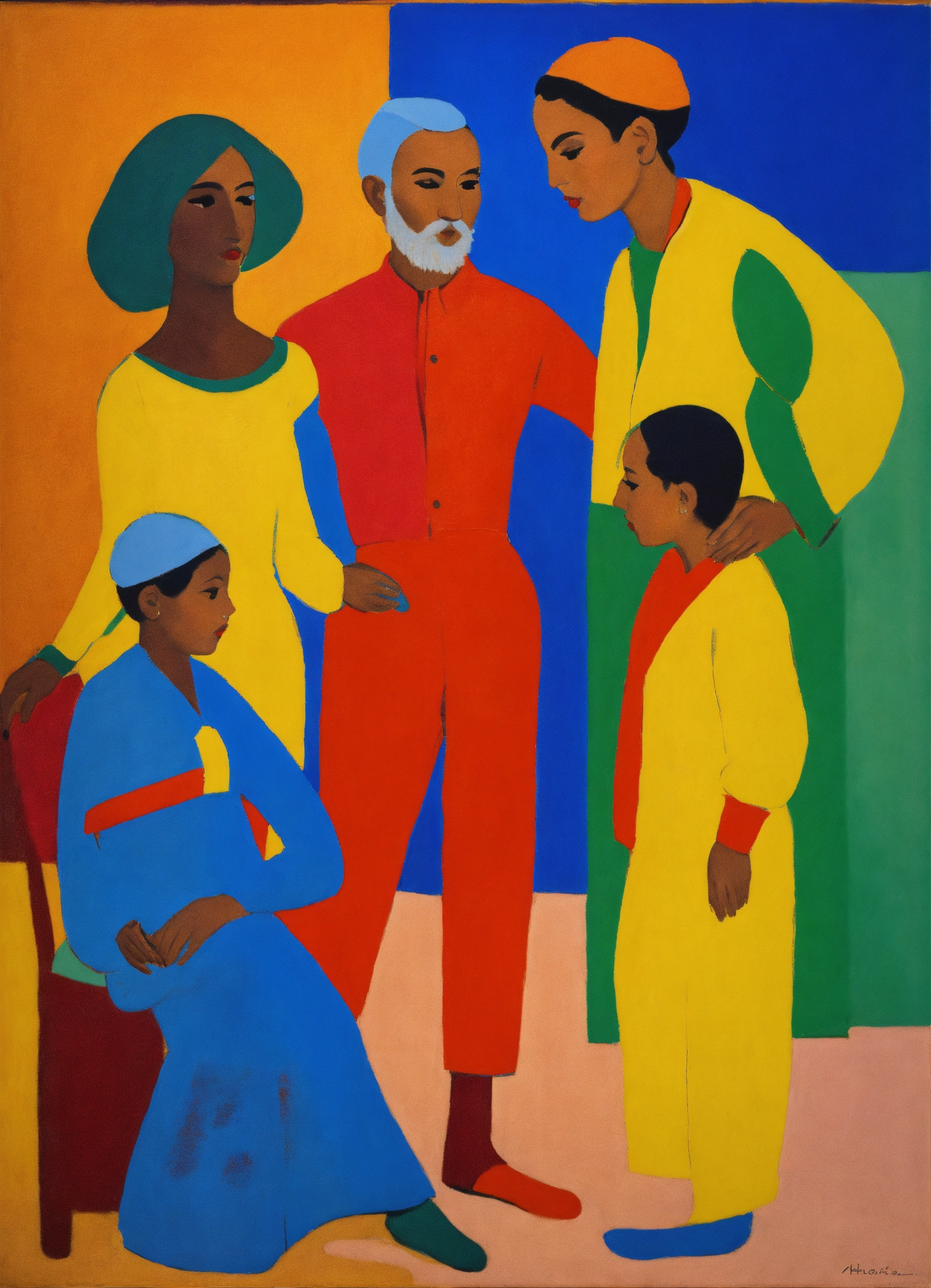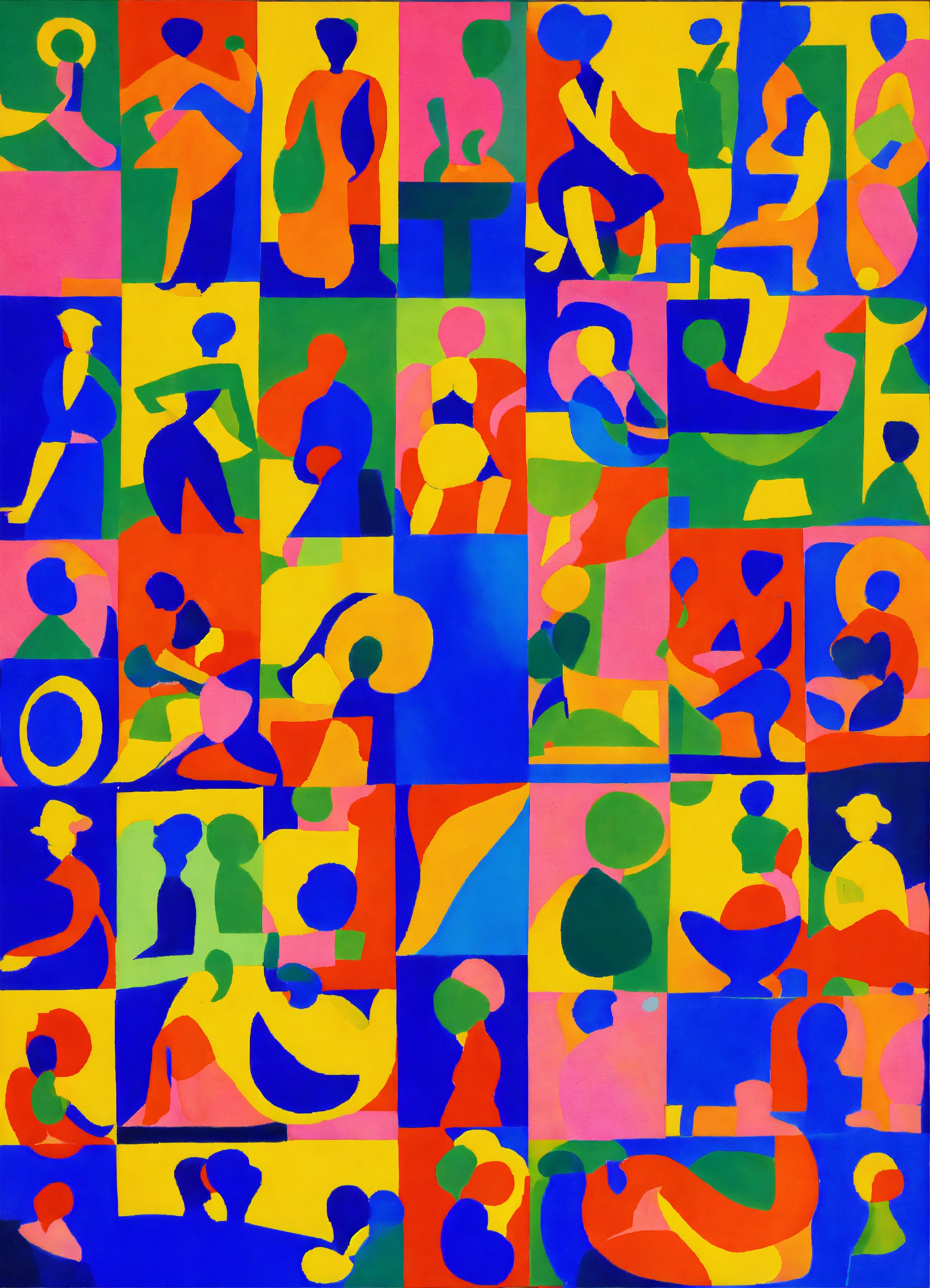 Matisse style, colorful, different people, woman, man, old, chidren, representative of the human kind