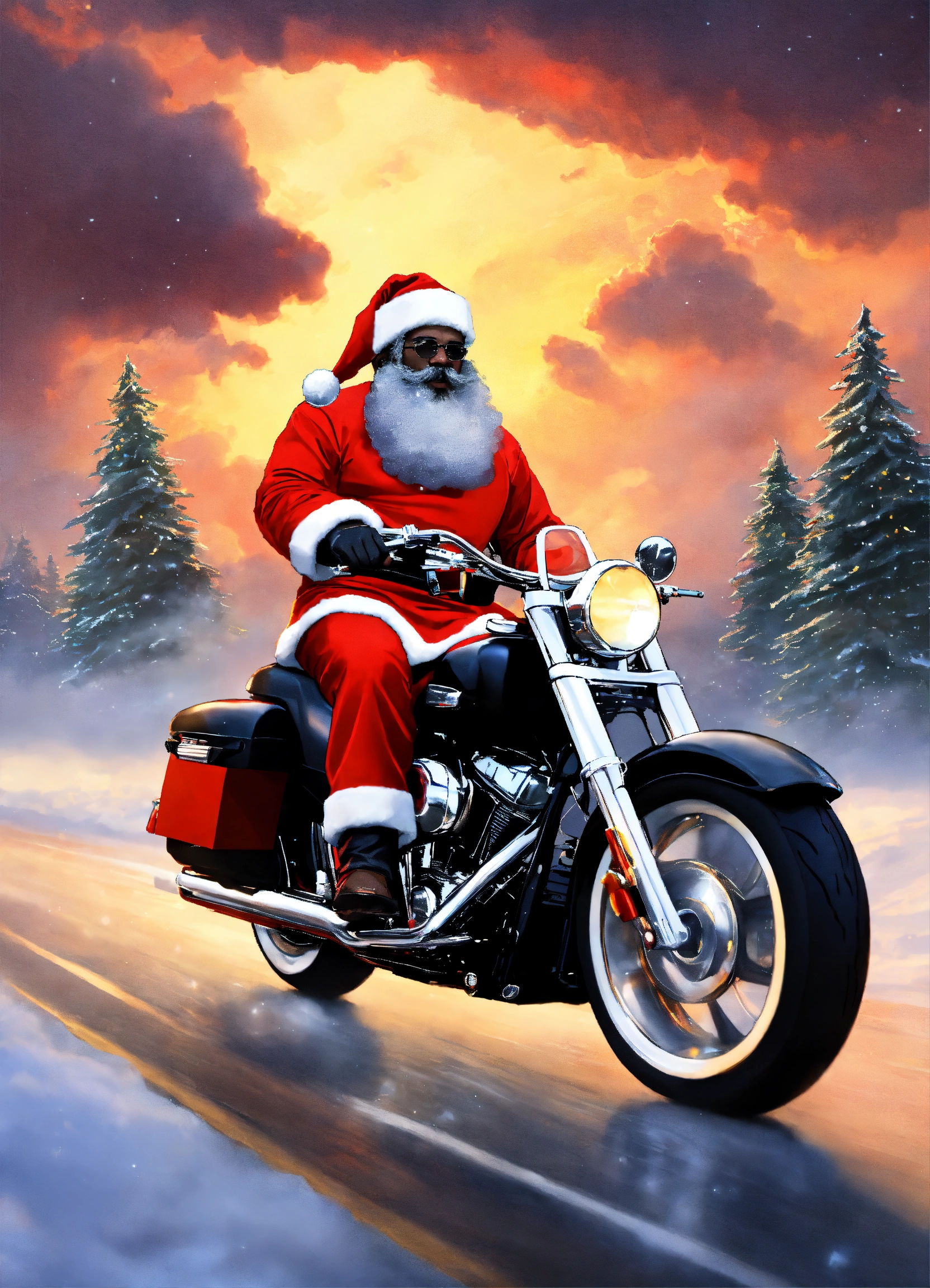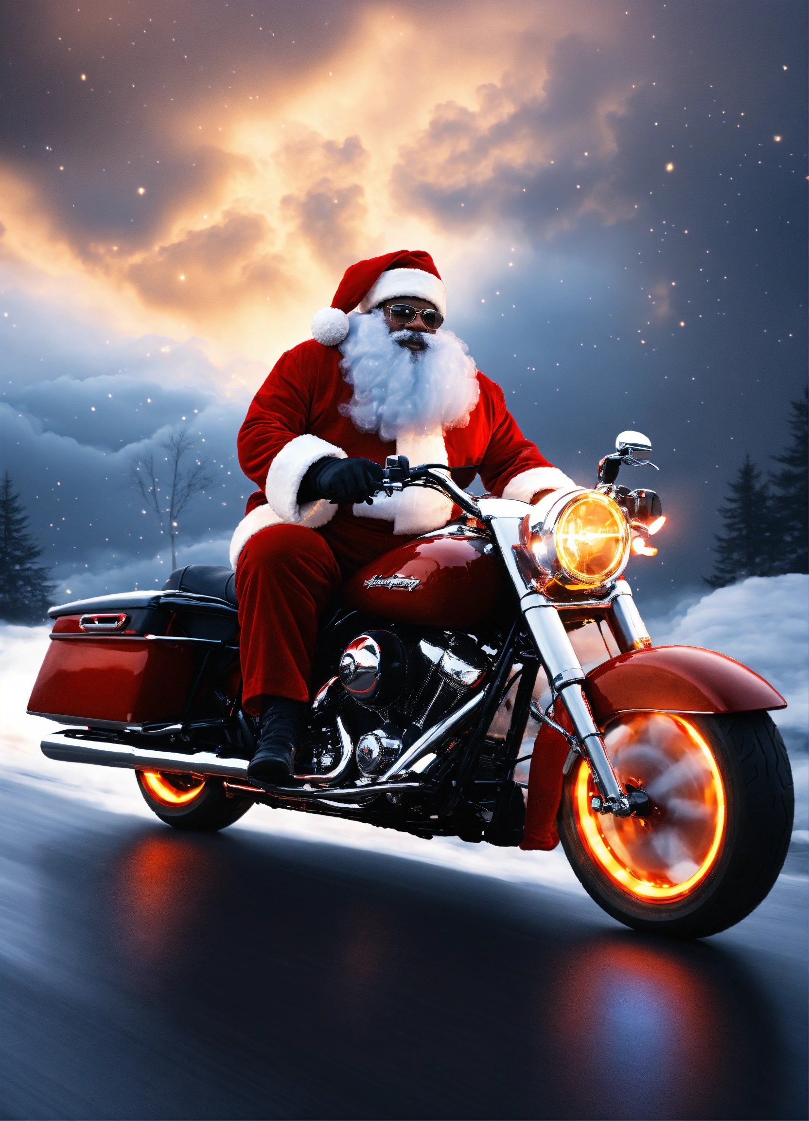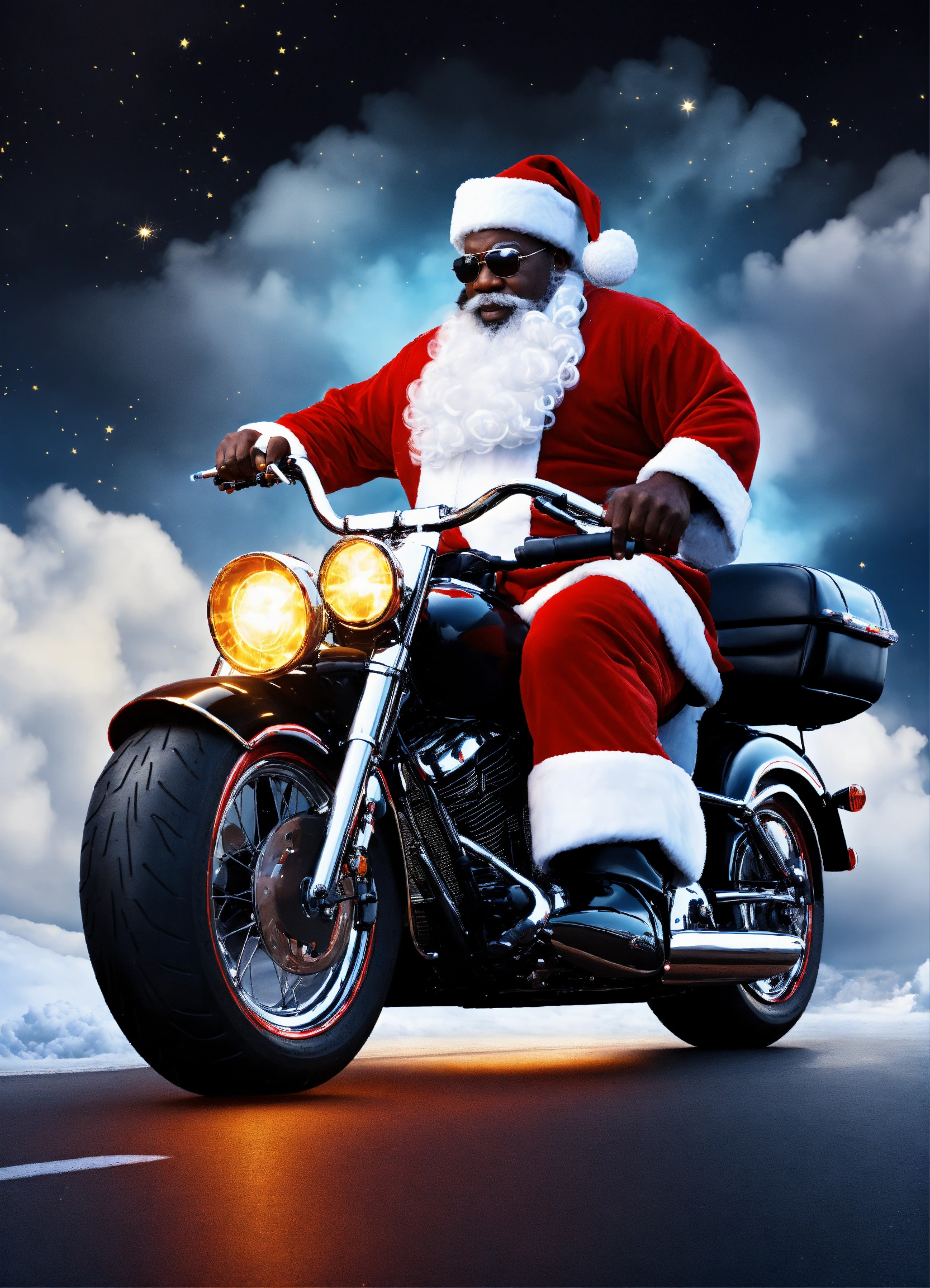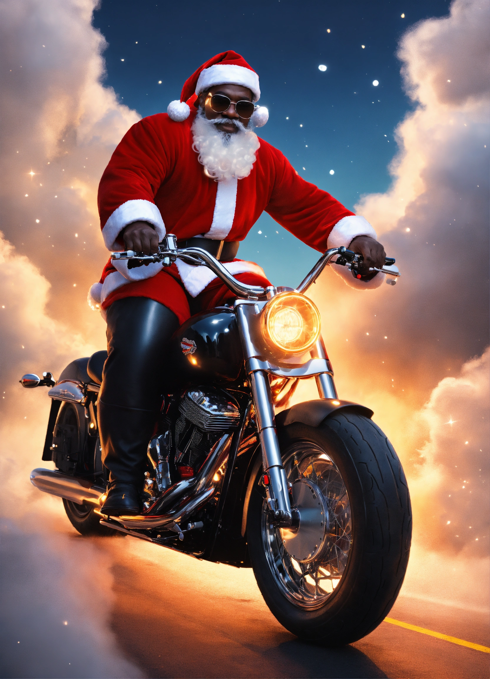 Black santa riding a harley motorcycle with glowing tire rims, presents on the back, driving in the clouds