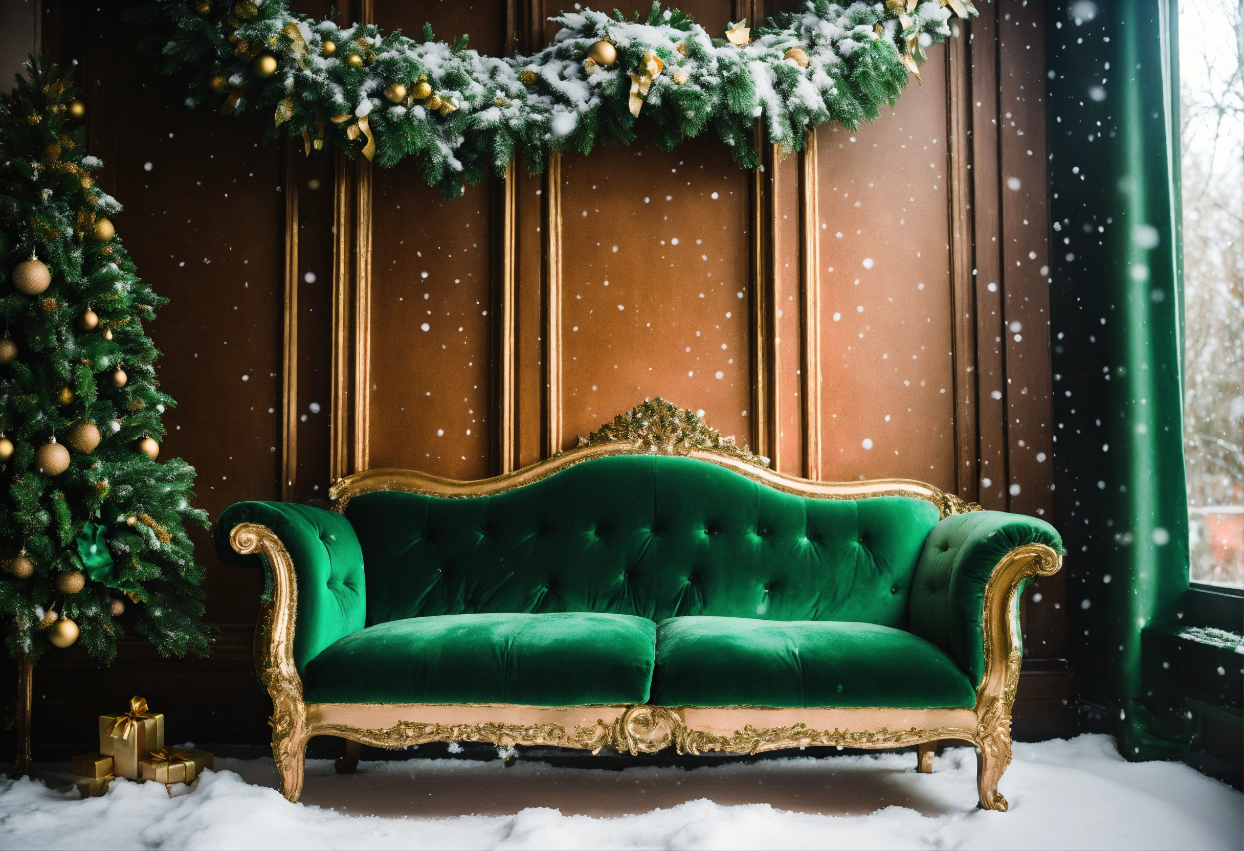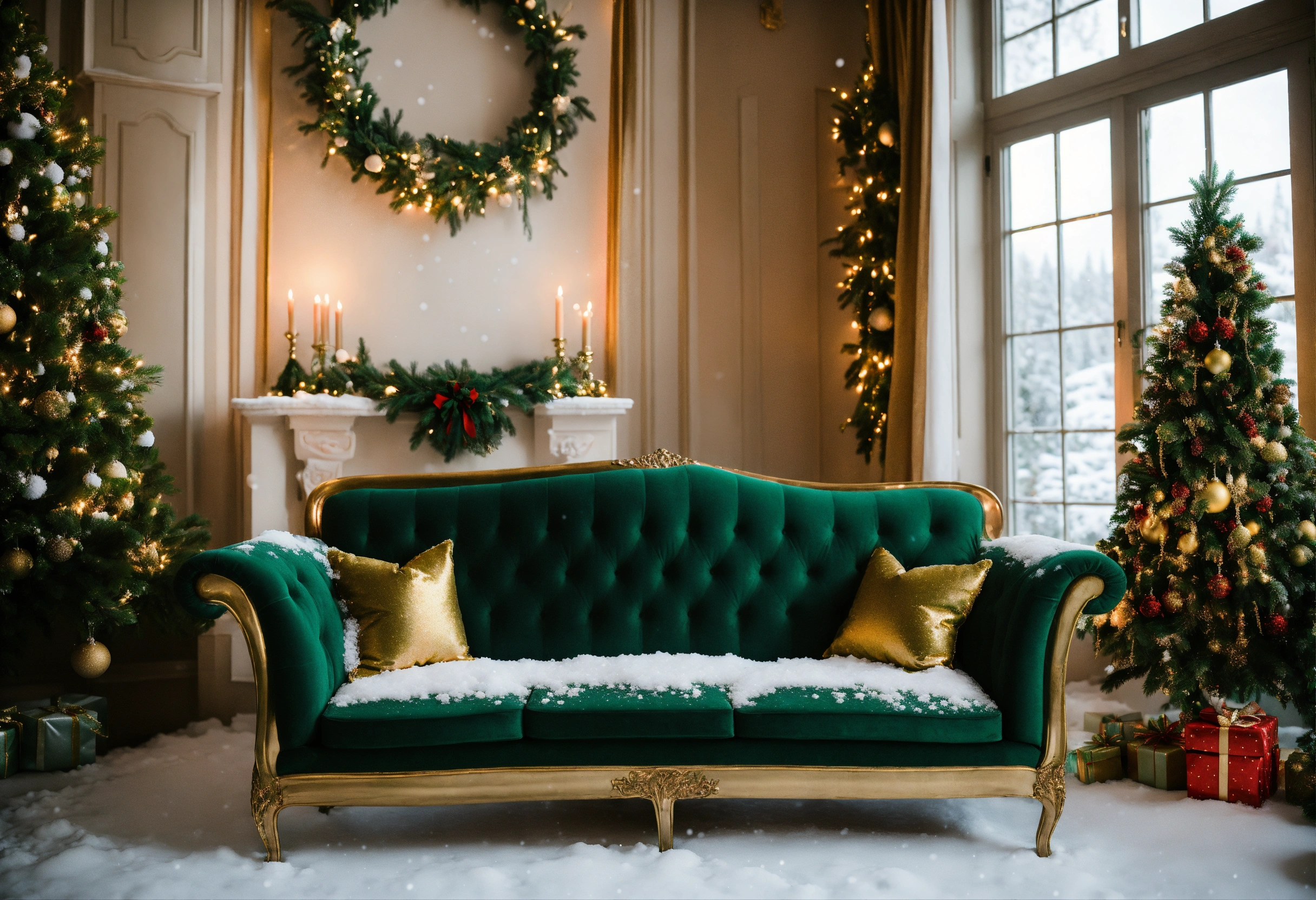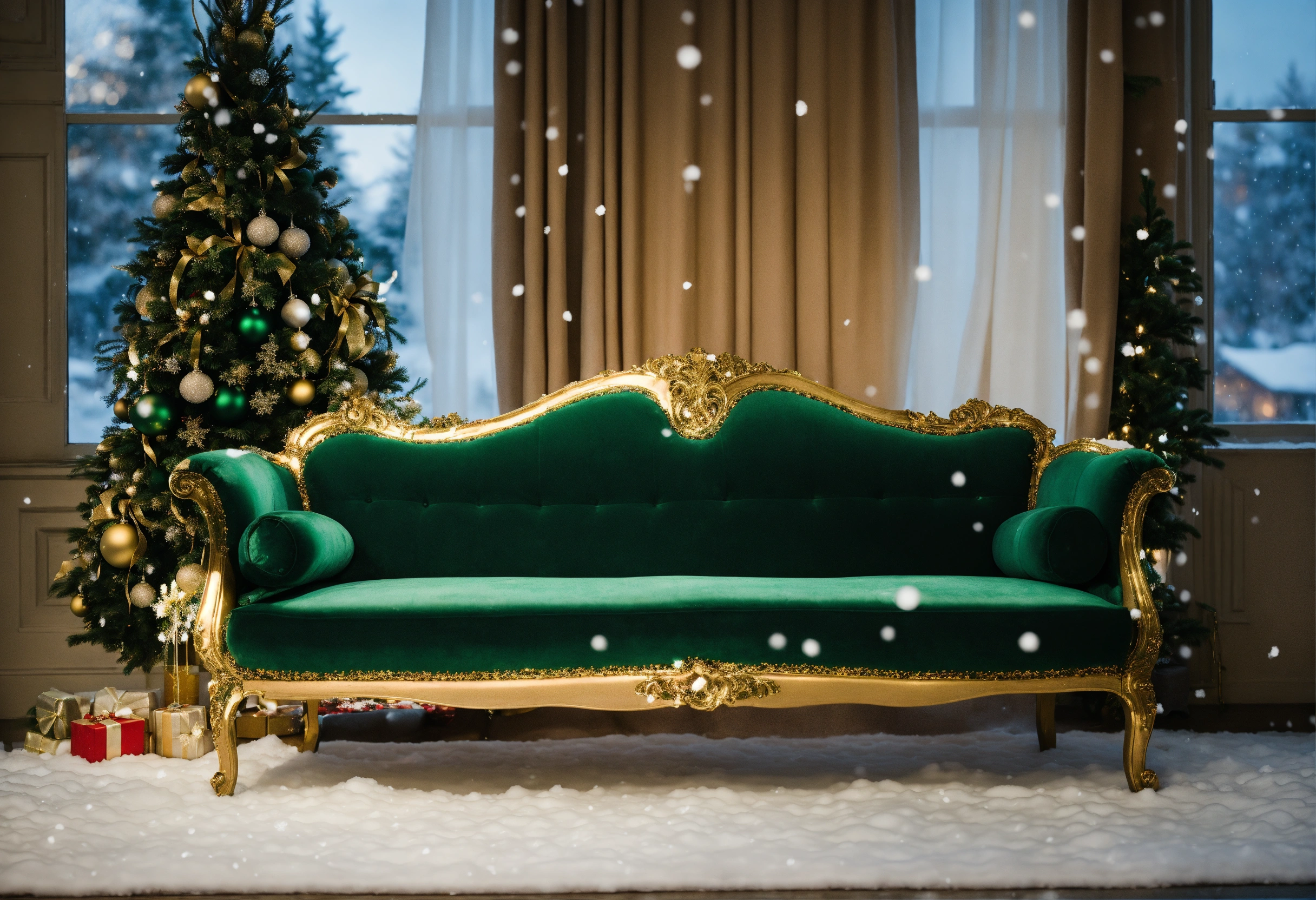 I’m beautiful christmas green and gold wedding sofa facing facing forward, sofa facing front ward, a christmas reef in background sofa facing forward camera, window in the back with snow falling outside, full image, close up view