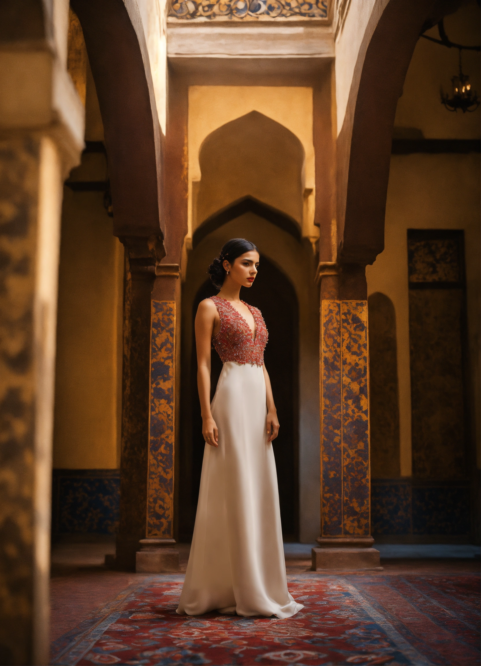 Iranian girl, in chanel dress, in perspolis castel in iran, innovative avant-garde art, deco fashion, fashion editorial, fashion photoshoot, elegant, luxury, clean, smooth, elegant, beautiful, highly detailed, sharp focus, studio photography, xf iq 4, 1 5 0 mp, 5 0 mm, iso 2 0 0, 1 / 1 6 0 s, adobe lightroom, rule of thirds, symmetrical balance, depth layering, polarizing filter, sense of depth, ai enhanced