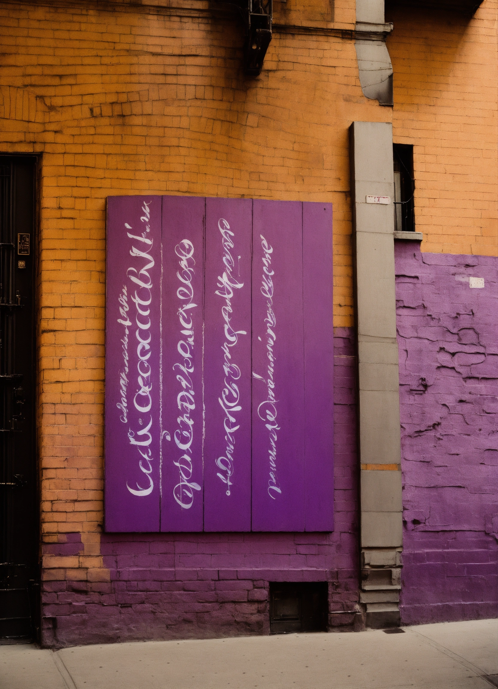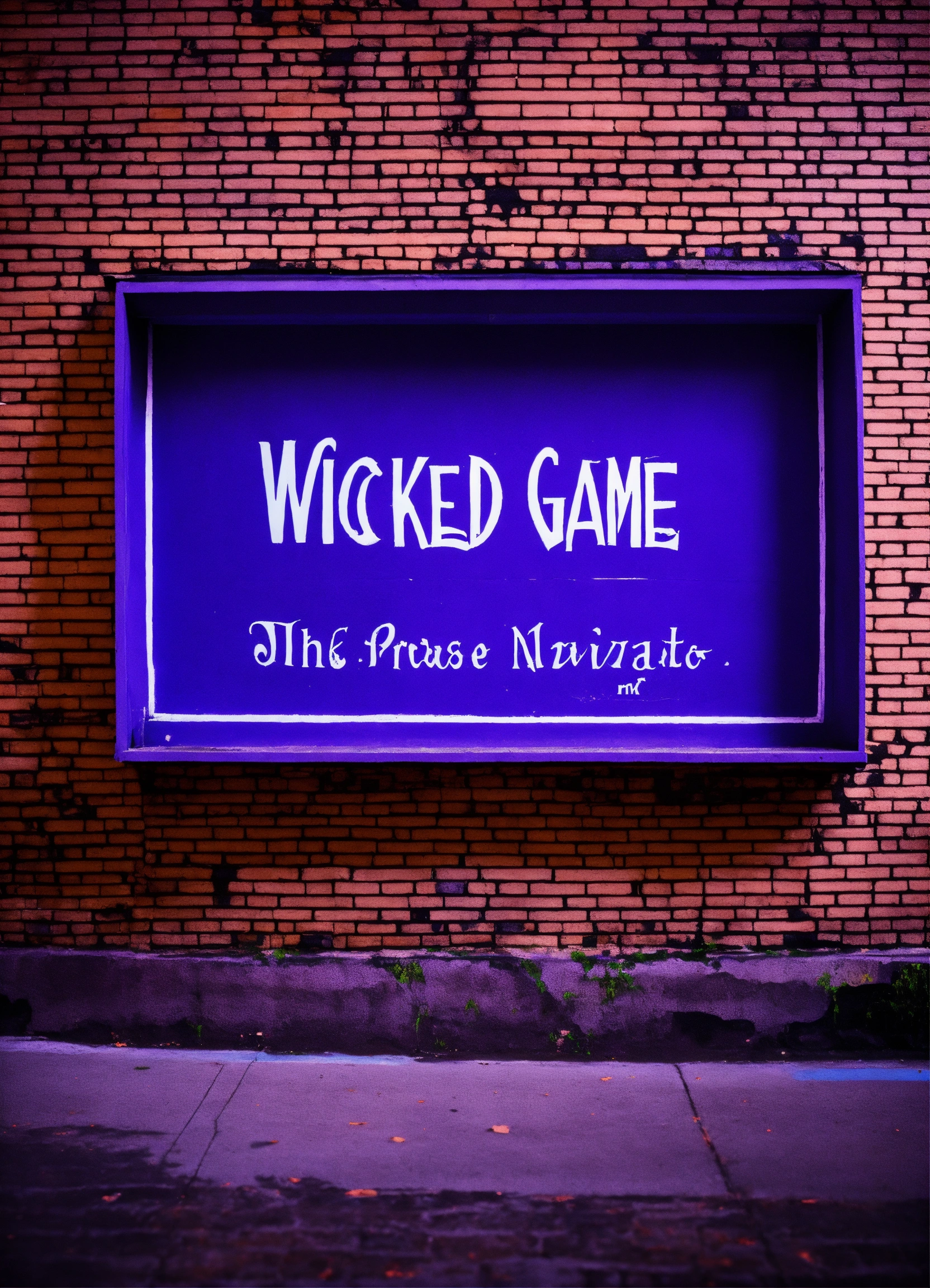 The phrase "wicked game" in smooth purple calligraphy on a wall of new york