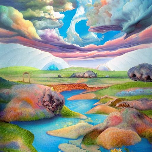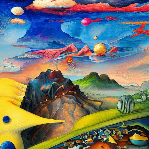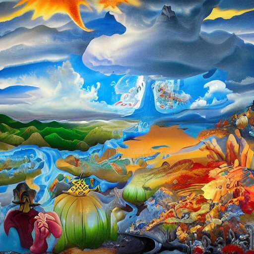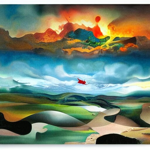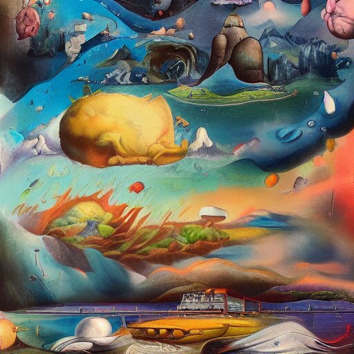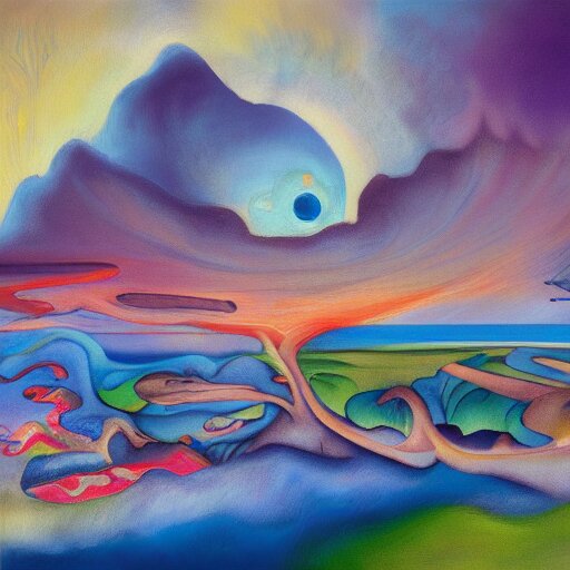 A surrealist landscape by ross tran, by ken sugimori, on canvas, hyperdetailed, photograph, on tv, high quality, 8k, post processing by peter paul rubens, by joan miró, vibrant, a multitude of colors during a sunset on a lakefront, oil on canvas, by georgia o'keeffe, flemish painting