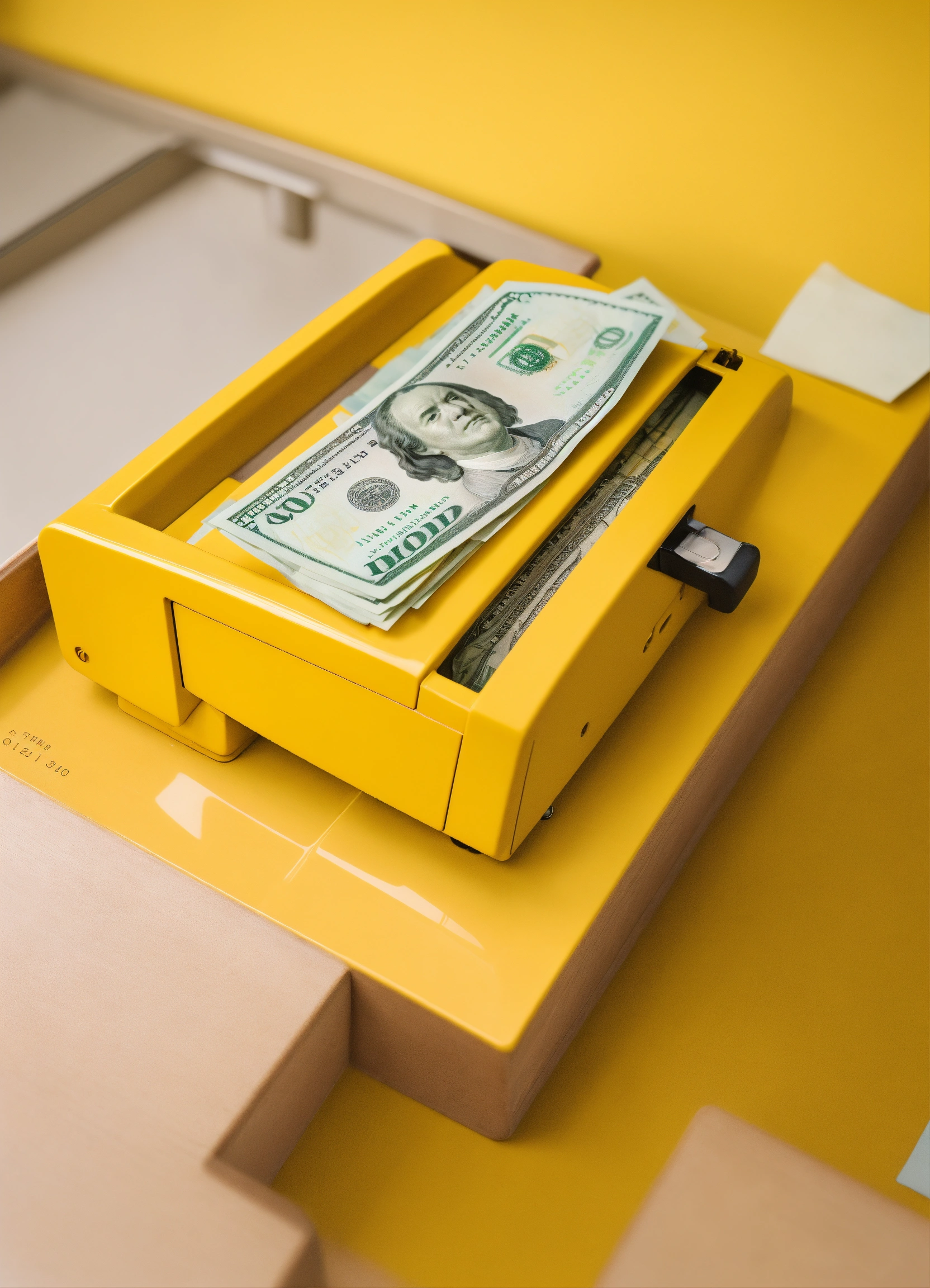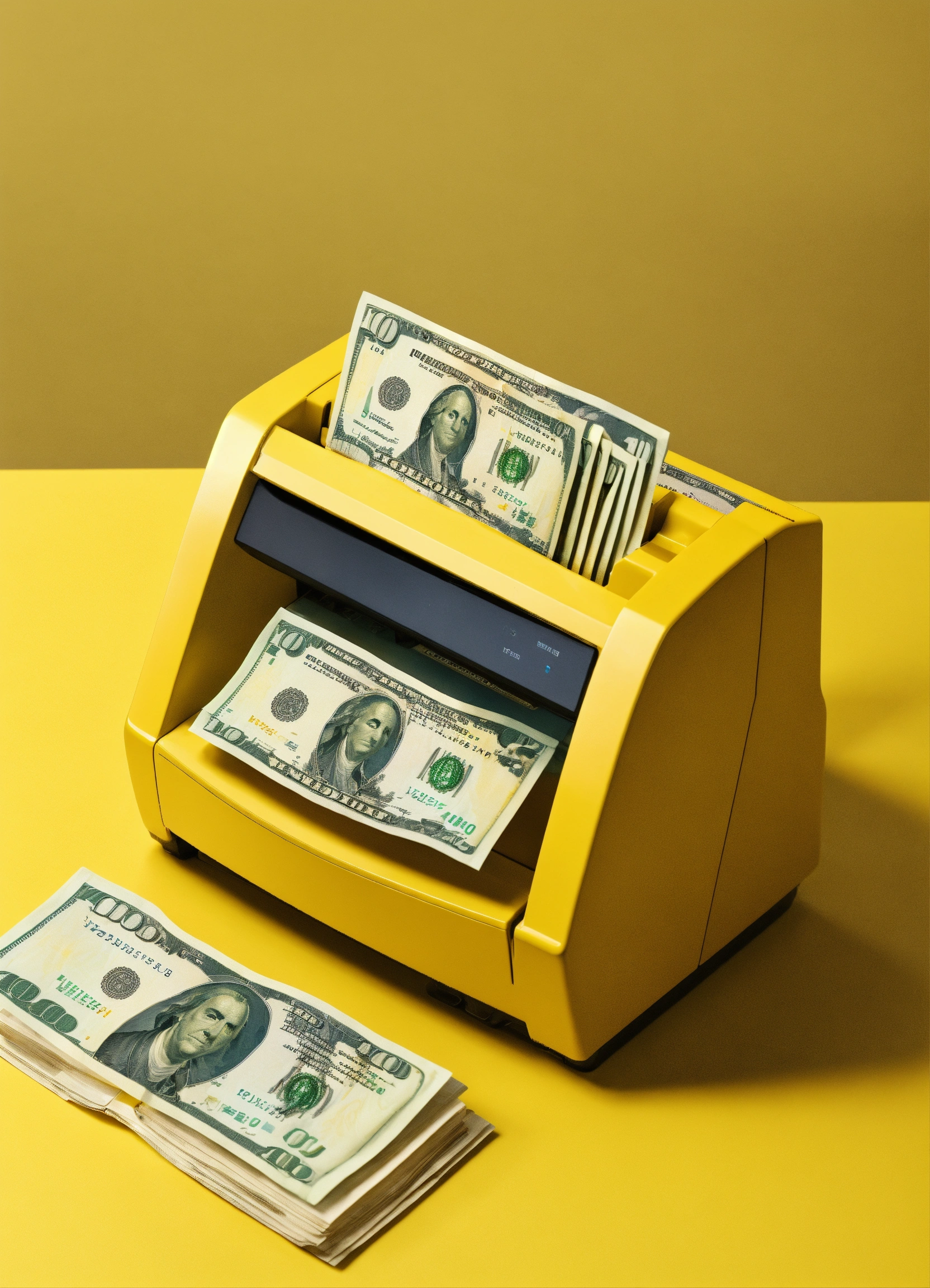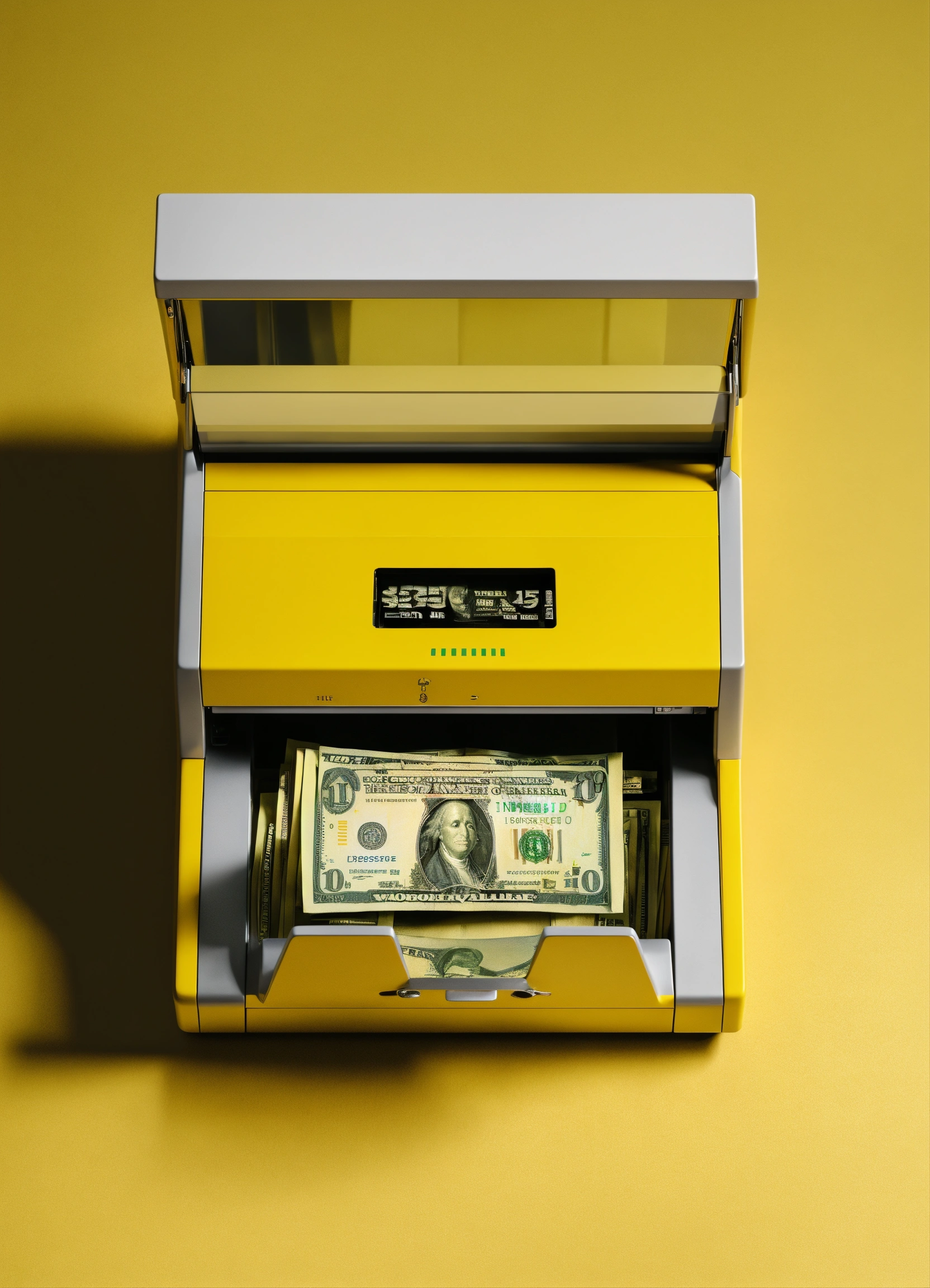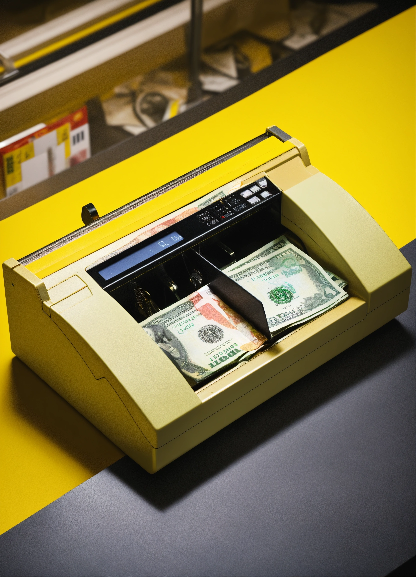 The banknote counter is on the table, from there come out us dollar, minimalist style, the view from above is distant, yellow background.