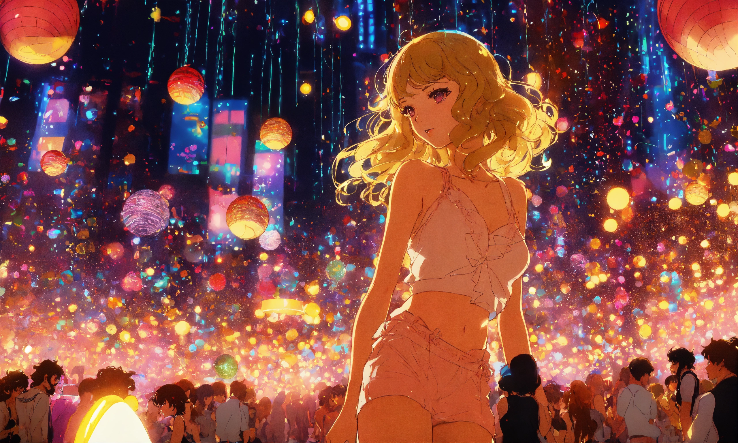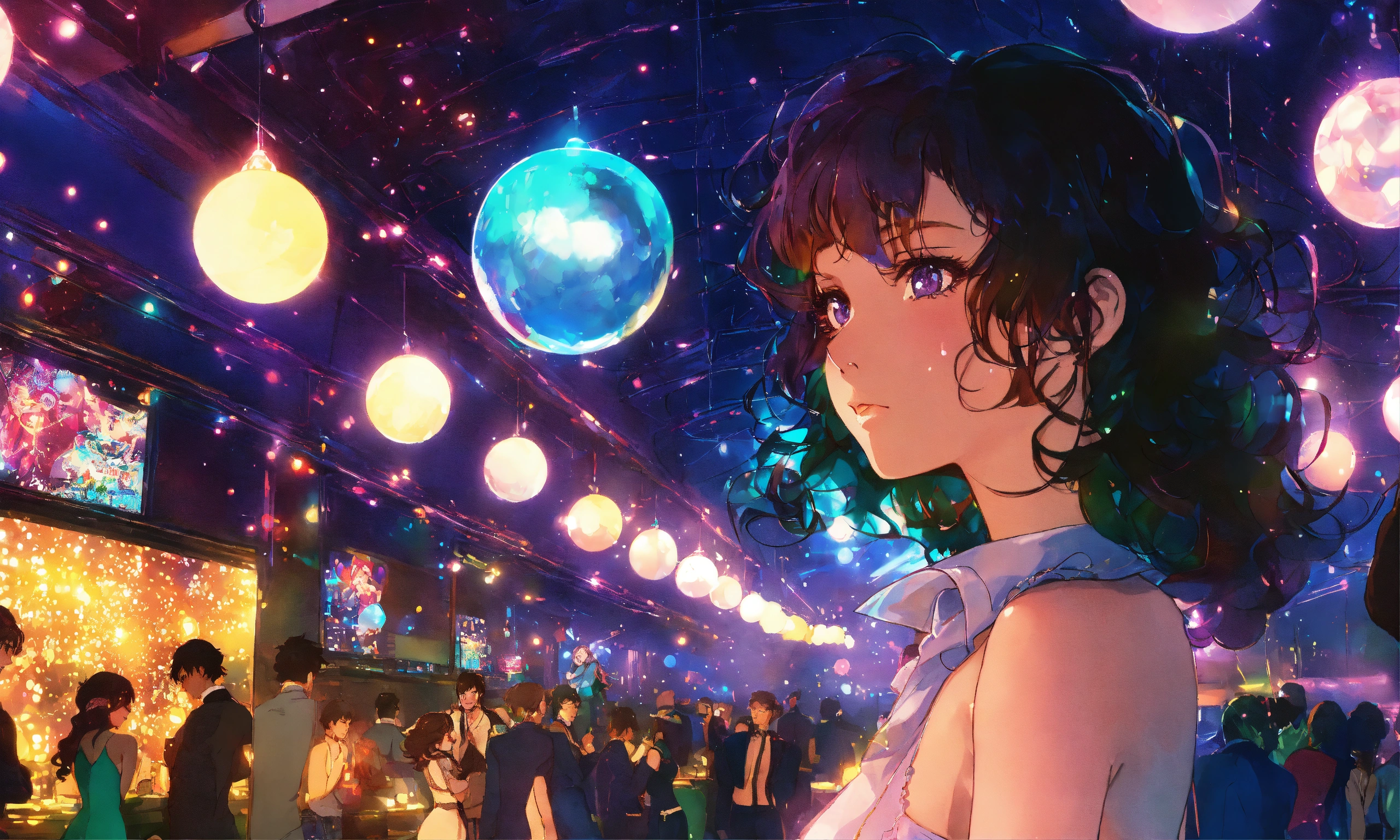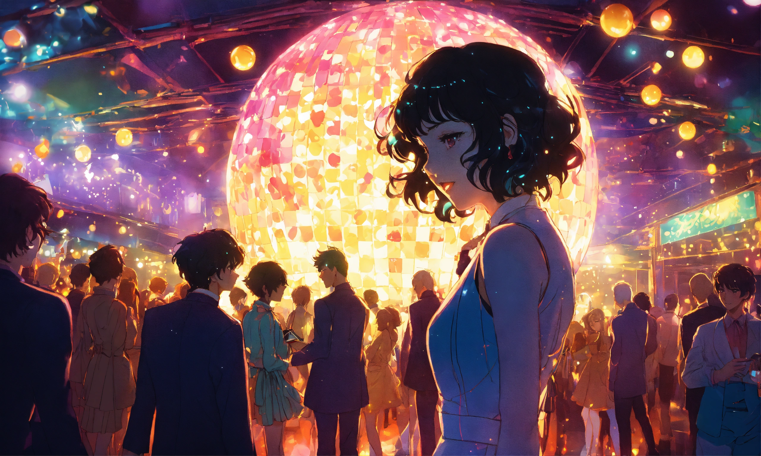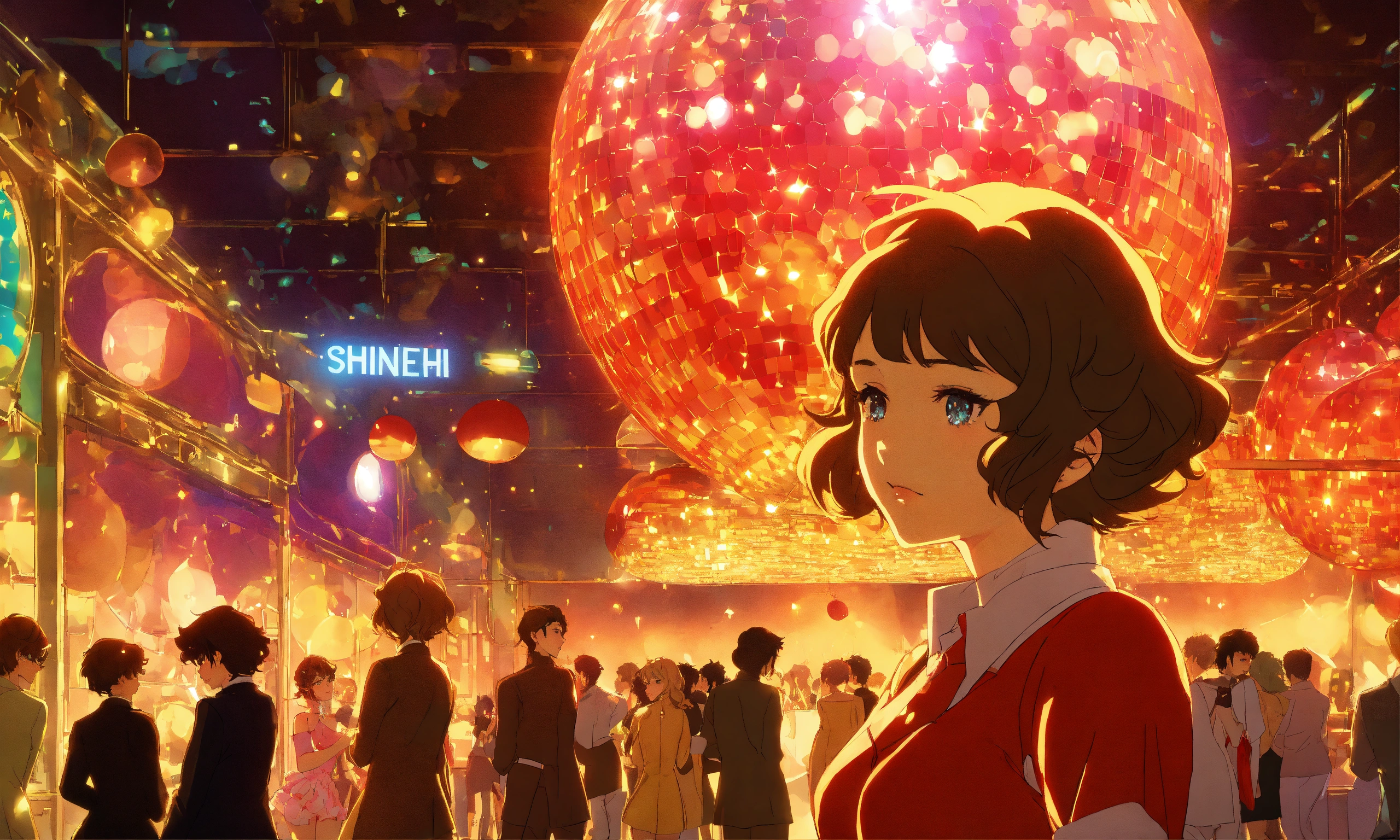 Cel anime, beautiful, lady, 18 years old, shy, wavy hair, sparkling costumes, city pop, dancing under a small glitter ball in an underground disco club, retro lighting; by shinkai makoto, kaethe butcher, hajime sorayama, greg tocchini, virgil finlay, 4k, film grain, long shot.