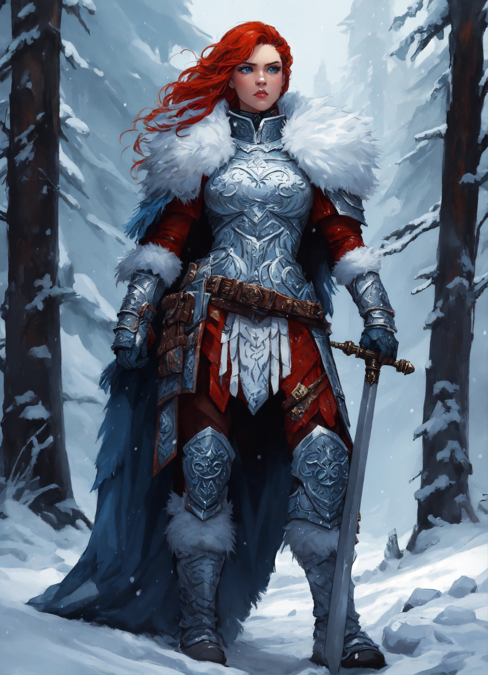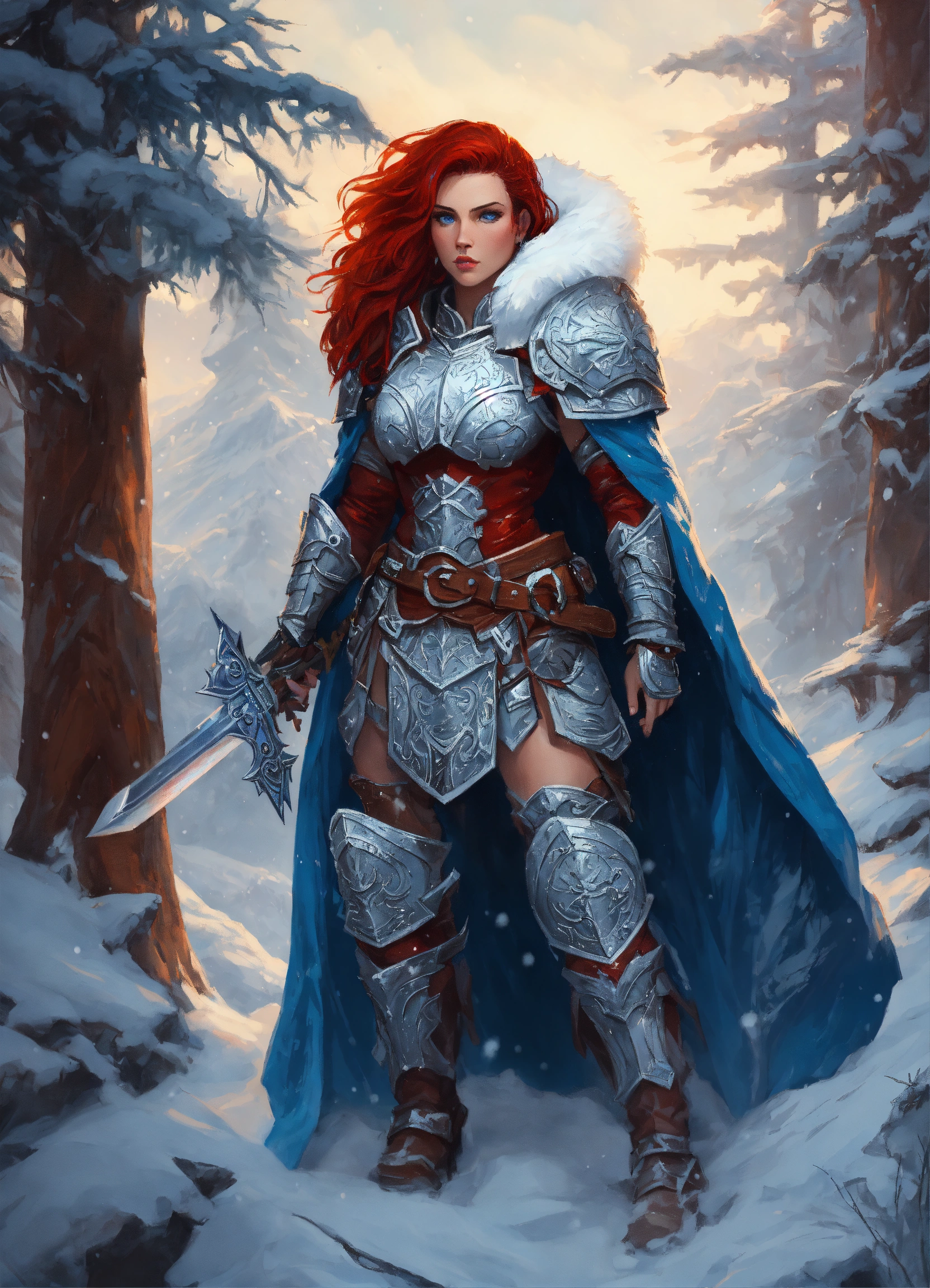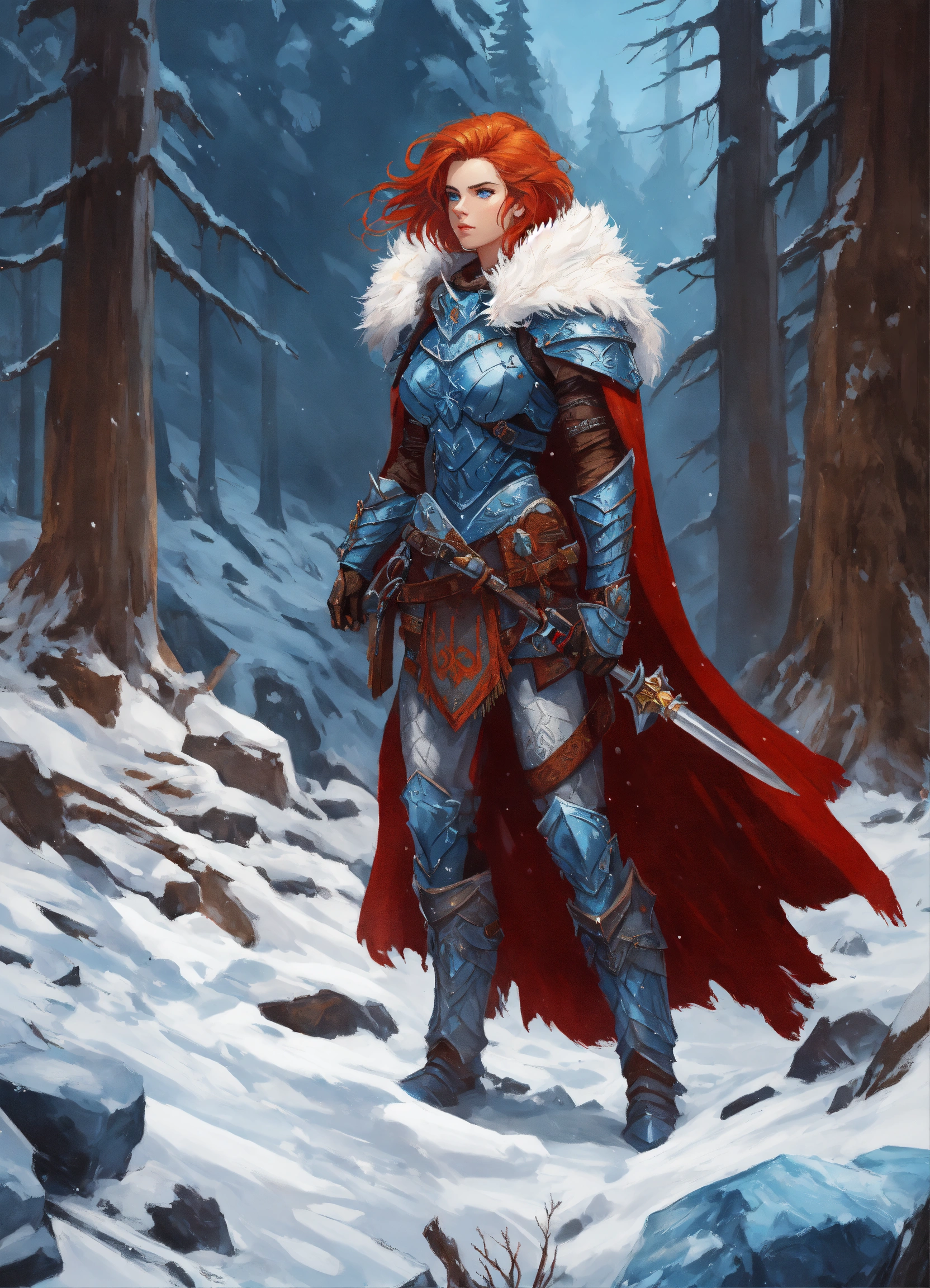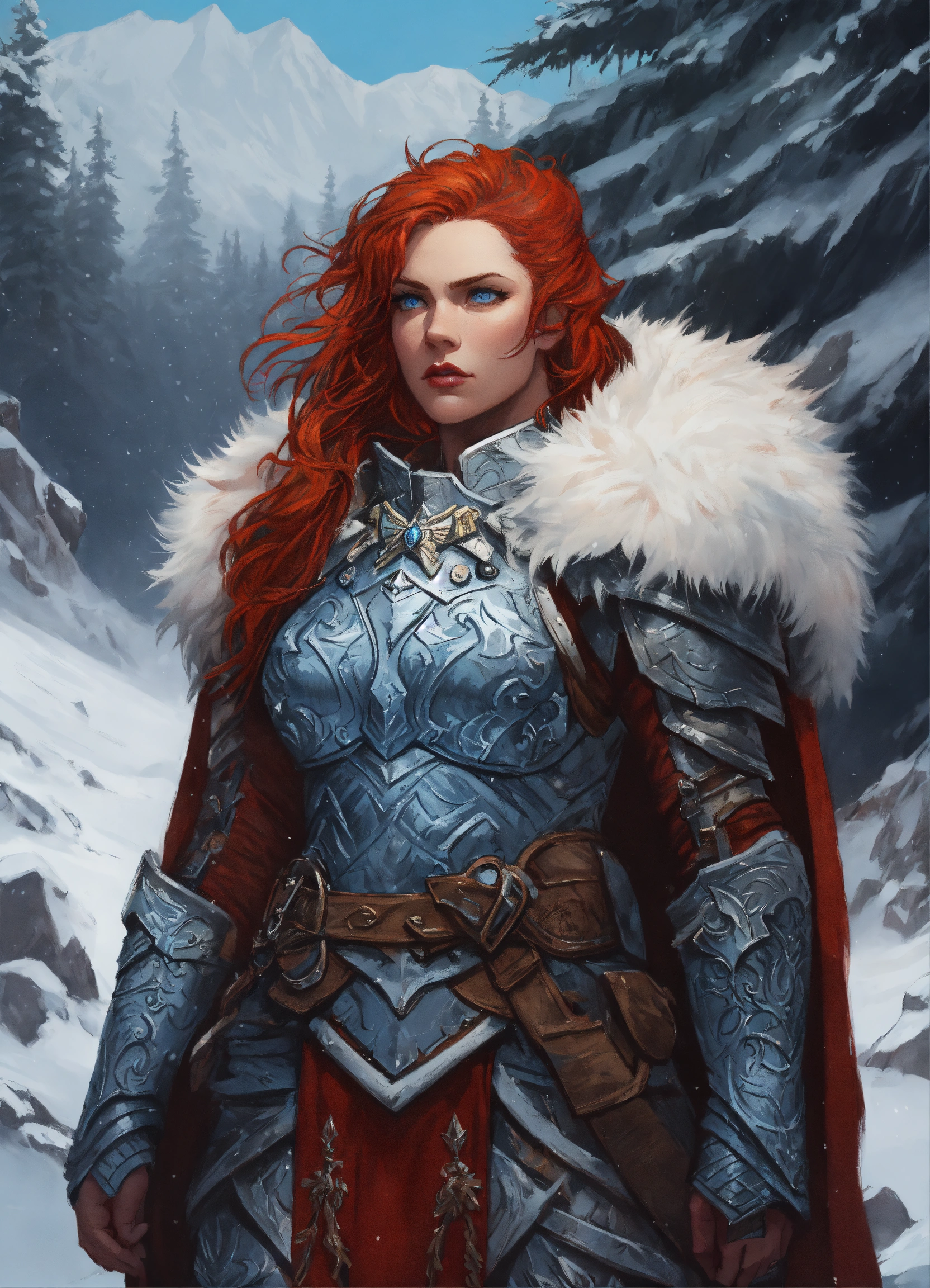 A strong rugged woman in intricate armor, highly detailed, broad shoulders, masculine female, bright blue eyes, savage, warhammer fantasy, art style of alex gray art, dan mumford art style, bulky armor, white fur shoulder cape, savage, strong, winter scene, icy, mountain, forest, red hair, tall, rough, wild