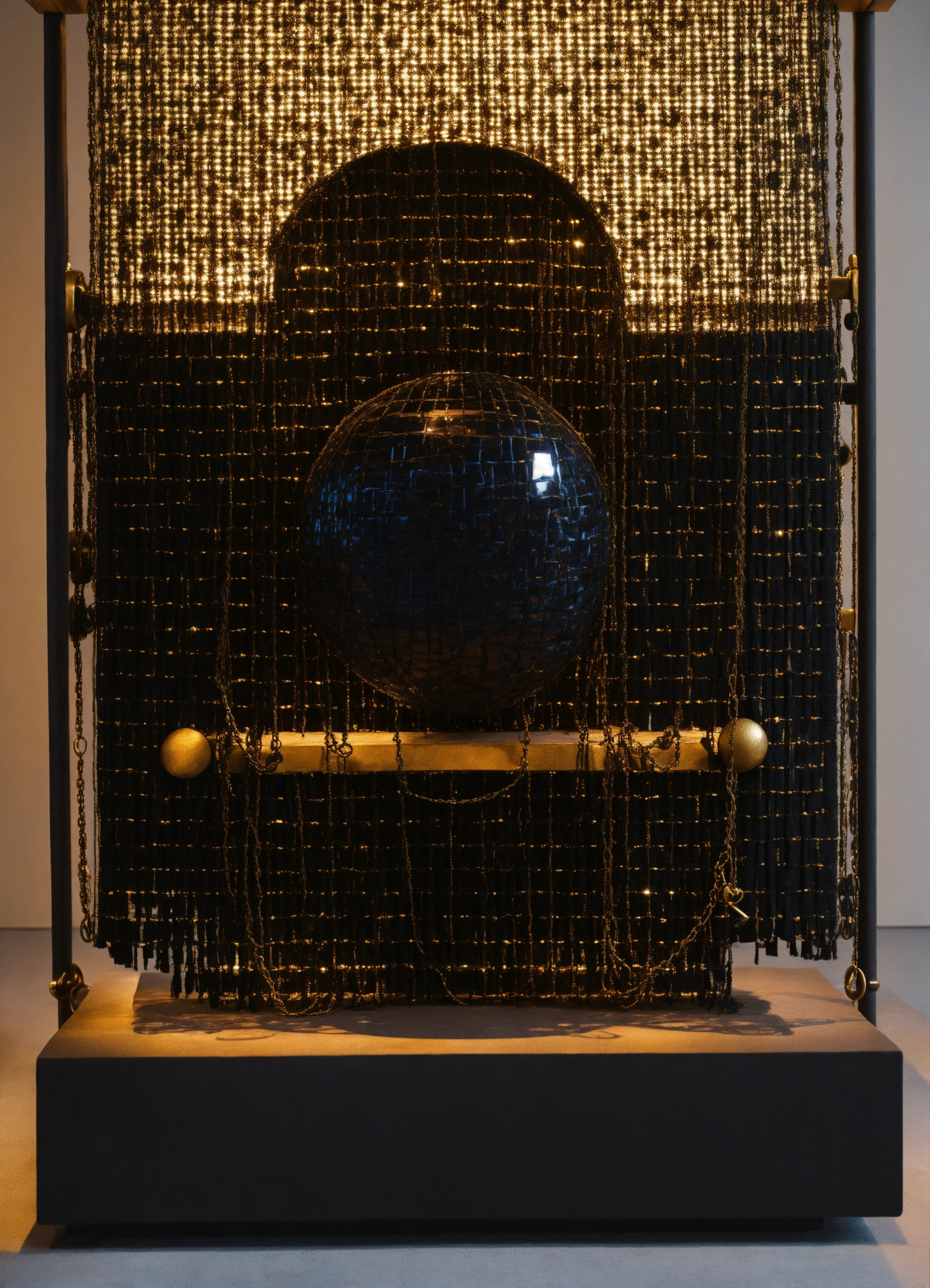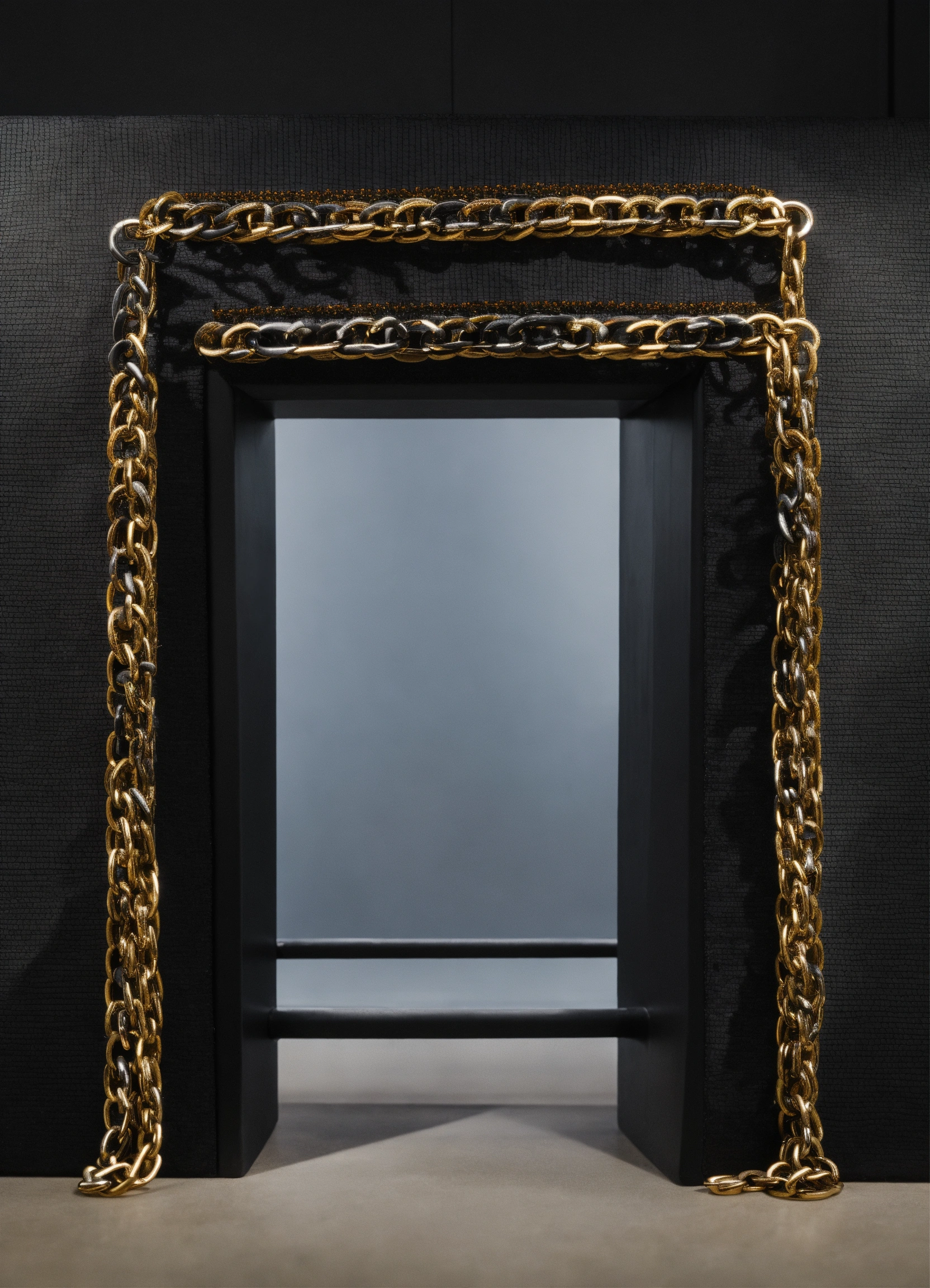 Black pressure stone sculpture gallery chains tweed haute couture weave tinted glass