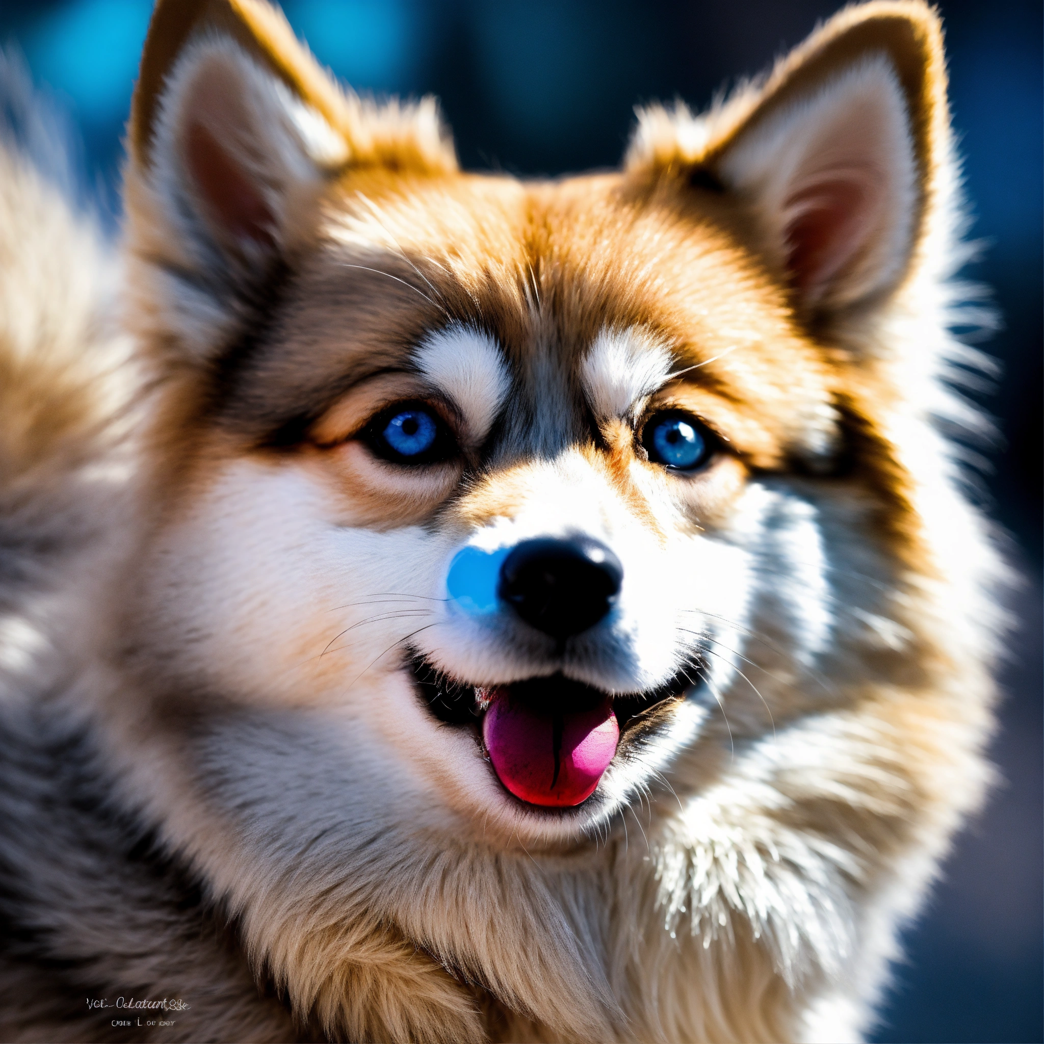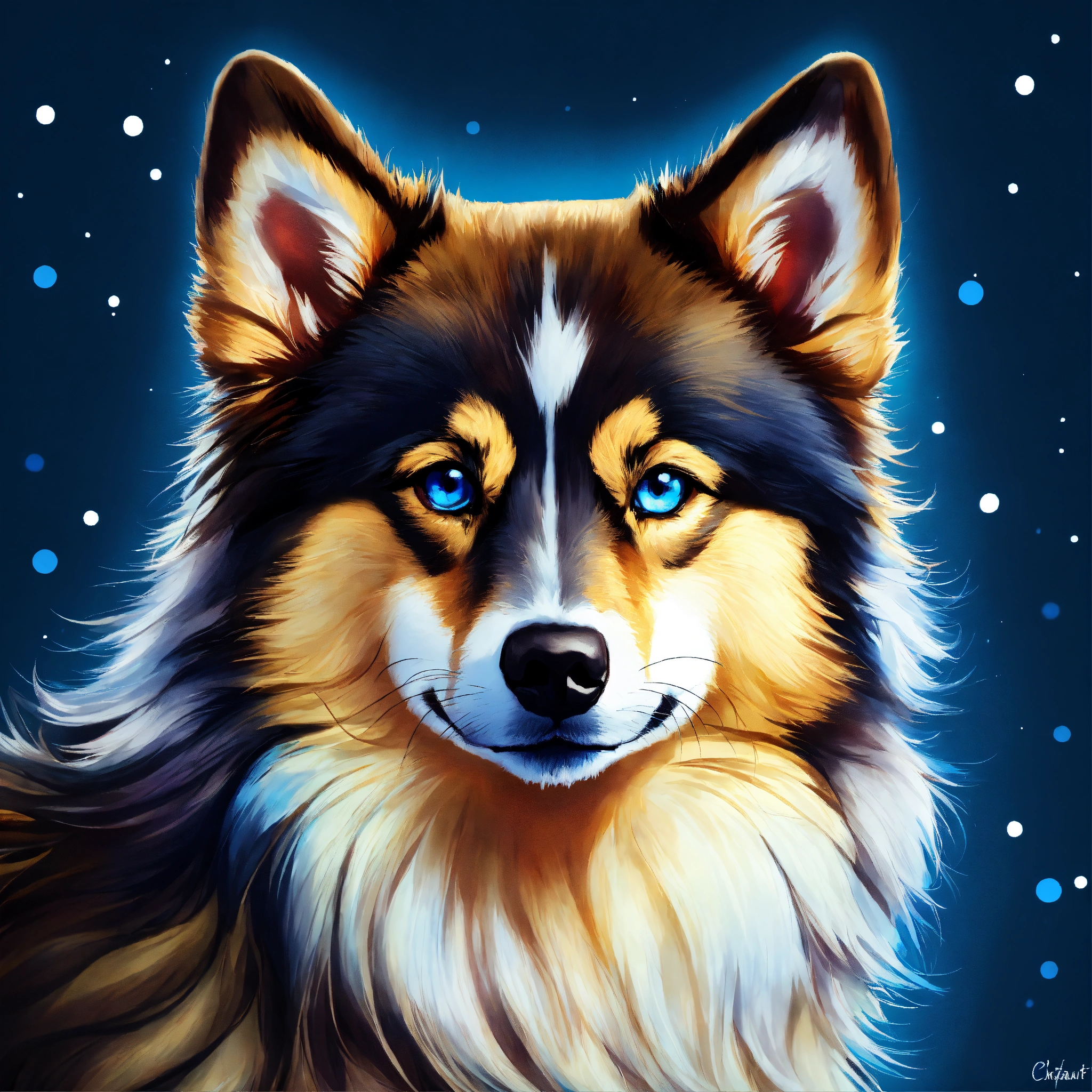 Dans cet éclatant portrait, un pomsky captivant regarde droit vers l'avant avec des yeux pétillants d'intelligence et d'espièglerie. ses oreilles triangulaires se dressent fièrement sur sa tête harmonieuse. un fond bleu profond met en valeur la vivacité de ses yeux, créant un contraste frappant.