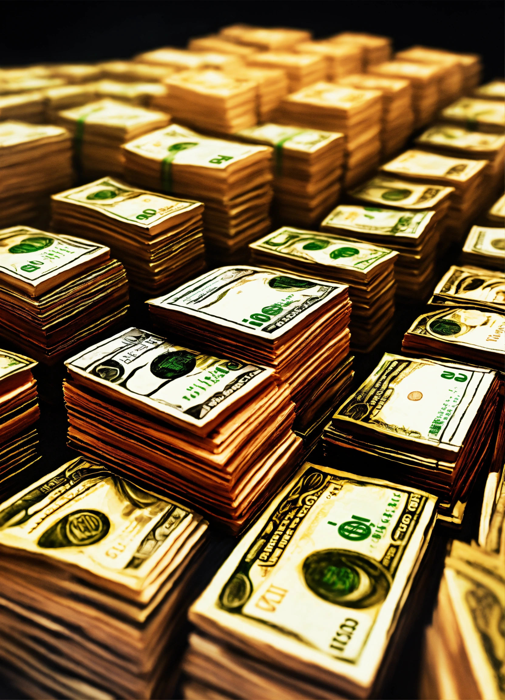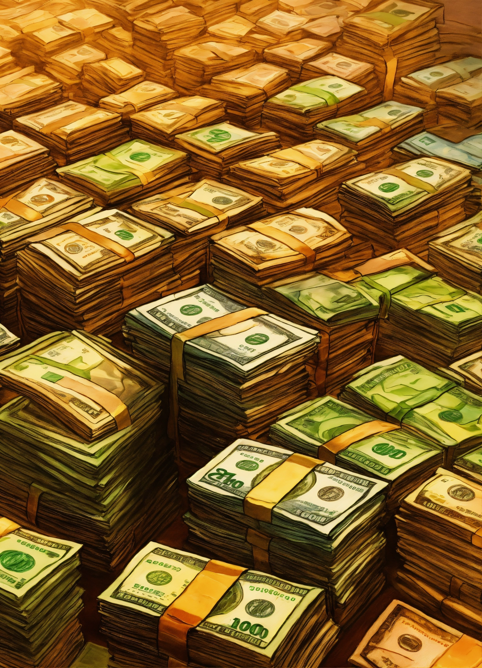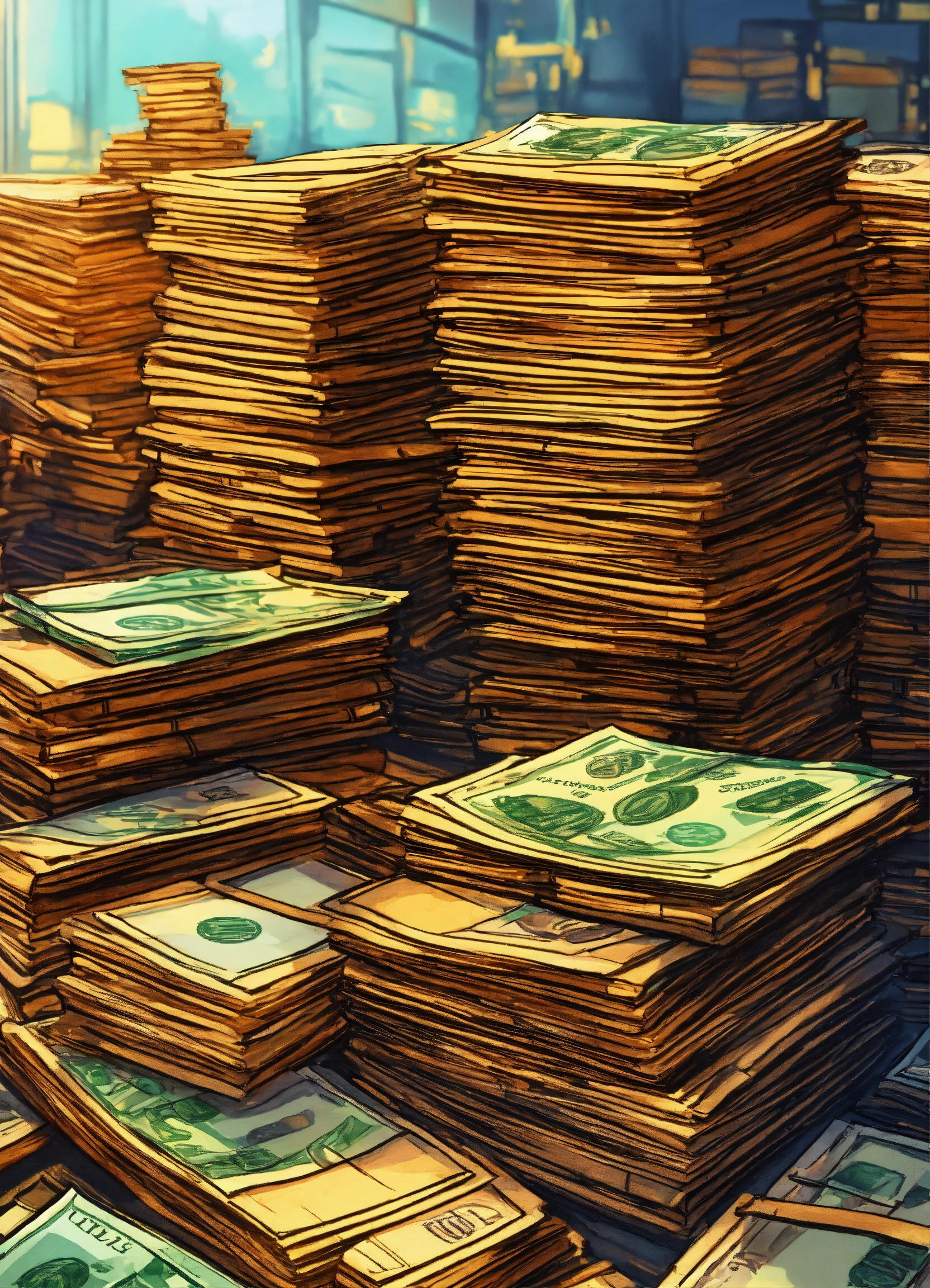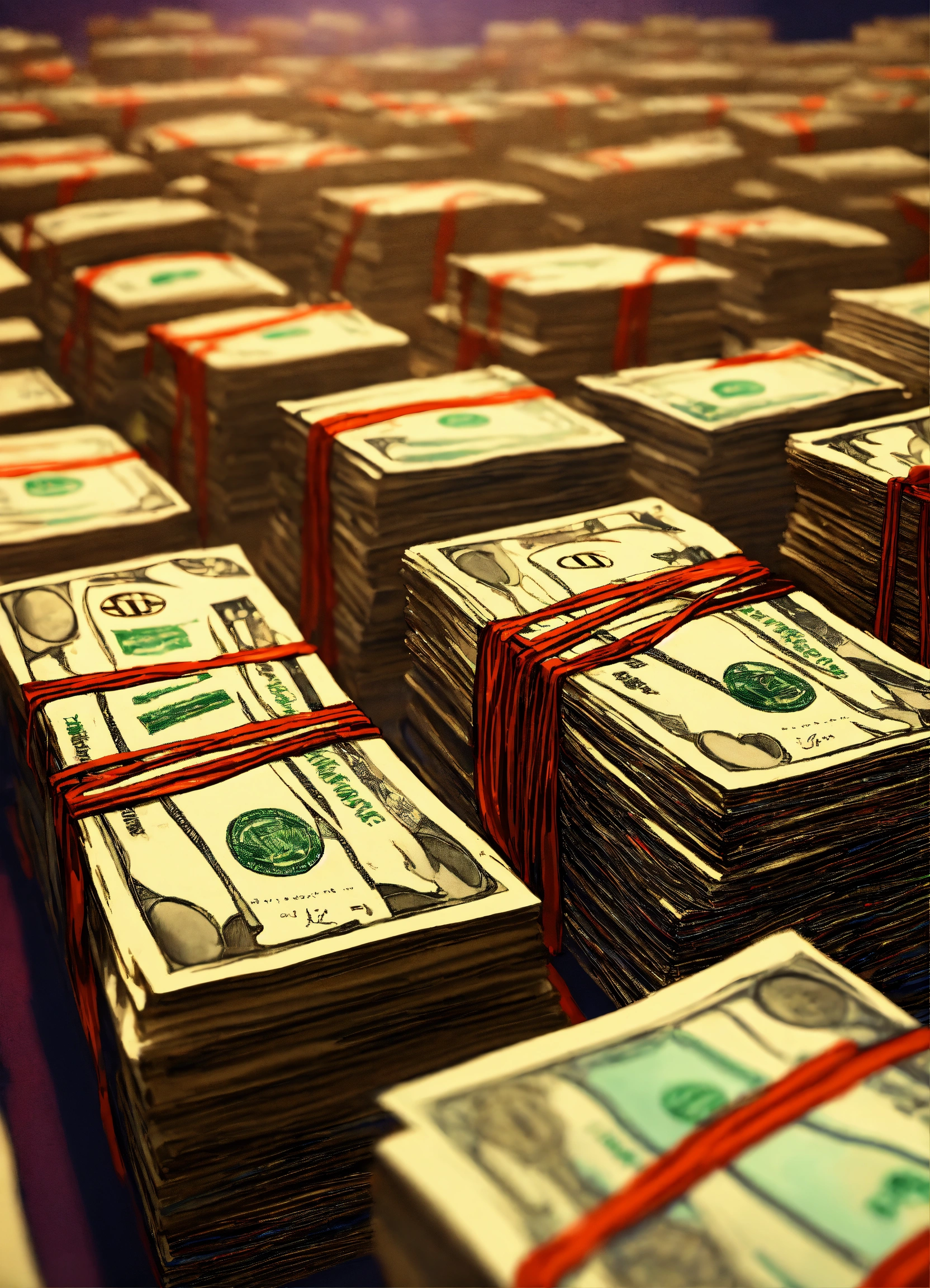 A hand drawn painting of many stacks of money on a big table