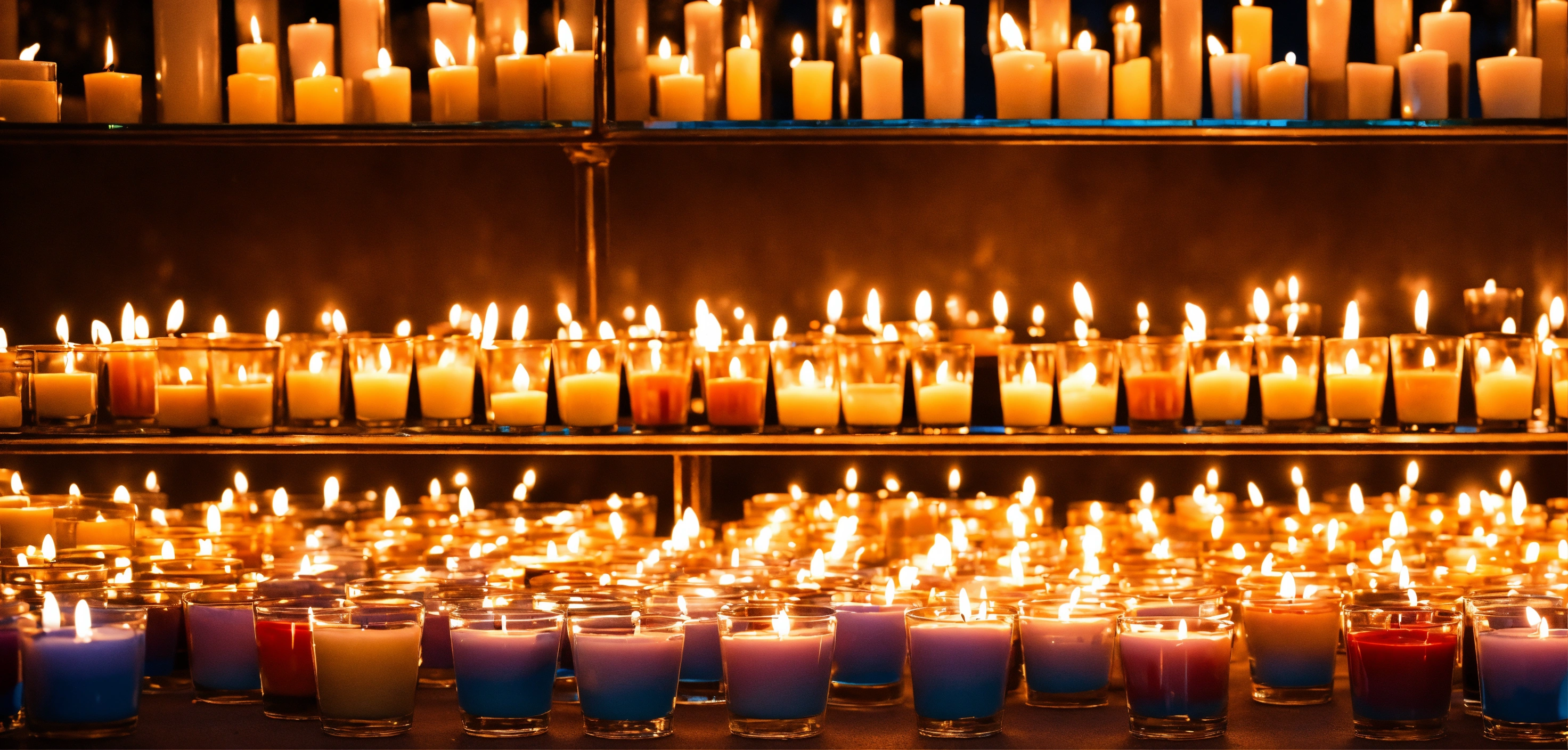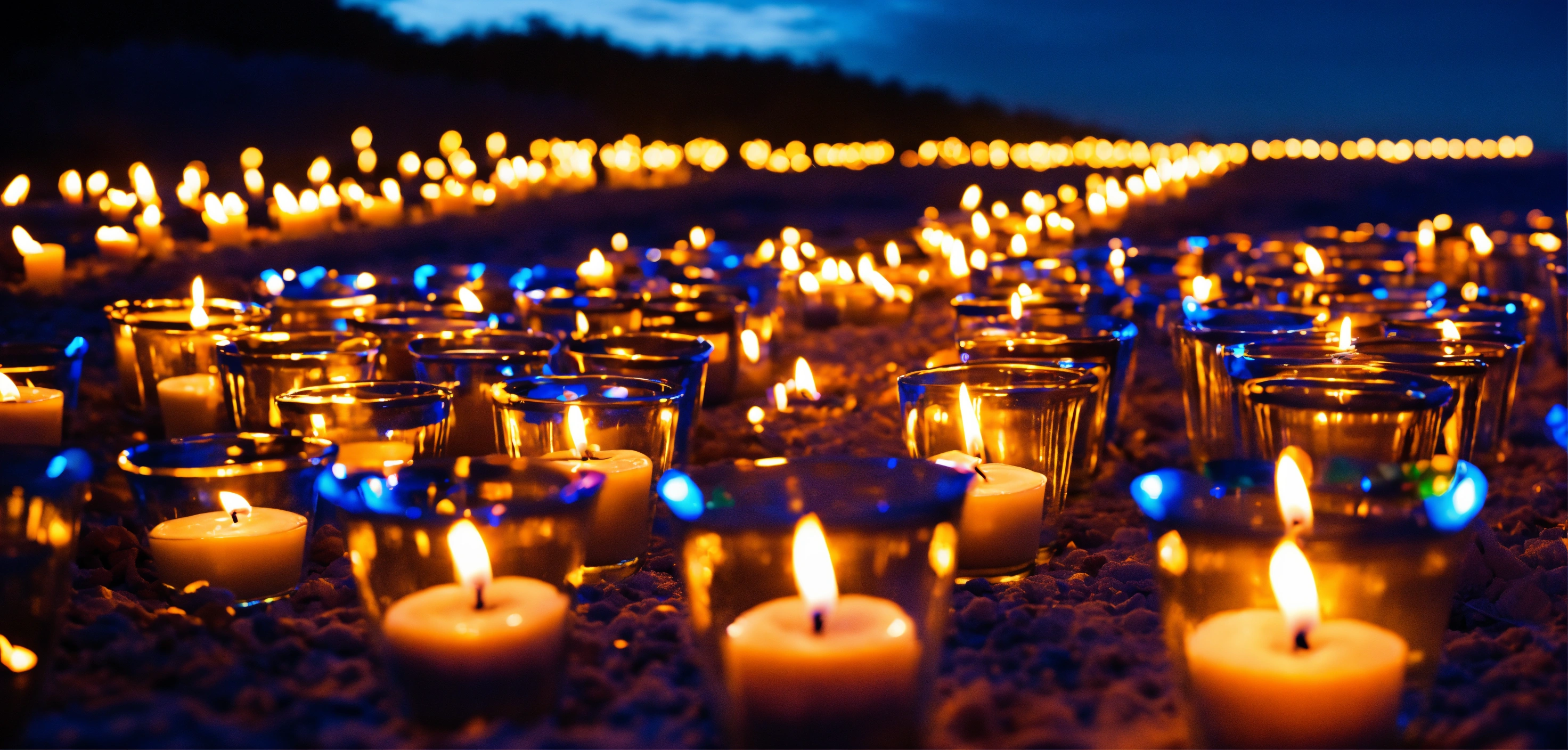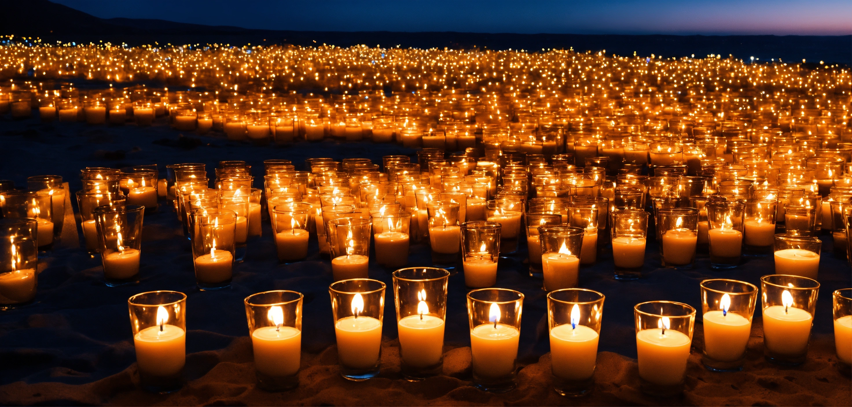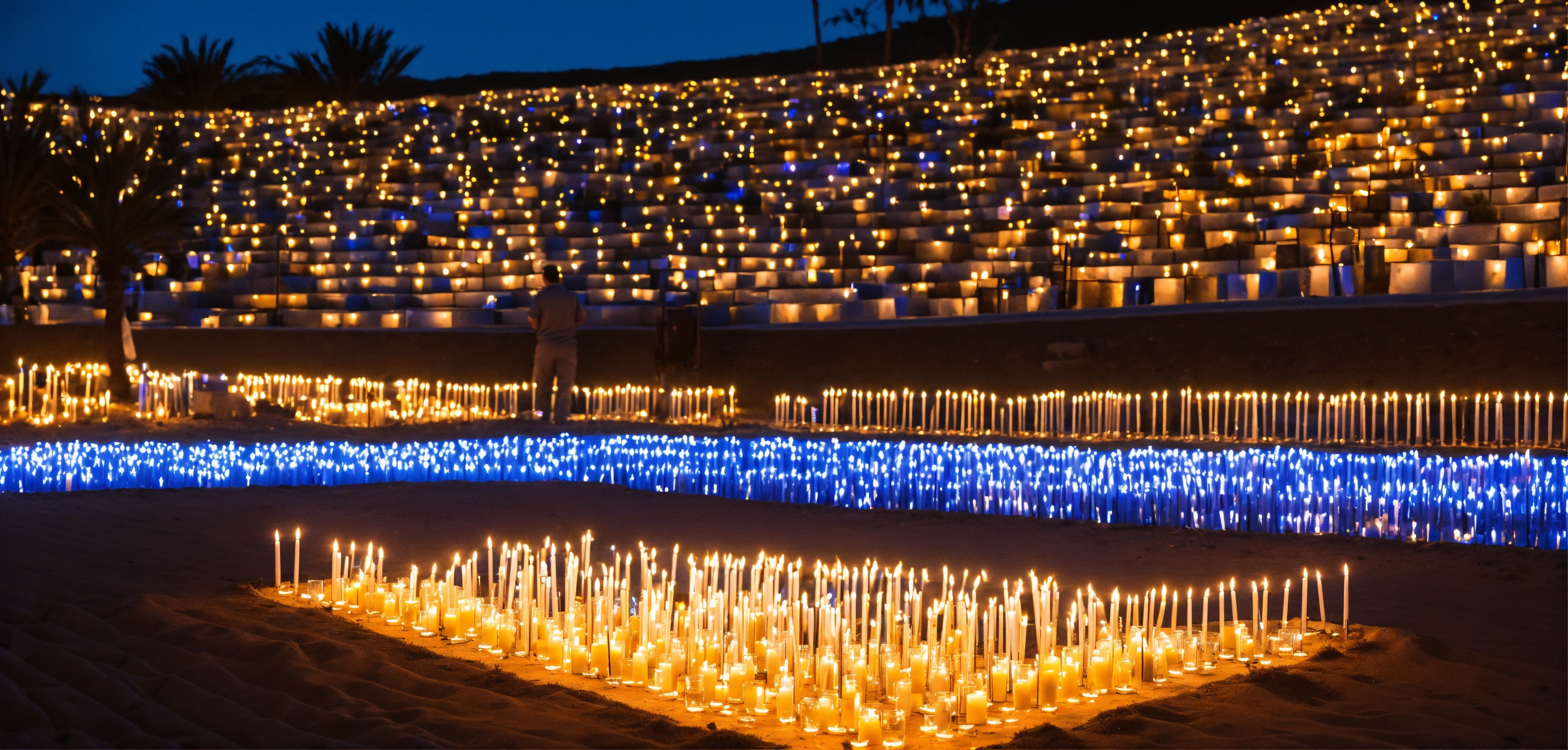Create for me a realistic 8k photo of a night lit by hundreds of candles in glass cups and the israeli flag spread on the ground