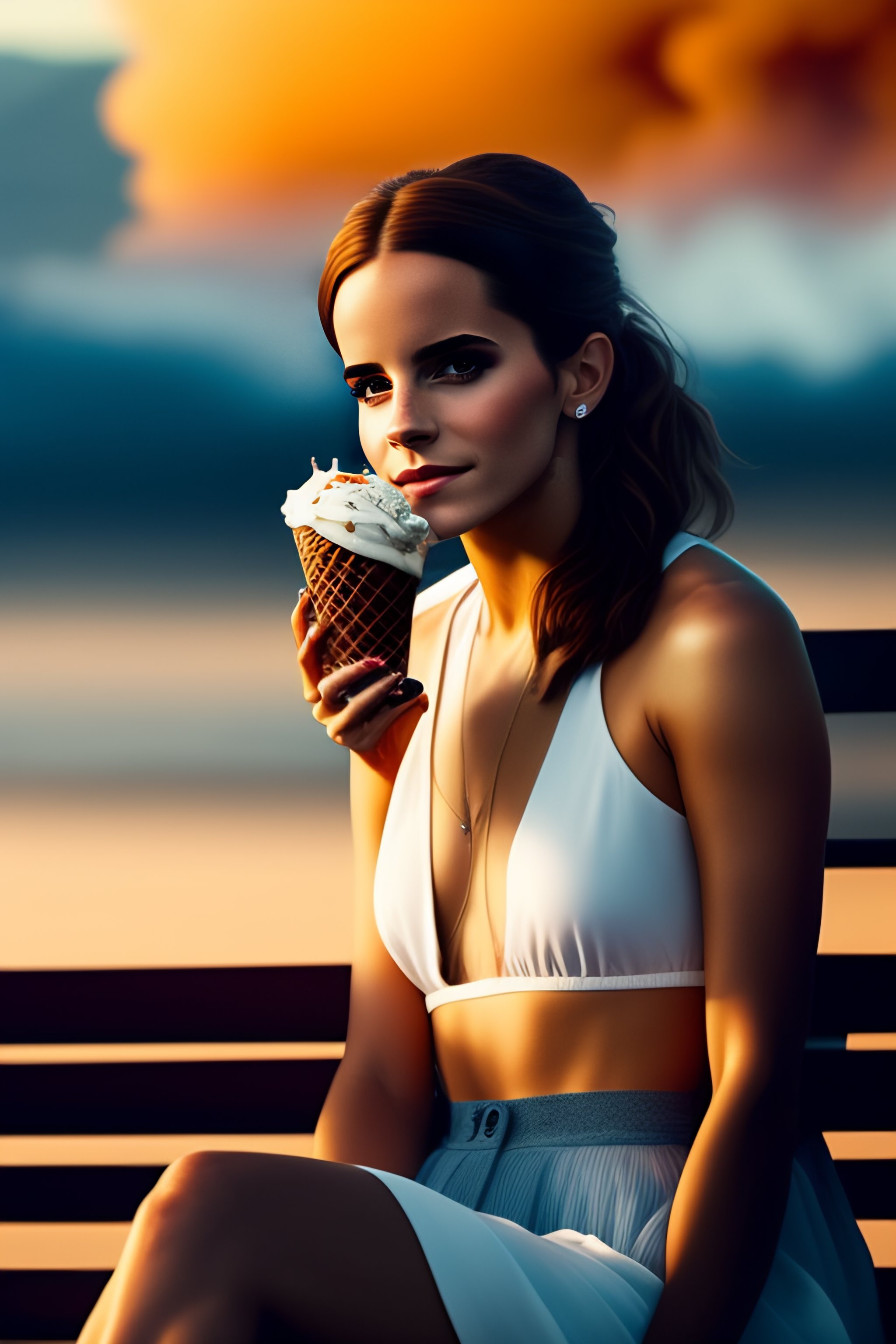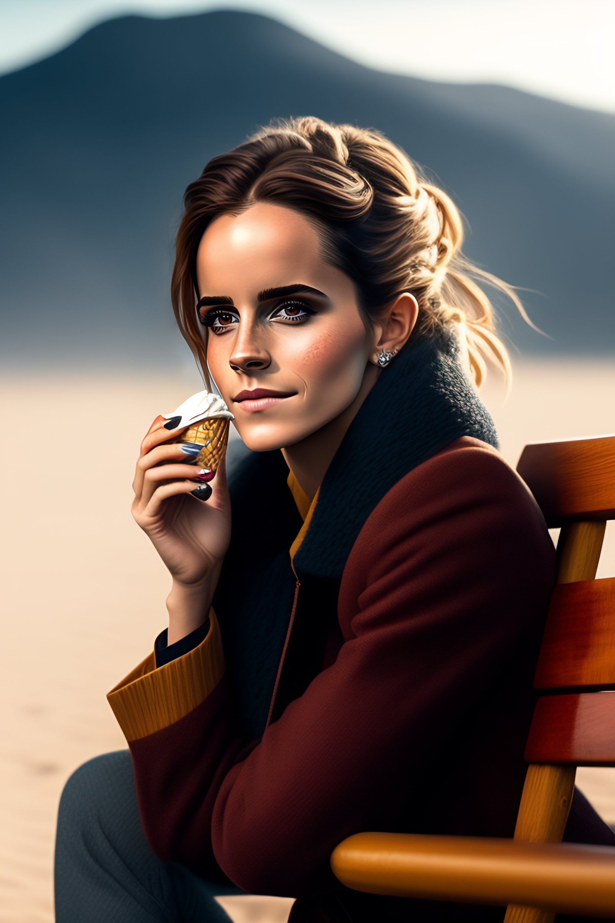 Emma watson chilling on a bench eating ice cream while the earth is burning behind her