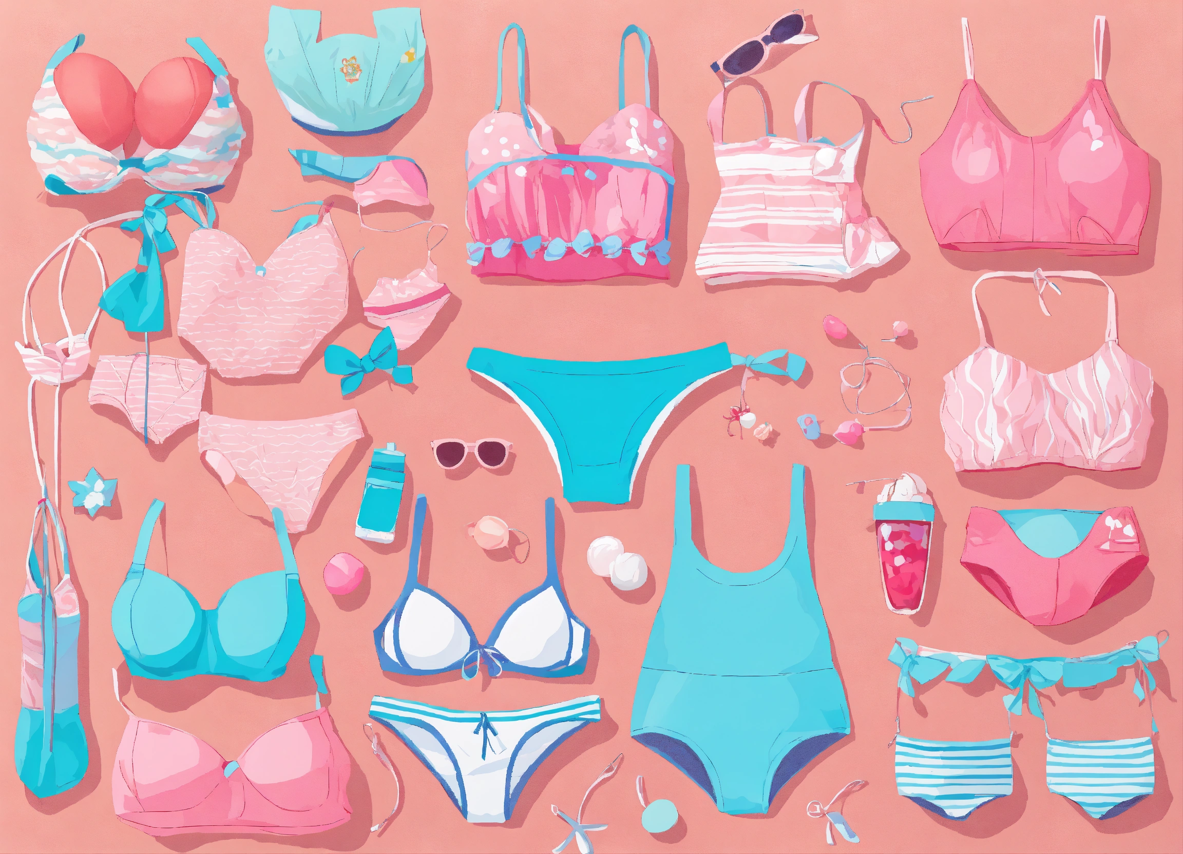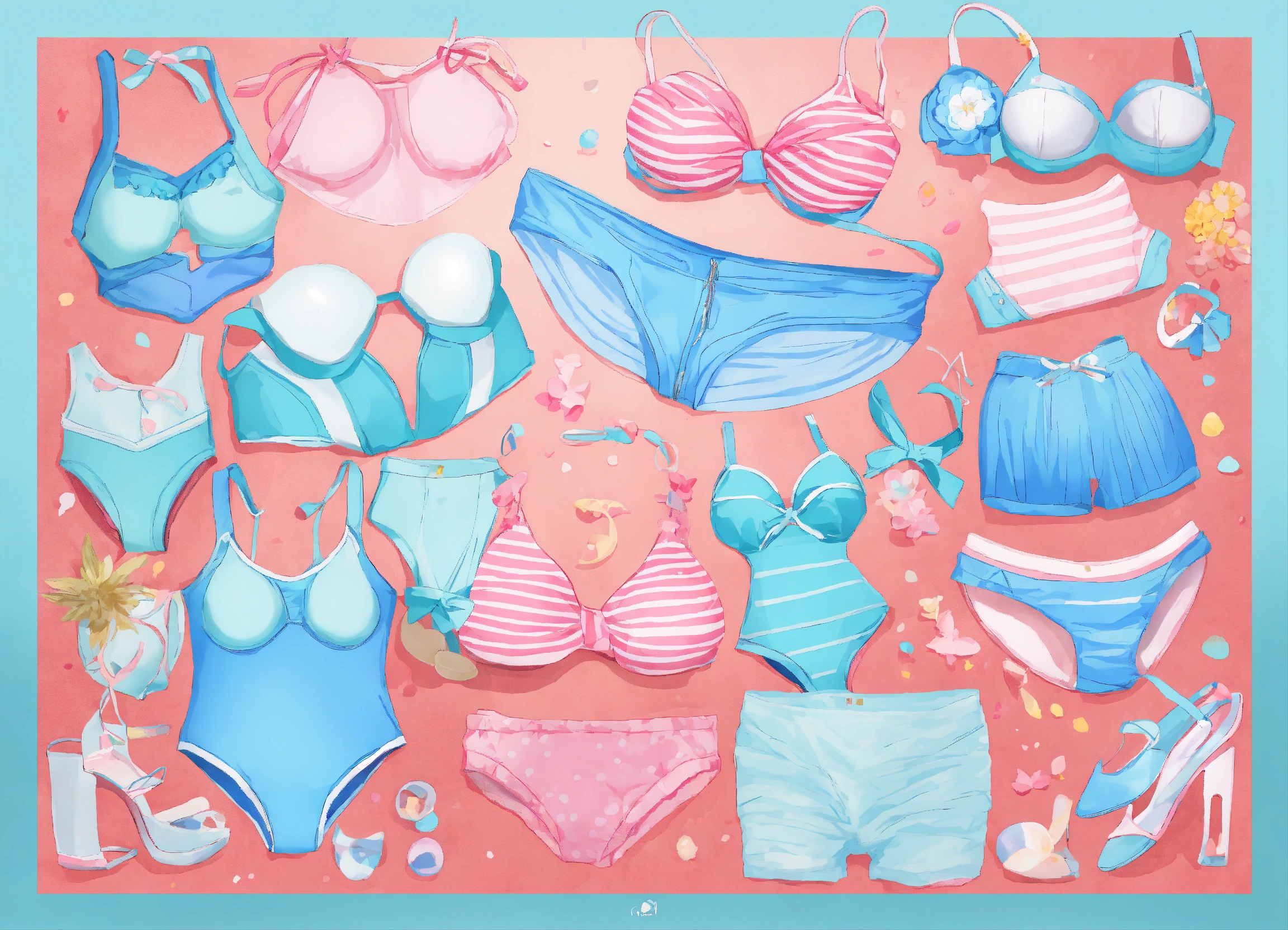 Perfect atelier of swimsuits, vibrant pastel color with baby blue and pink, illustration, vector, —tilde —art
