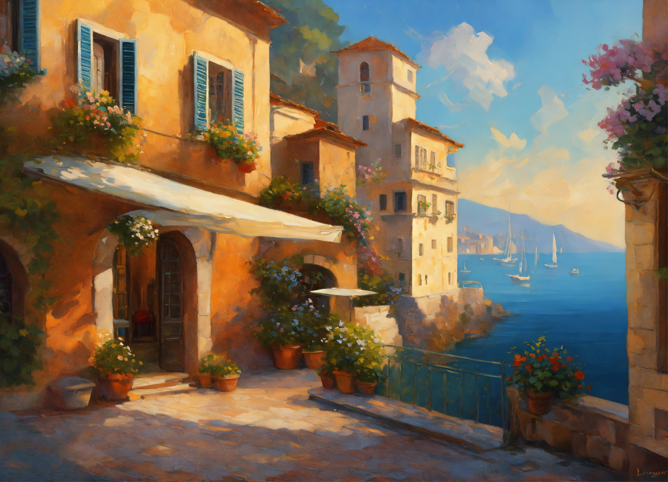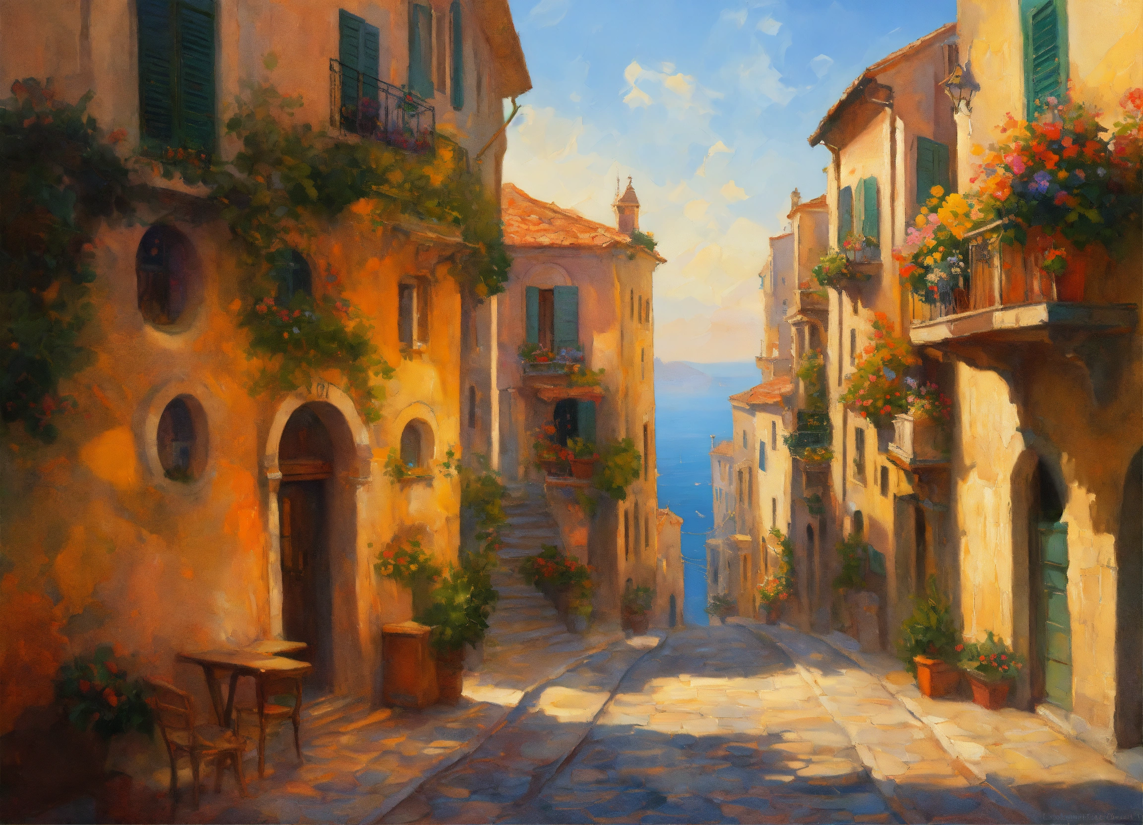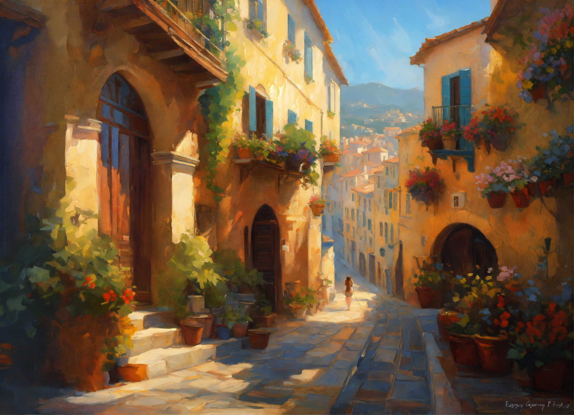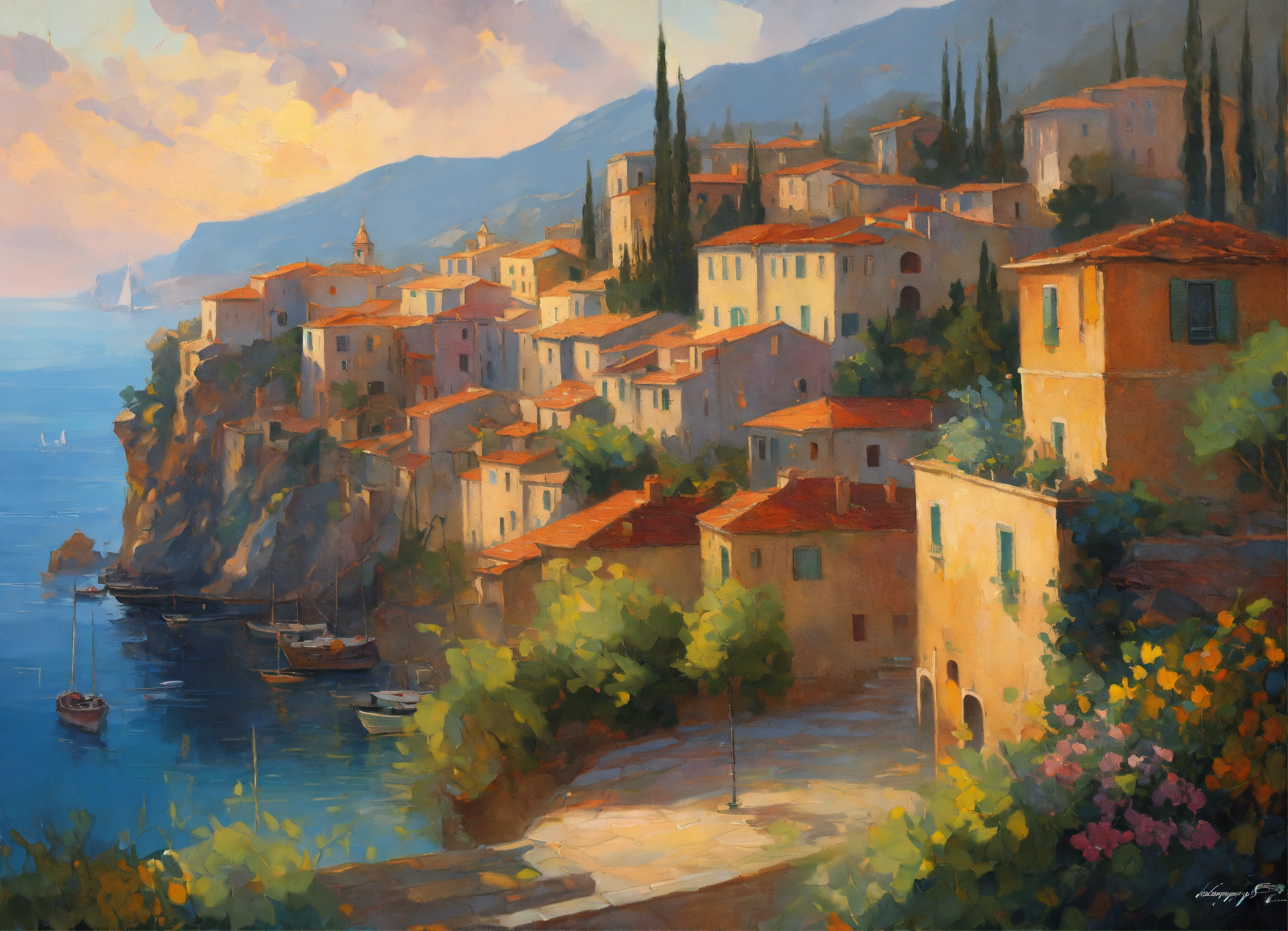 A painting of a mediterranean city, in the day with sun, by evgeny lushpin and daniel f. gerhartz and claude monet and leonid afremov, high details