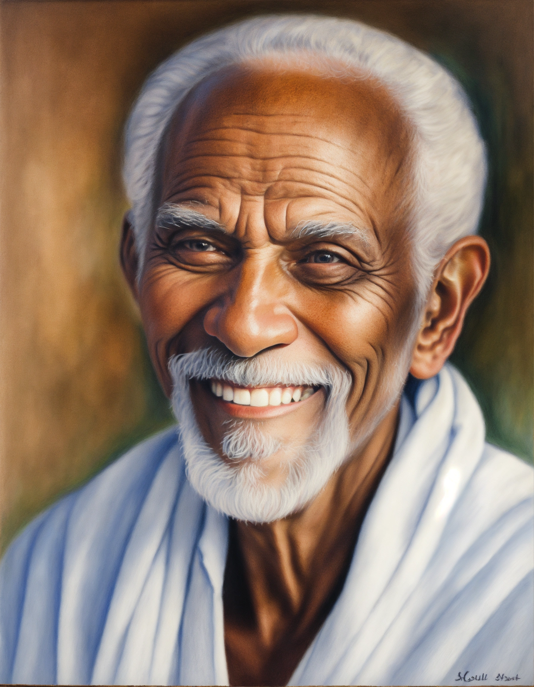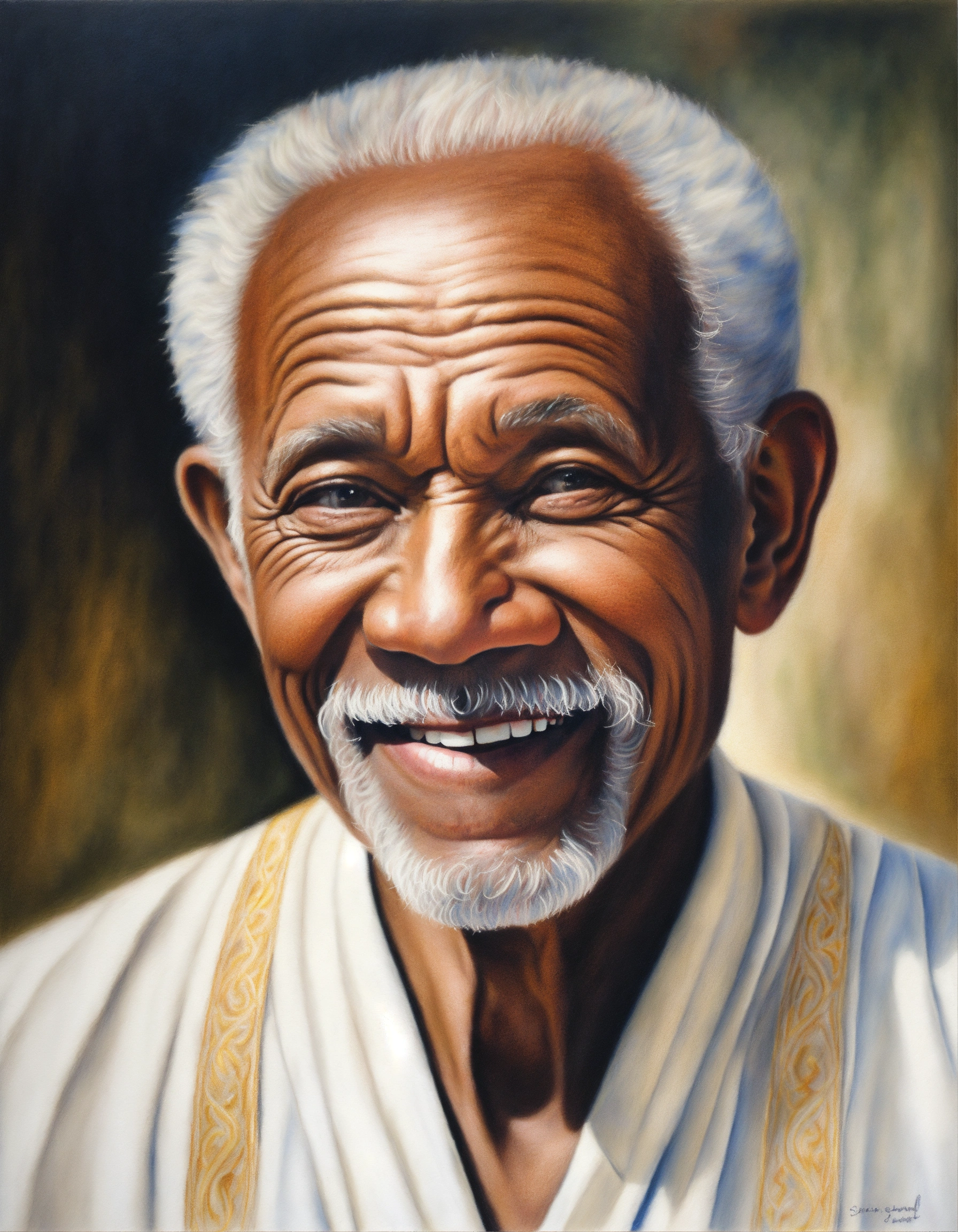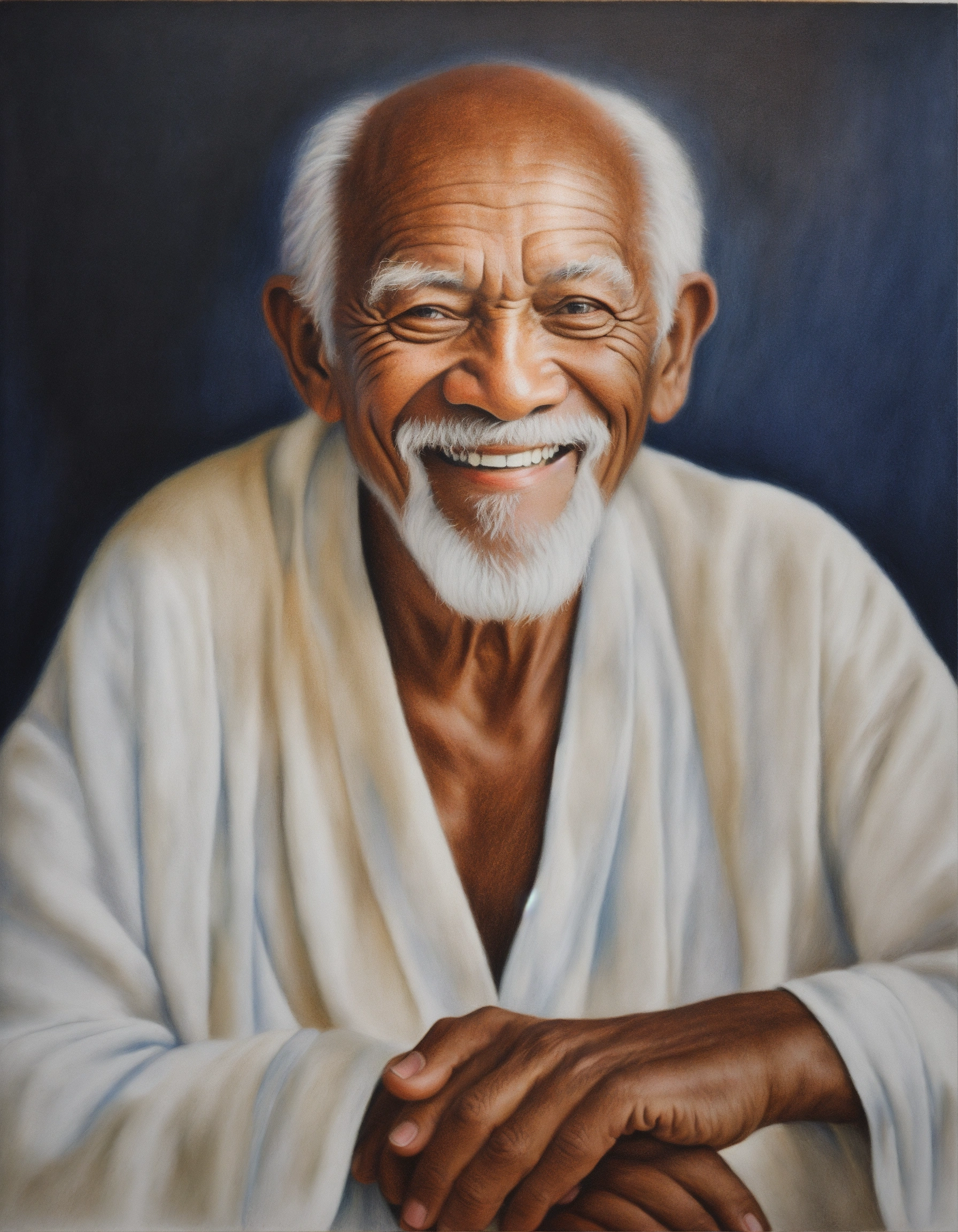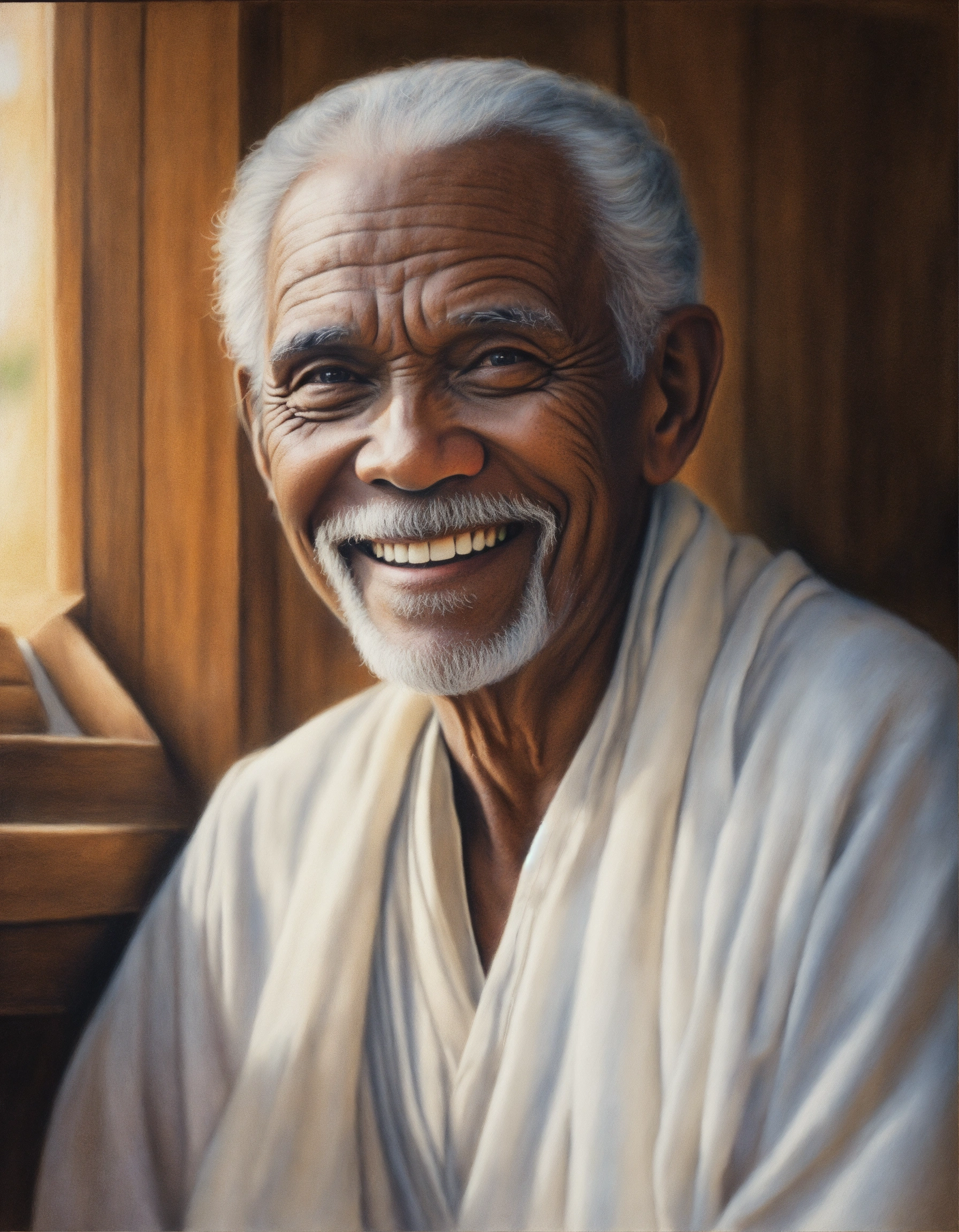 Realistic colored pencil painting of a spiritual mentor, old man, a beautiful smile, wearing white clothes, white skin. a soul. spirit. spiritual art.