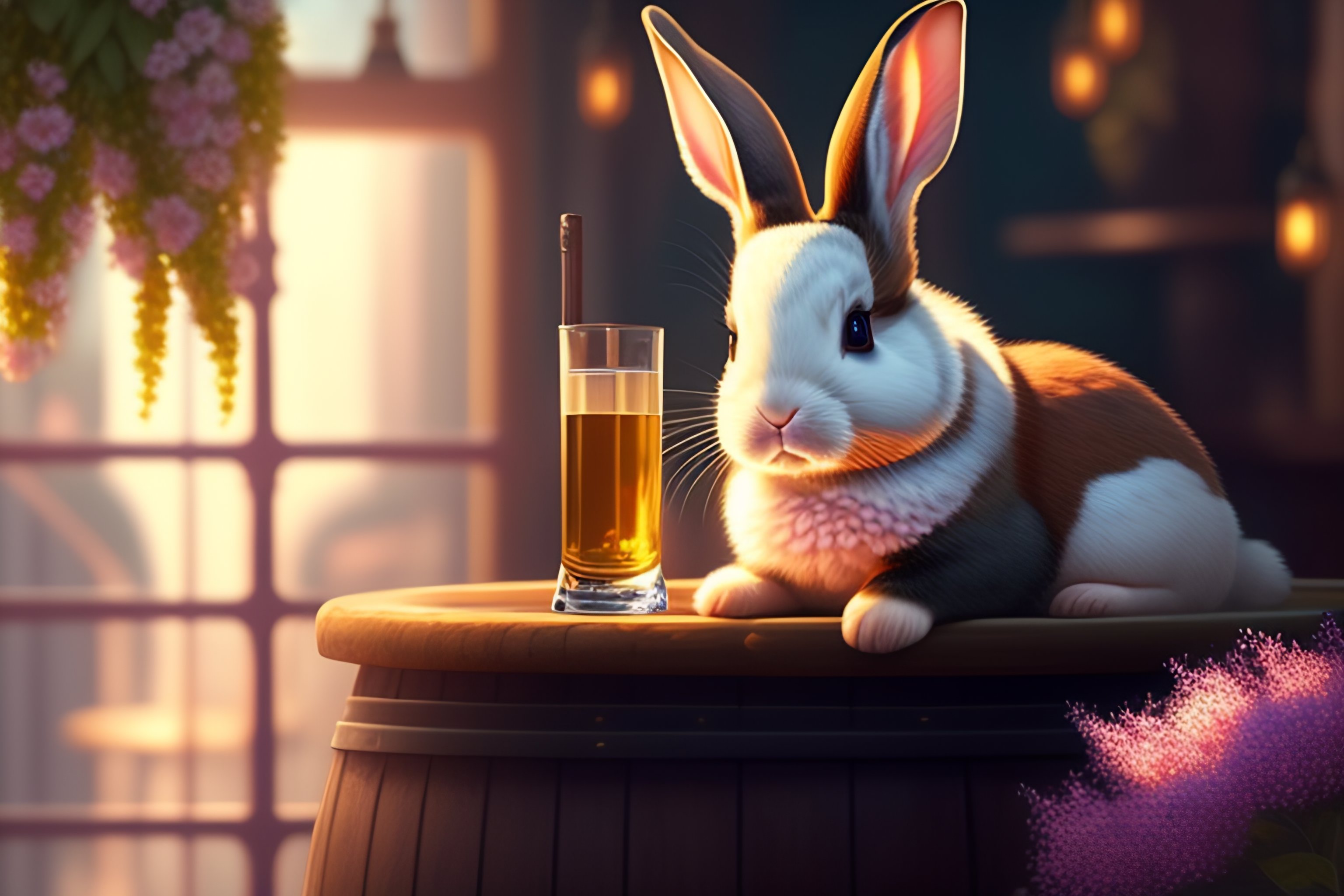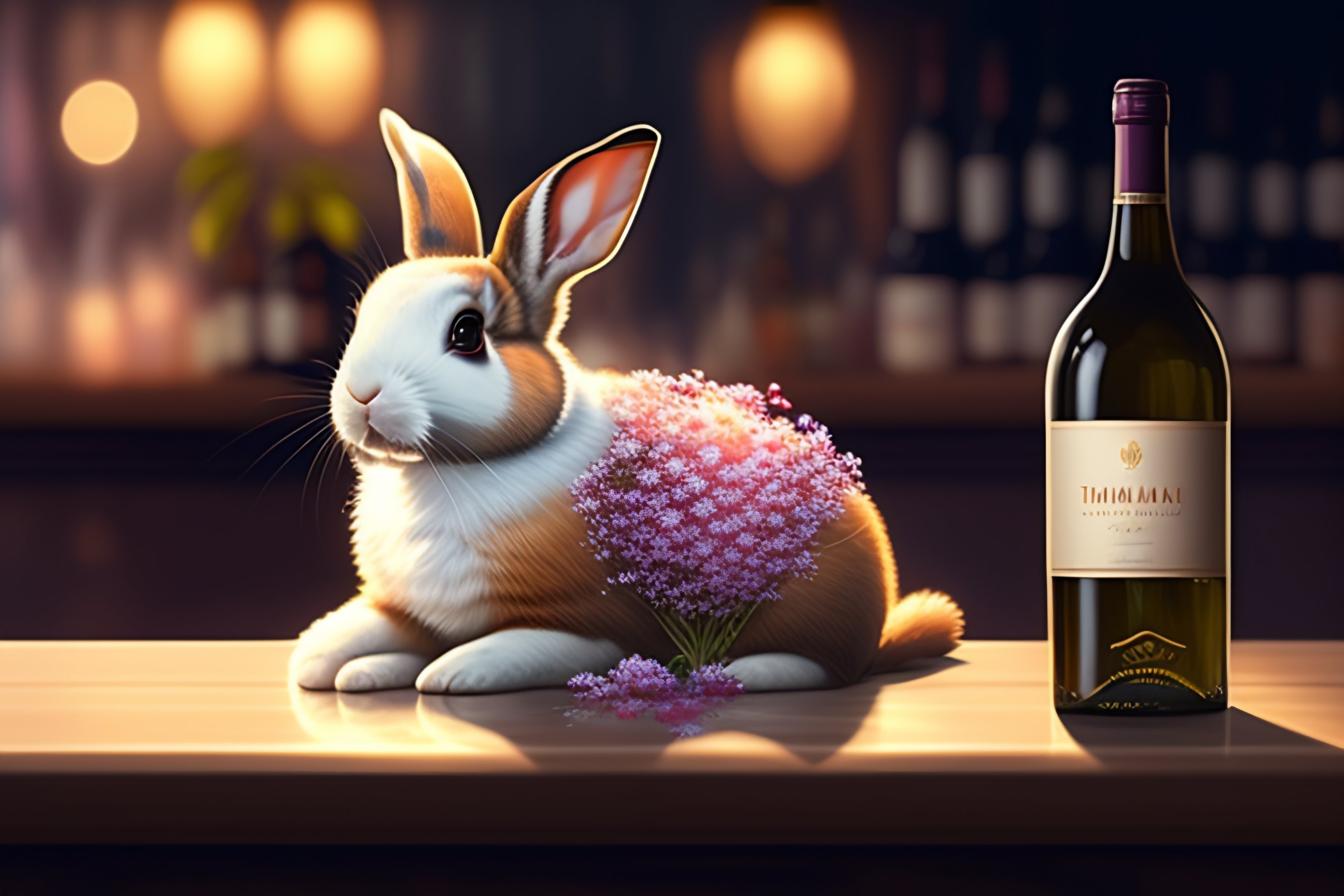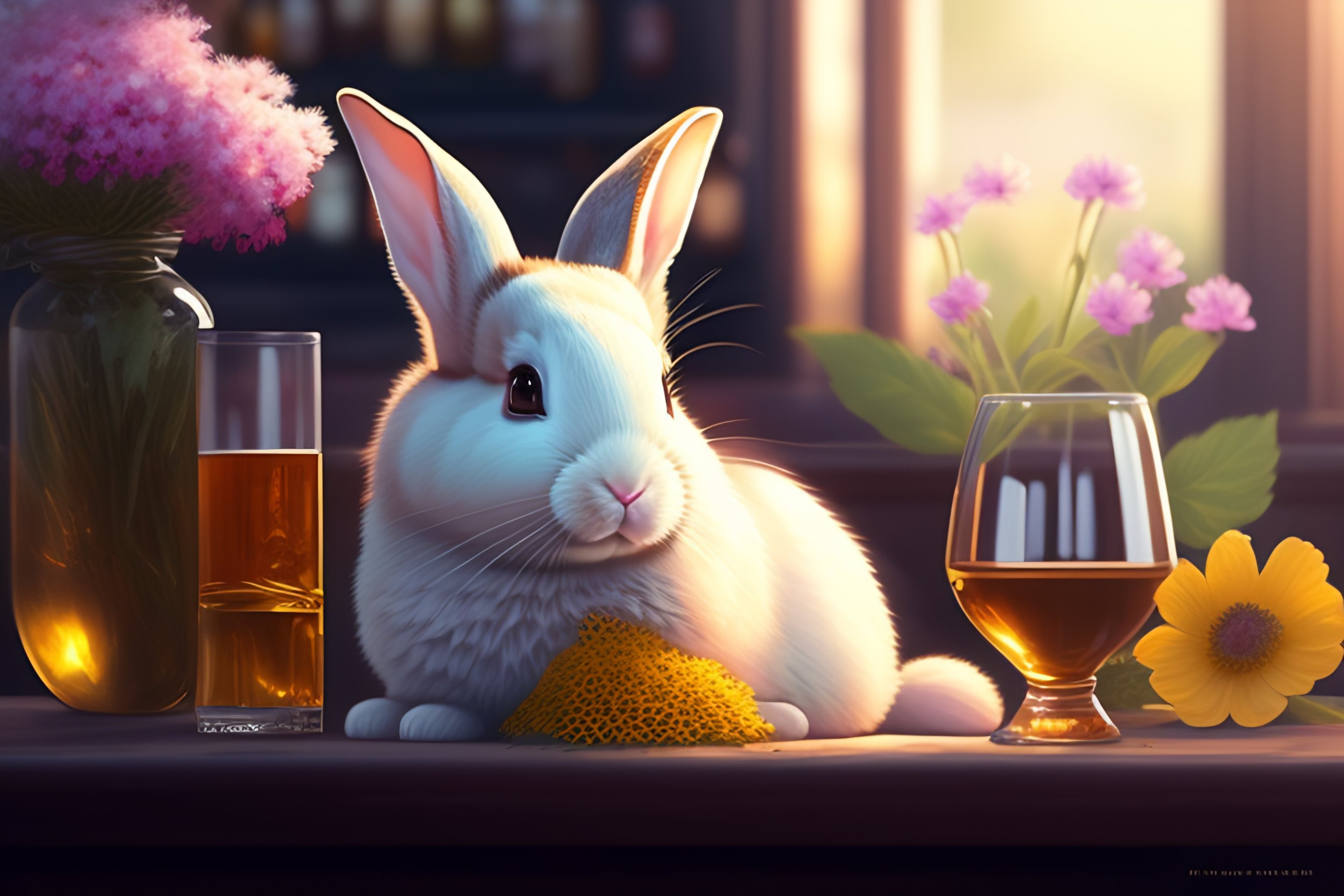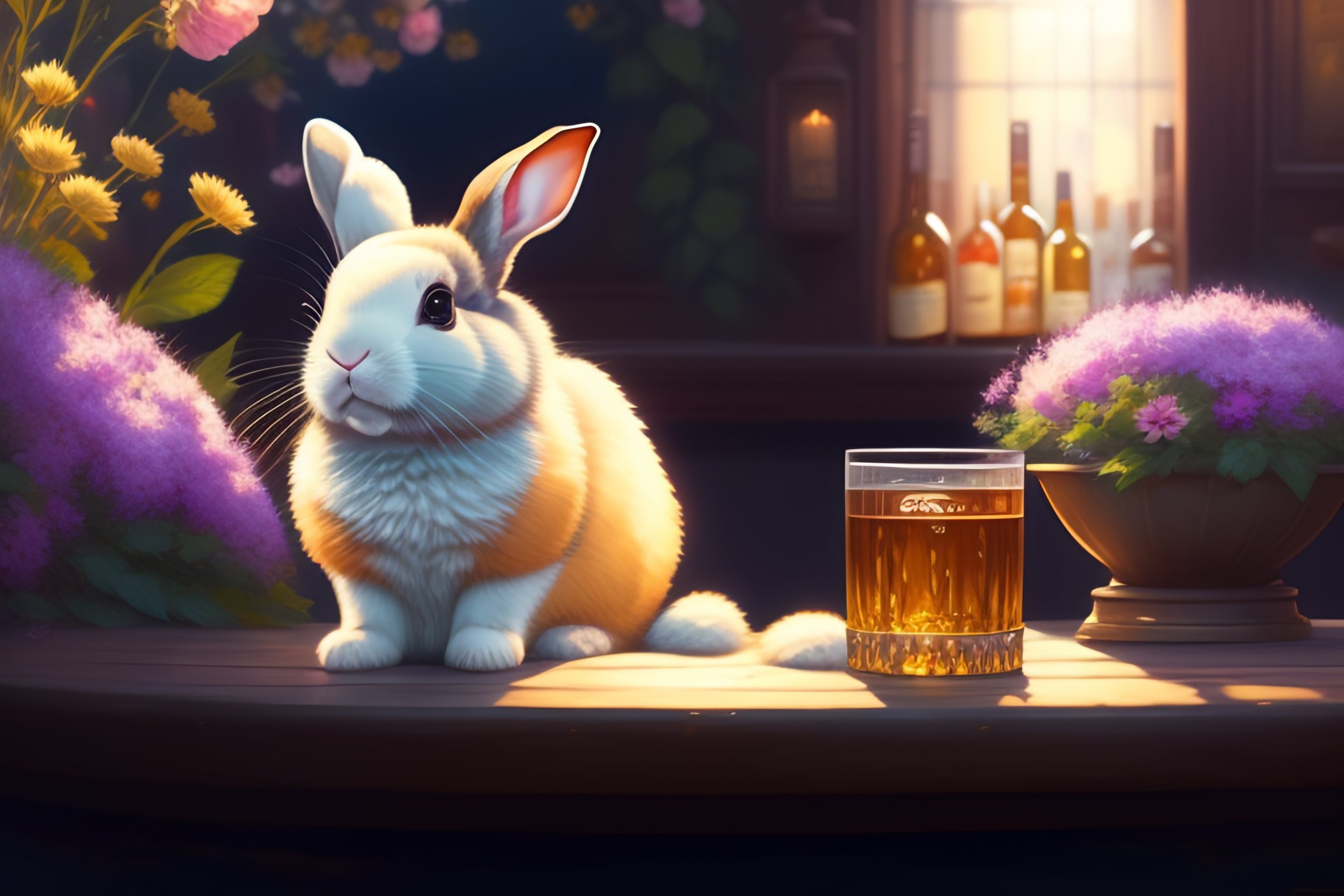 Cute bunny covered in flowers inside bar drinking wine with background by greg rutkowski makoto shinkai kyoto animation key art feminine mid shot