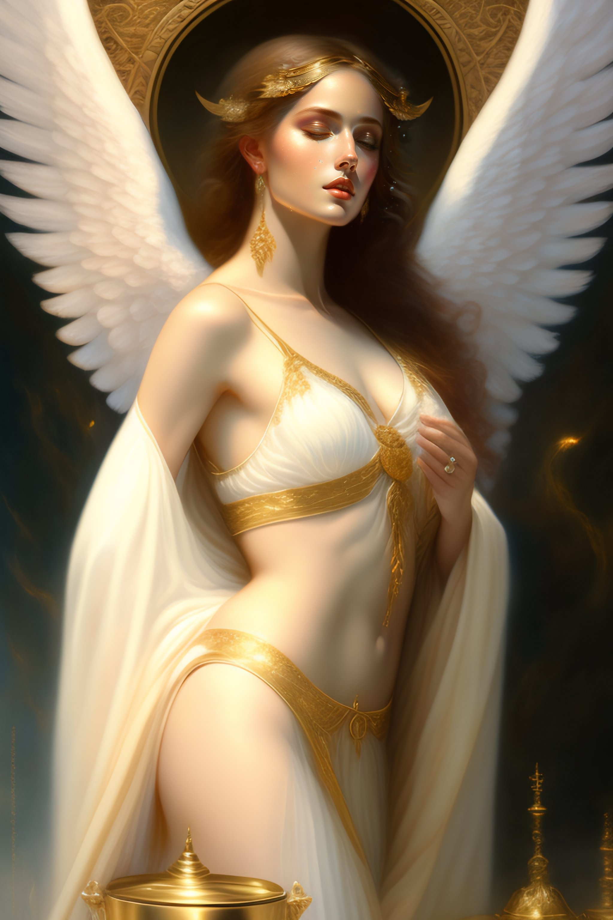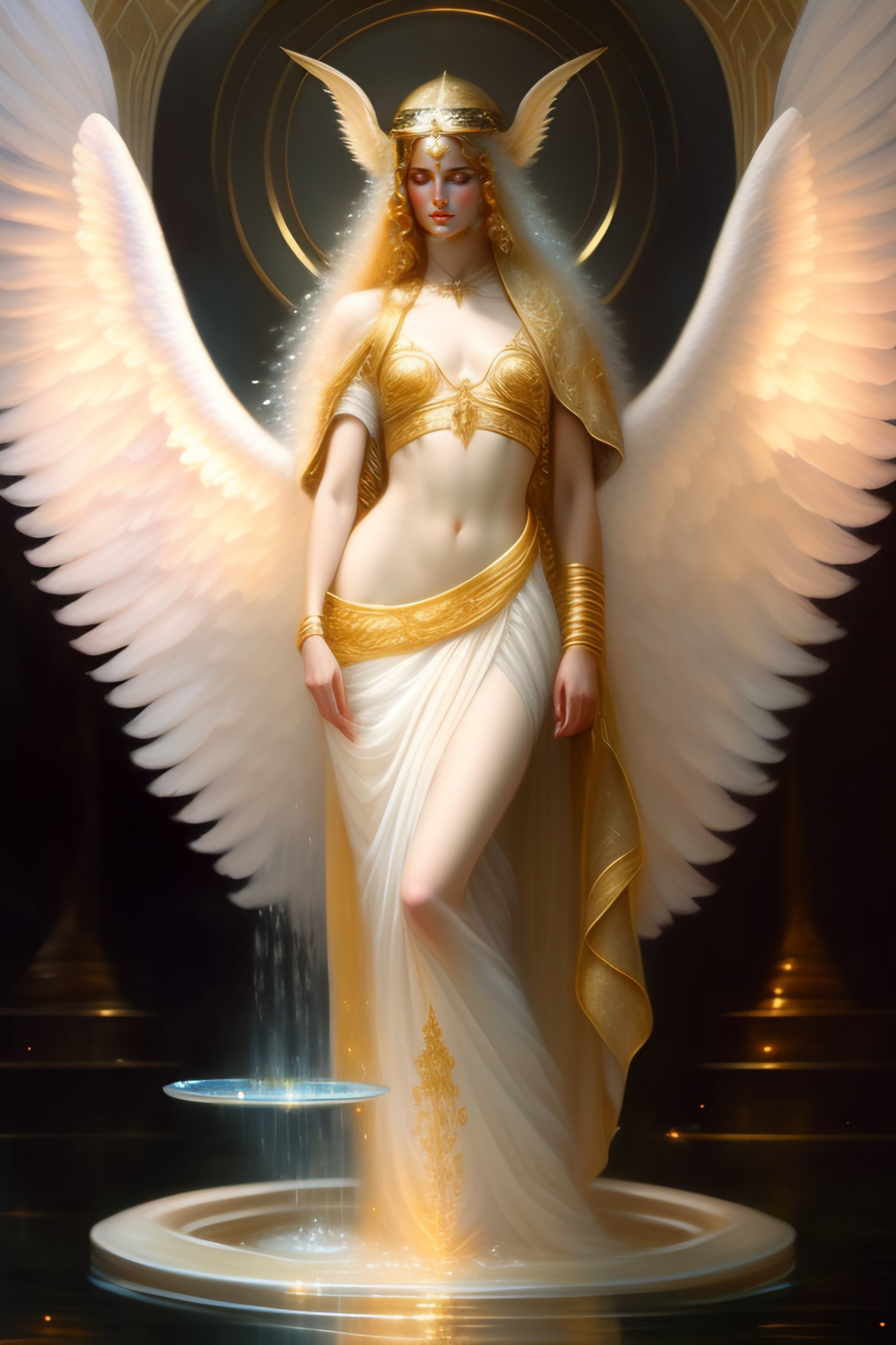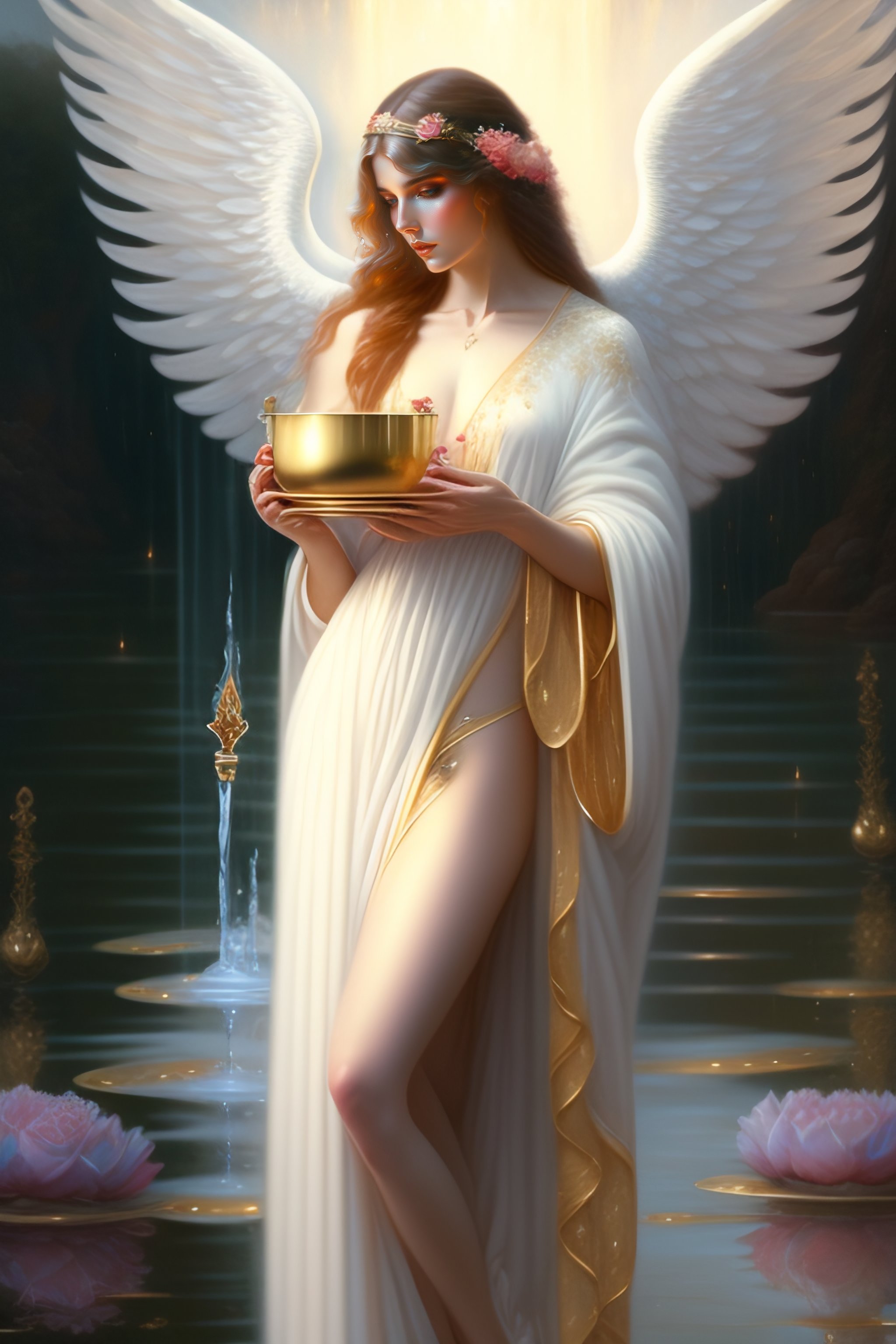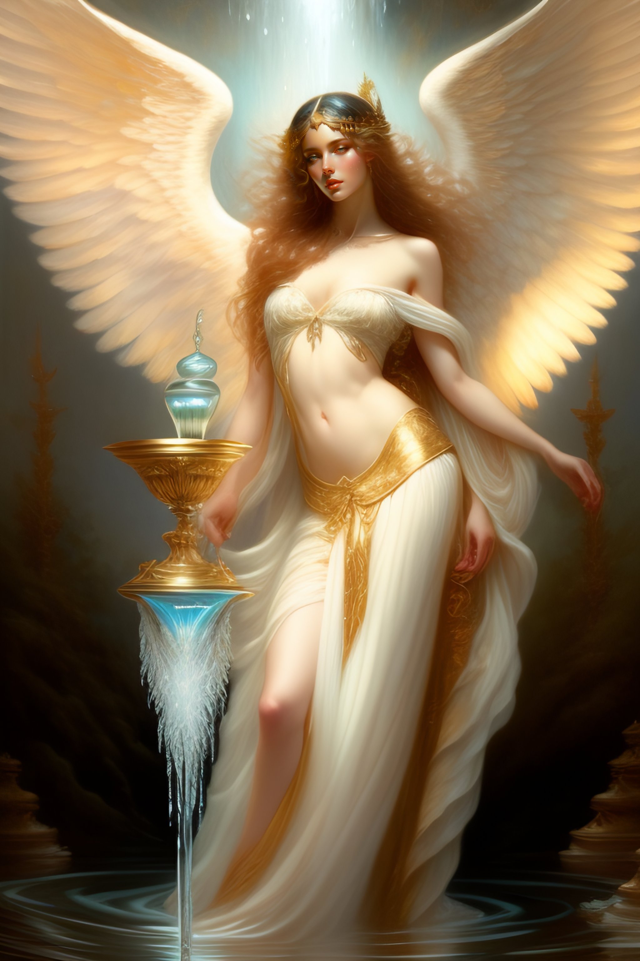 Full shot of an angel on a white robe pouring water from a golden grail into a pond art brush strokes by tom bagshaw and gaston bussière