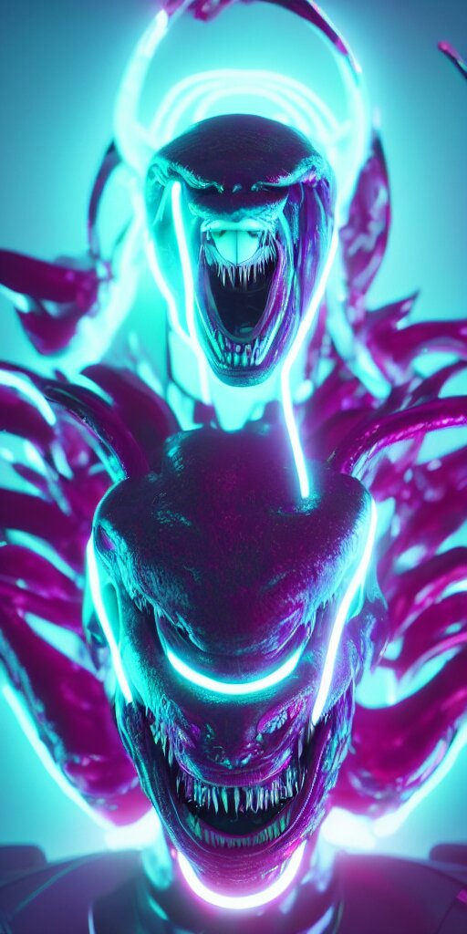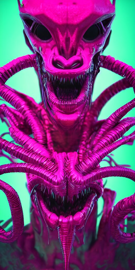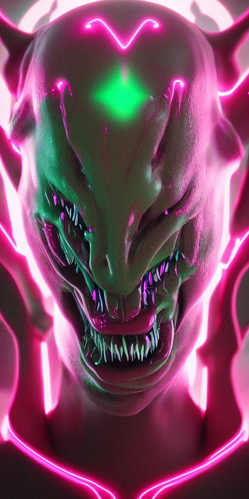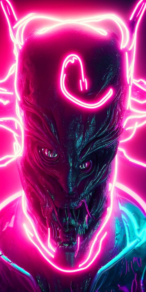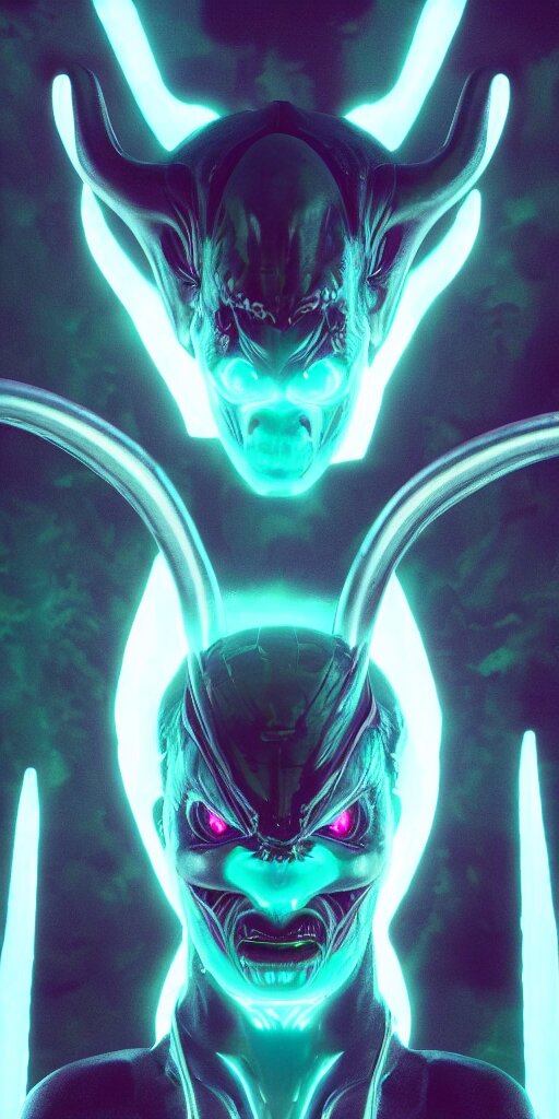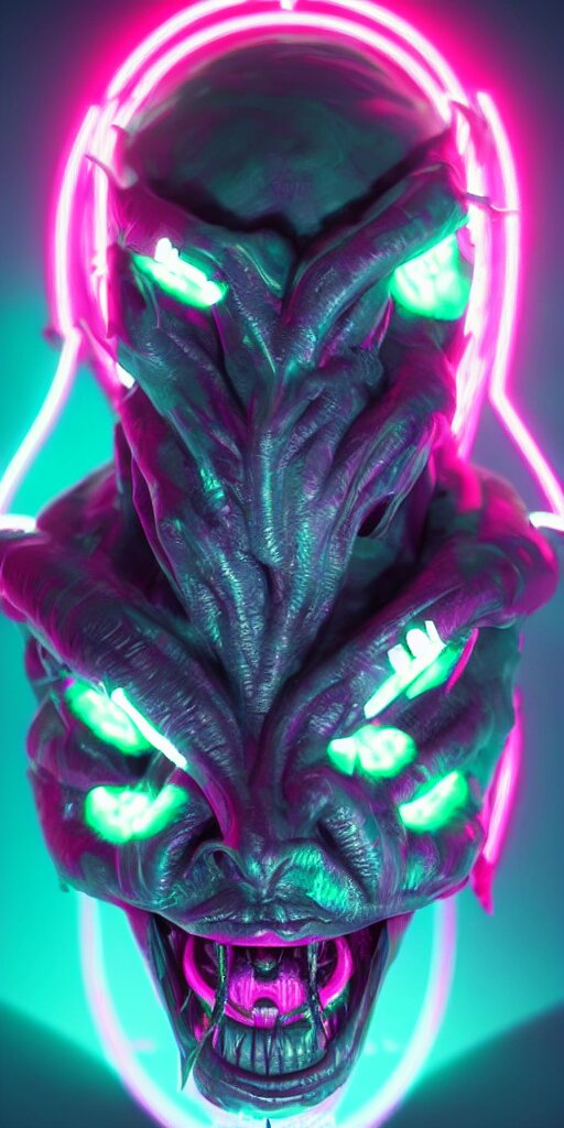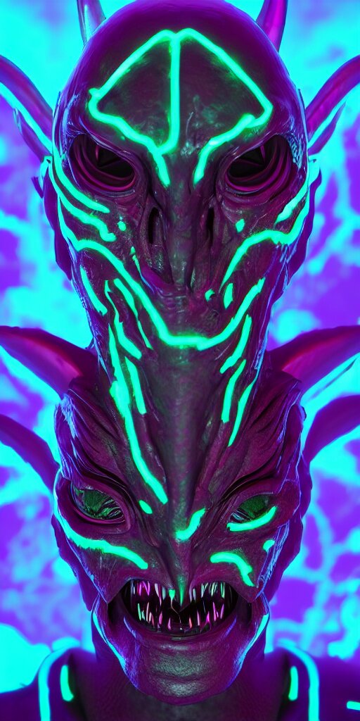 Synthwave demonic alien face with neon horns, detailed face, sharp focus, synthwave art, aesthetic, octane render, raw, cinematic