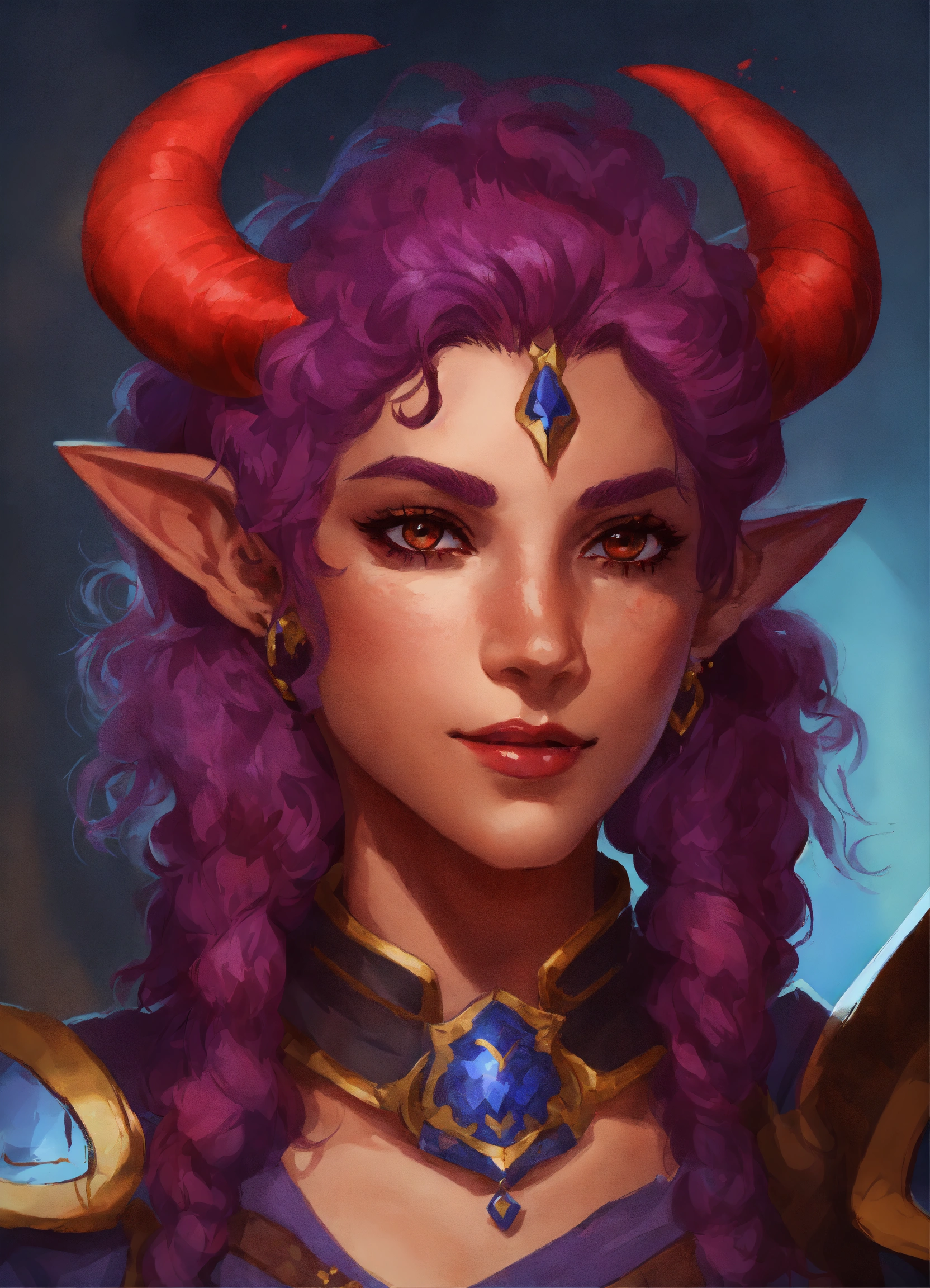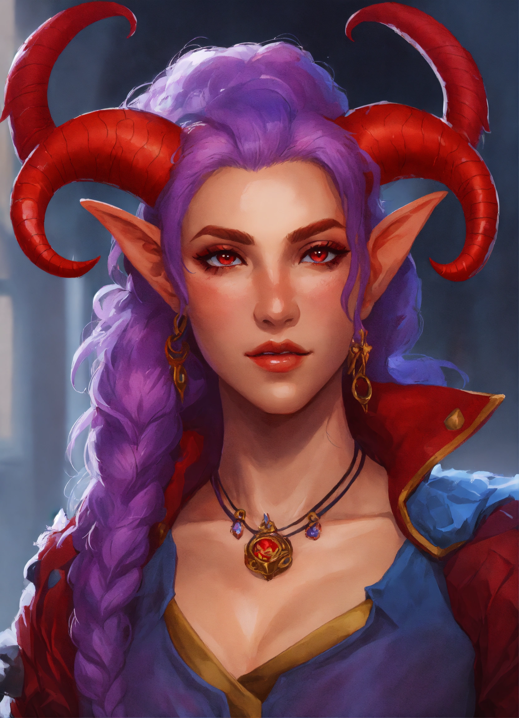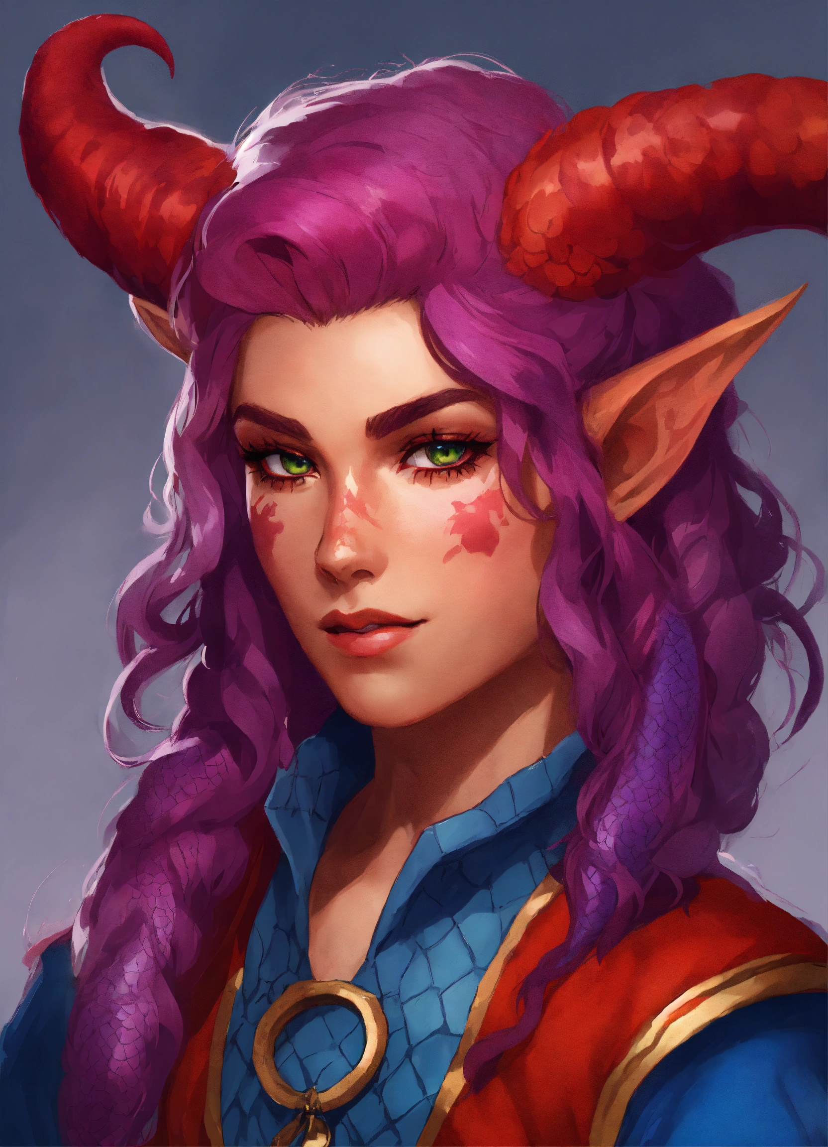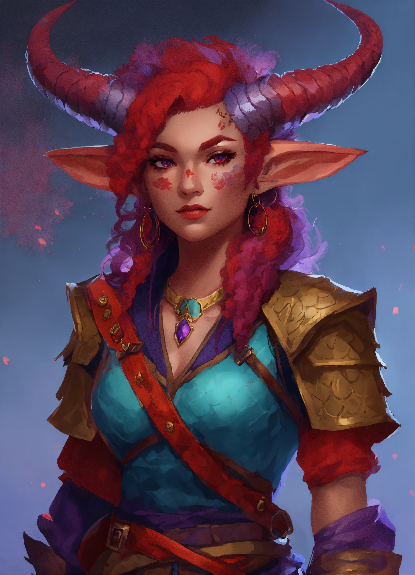 A teifling from dnd 5th edition with red curled horns, she has red skin with some patches of blue dragon scales and purple hair