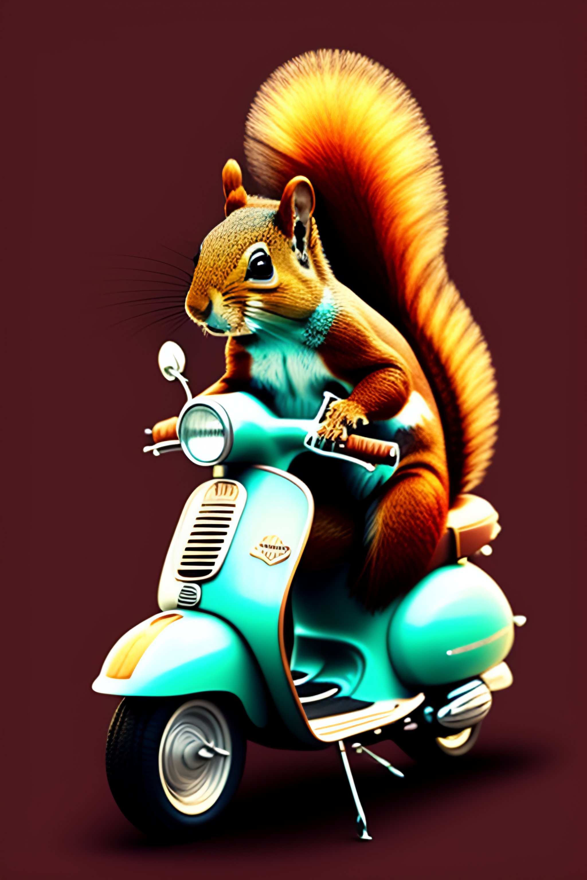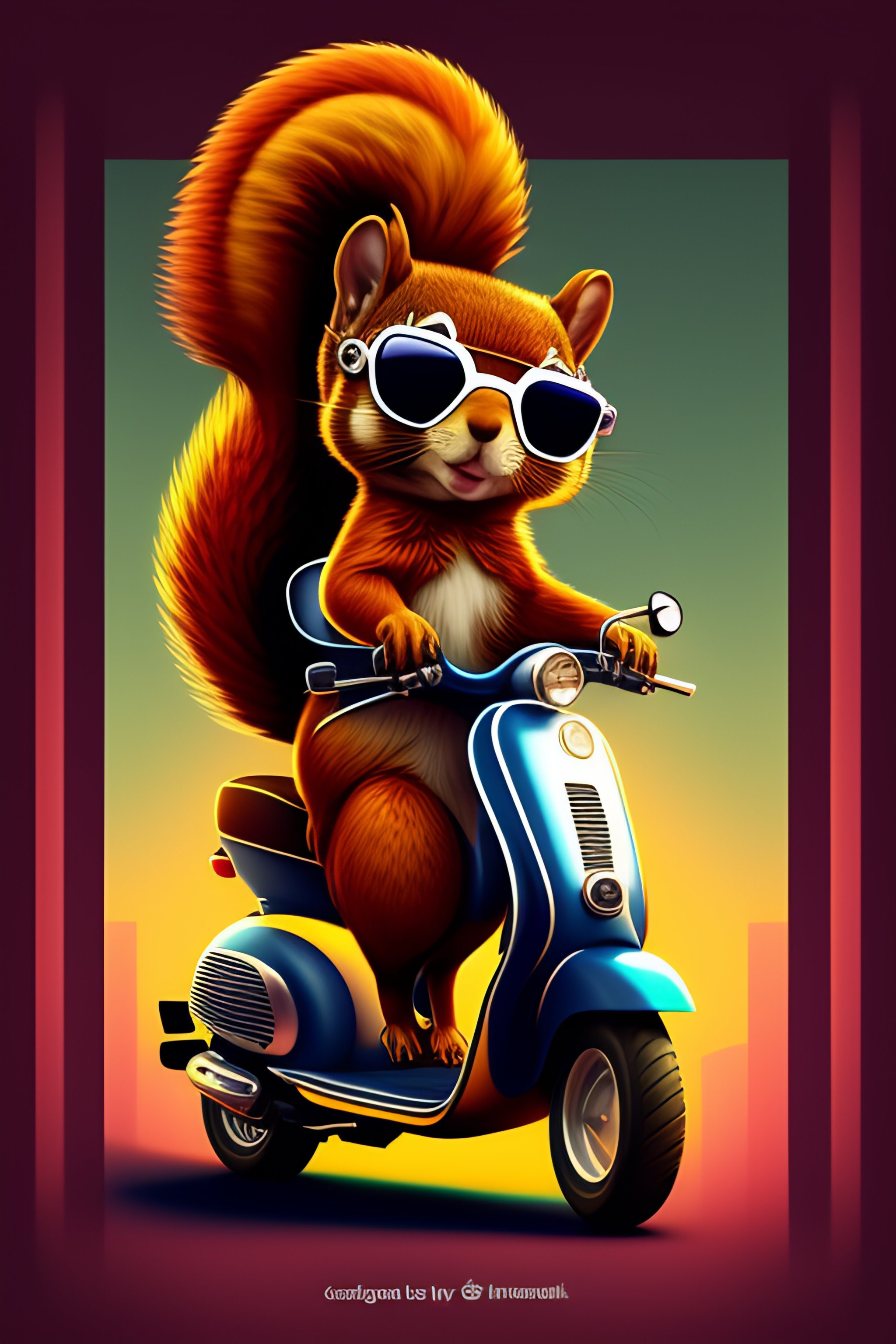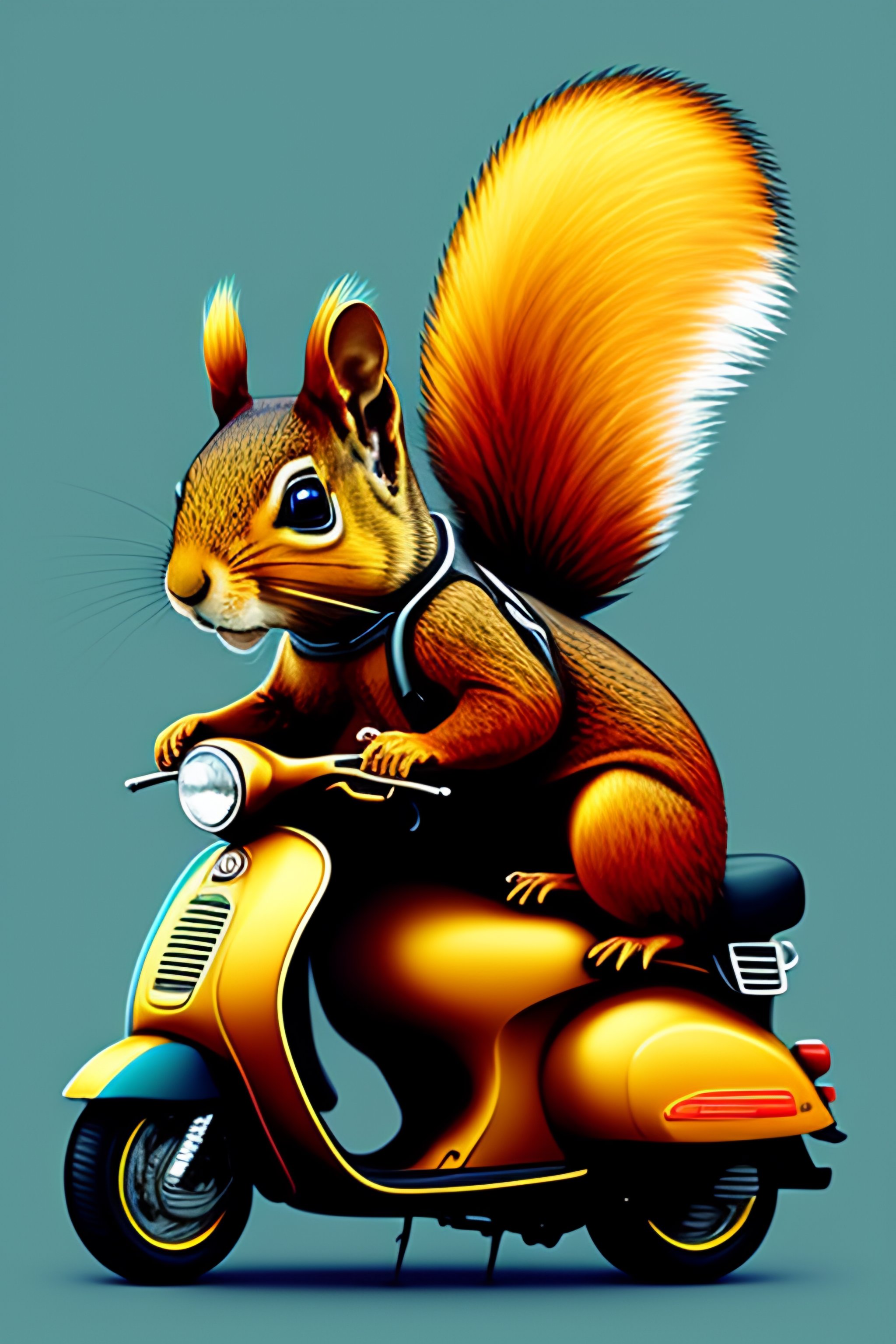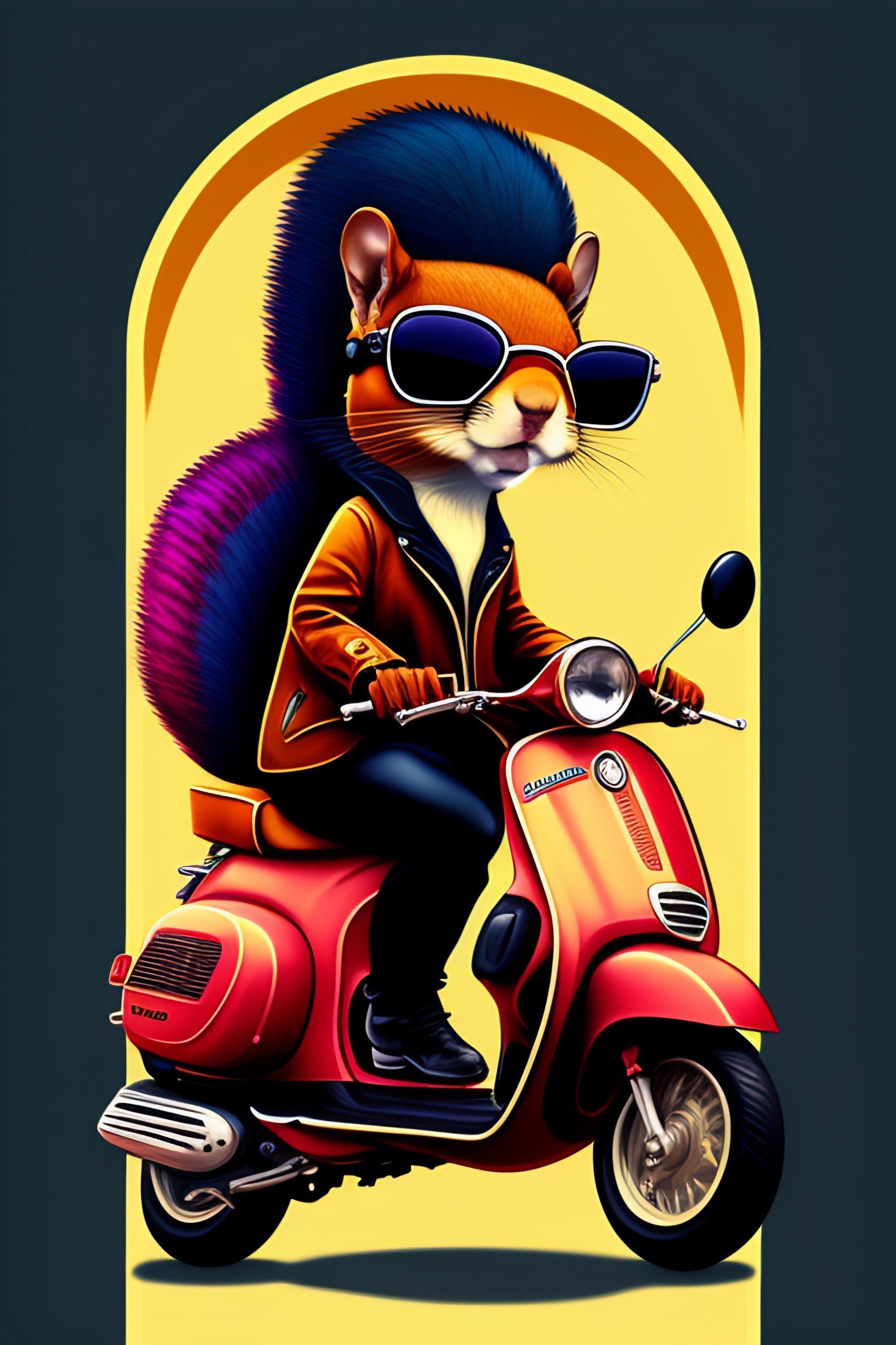 Squirrel fursona with boots sitting on a vespa moped with sunglasses vector, graphic novel, grunge, geometric horror tshirt design